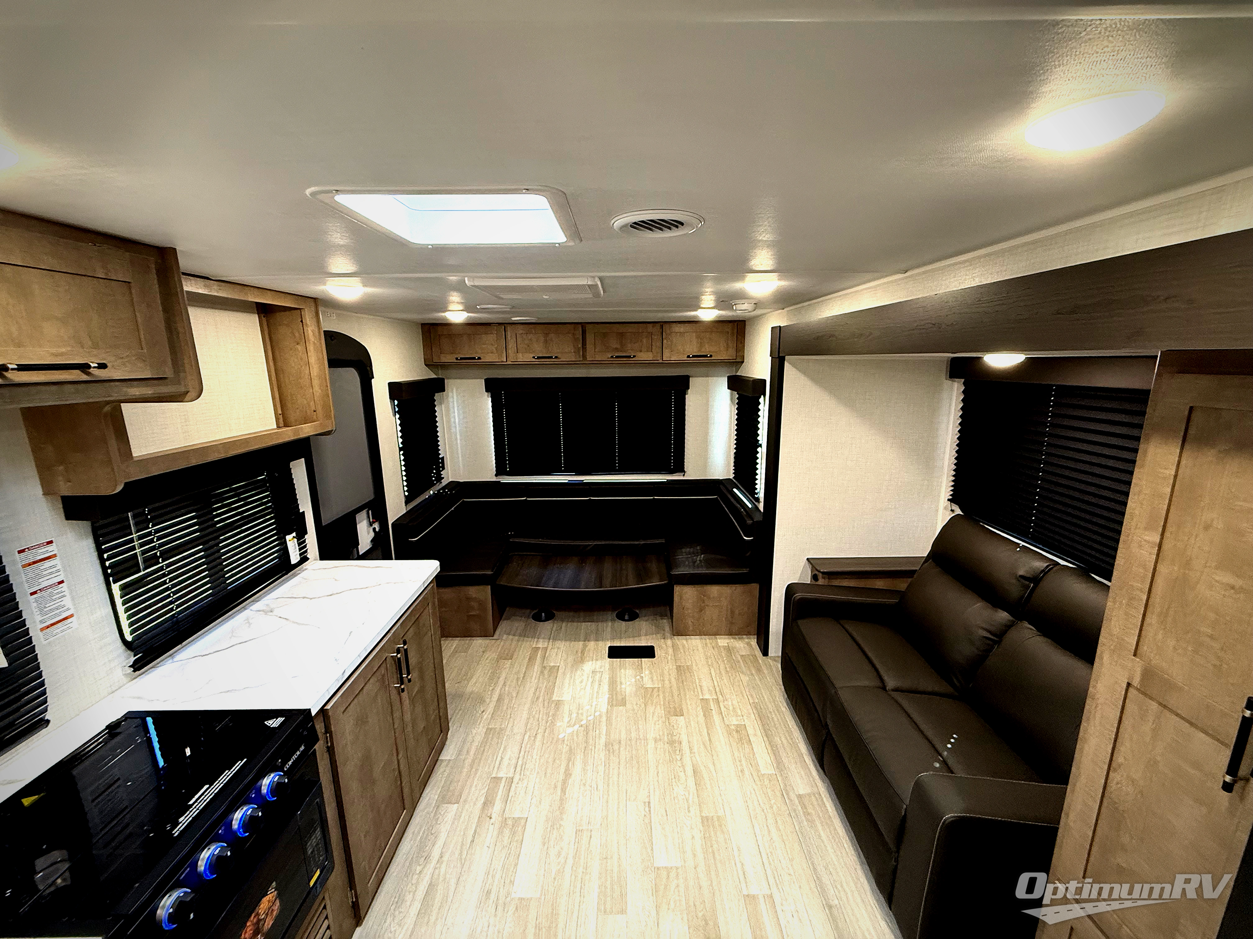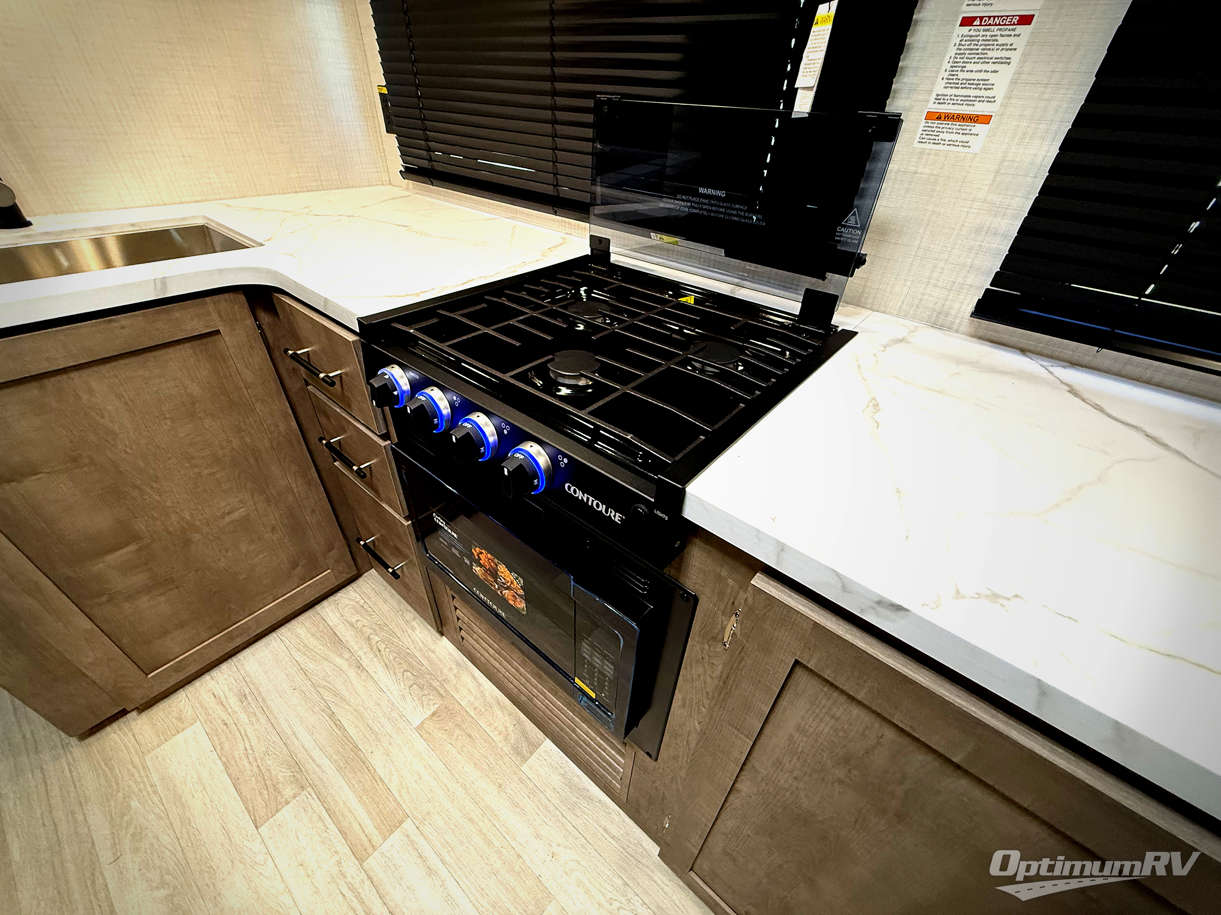 Trips to the lake just got easier in this dual entry travel trailer. You can enter in through the rear living area or the front master bedroom, and a queen bed will be calling your name after a tiring day. Don't forget to clean up in the walk-through bath before heading to bed! The chef of your group can make breakfast on the three burner gas cooktop, while the others set plates around the rear U-shaped dinette. There is also a sofa slide out for additional seating spaces, and both of these pieces of furniture will double as your guests' sleeping space at night. After breakfast is cleaned up, grab your fishing poles from the exterior pass-thru storage and head down to the water!