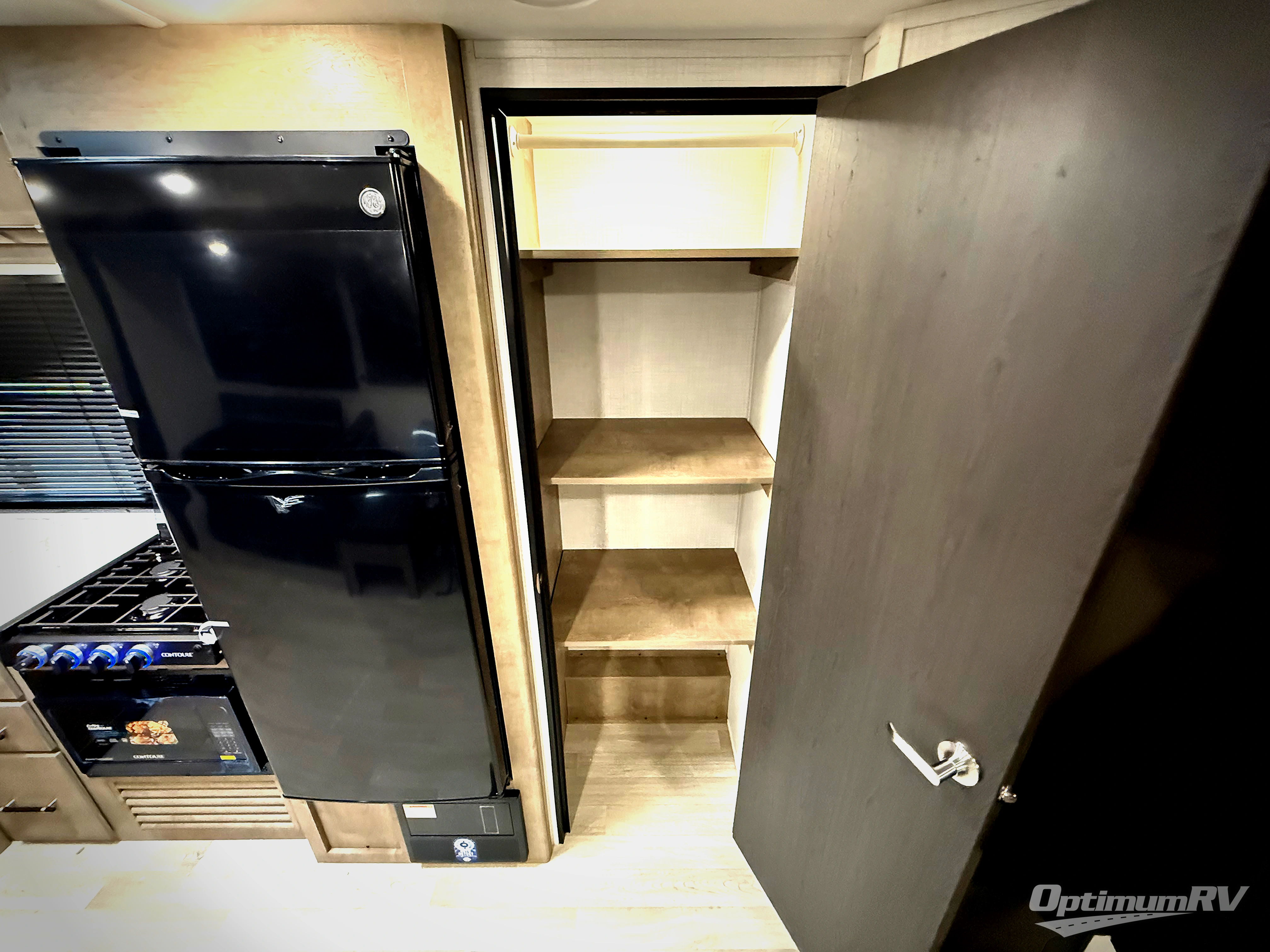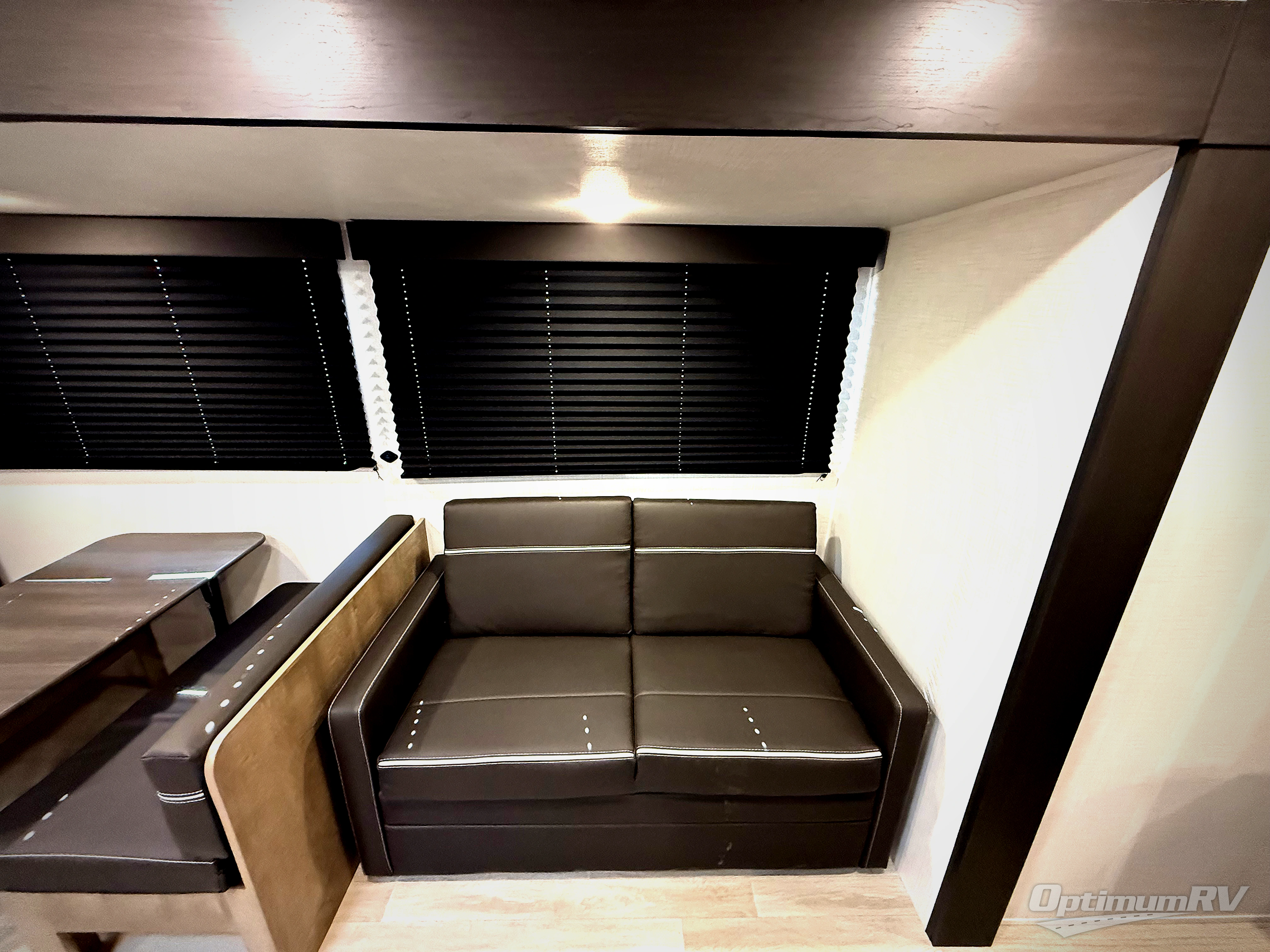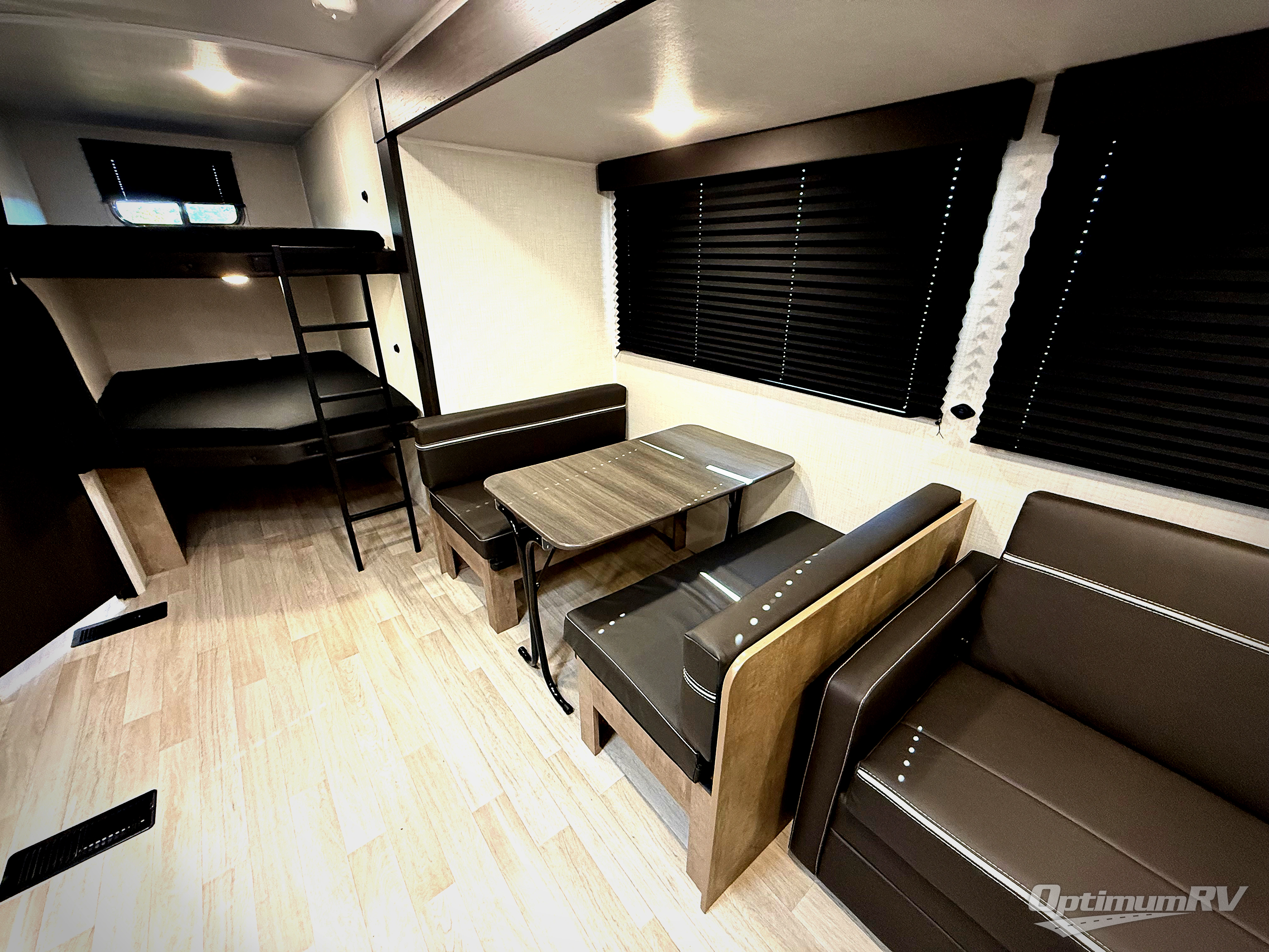 You'll have additional space to stretch out in this travel trailer for eight to ten! Within the slide you'll find the booth dinette and sofa that will be perfect for mealtimes, relaxing, and sleeping more guests, and there is an entertainment with TV prep for movie nights. The little ones will love the double-size bunks, and the full bath is close by for easy nighttime use, and one of the dual entry doors is found here for convenience. You'll have the front private bedroom with a queen bed all to yourselves, plus there are dual closets and nightstands for your things. This model also includes an exterior pass-through storage outside and a 16' power awning for protection against the sun!