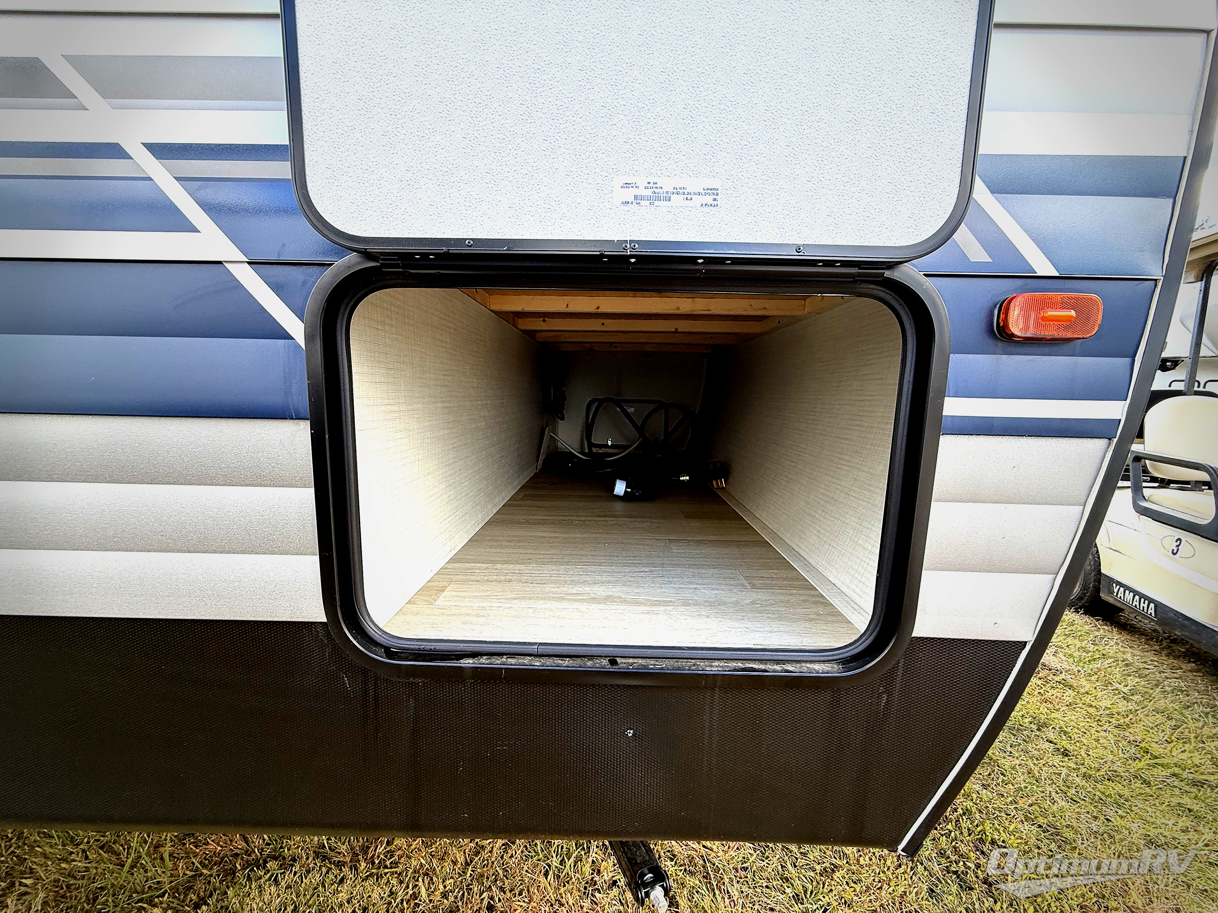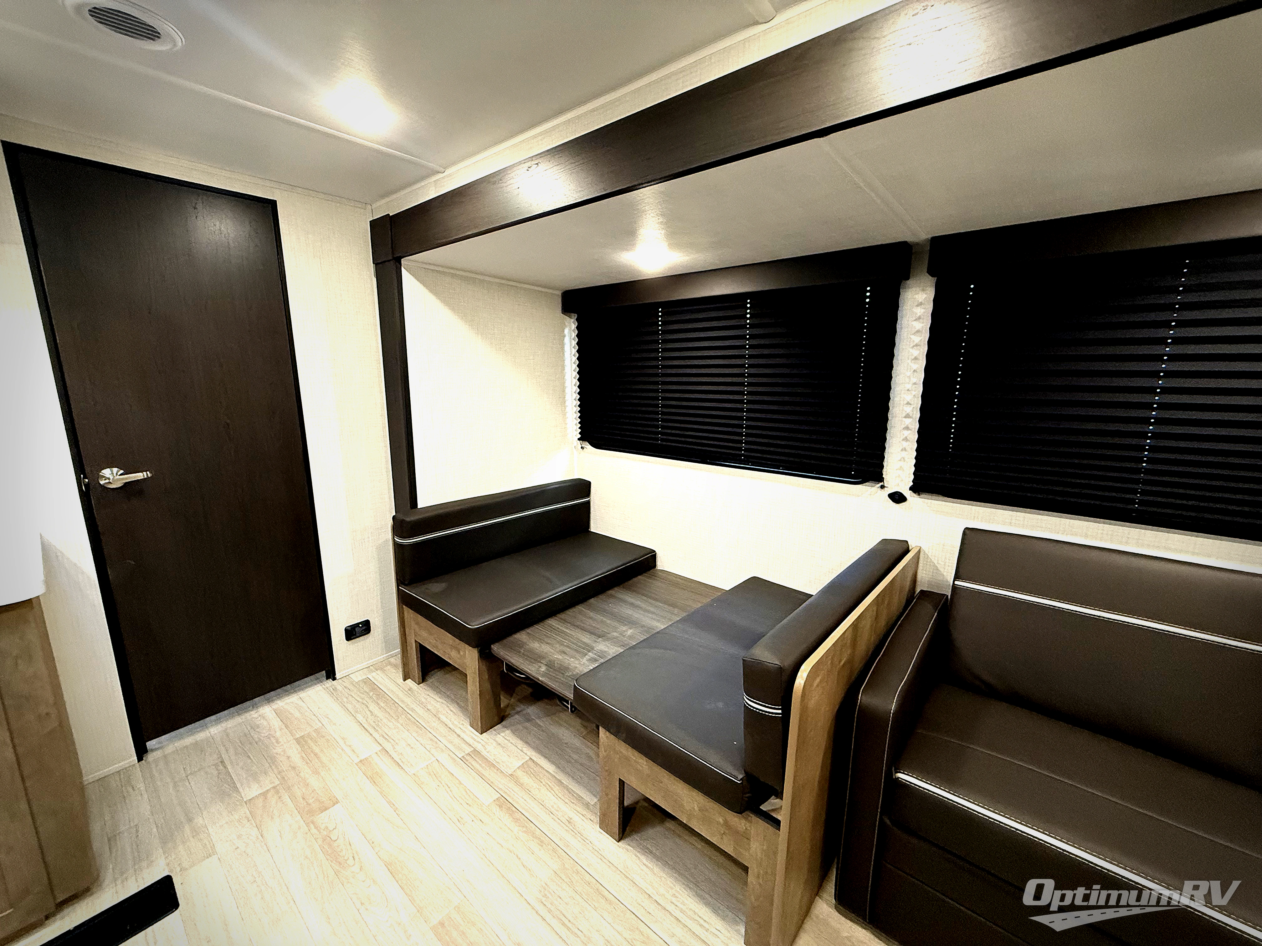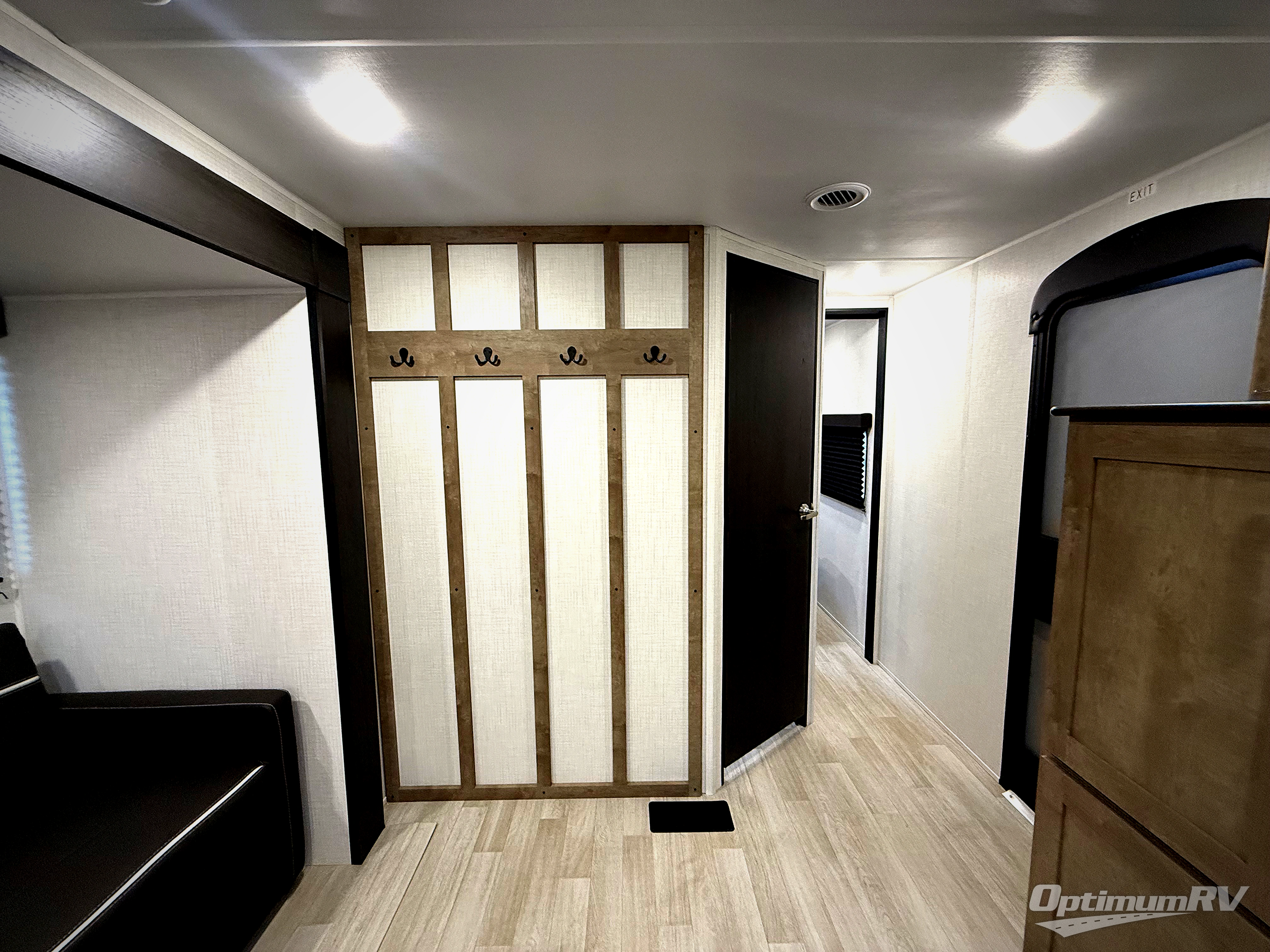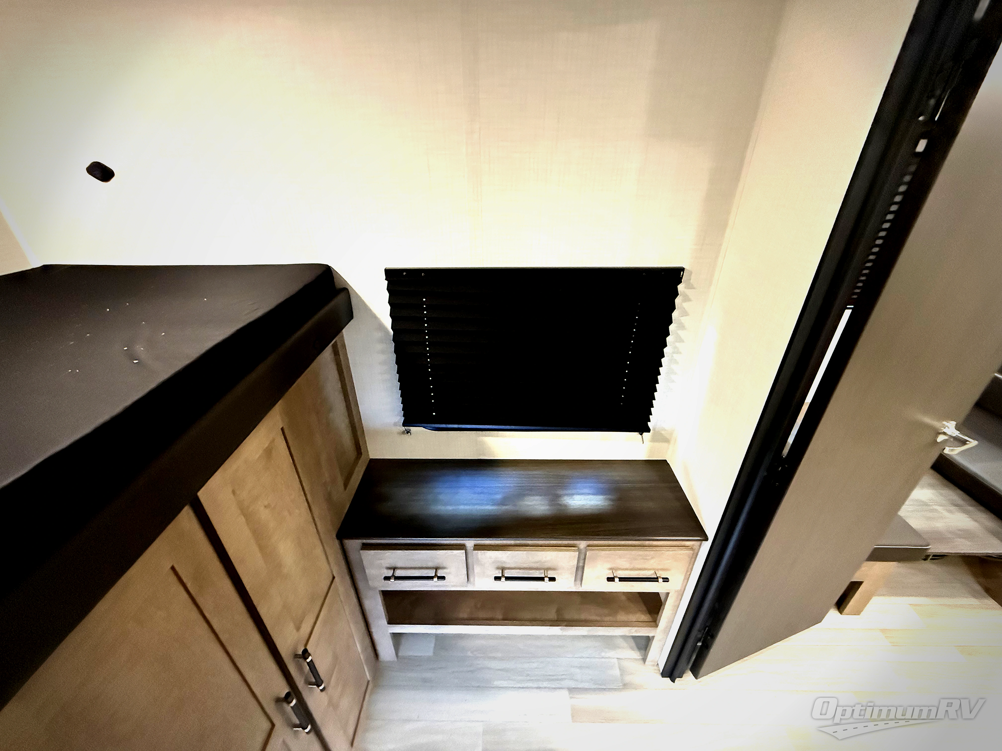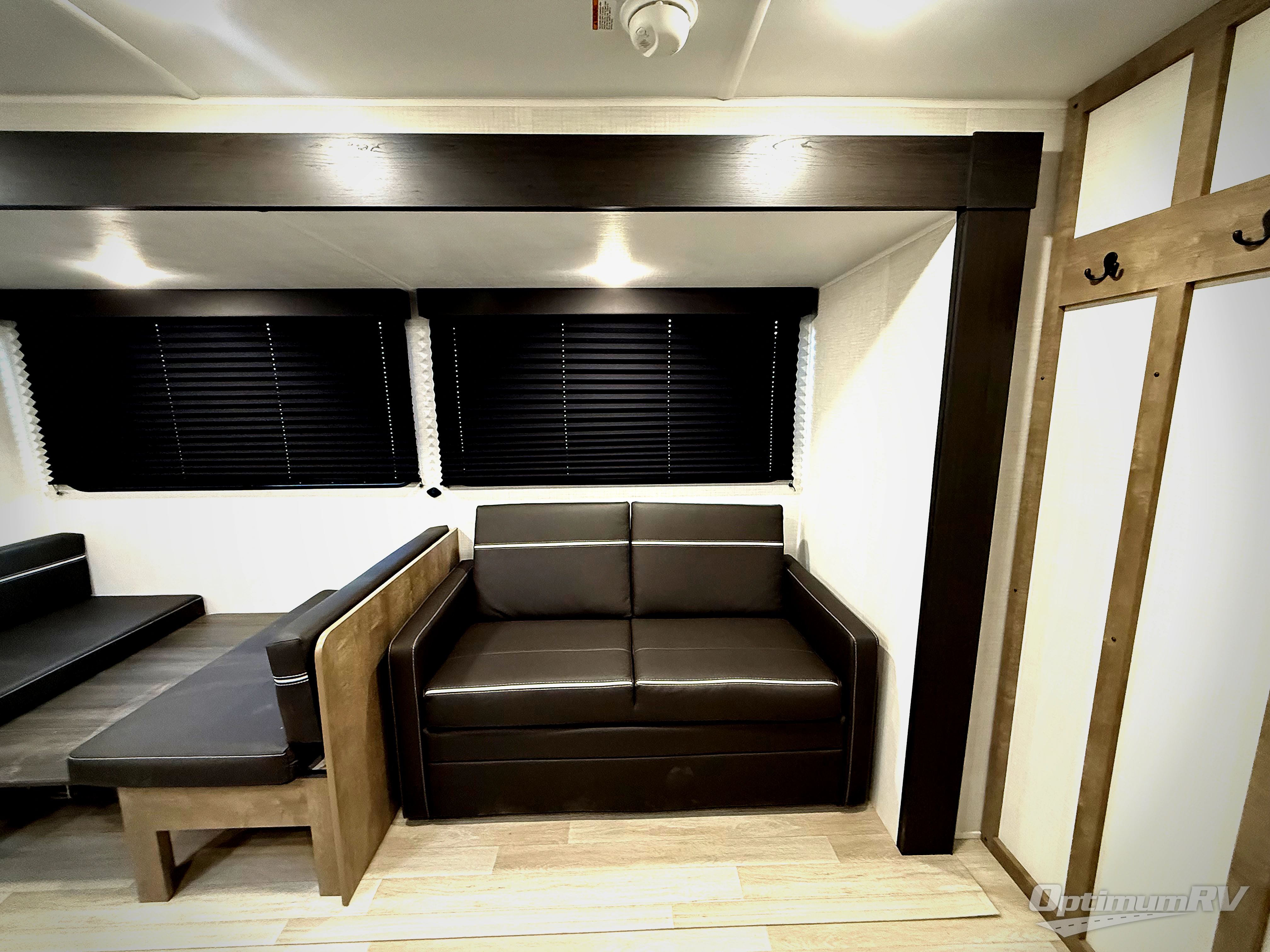 Camping with friends and family is easier than ever in this spacious trailer with a rear private bunkhouse! You'll find triple bunks in this room, along with a dresser and closet to keep everything tidy. The front private bedroom will feel just like home with its queen bed, plus dual closets and dual nightstands. Your crew can all gather in the main living area to relax on the sofa or play a game at the booth dinette, and there is even TV prep in this room if you enjoy movie nights. Head outdoors to relax under the 16' power awning.