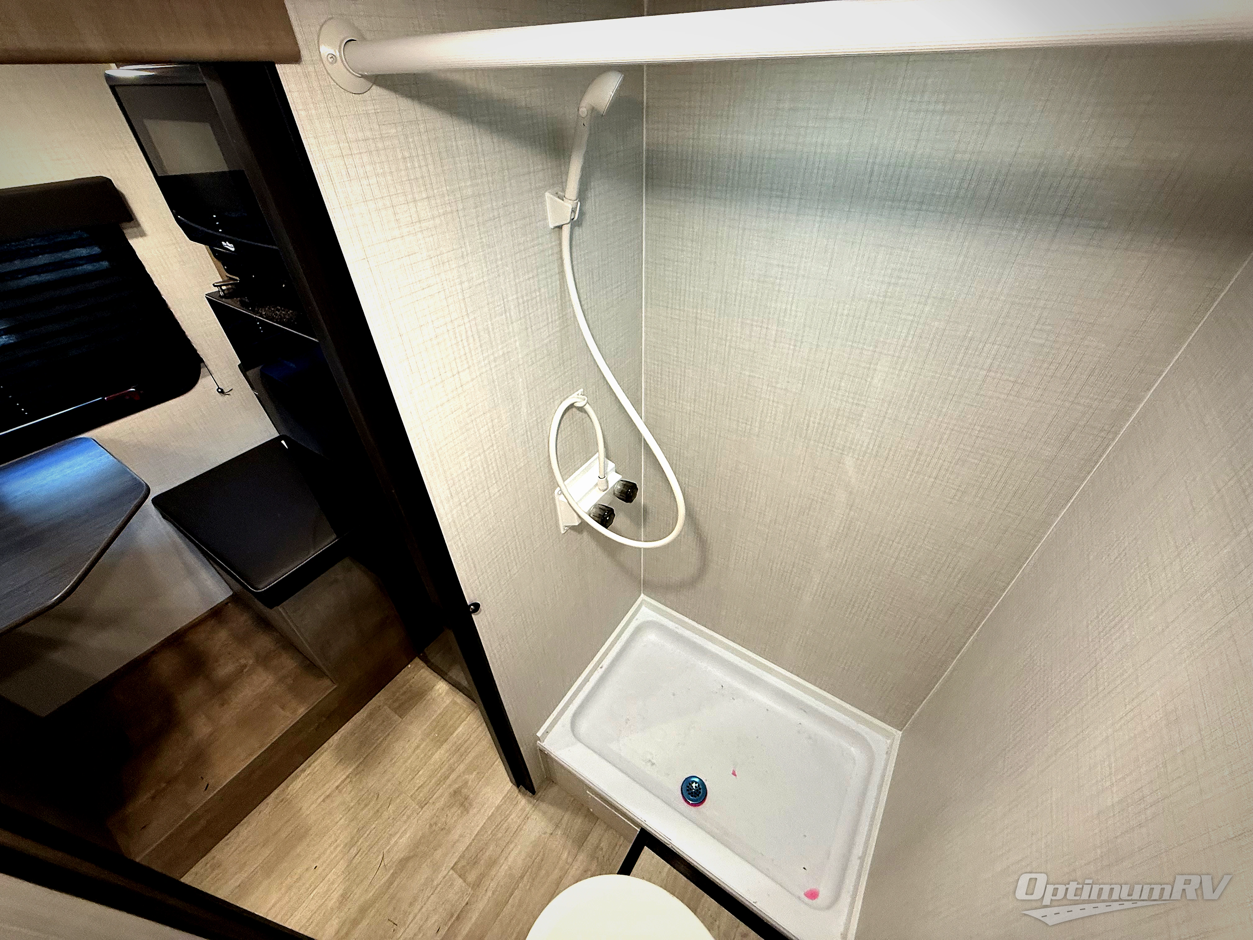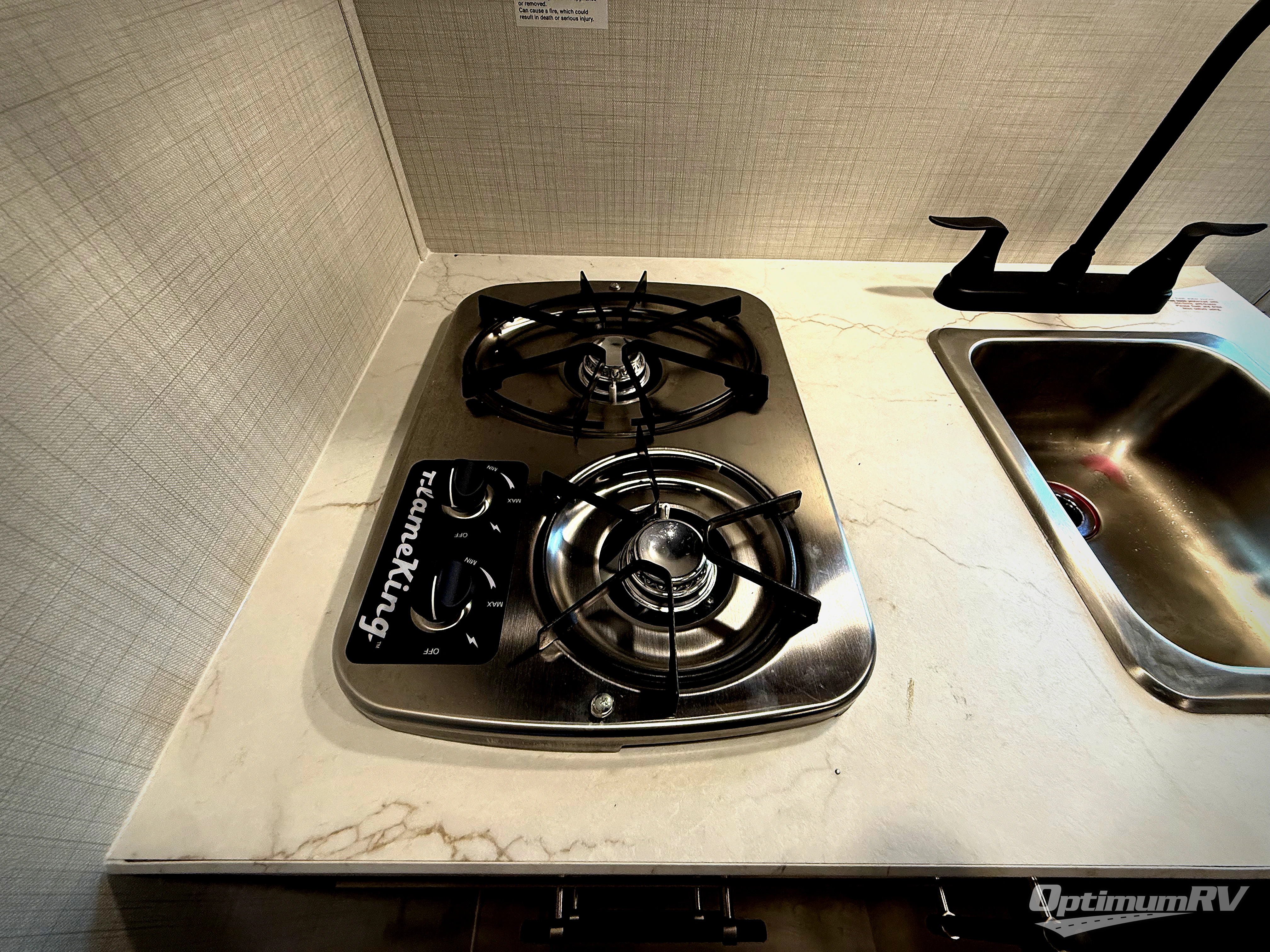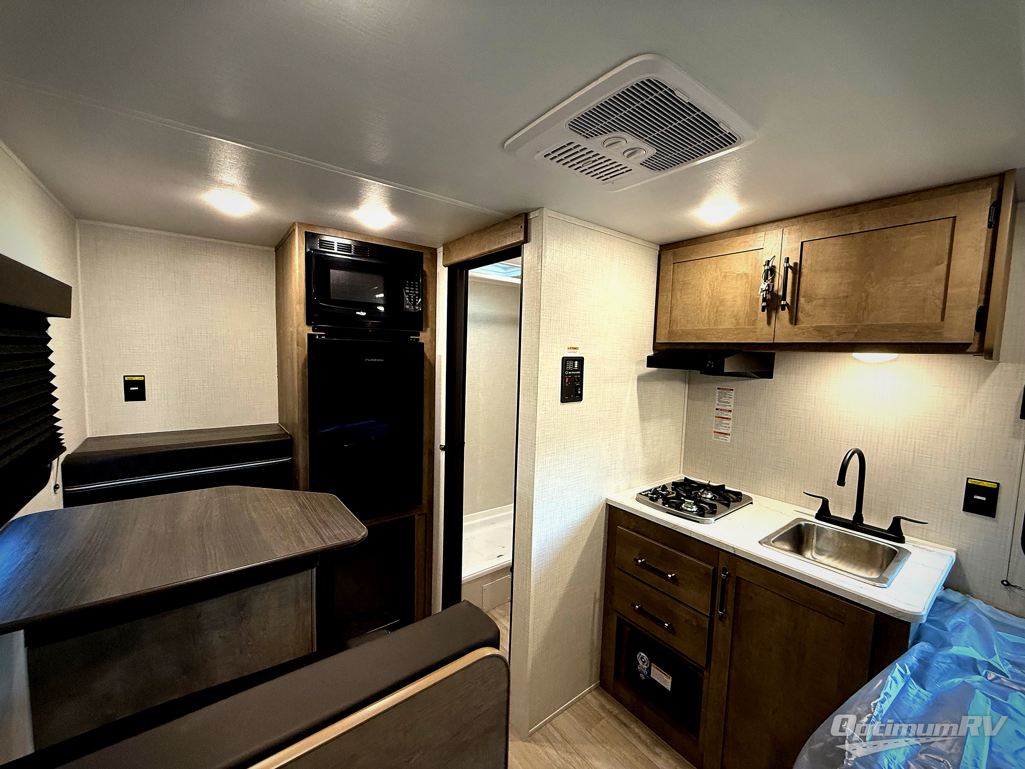 This lightweight travel trailer is perfect for three happy campers. You'll enjoy the front full-size bed, while your guest or little ones take the booth dinette when it's not being used to dine at. There is also a shelf above the bed to keep your things organized. A private bath includes a shower with a toilet so you can freshen up each day without having to leave your camper. You can make your meals on the two burner gas cooktop or in the microwave oven, then take your plate outdoors to eat under the 8' power awning!