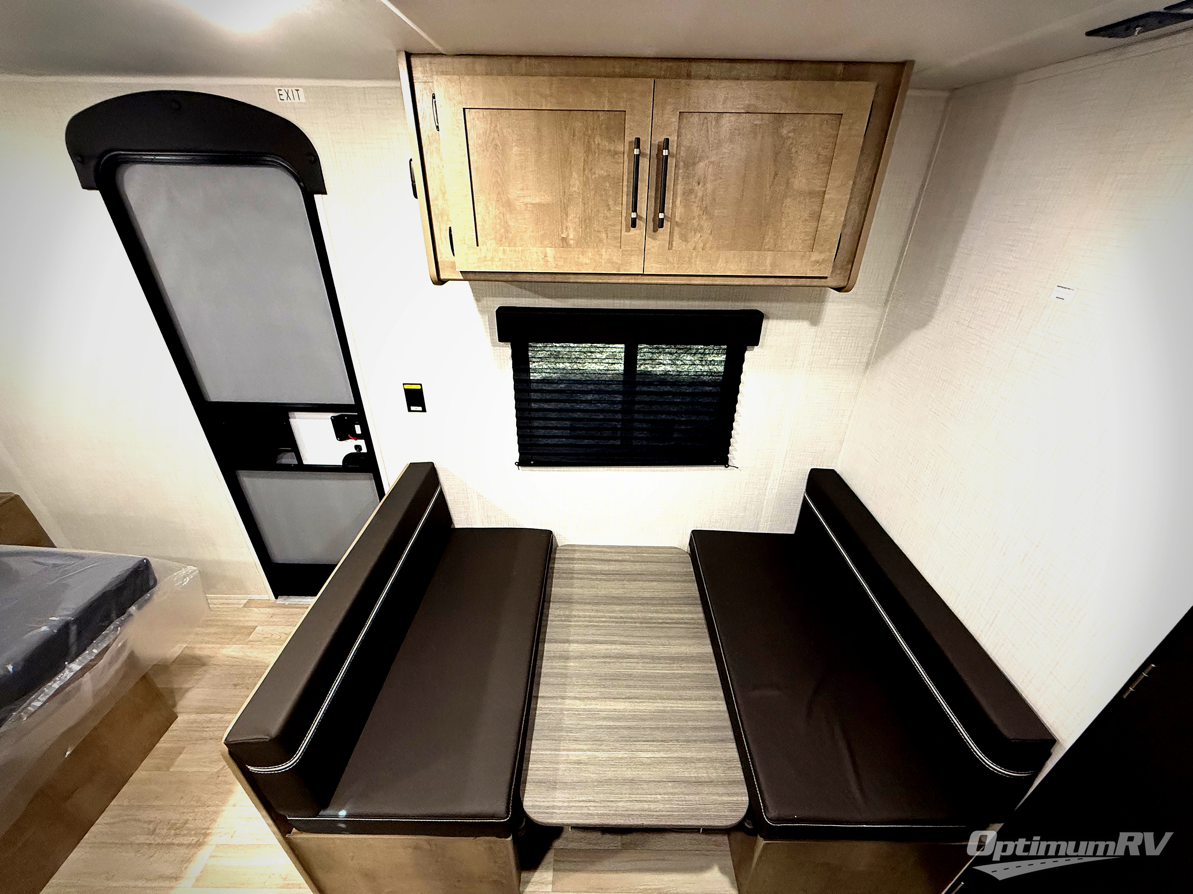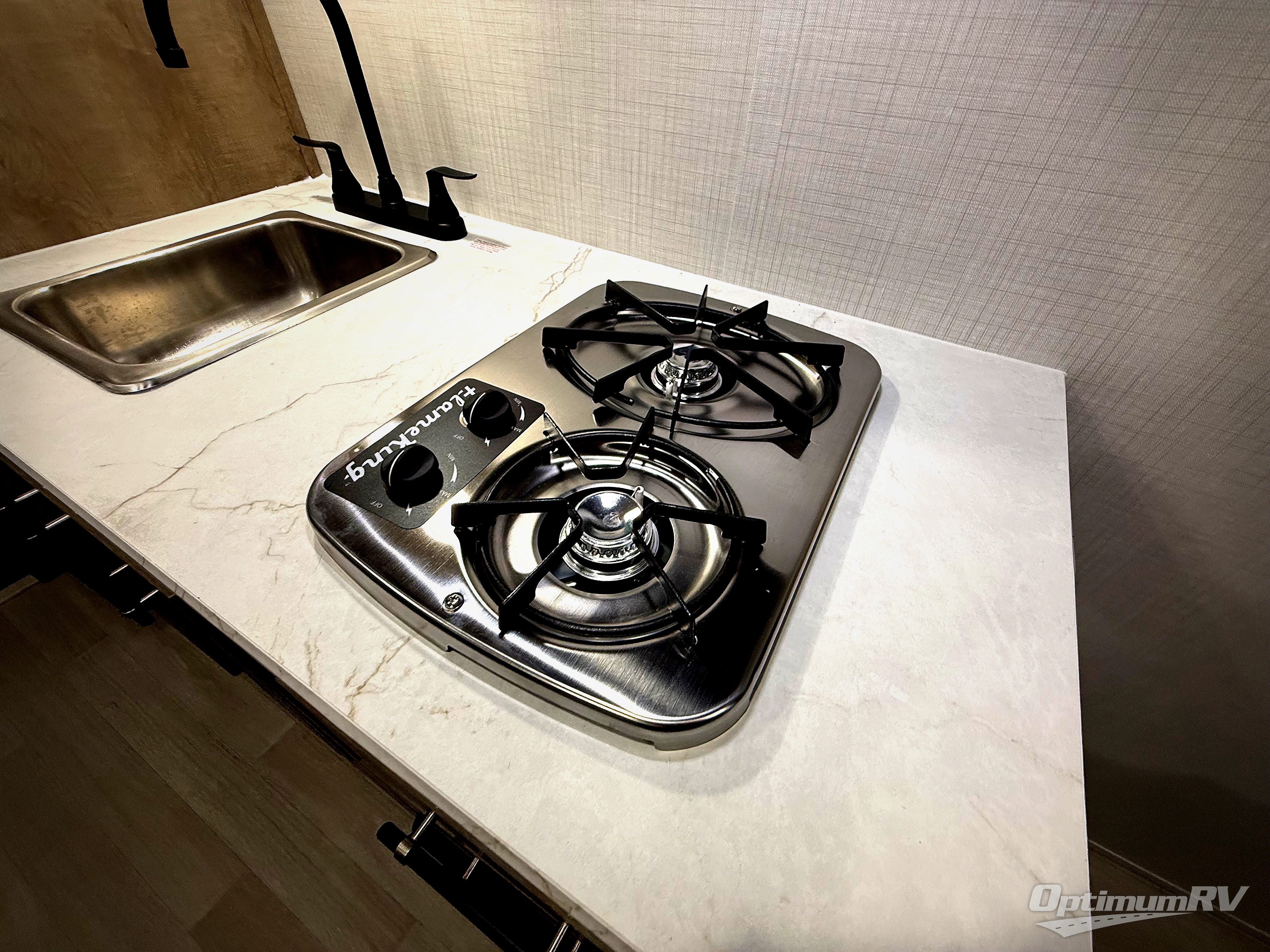 This cozy trailer for two or four will have you out enjoying nature easily. There is a queen bed for you, and the booth dinette can easily transform into a bed for one or two more campers if needed at night. The rear private bath features a shower and vanity with sink, plus toilet so no late night trips to the campground bathroom. There is ample storage in overhead cabinets on both sides of the trailer, as well as dual closets and nightstands on either side of the bed. A 10' awning offers even more living space outside. Grab a couple of camp chairs and enjoy hanging out with your campground neighbors or enjoying a campfire.