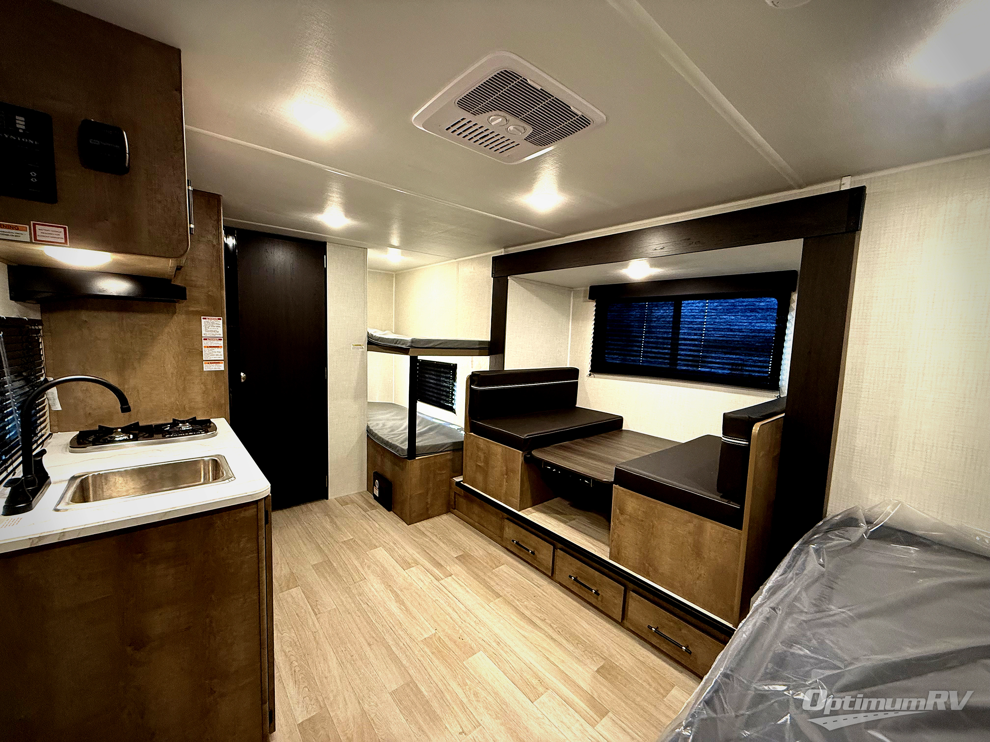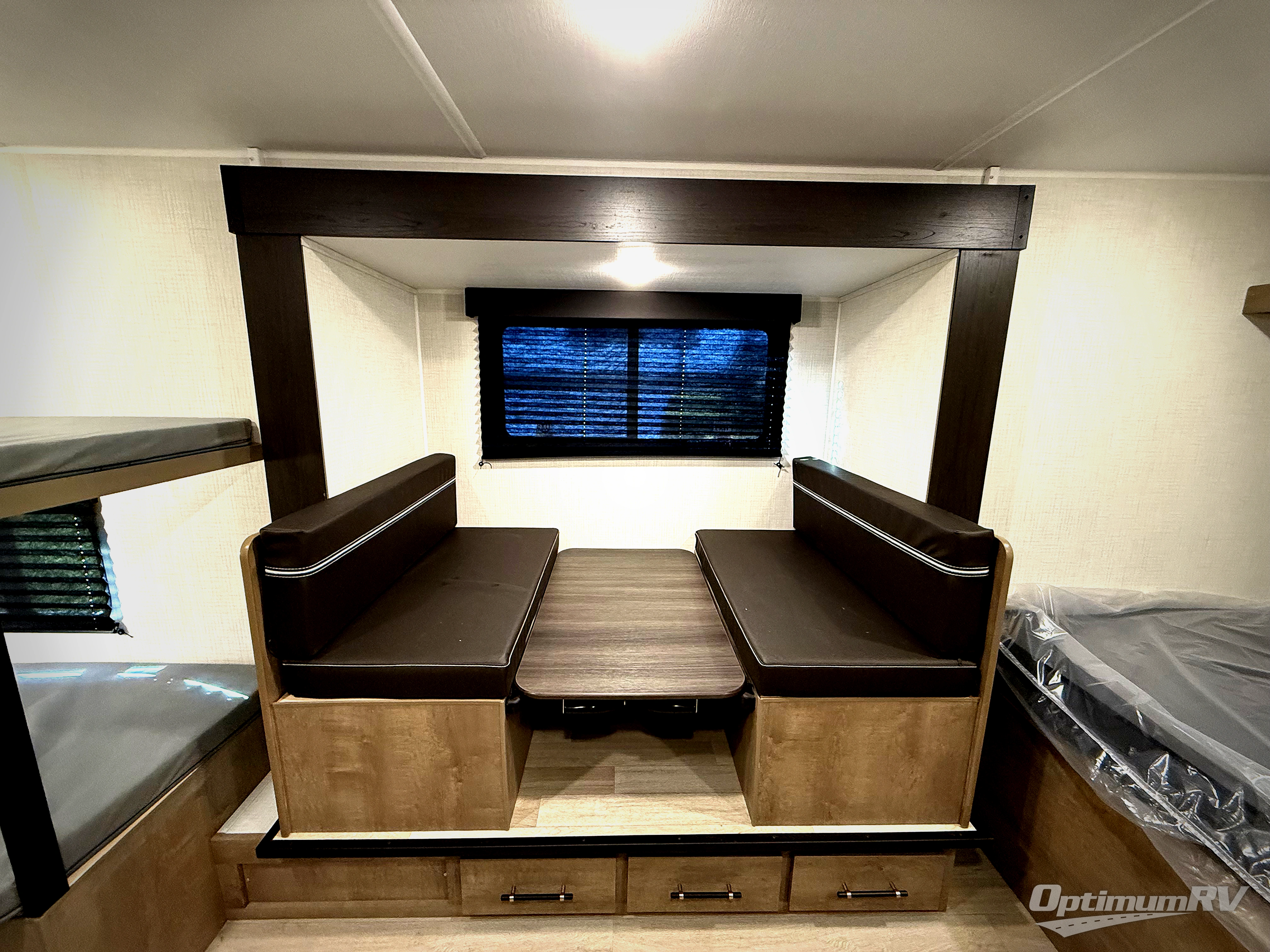 When you say "camping" your kids will immediately think about sleeping on the bunk beds and playing outdoors! There is something about planning the trip that gets everyone excited, and once at your campsite, the excitement grows. You will have your own bed up front as well as a closet and nightstand for your things. The booth dinette doubles as sleeping space and includes drawers for storage, plus the slide provides more floor space. The cook can make warm meals in the galley kitchen, and the full bathroom will keep everyone refreshed and ready for the next day.