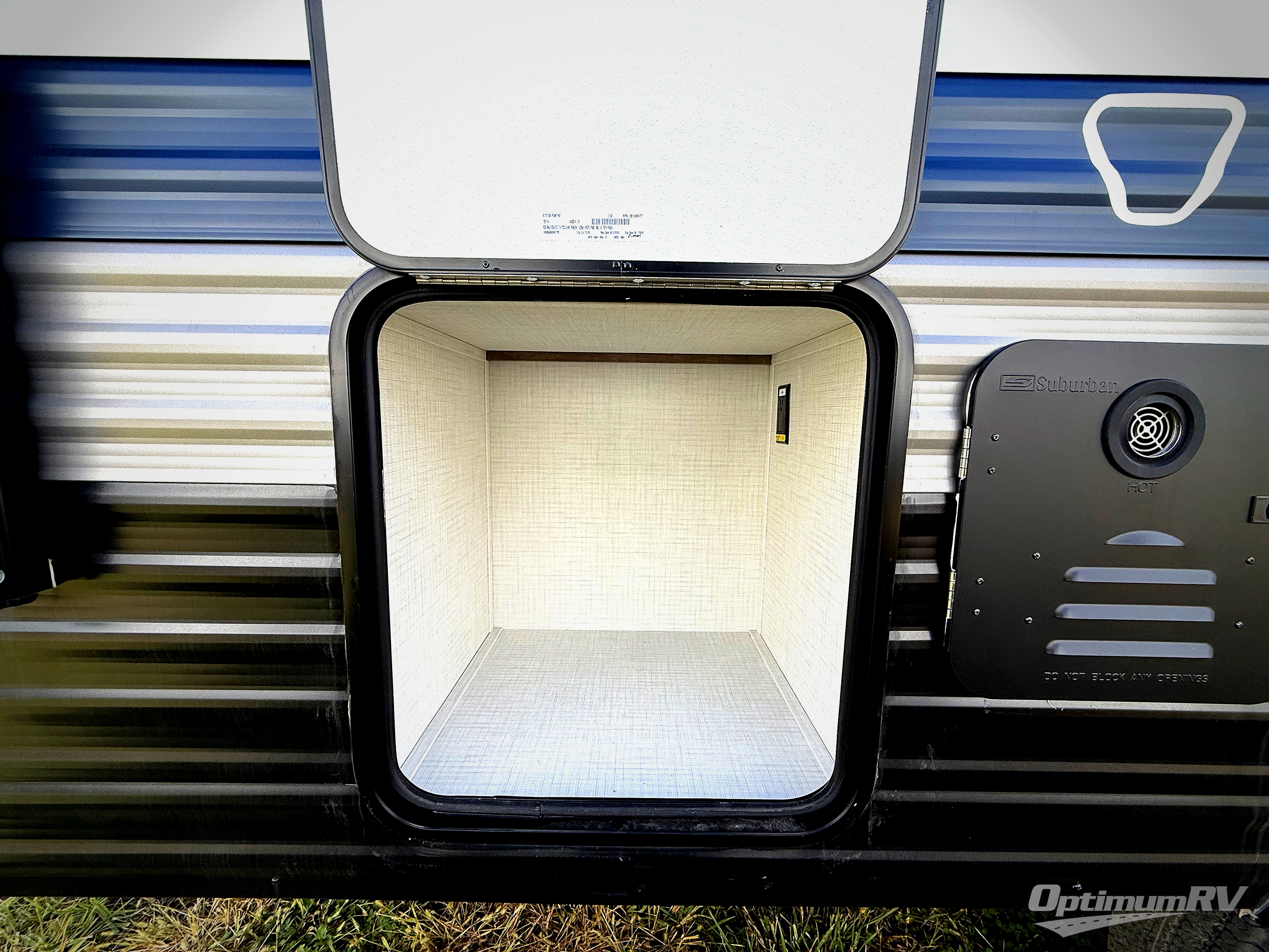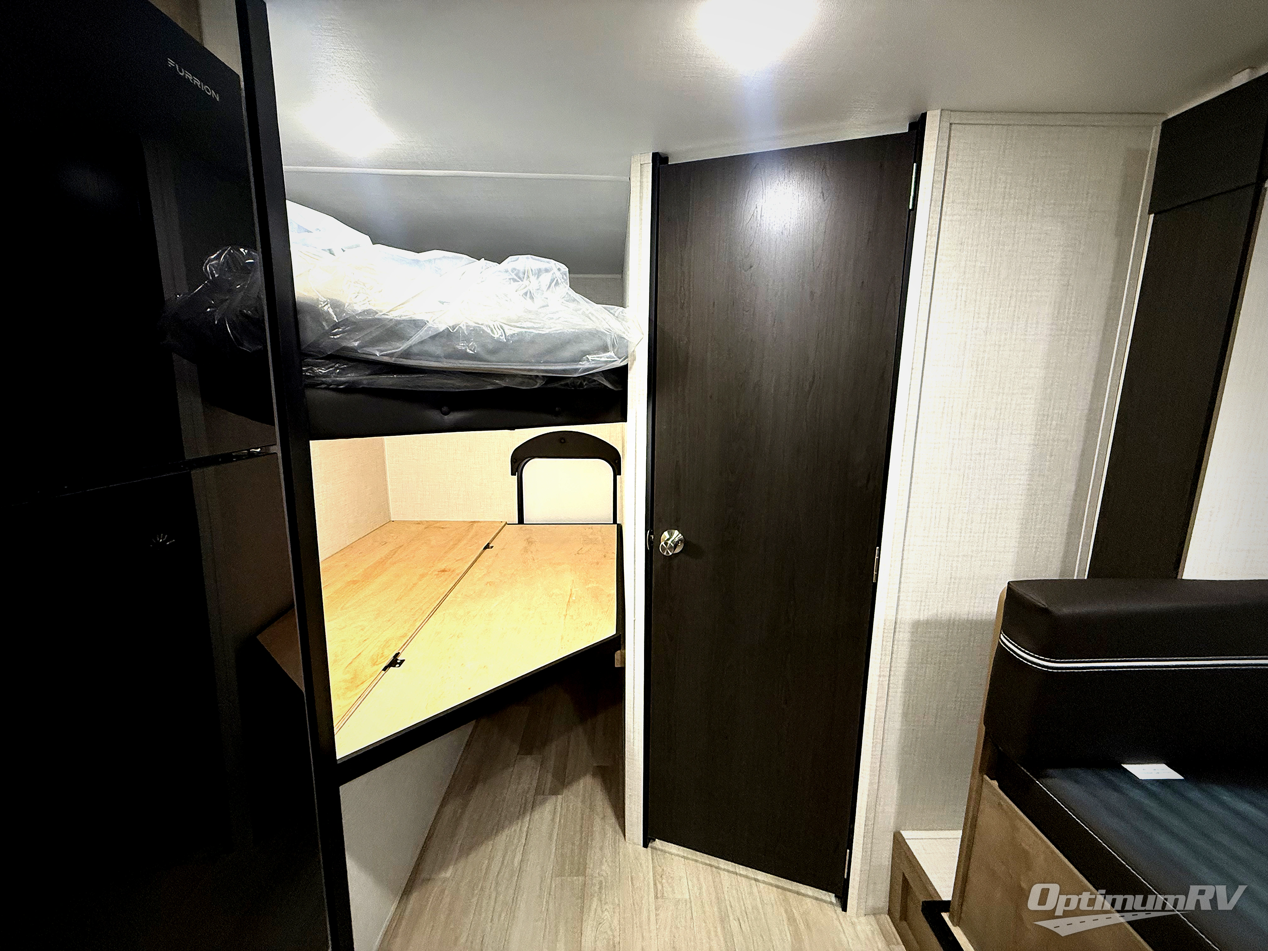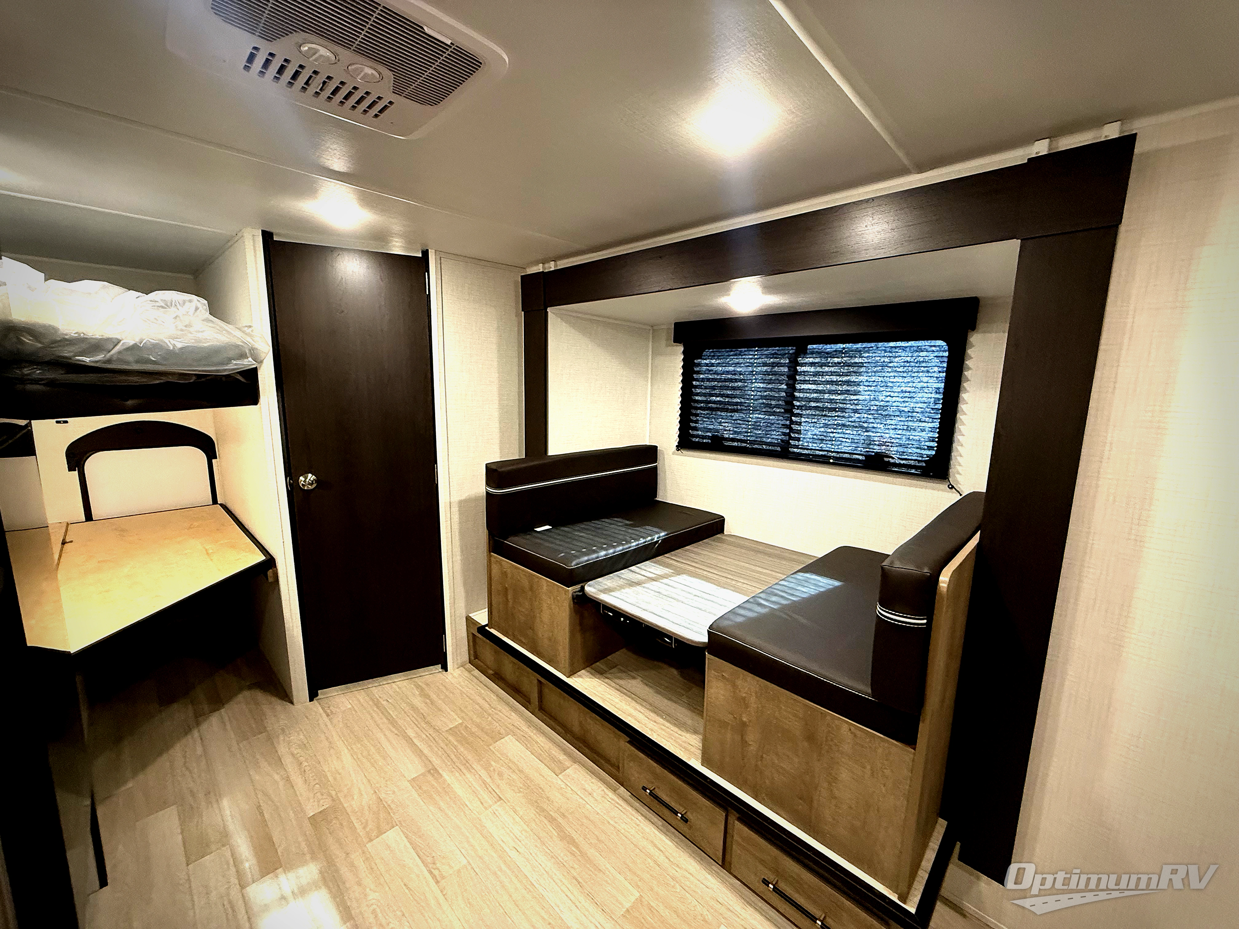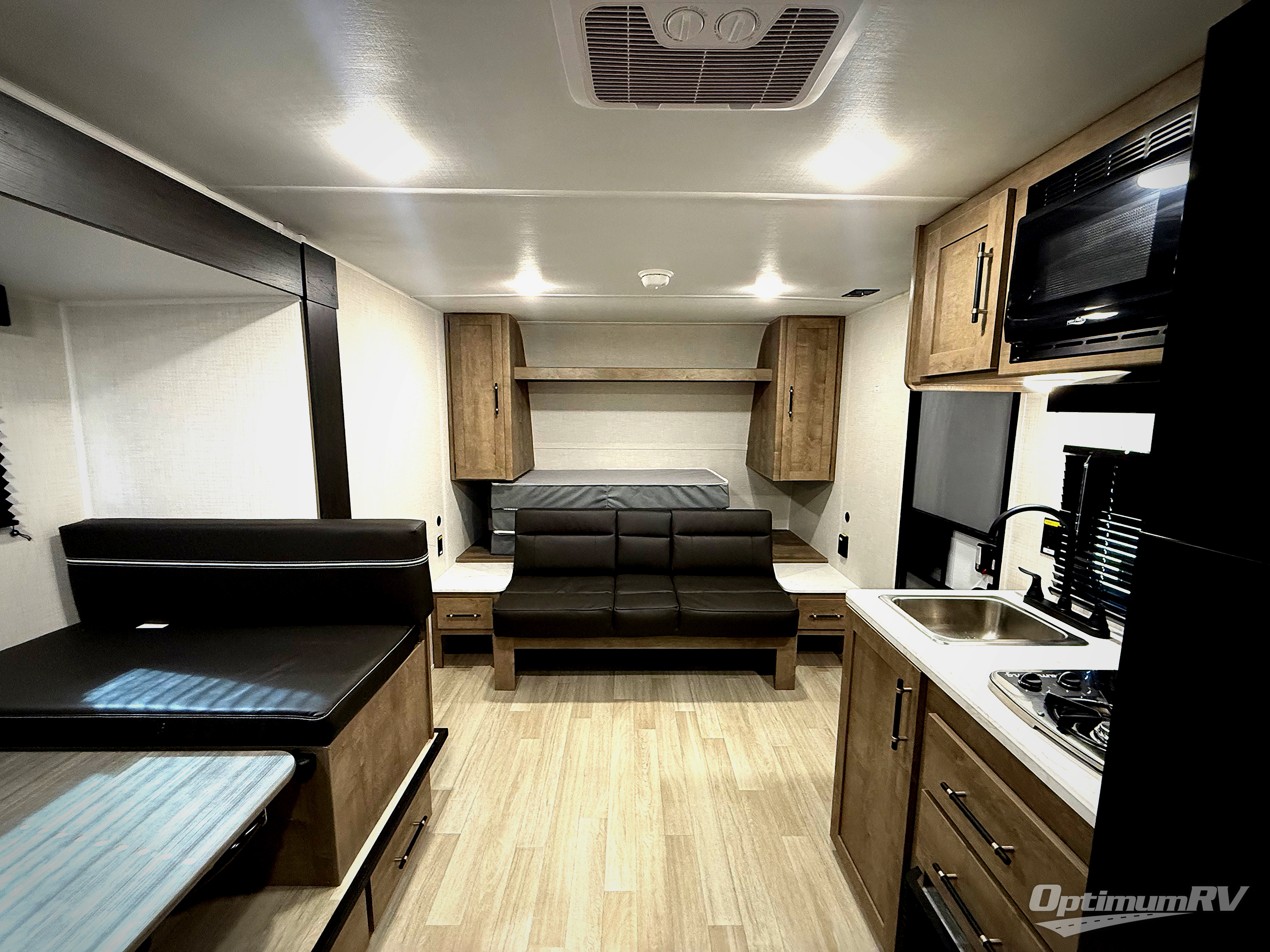 This cute Springdale Mini bunk model will easily sleep seven with the double-size bunks, booth dinette slide, and queen Murphy bed which features a fold-down sofa at the end. During the daytime, you can have the seating you need and want, and at night the sofa folds to become part of the front bed. The rear corner bath is convenient and features a tub/shower, toilet, and sink. The kitchen is fully equipped to allow you to cook as you travel. Enjoy them while under the 15' power awning. A handy pass-thru storage compartment up front offers ample space for camp equipment, and there is additional storage accessible beneath the bunk in back.
