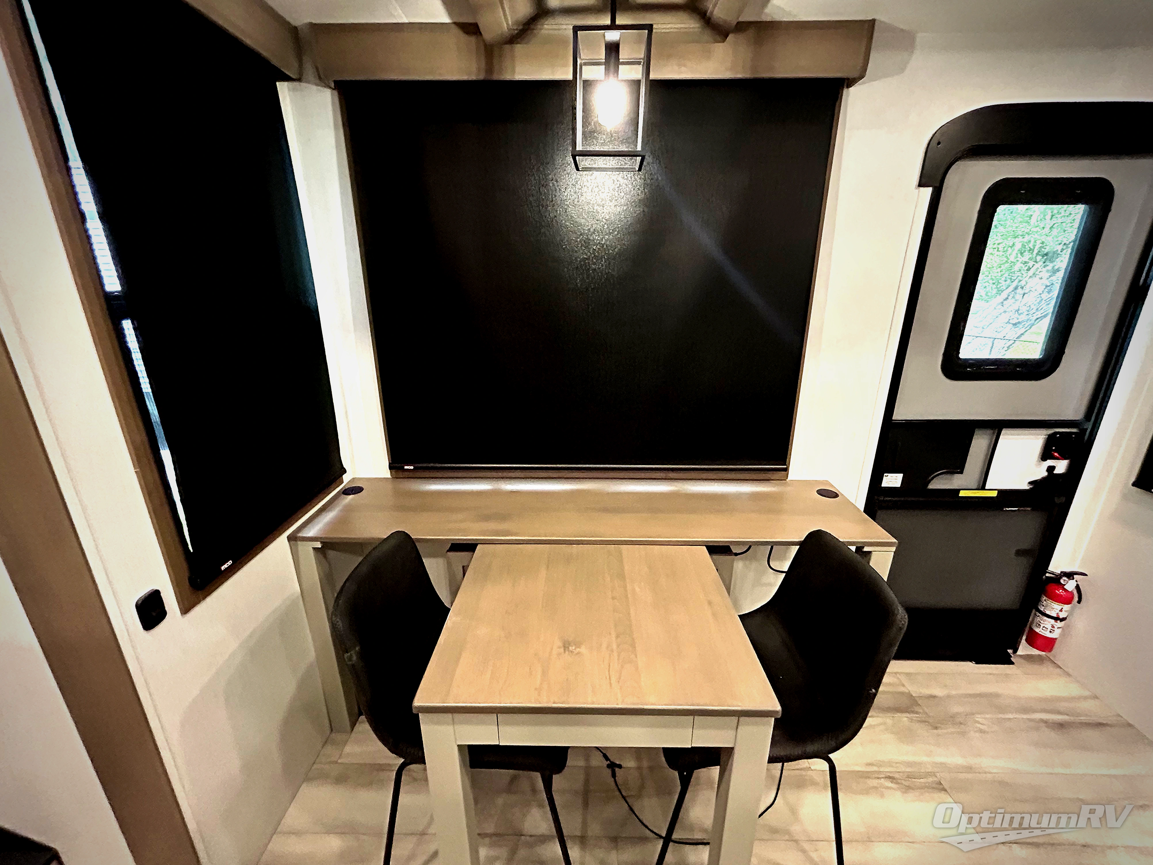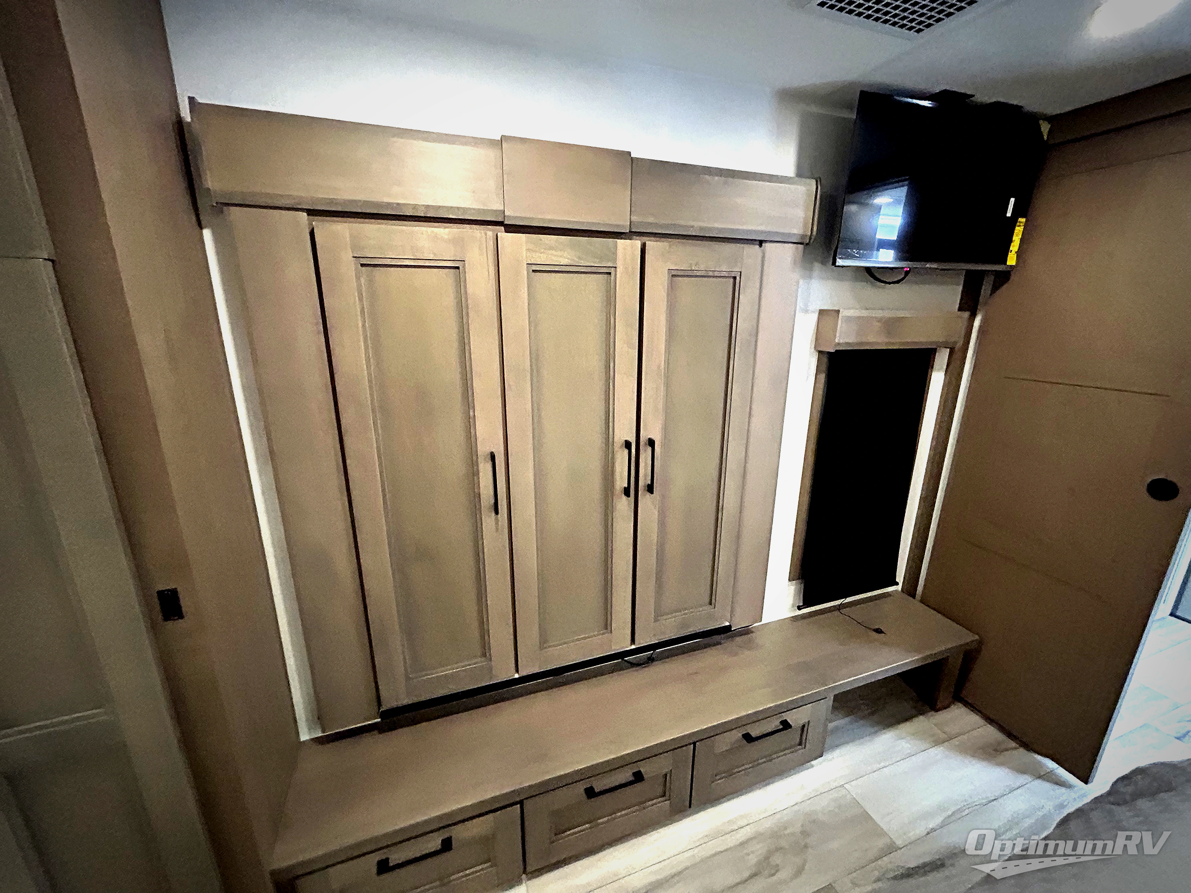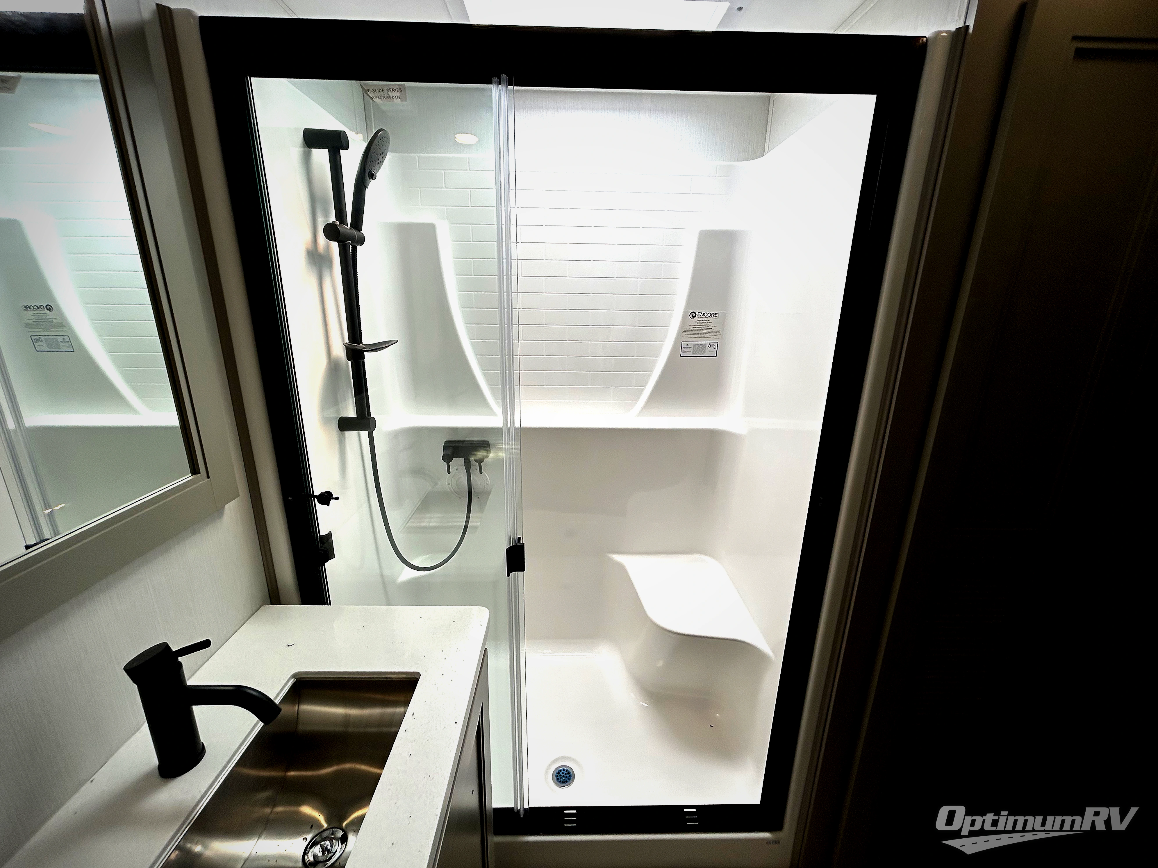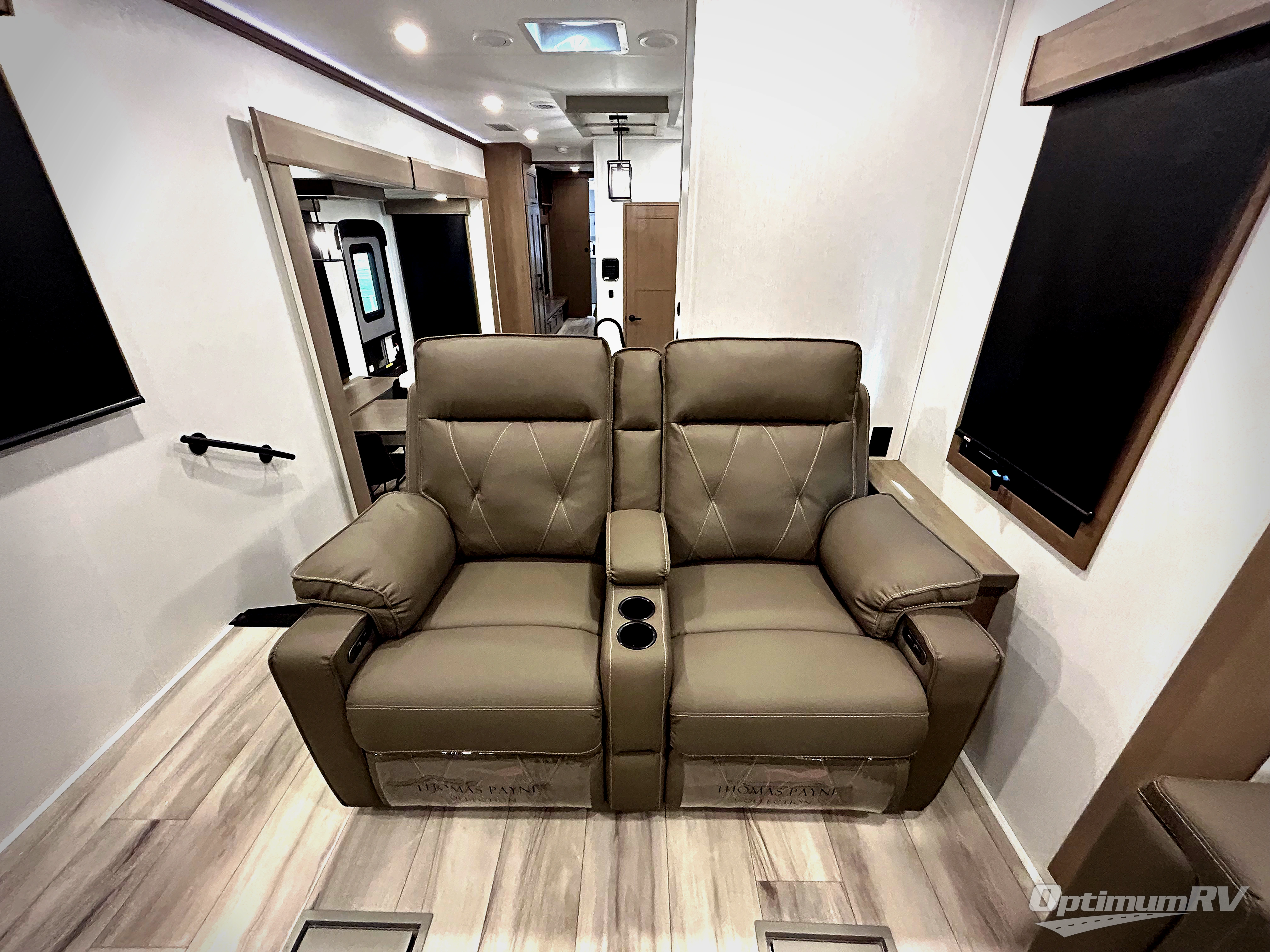 Fall in love with this unit's kitchen with residential appliances, a farmhouse stainless steel sink, a dishwasher, pantry, 26 cu refrigerator, and a sliding table/desk with chairs. Spend cozy entertainment nights watching the 65" LED TV with a fireplace below, a theater seating with USB ports, and two hide-a-bed sofa slides that widen this area so everyone can stretch out and relax. At night, retire to your private bedroom with a king electric tilt bed with drawers underneath, a 32" Smart LED TV, and, a closet, perfect for easy organization. Also, the full rear bathroom provides a residential shower with a seat plus linen storage, washer and dryer prep, and two sinks for more convenience. This model is also fitted with an exterior pass-through storage ideal for storing your things.