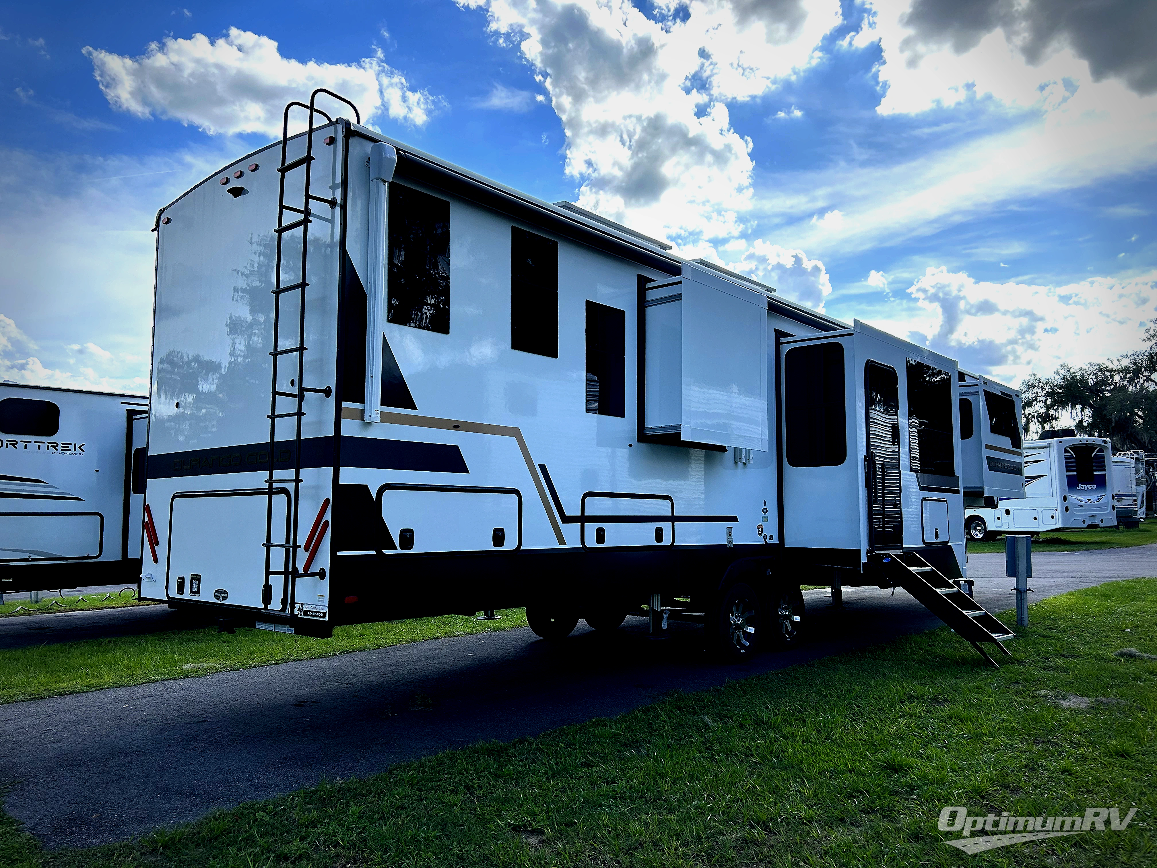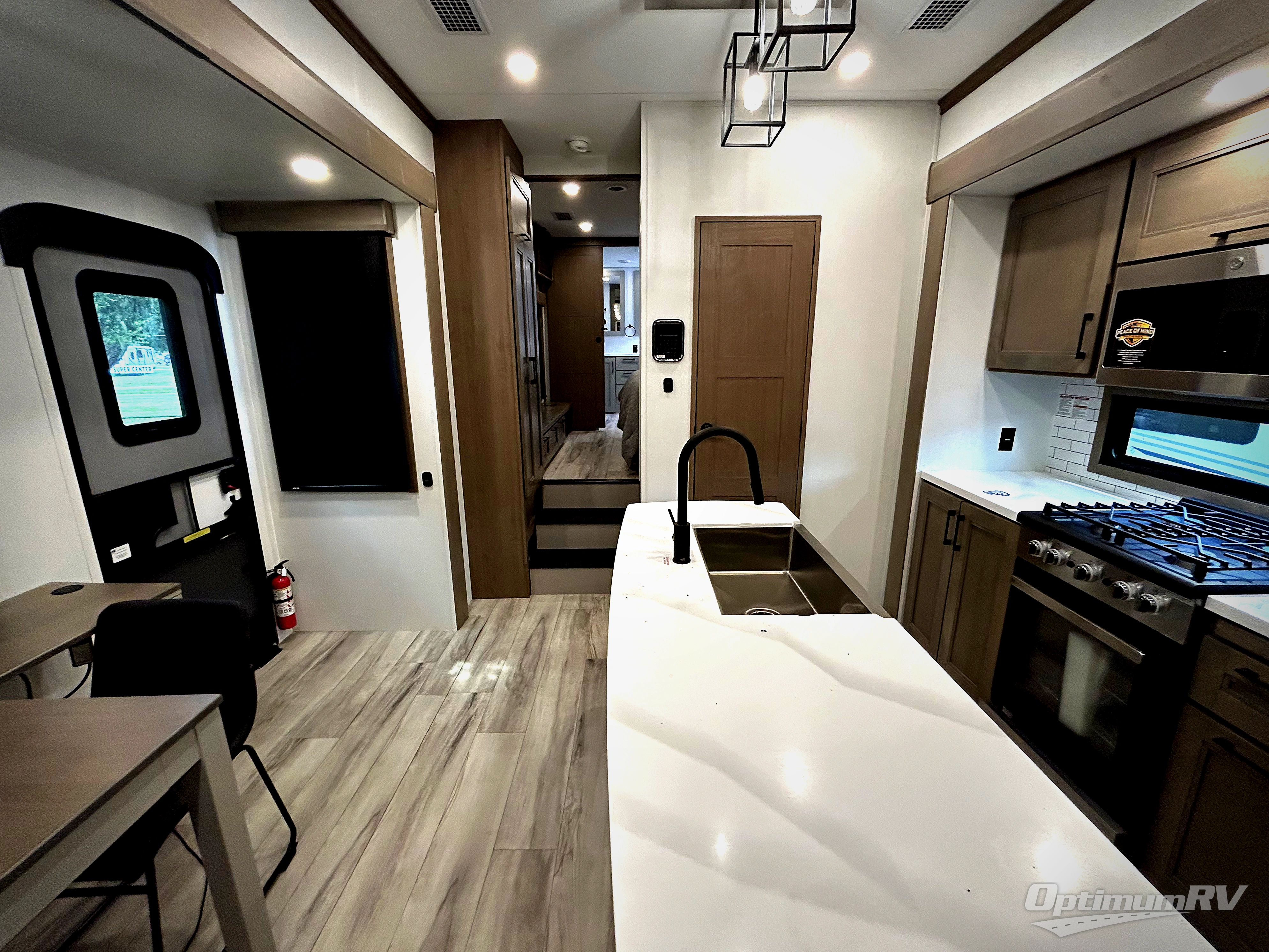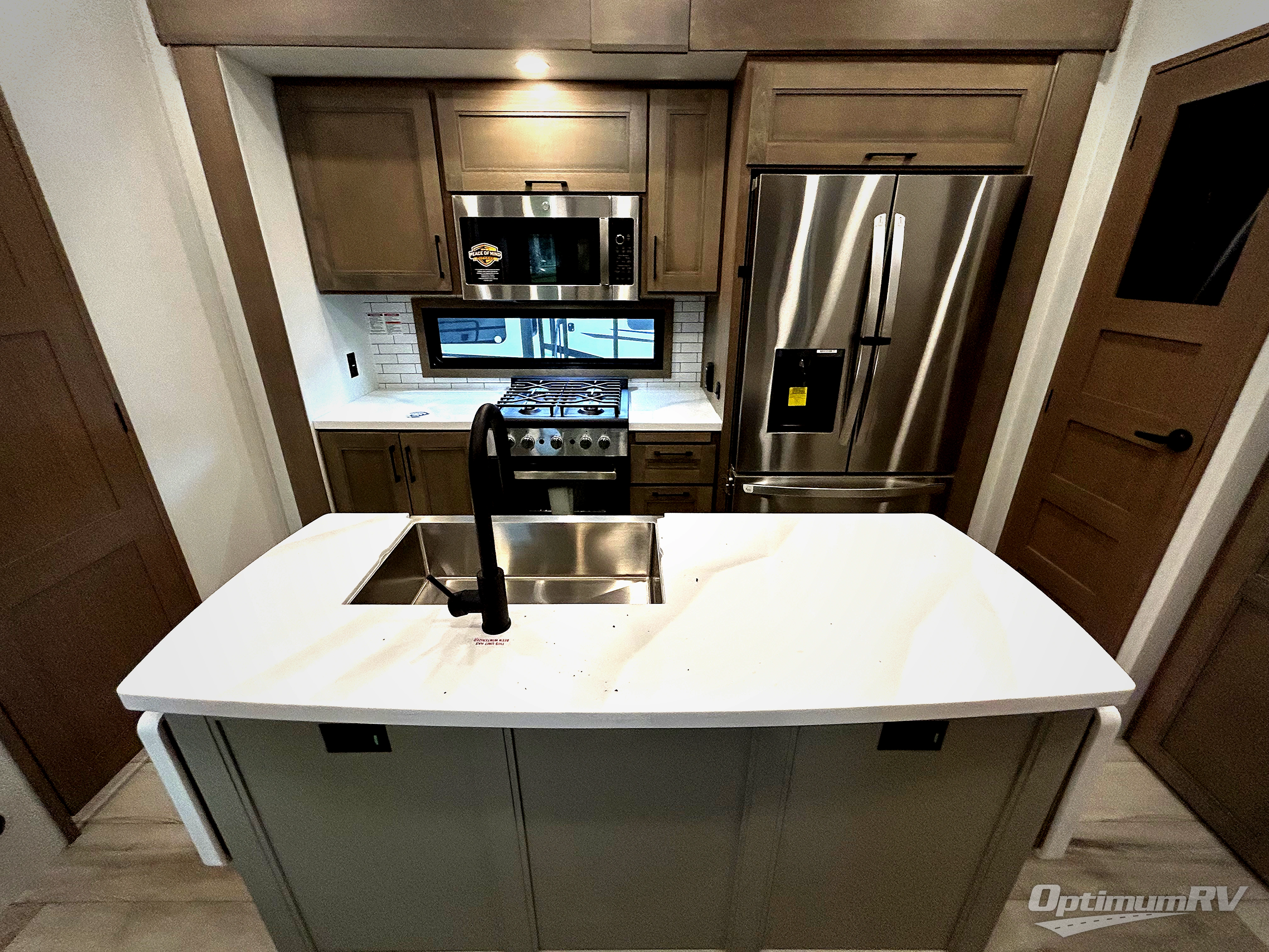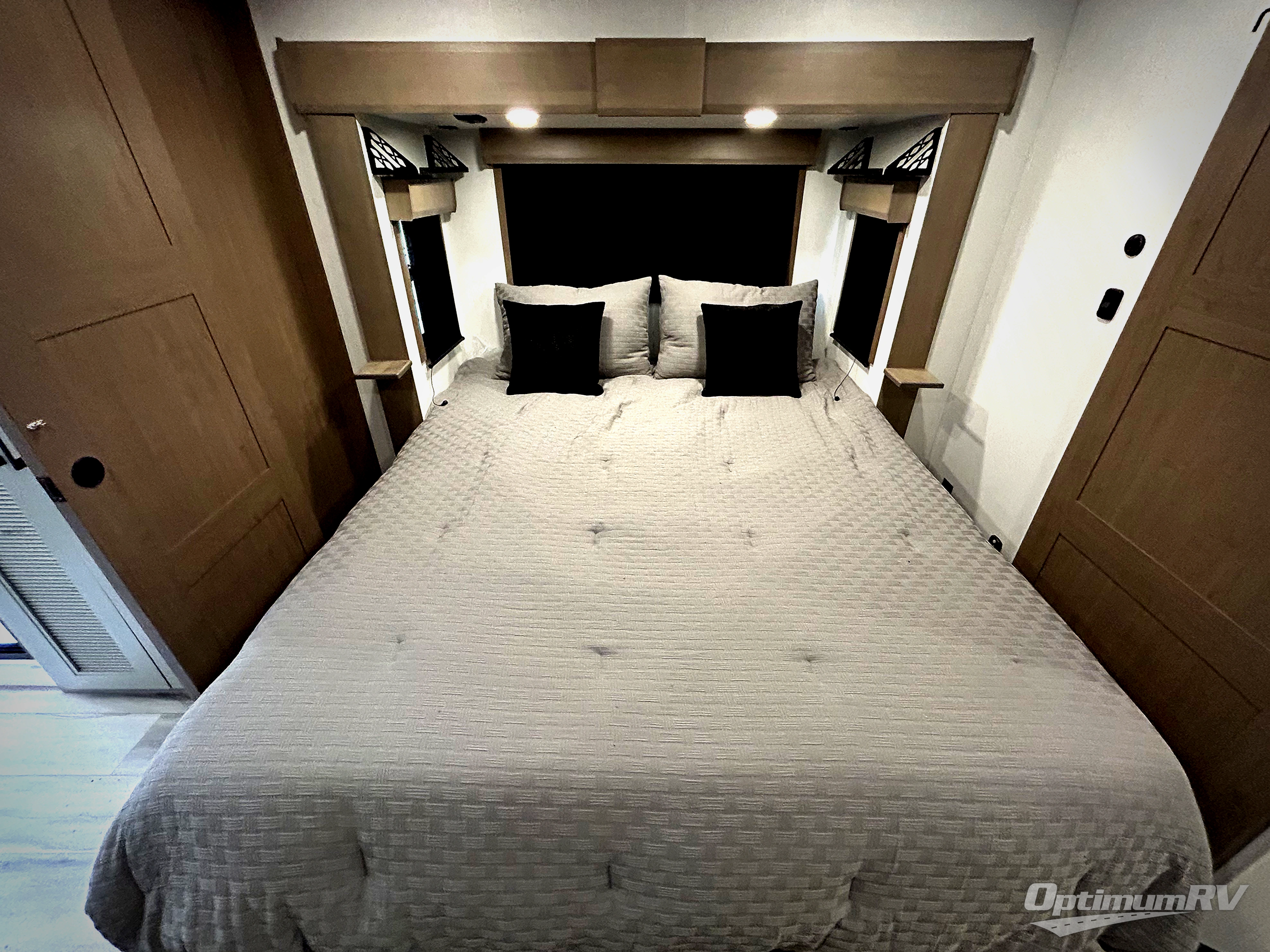 Fall in love with this unit's kitchen with residential appliances, a farmhouse stainless steel sink, a dishwasher, pantry, 26 cu refrigerator, and a sliding table/desk with chairs. Spend cozy entertainment nights watching the 65" LED TV with a fireplace below, a theater seating with USB ports, and two hide-a-bed sofa slides that widen this area so everyone can stretch out and relax. At night, retire to your private bedroom with a king electric tilt bed with drawers underneath, a 32" Smart LED TV, and, a closet, perfect for easy organization. Also, the full rear bathroom provides a residential shower with a seat plus linen storage, washer and dryer prep, and two sinks for more convenience. This model is also fitted with an exterior pass-through storage ideal for storing your things.
