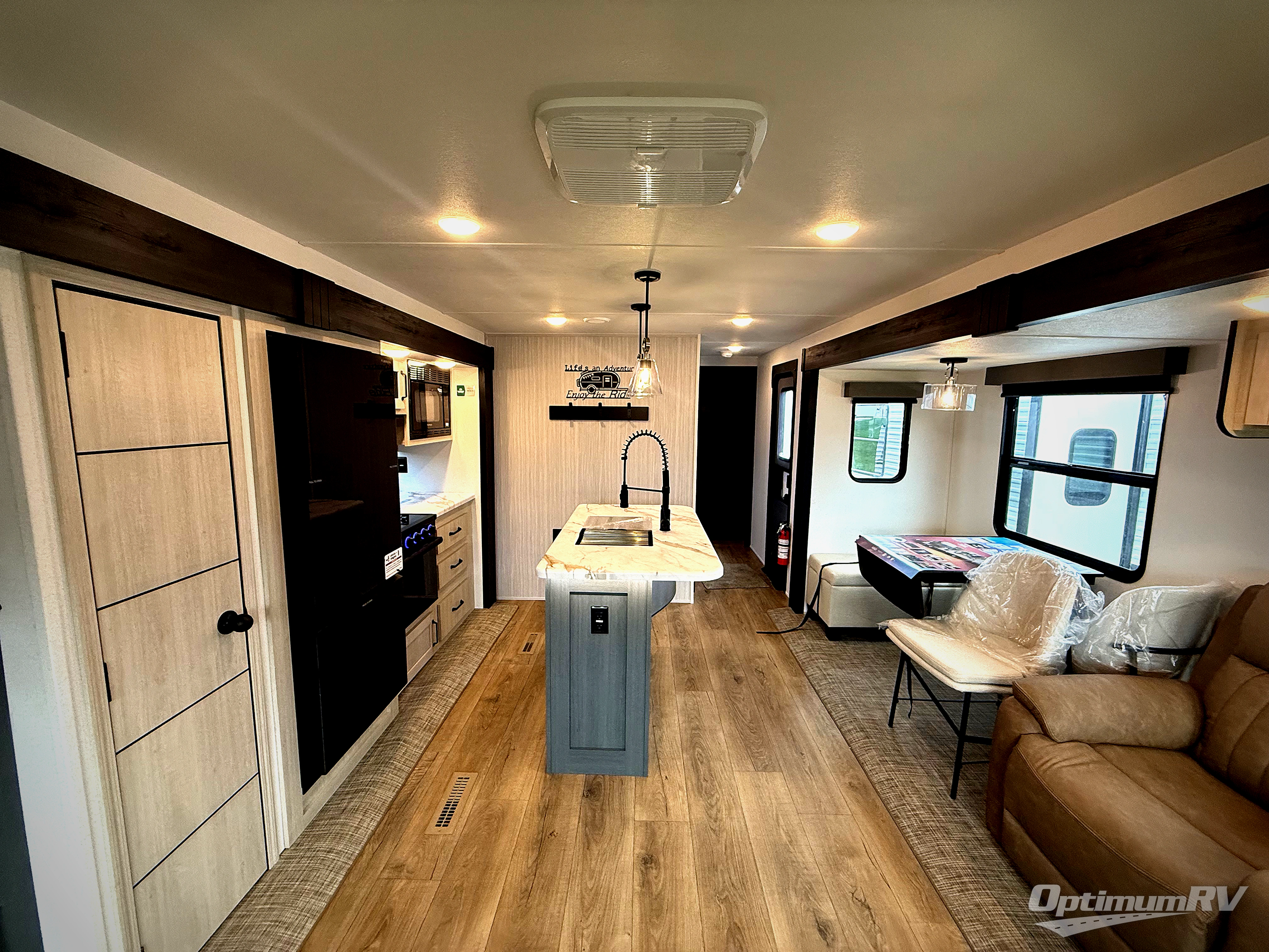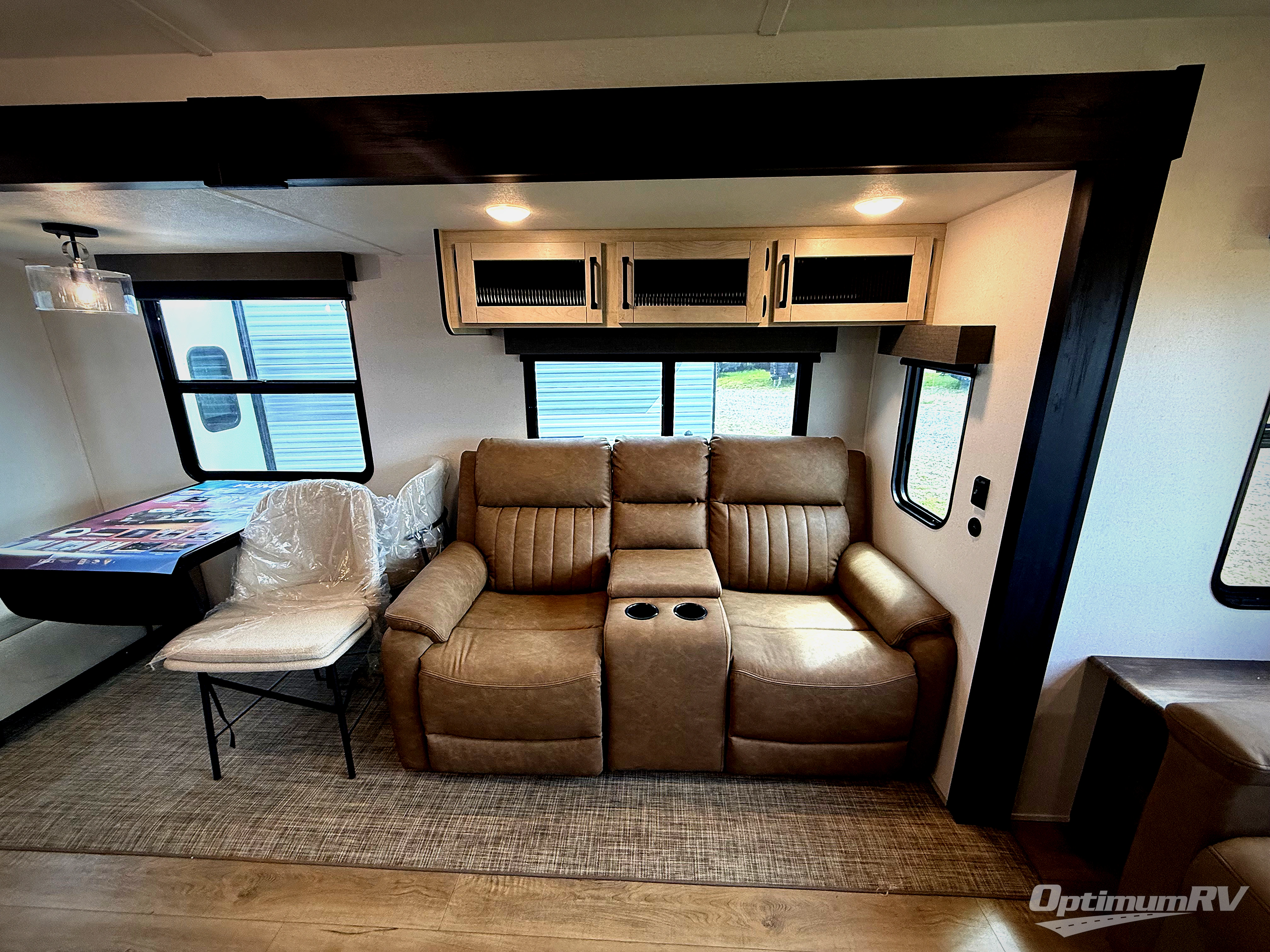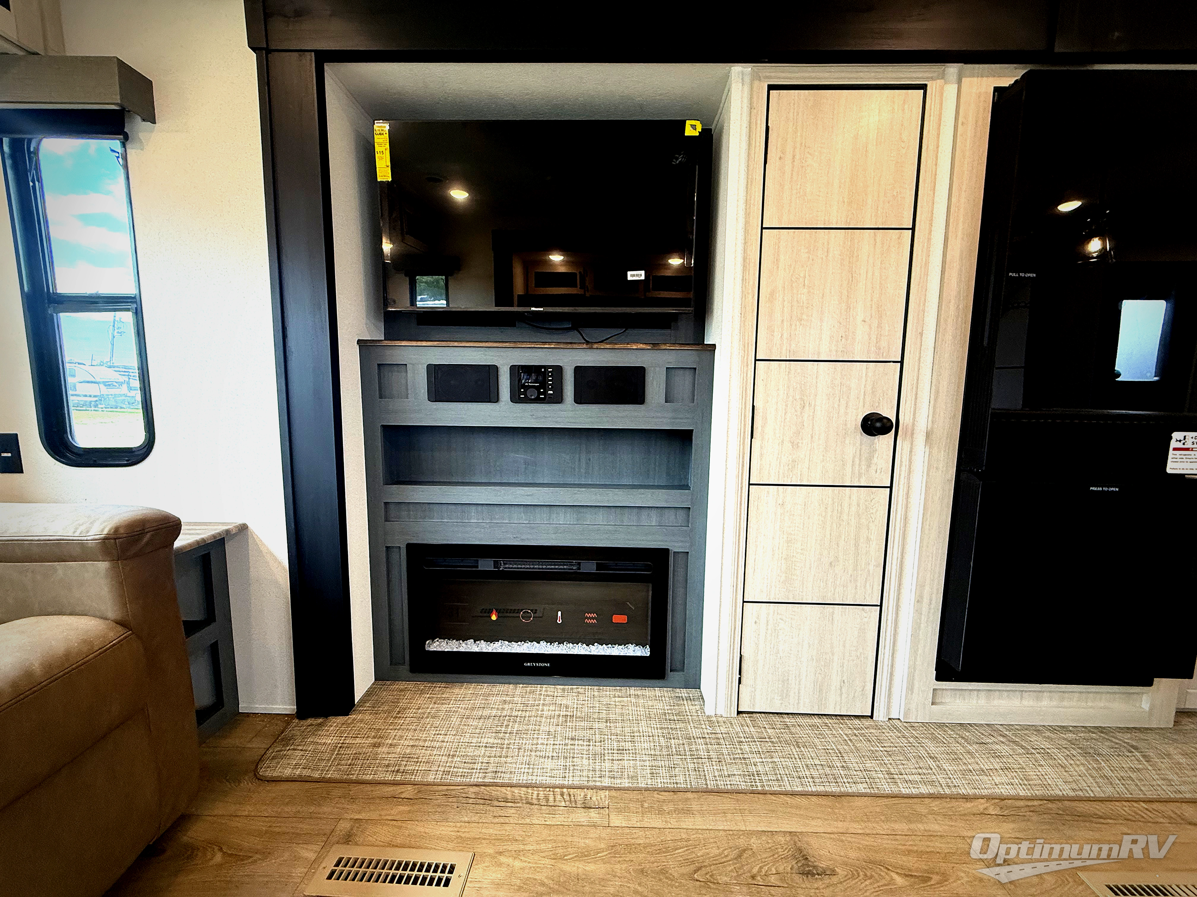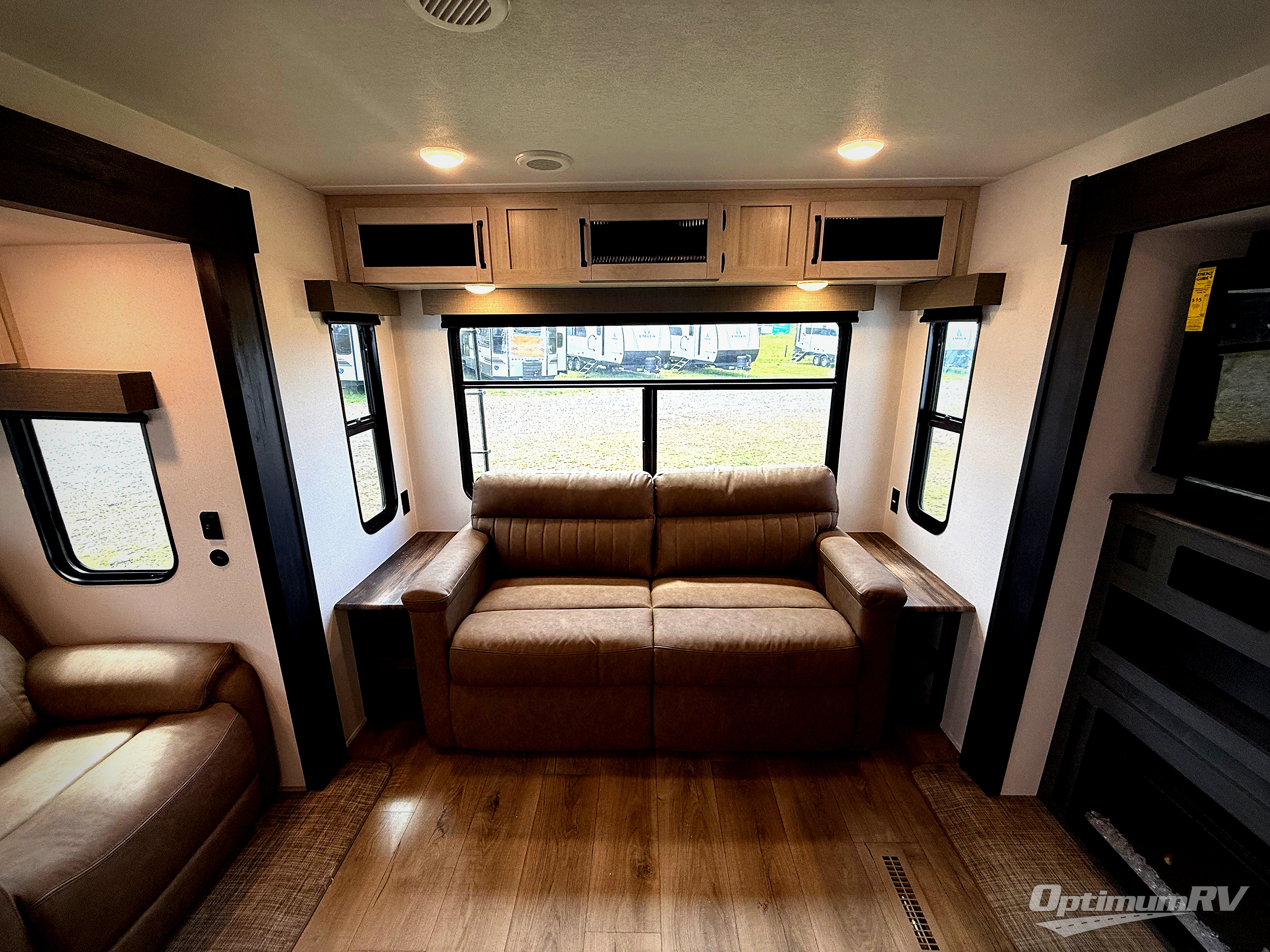 You're going to feel right at home in this travel trailer! The front private bedroom has a queen bed slide for a good night's rest, a dresser and front closet for your clothes, and another closet with washer and dryer prep. Freshen up each morning in the full bathroom with the 32" x 40" shower with a seat and then head to the kitchen to fry up some eggs on the stainless steel oven and range. You will also appreciate having a kitchen island for easier meal prep and a walk-in pantry to easily see your canned goods and snacks. The booth dinette offers a comfortable place to dine, play, and even sleep once converted. What better way to wind down your nights than to relax on either the rear sofa or in one of the two recliners across from the entertainment center with a fireplace!