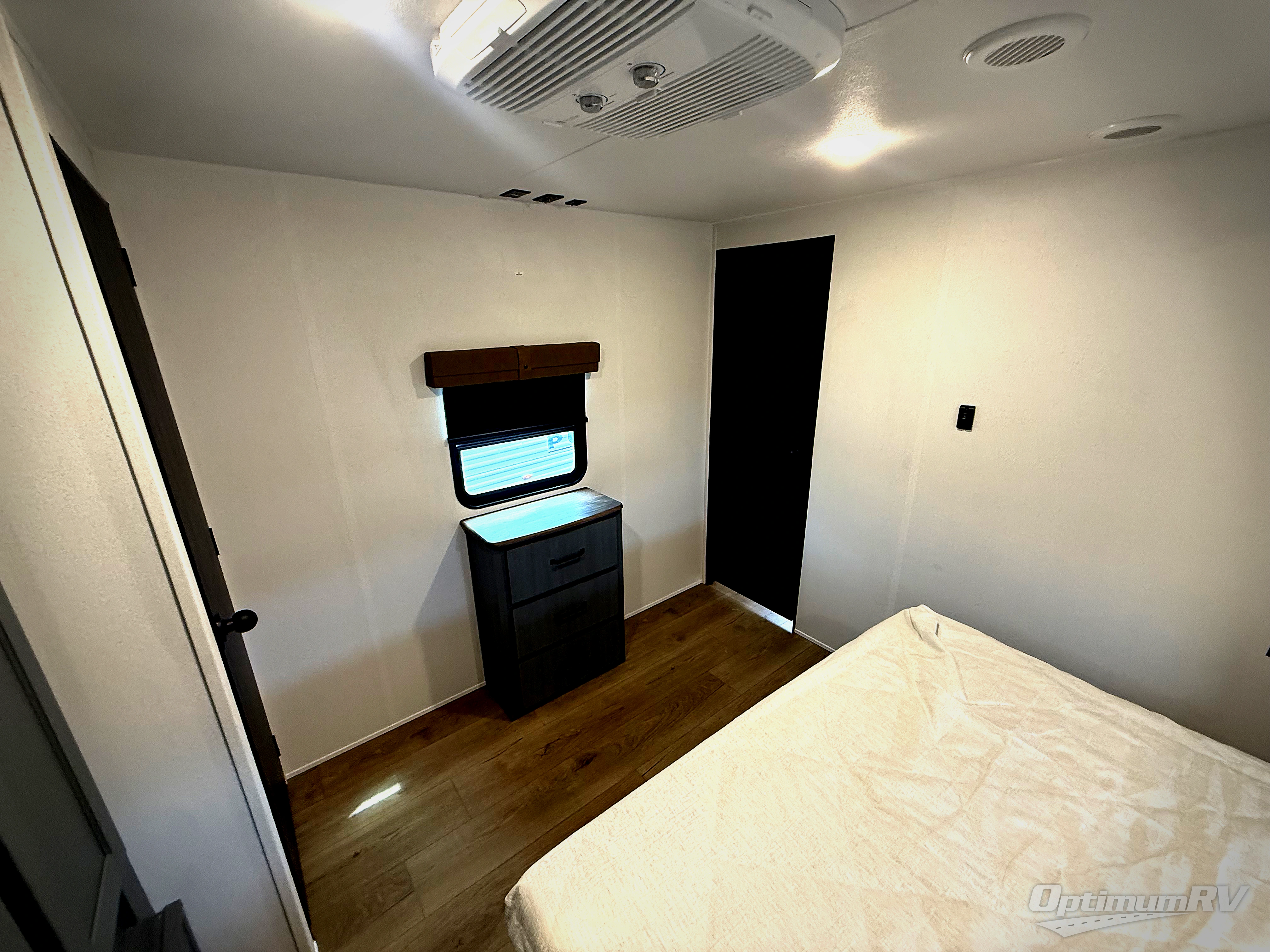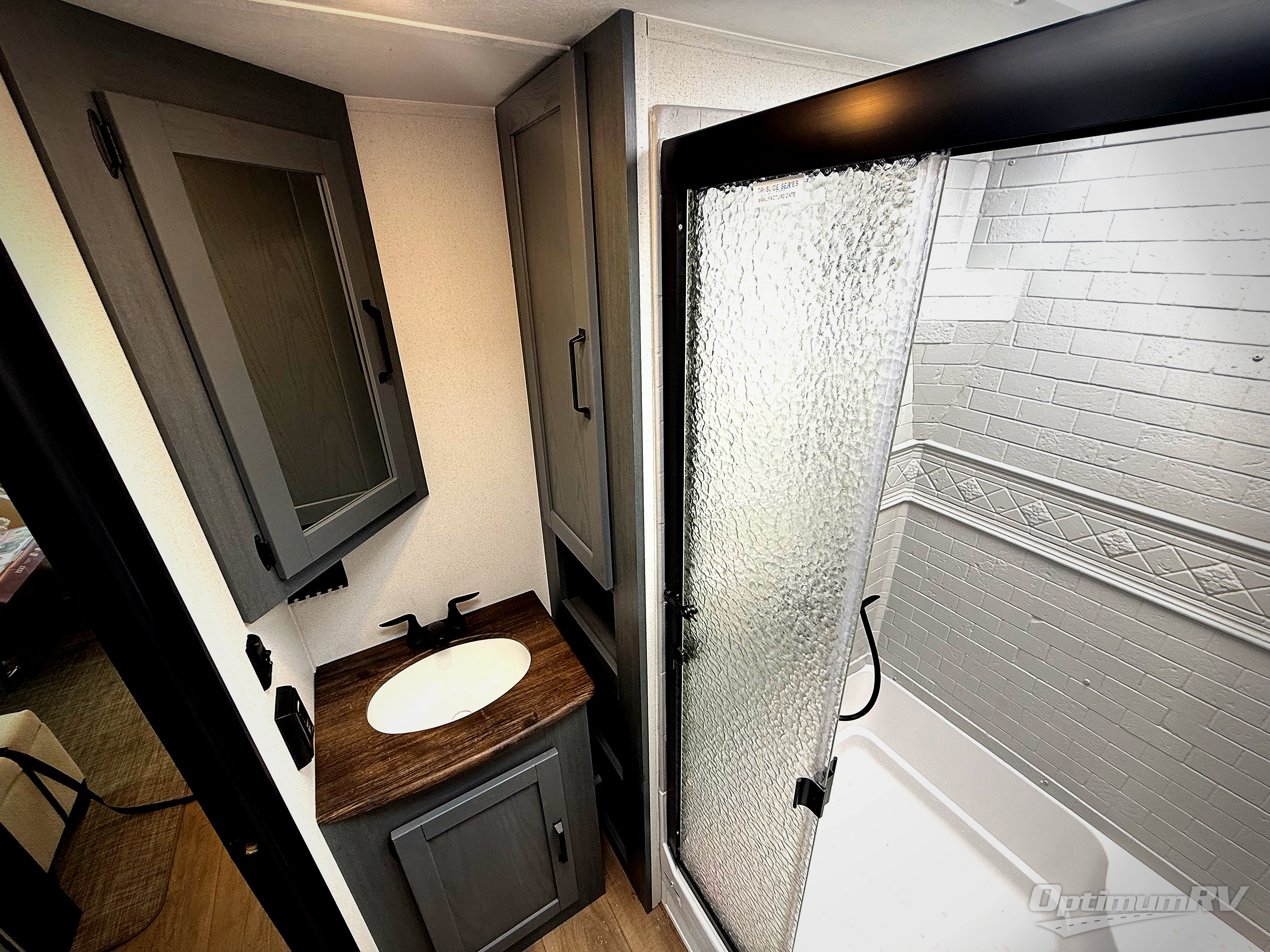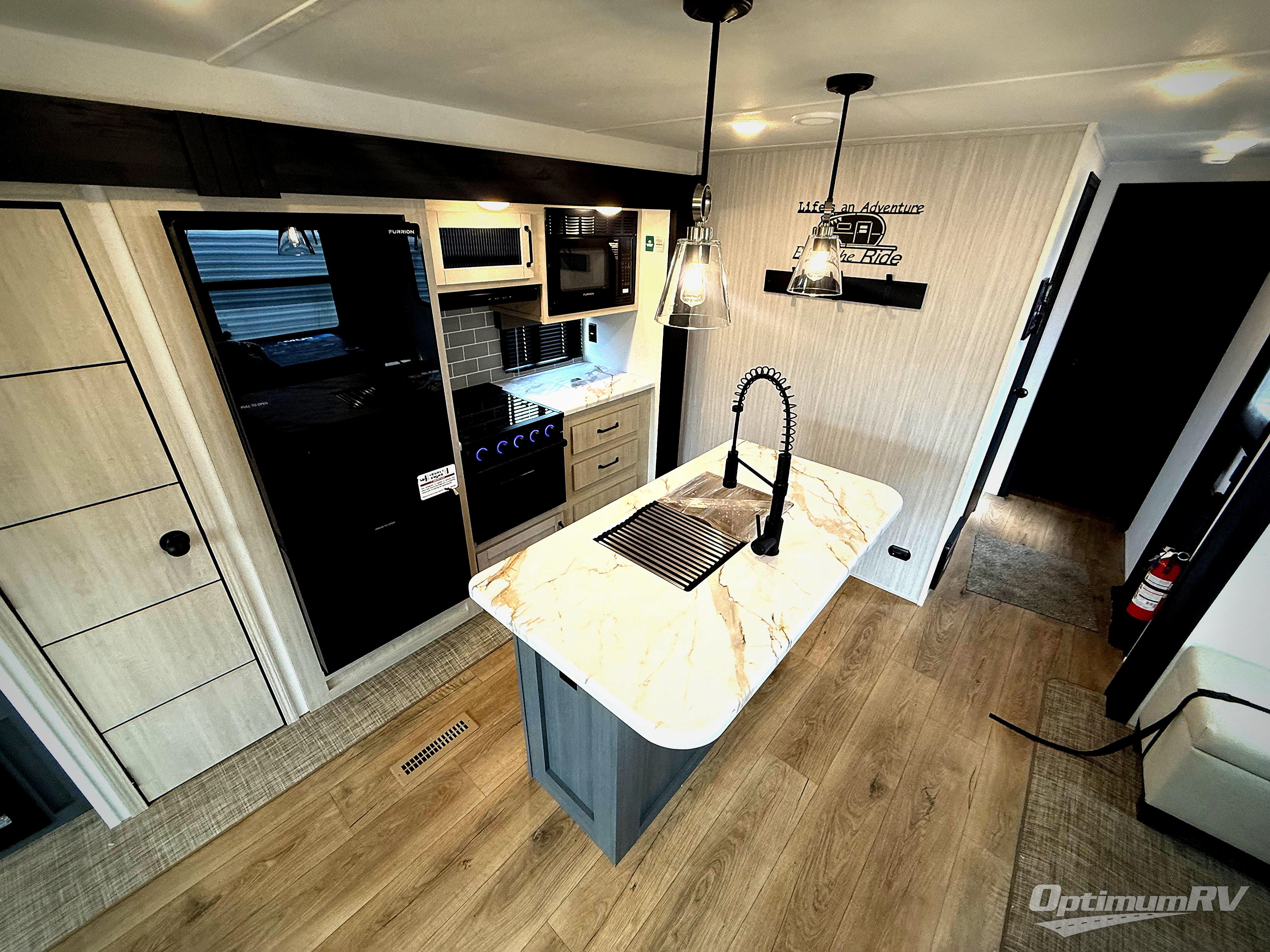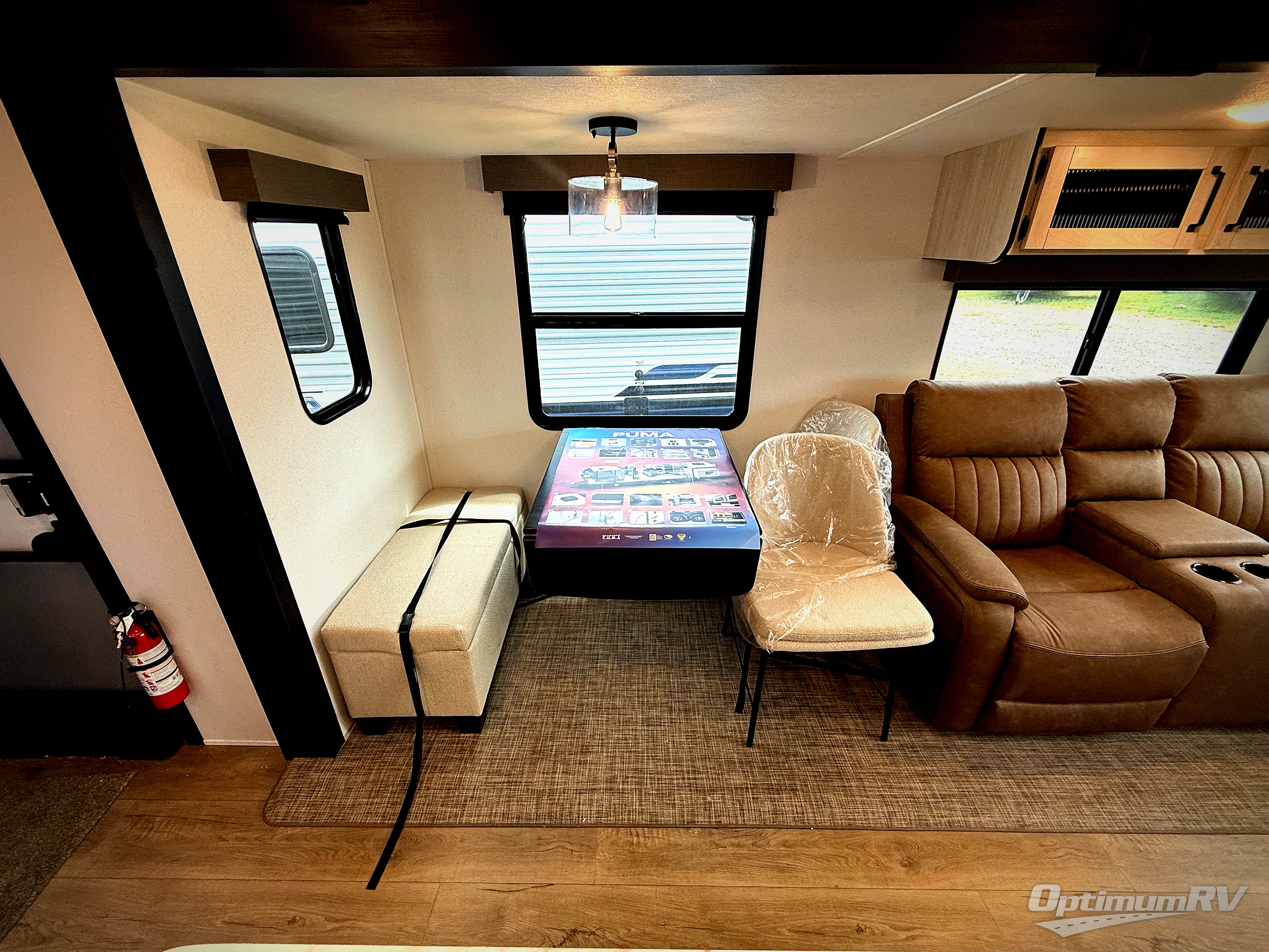 You're going to feel right at home in this travel trailer! The front private bedroom has a queen bed slide for a good night's rest, a dresser and front closet for your clothes, and another closet with washer and dryer prep. Freshen up each morning in the full bathroom with the 32" x 40" shower with a seat and then head to the kitchen to fry up some eggs on the stainless steel oven and range. You will also appreciate having a kitchen island for easier meal prep and a walk-in pantry to easily see your canned goods and snacks. The booth dinette offers a comfortable place to dine, play, and even sleep once converted. What better way to wind down your nights than to relax on either the rear sofa or in one of the two recliners across from the entertainment center with a fireplace!