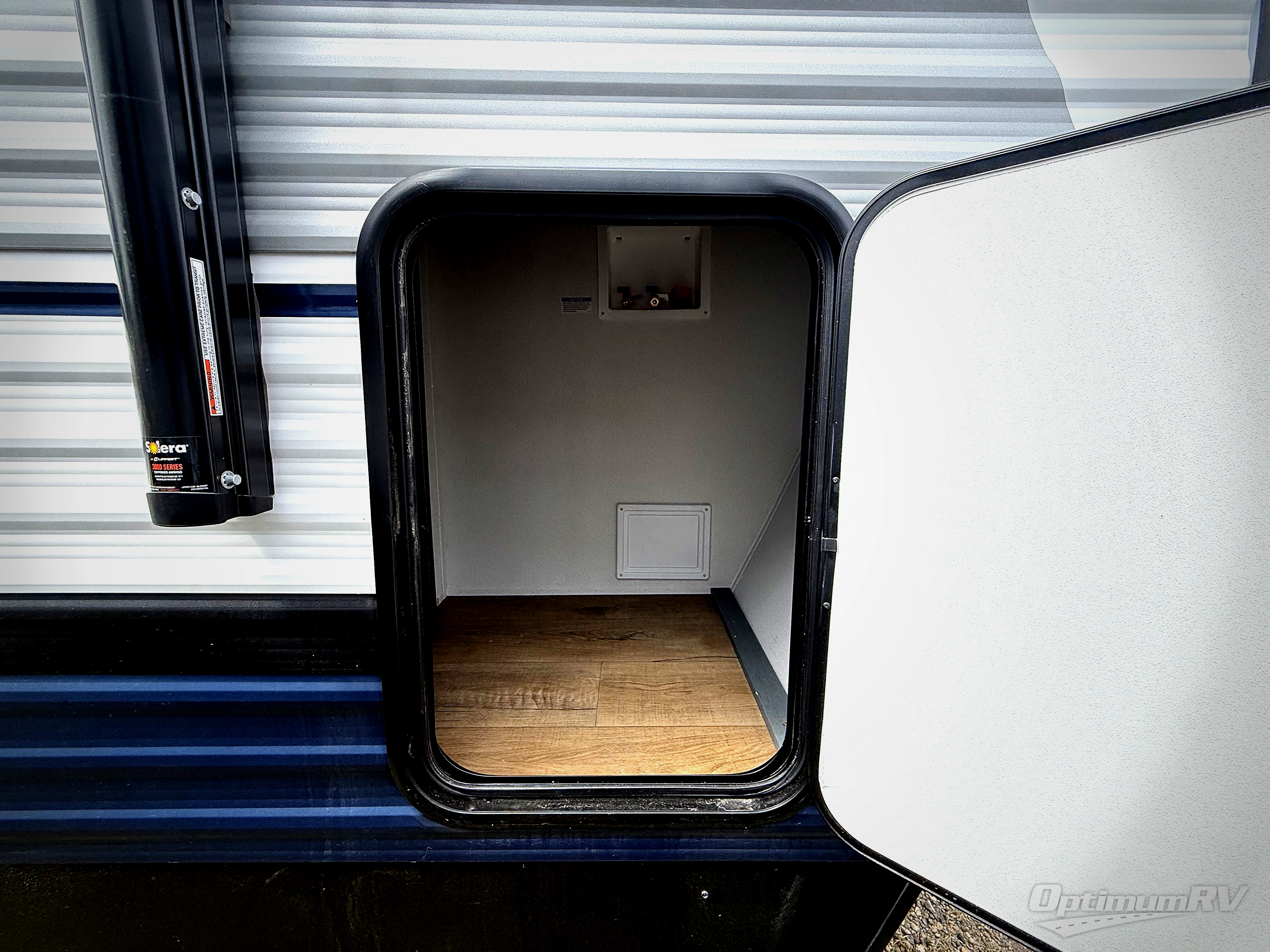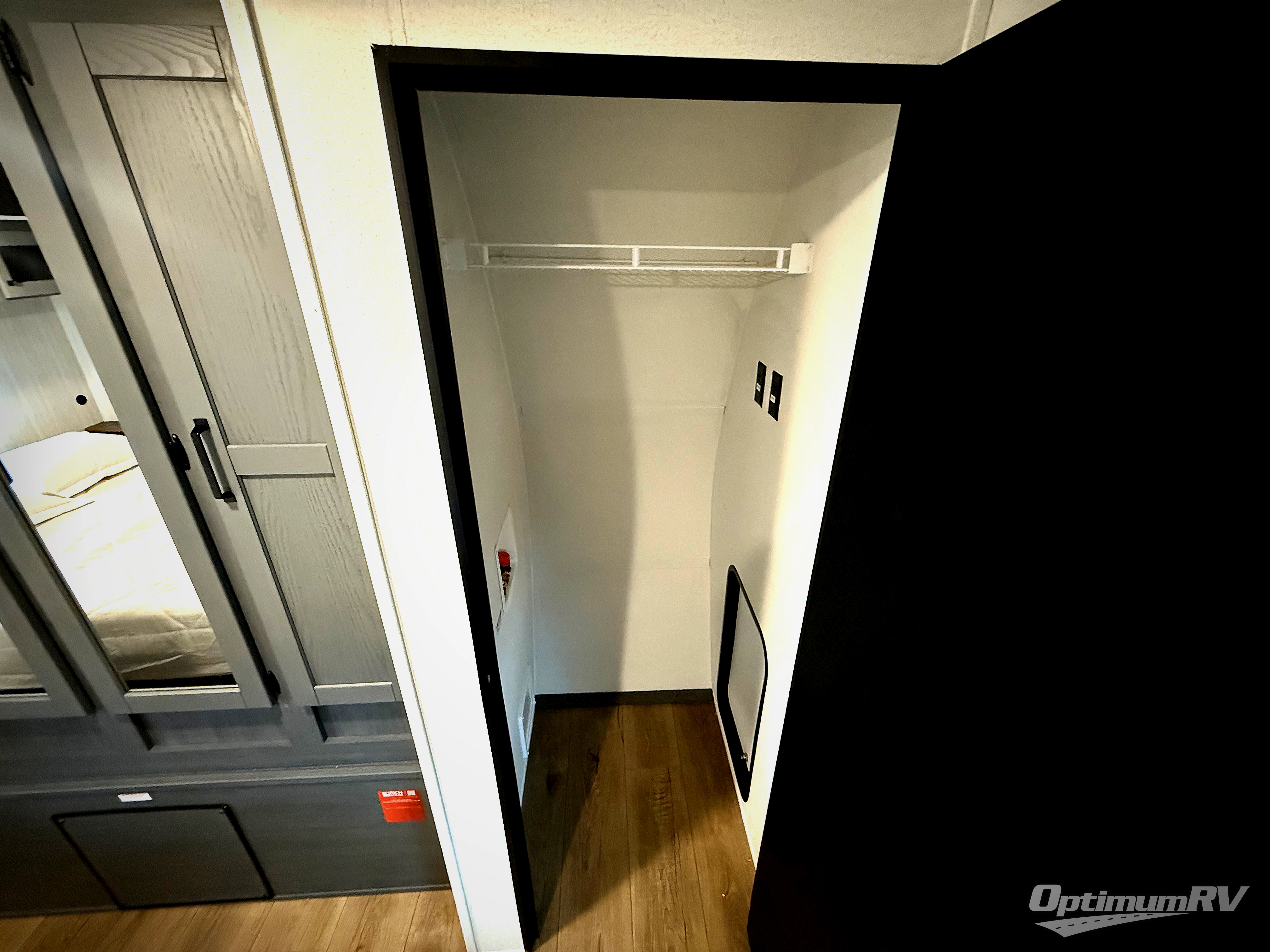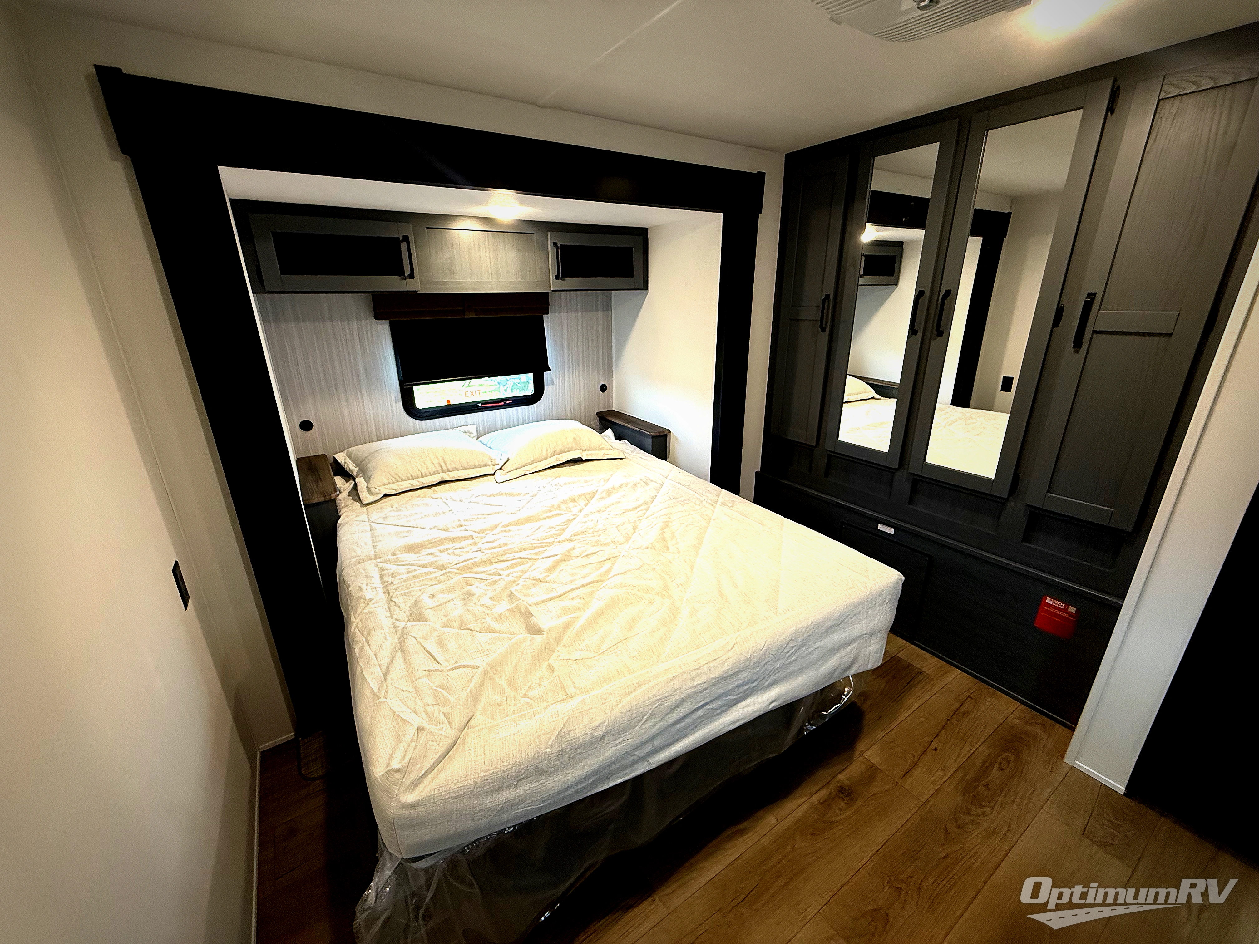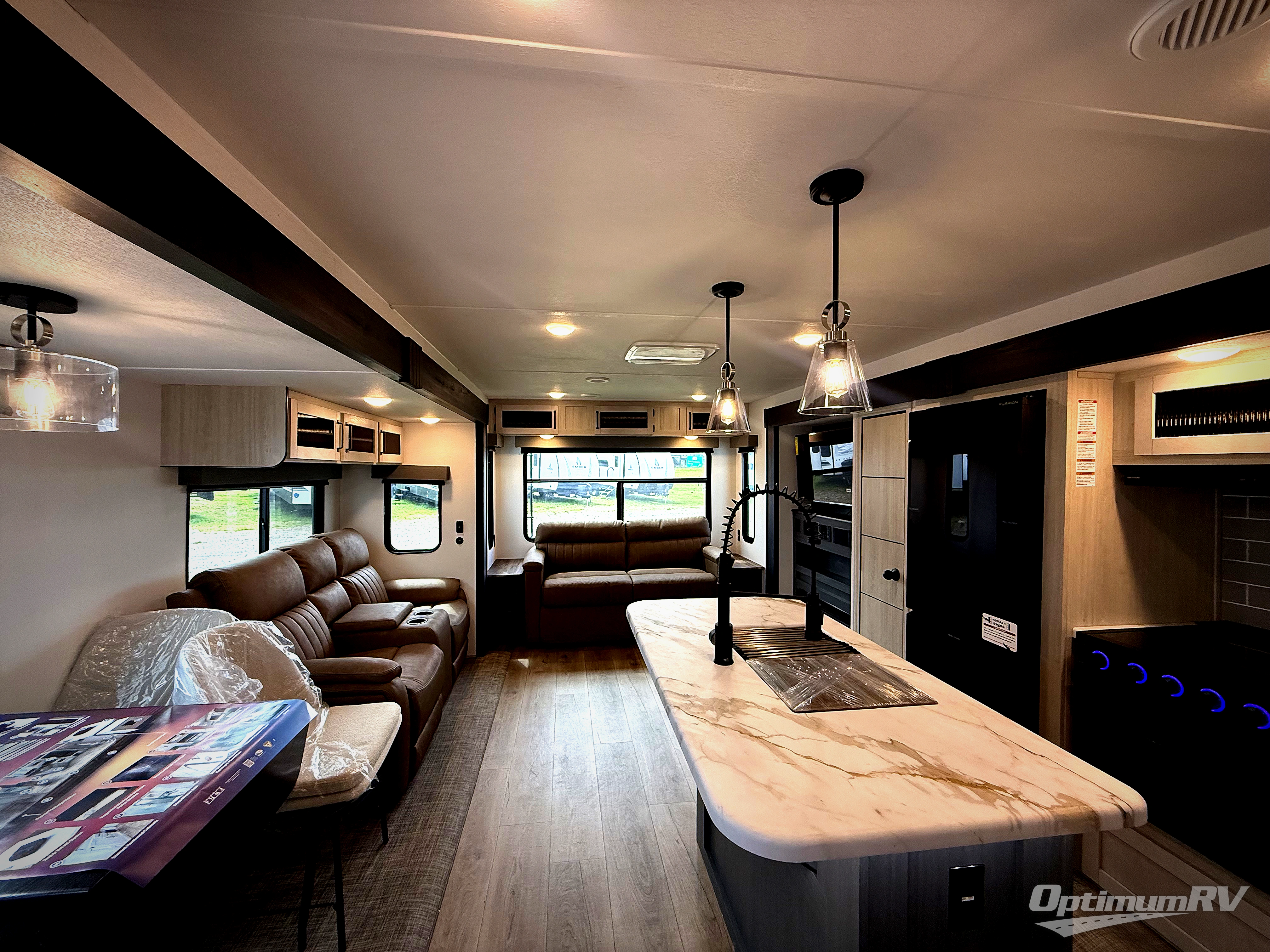 You're going to feel right at home in this travel trailer! The front private bedroom has a queen bed slide for a good night's rest, a dresser and front closet for your clothes, and another closet with washer and dryer prep. Freshen up each morning in the full bathroom with the 32" x 40" shower with a seat and then head to the kitchen to fry up some eggs on the stainless steel oven and range. You will also appreciate having a kitchen island for easier meal prep and a walk-in pantry to easily see your canned goods and snacks. The booth dinette offers a comfortable place to dine, play, and even sleep once converted. What better way to wind down your nights than to relax on either the rear sofa or in one of the two recliners across from the entertainment center with a fireplace!