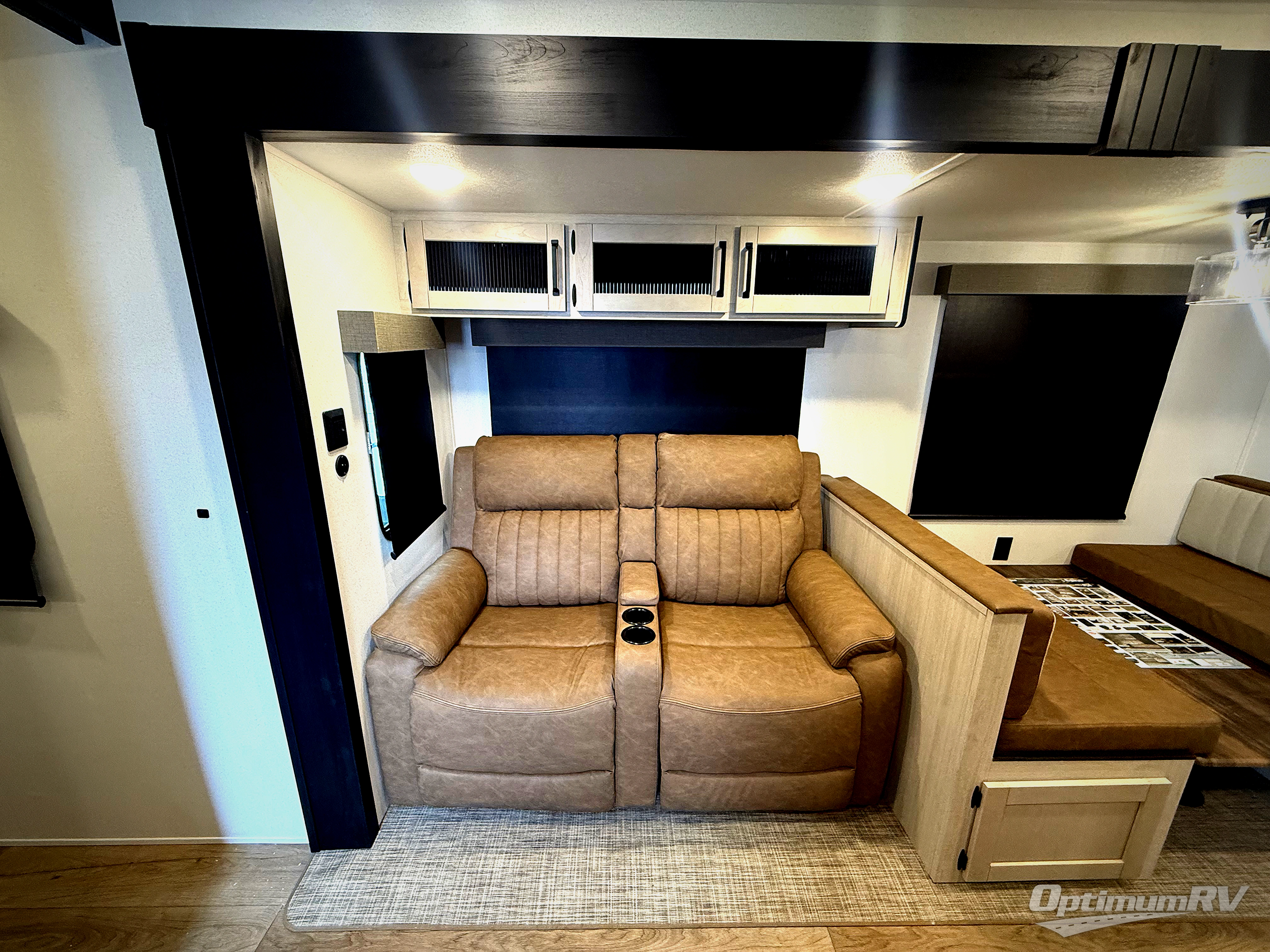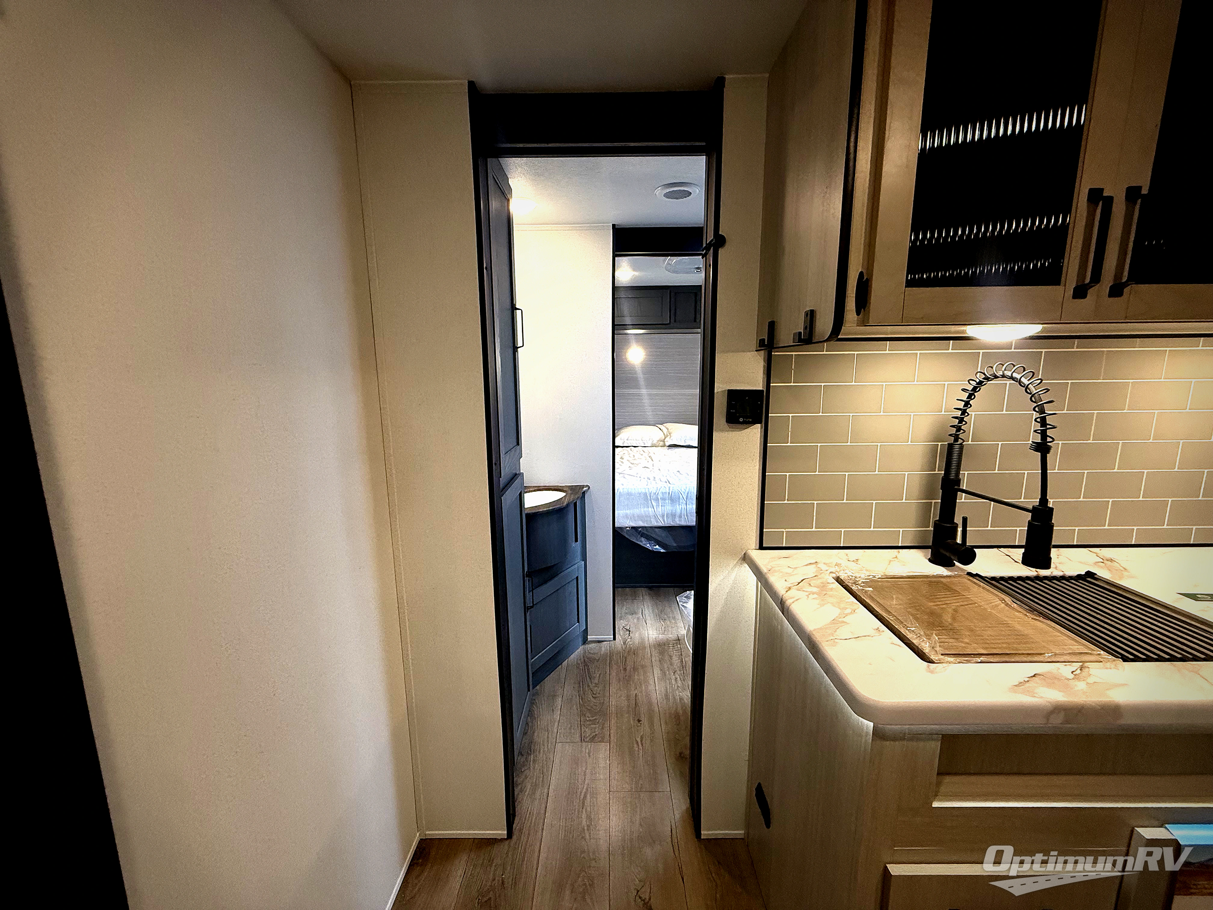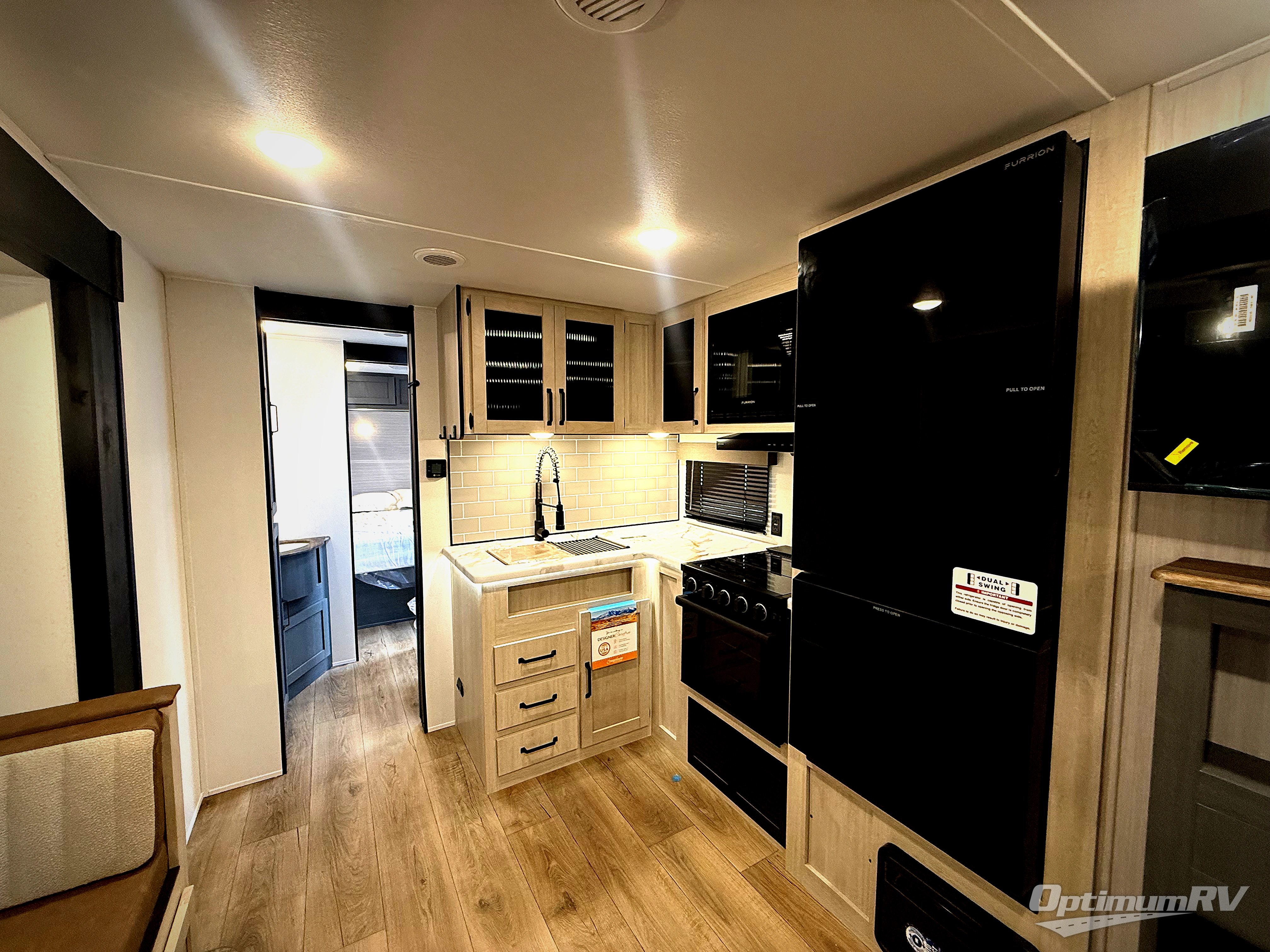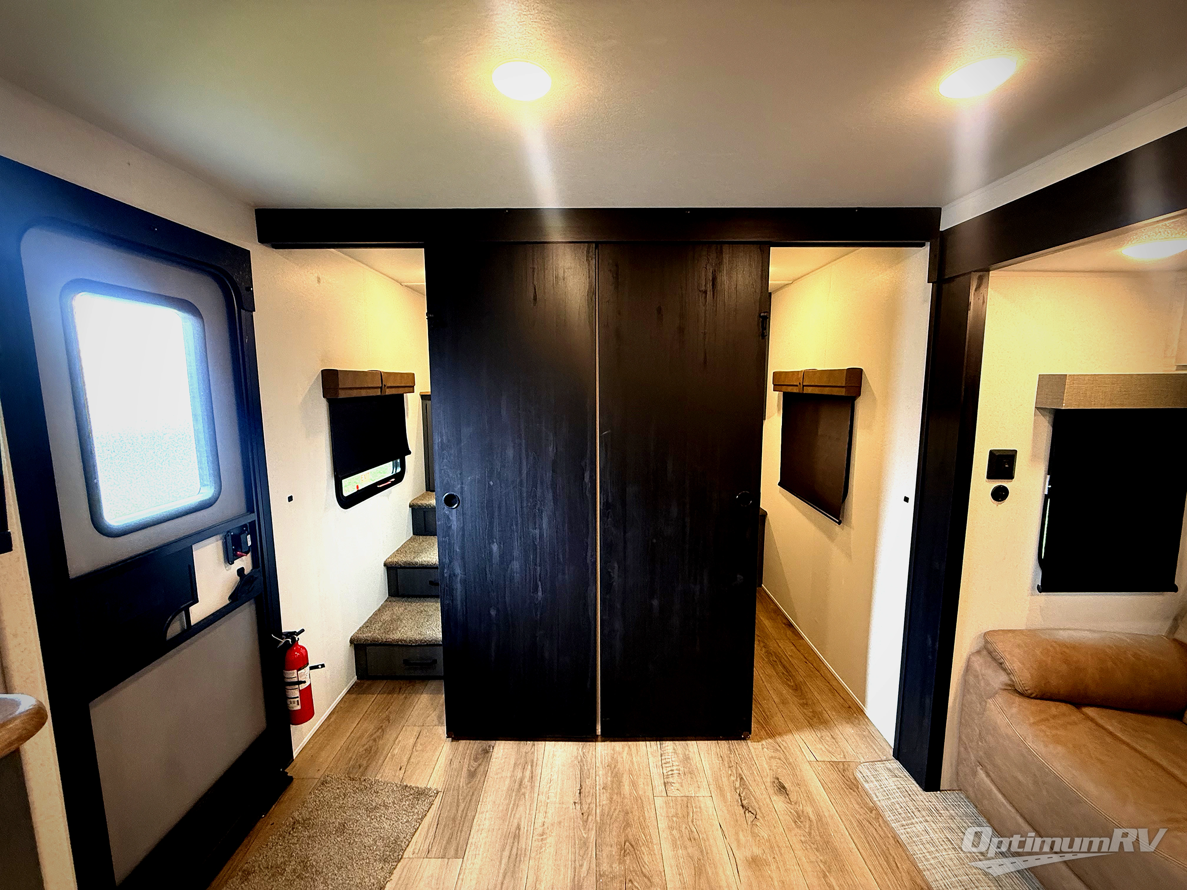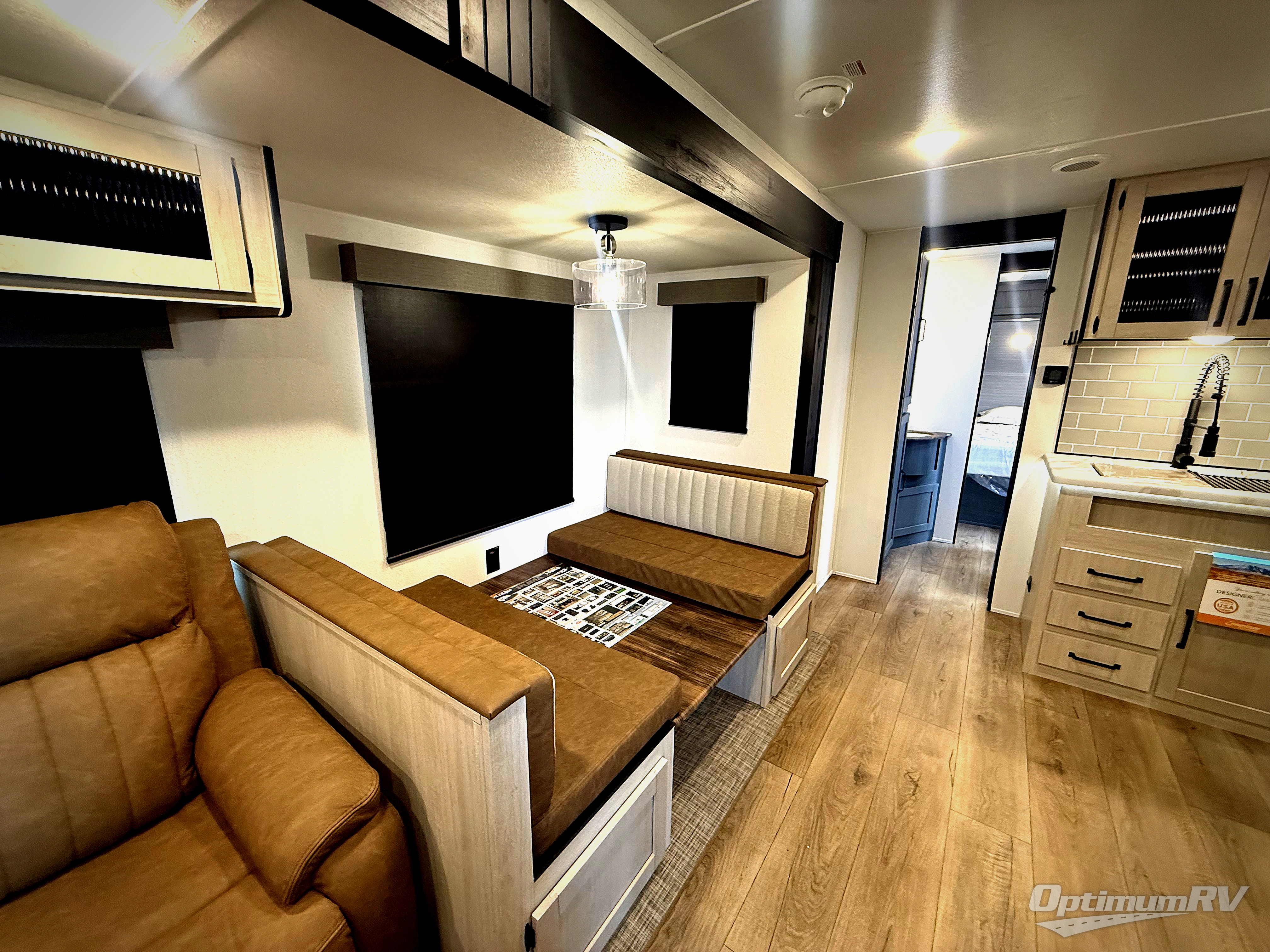 This travel trailer is perfect for camping with a larger group of friends or if you have older kids since there are two private bunkrooms! Each room includes a bunk bed and storage space for clothes, shoes, and more. You'll enjoy your own space up front in the master bedroom that includes a queen bed, dual shirt closets, and one of the dual entry doors to the unit for added convenience. Everyone can come together in the combined living area and kitchen that includes a large slide out with a sofa and booth dinette, plus there is a fireplace to make this space feel more like home. A full kitchen inside lets you create home-cooked meals each day, and you can choose to add the optional micro kitchen with a griddle for a pancake breakfast outdoors!