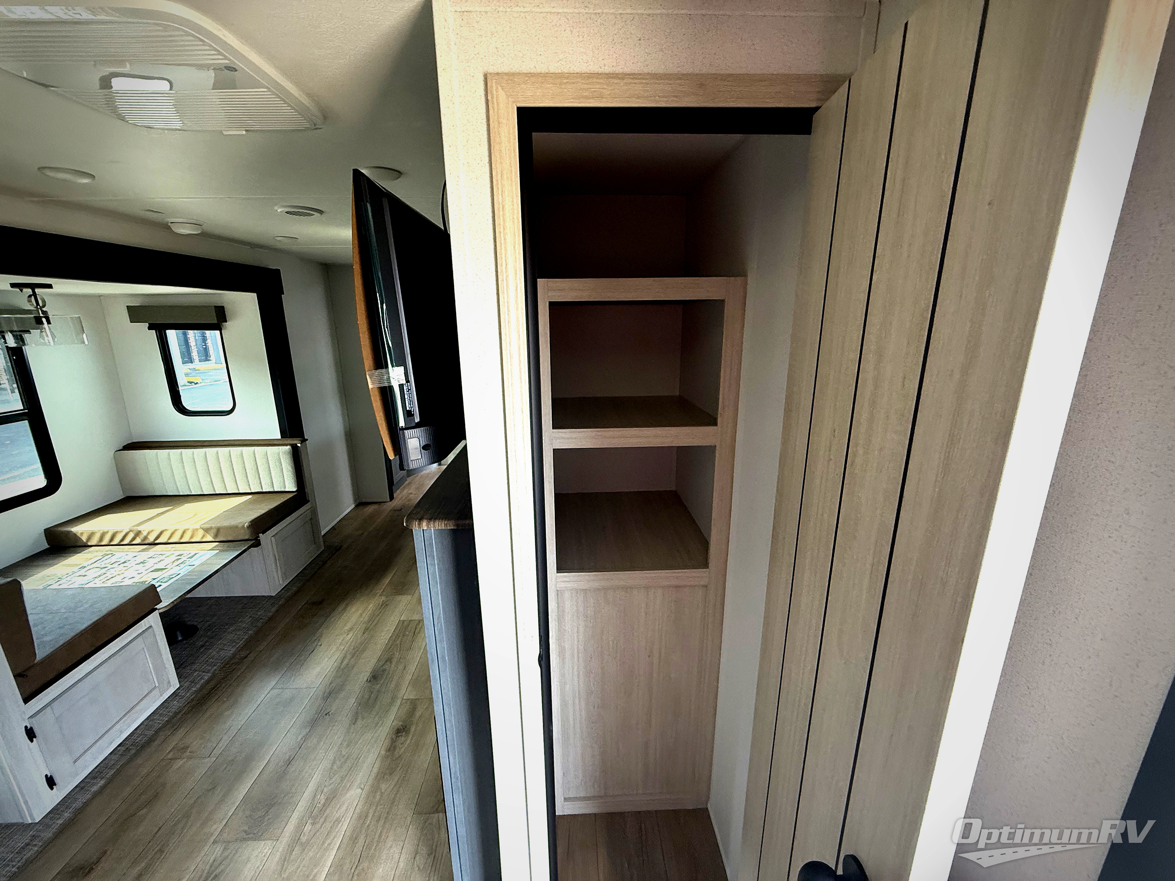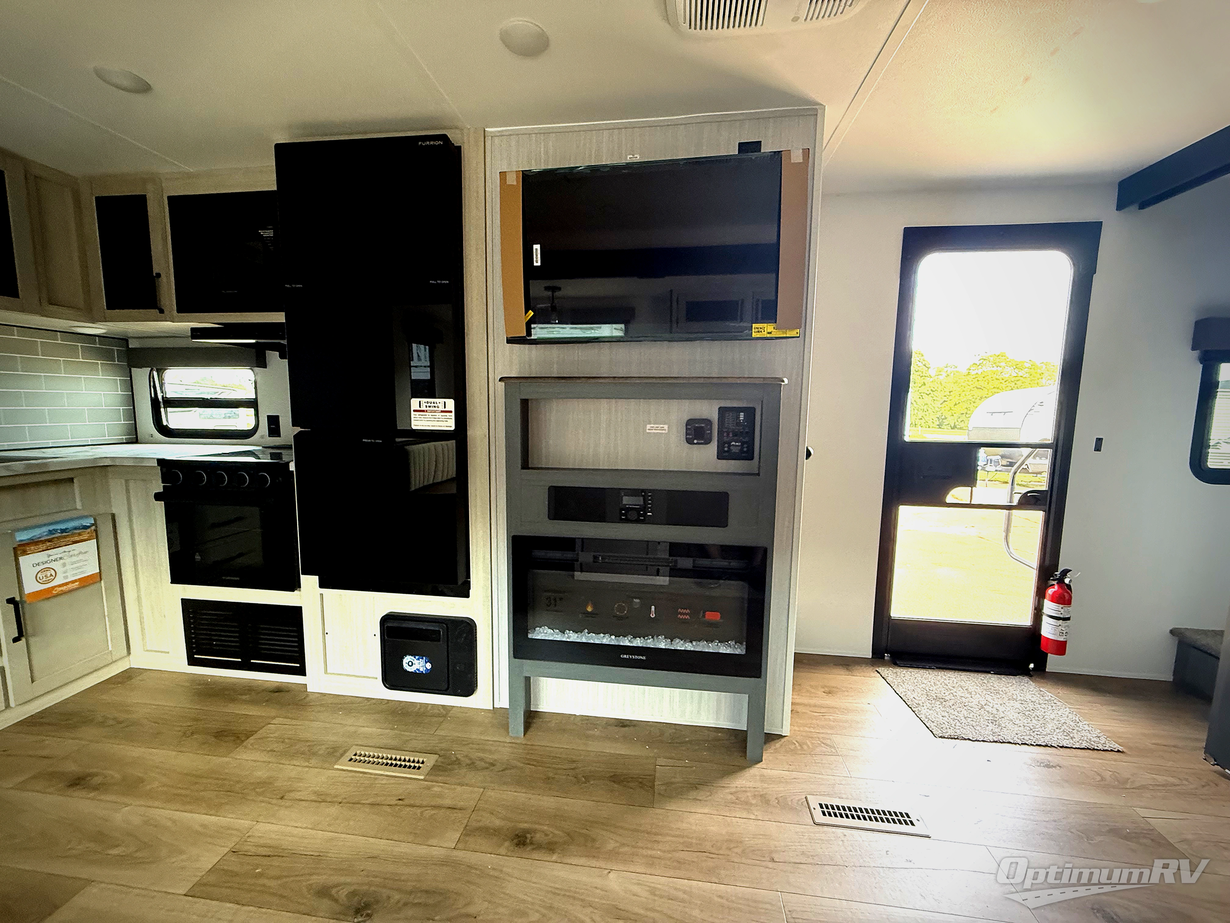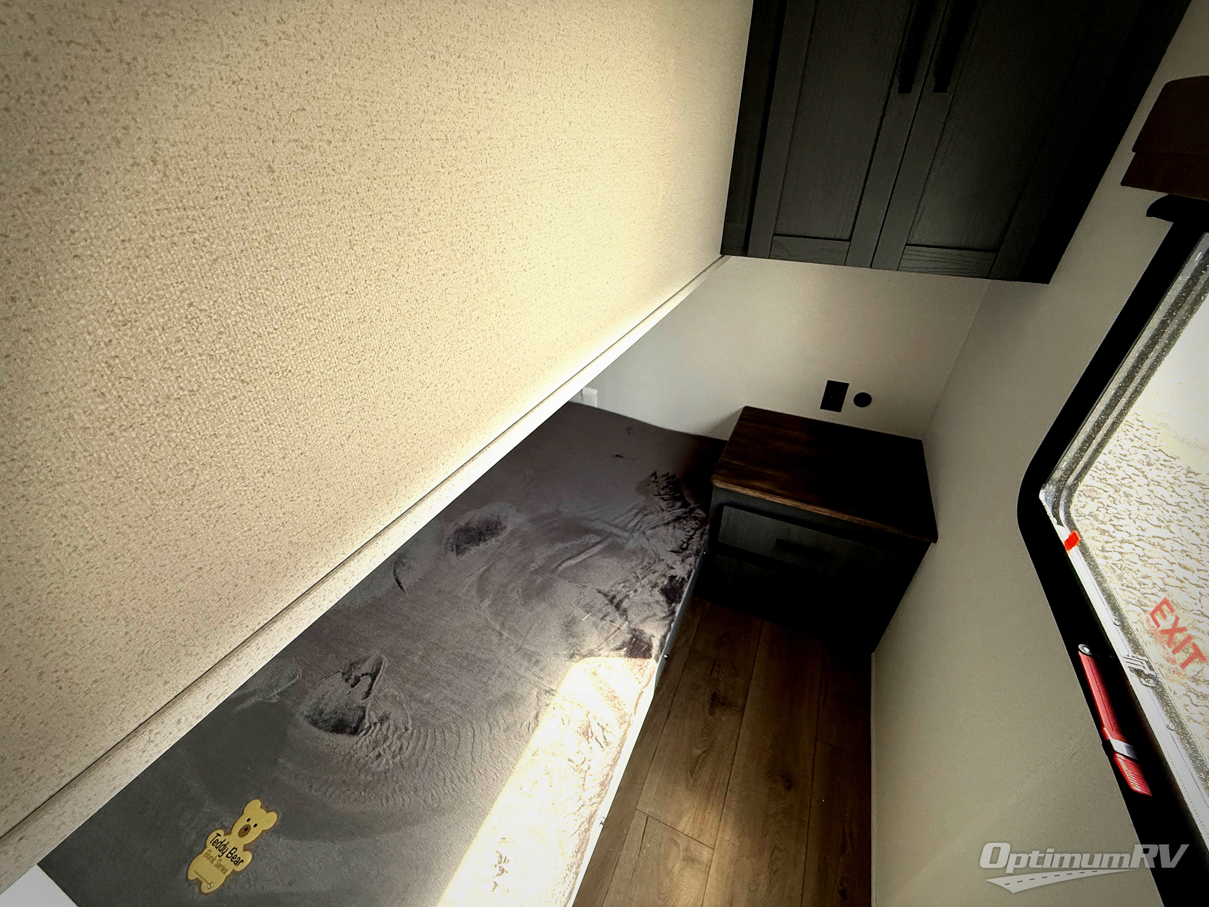 This travel trailer is perfect for camping with a larger group of friends or if you have older kids since there are two private bunkrooms! Each room includes a bunk bed and storage space for clothes, shoes, and more. You'll enjoy your own space up front in the master bedroom that includes a queen bed, dual shirt closets, and one of the dual entry doors to the unit for added convenience. Everyone can come together in the combined living area and kitchen that includes a large slide out with a sofa and booth dinette, plus there is a fireplace to make this space feel more like home. A full kitchen inside lets you create home-cooked meals each day, and you can choose to add the optional micro kitchen with a griddle for a pancake breakfast outdoors!