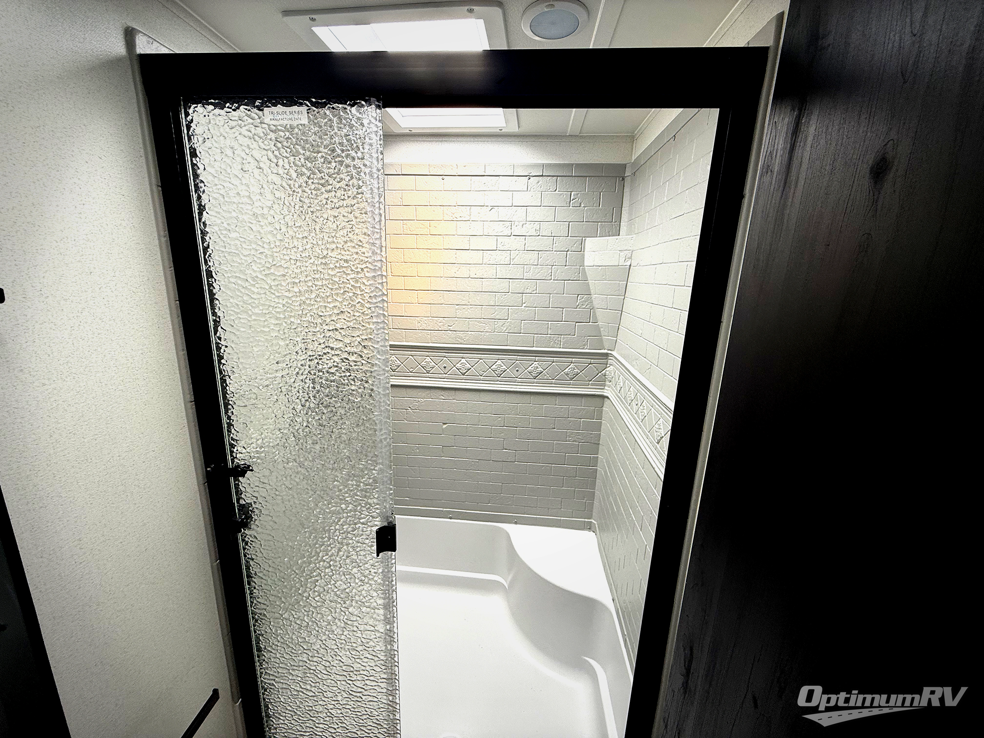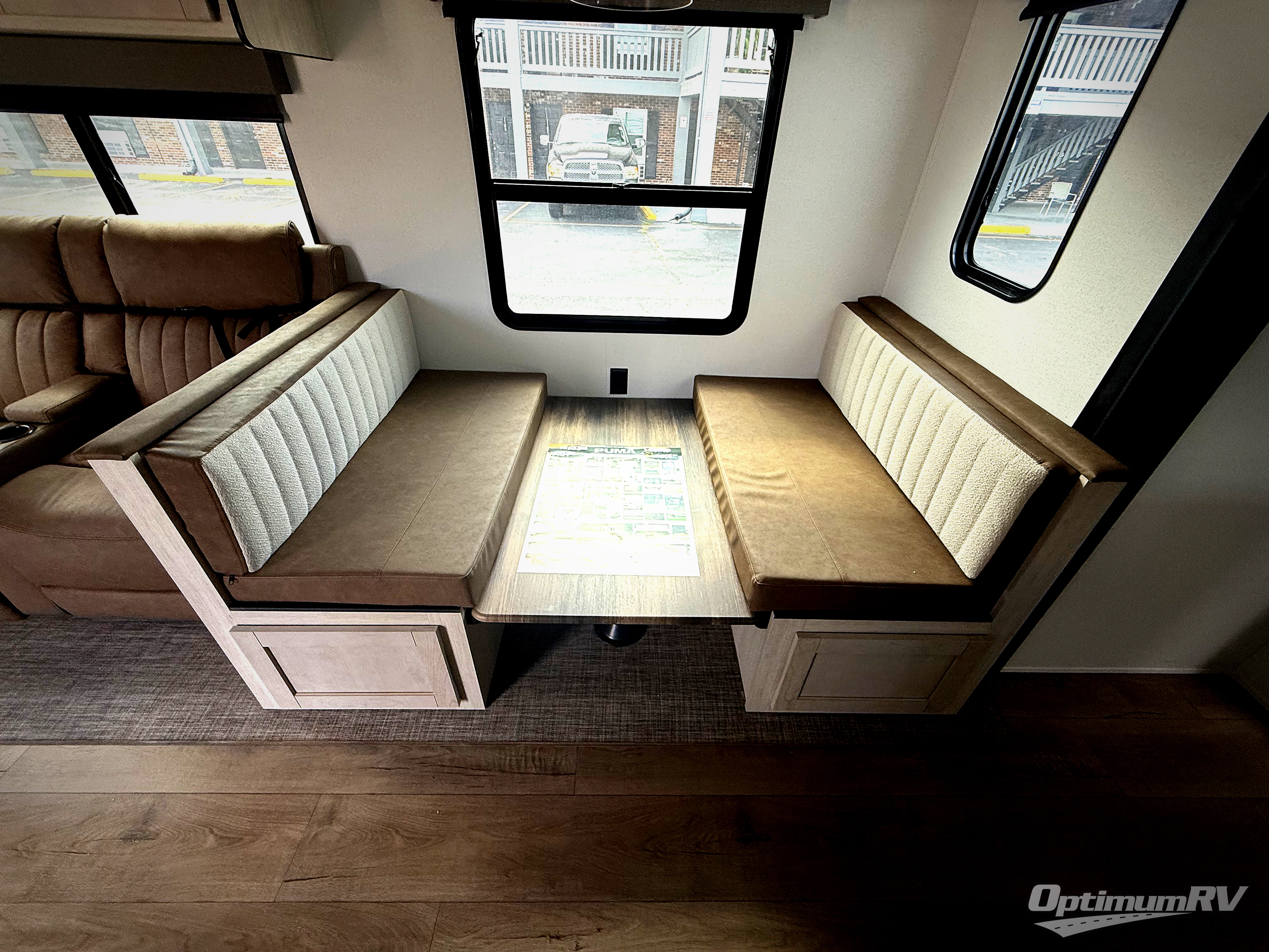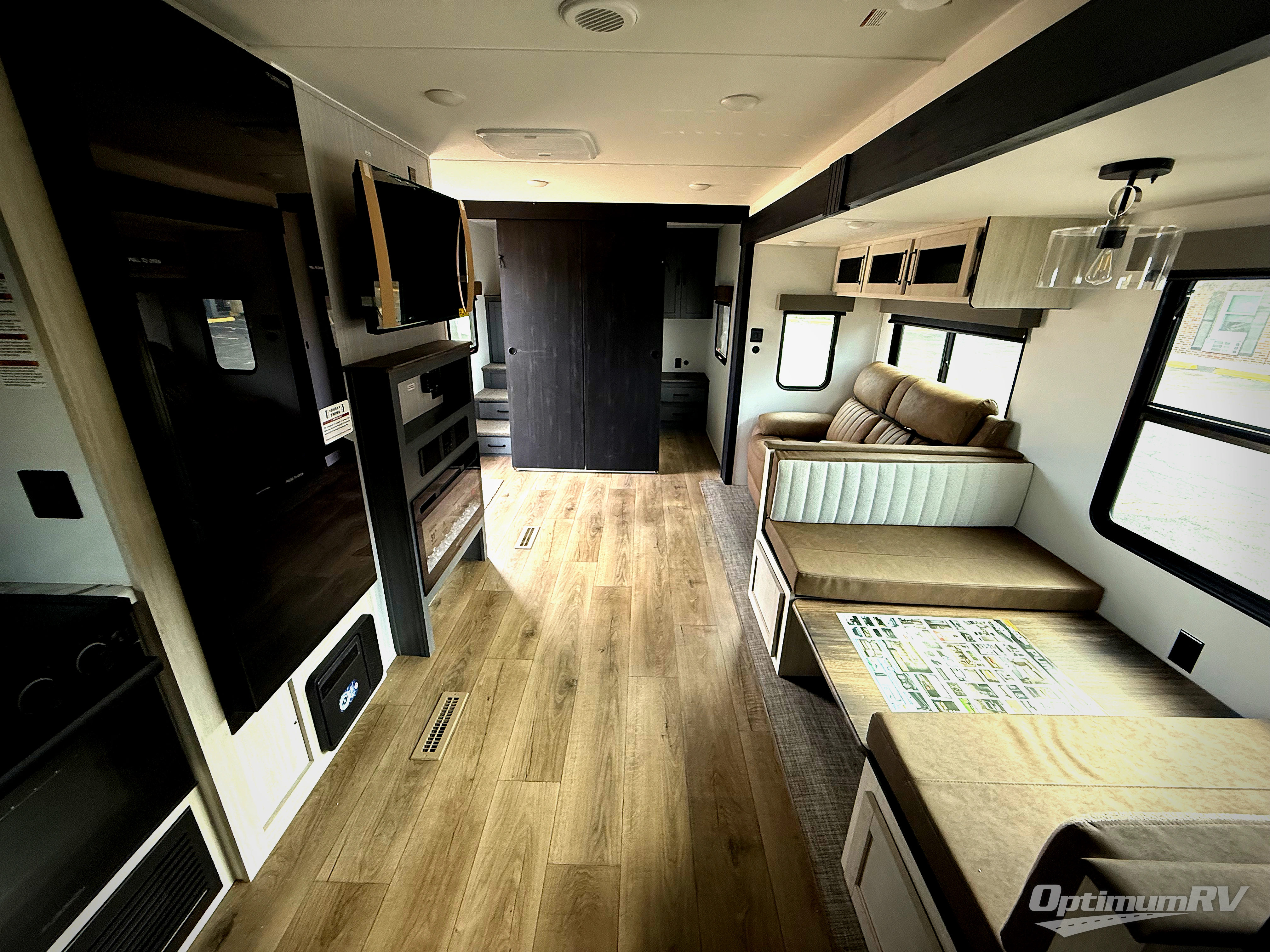 This travel trailer is perfect for camping with a larger group of friends or if you have older kids since there are two private bunkrooms! Each room includes a bunk bed and storage space for clothes, shoes, and more. You'll enjoy your own space up front in the master bedroom that includes a queen bed, dual shirt closets, and one of the dual entry doors to the unit for added convenience. Everyone can come together in the combined living area and kitchen that includes a large slide out with a sofa and booth dinette, plus there is a fireplace to make this space feel more like home. A full kitchen inside lets you create home-cooked meals each day, and you can choose to add the optional micro kitchen with a griddle for a pancake breakfast outdoors!