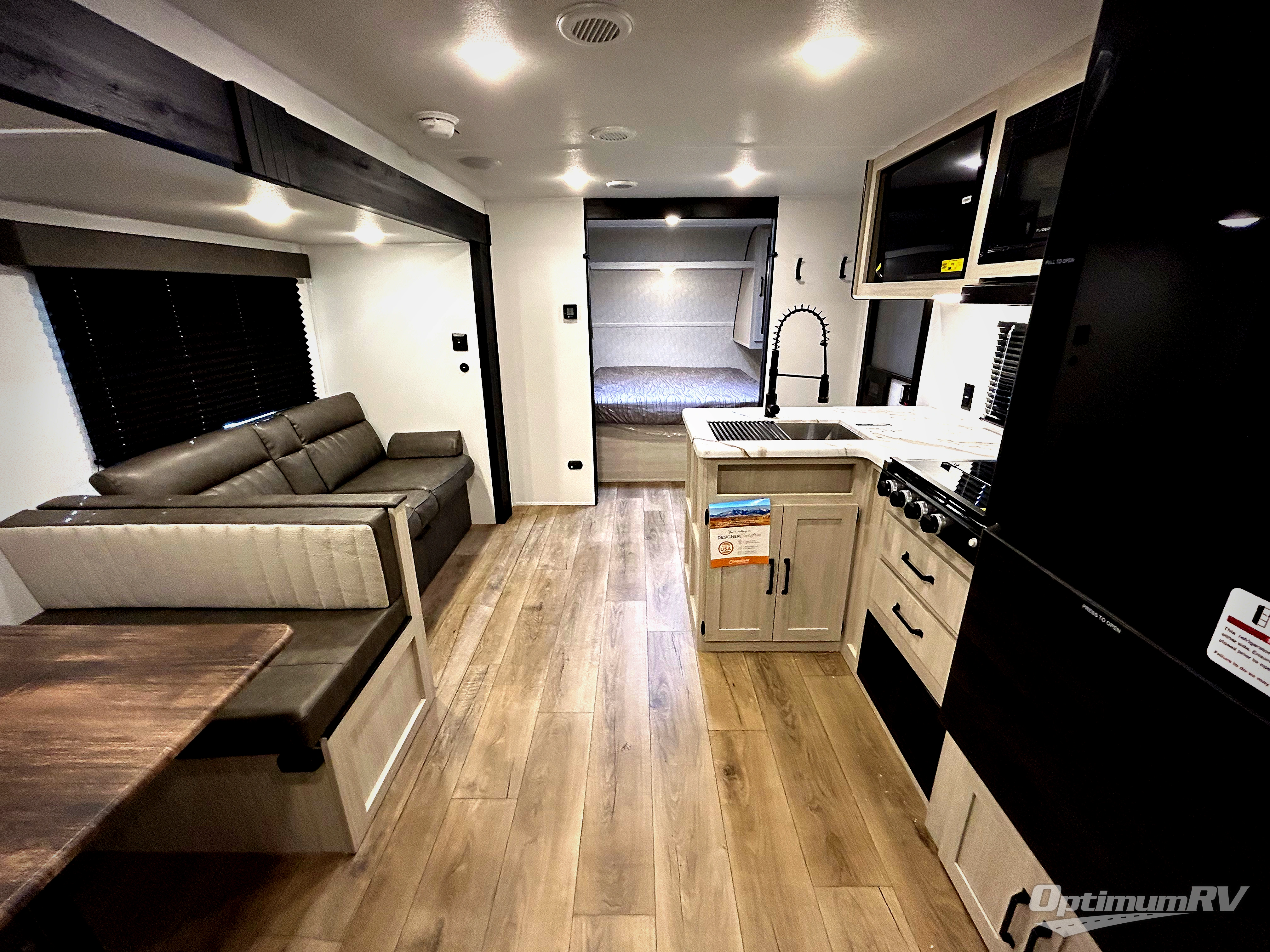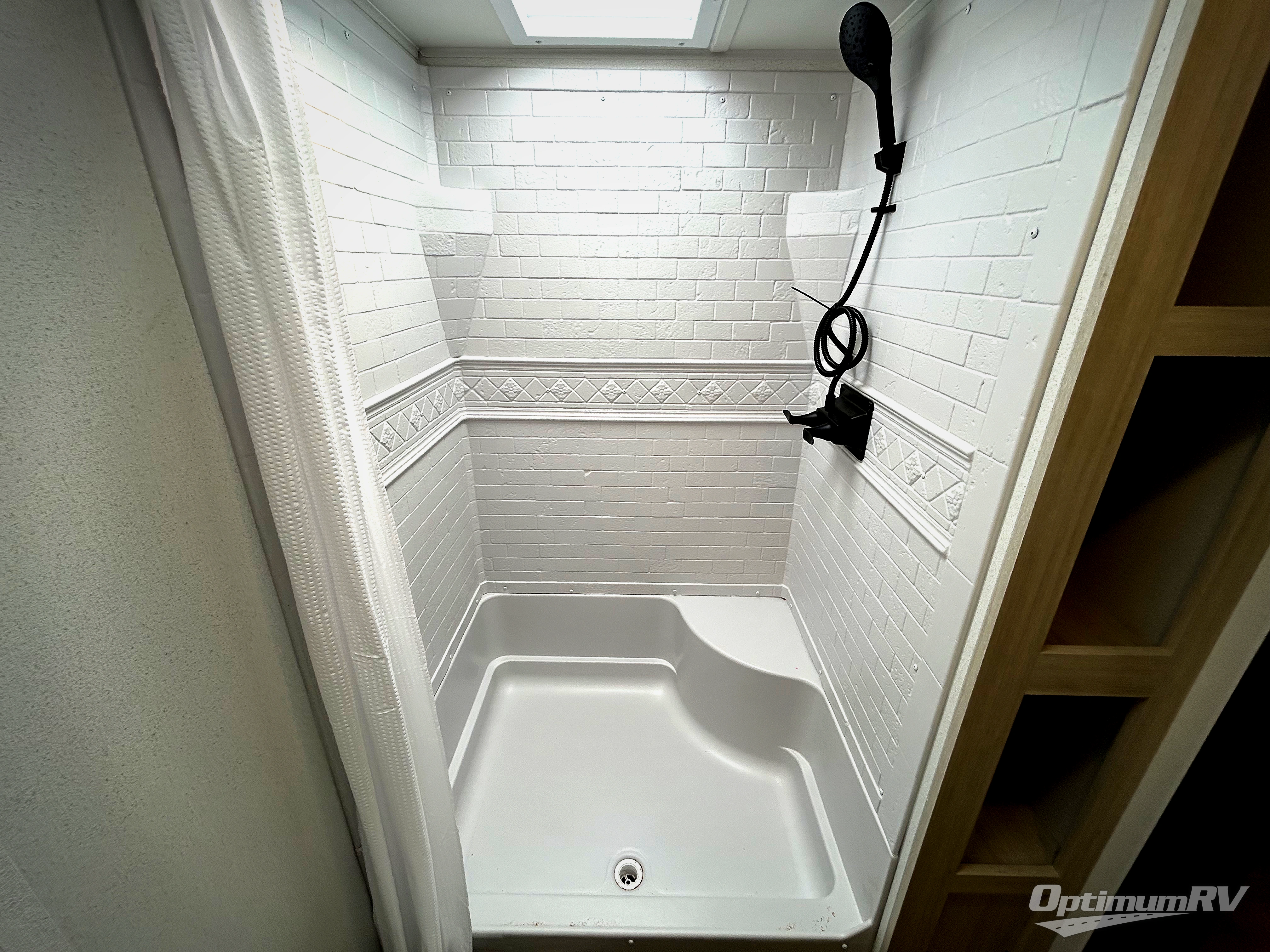 Wherever you decide to camp, you can be sure to have a great time in this rear bath travel trailer! The combined kitchen and living area is made spacious thanks to the large slide out. Here, you can relax on the sofa and dine at the booth dinette, and an optional TV can be added if you want the option for movie night. The full kitchen will allow you to make meals each day, and you can choose to add the optional outside mini kitchen with a griddle if you want to cook with fresh air. This unit also includes a front private bedroom, complete with an RV queen bed, an overhead shelf and dual shirt closets to keep clothes wrinkle-free.