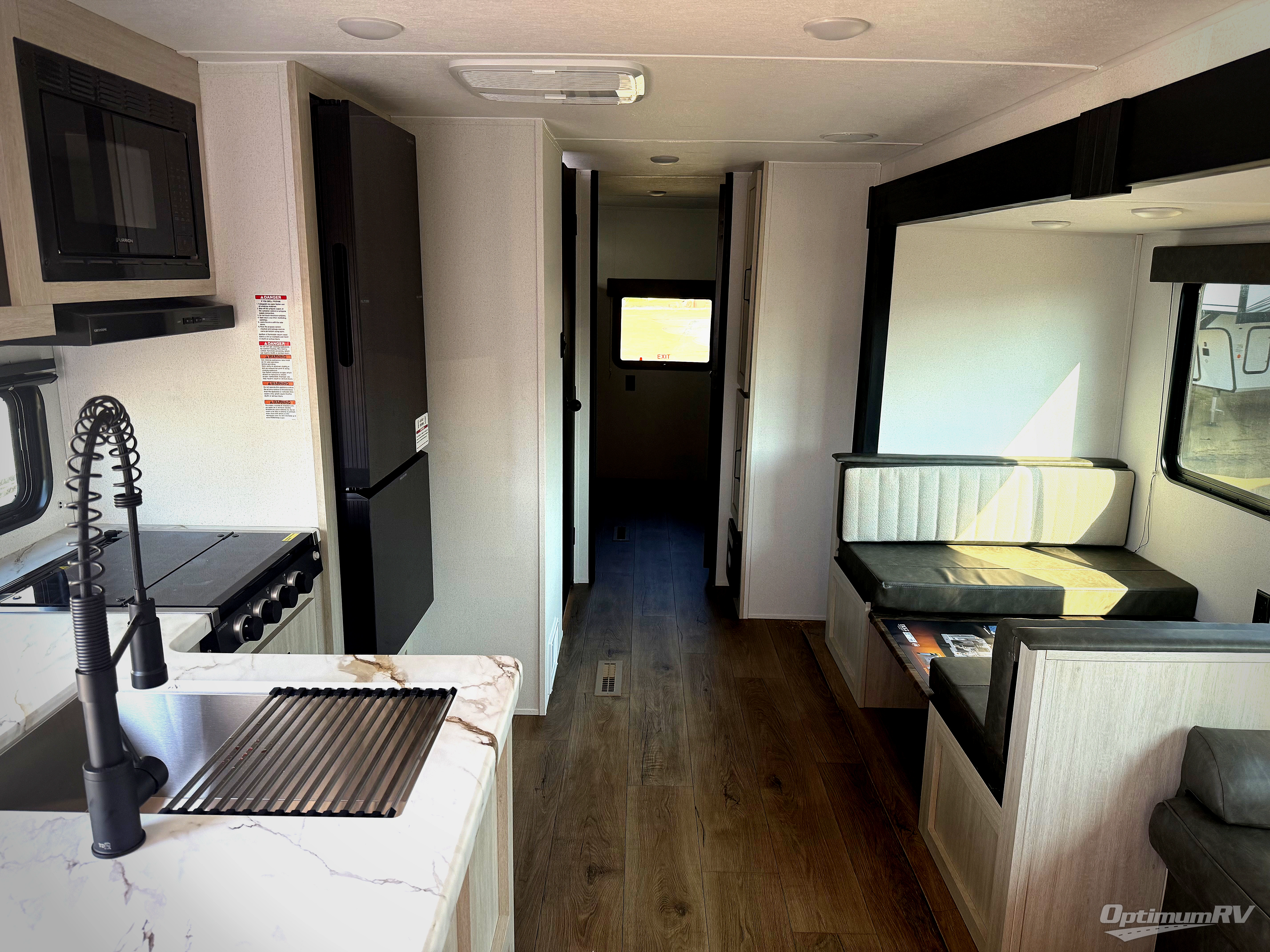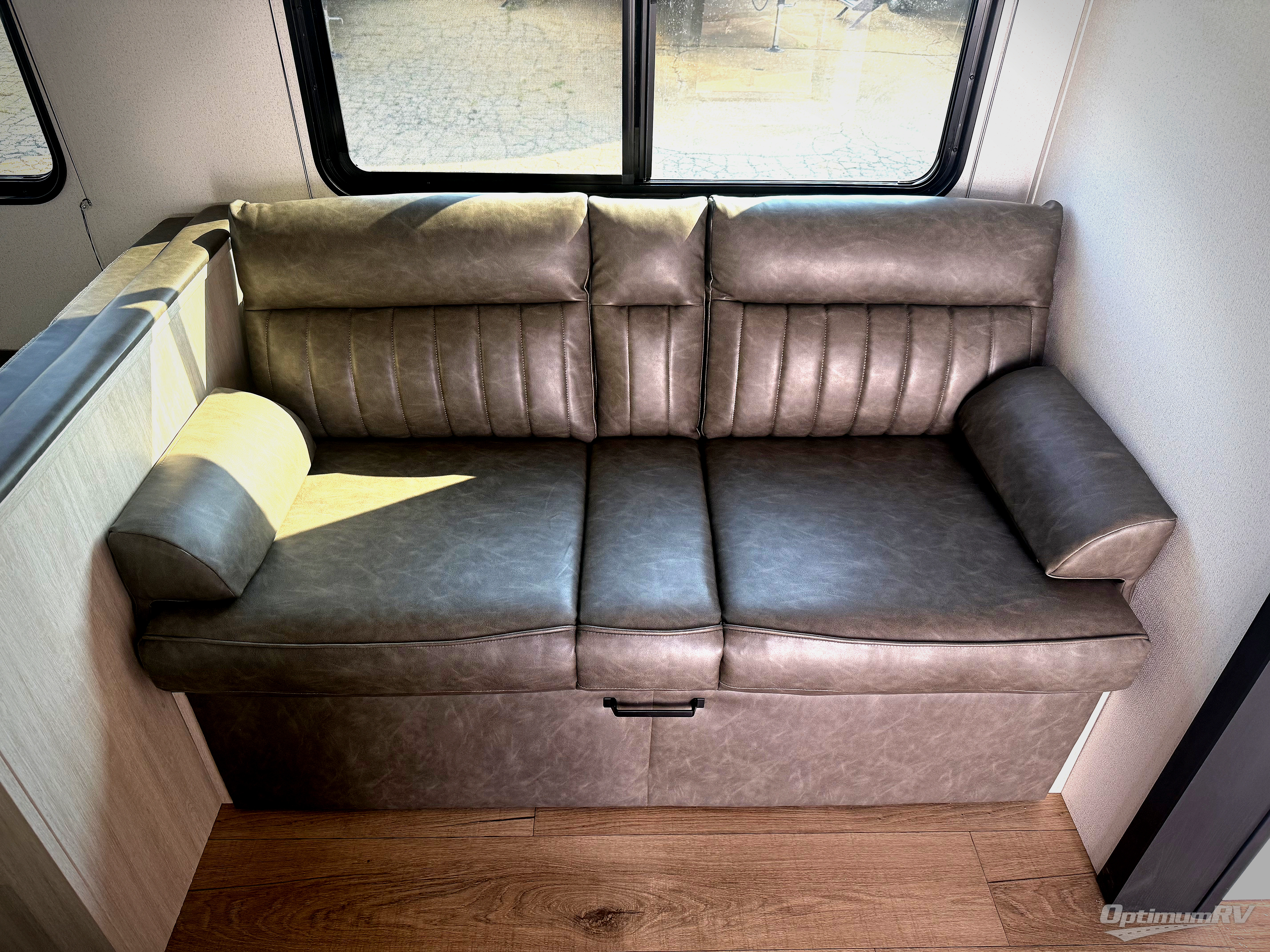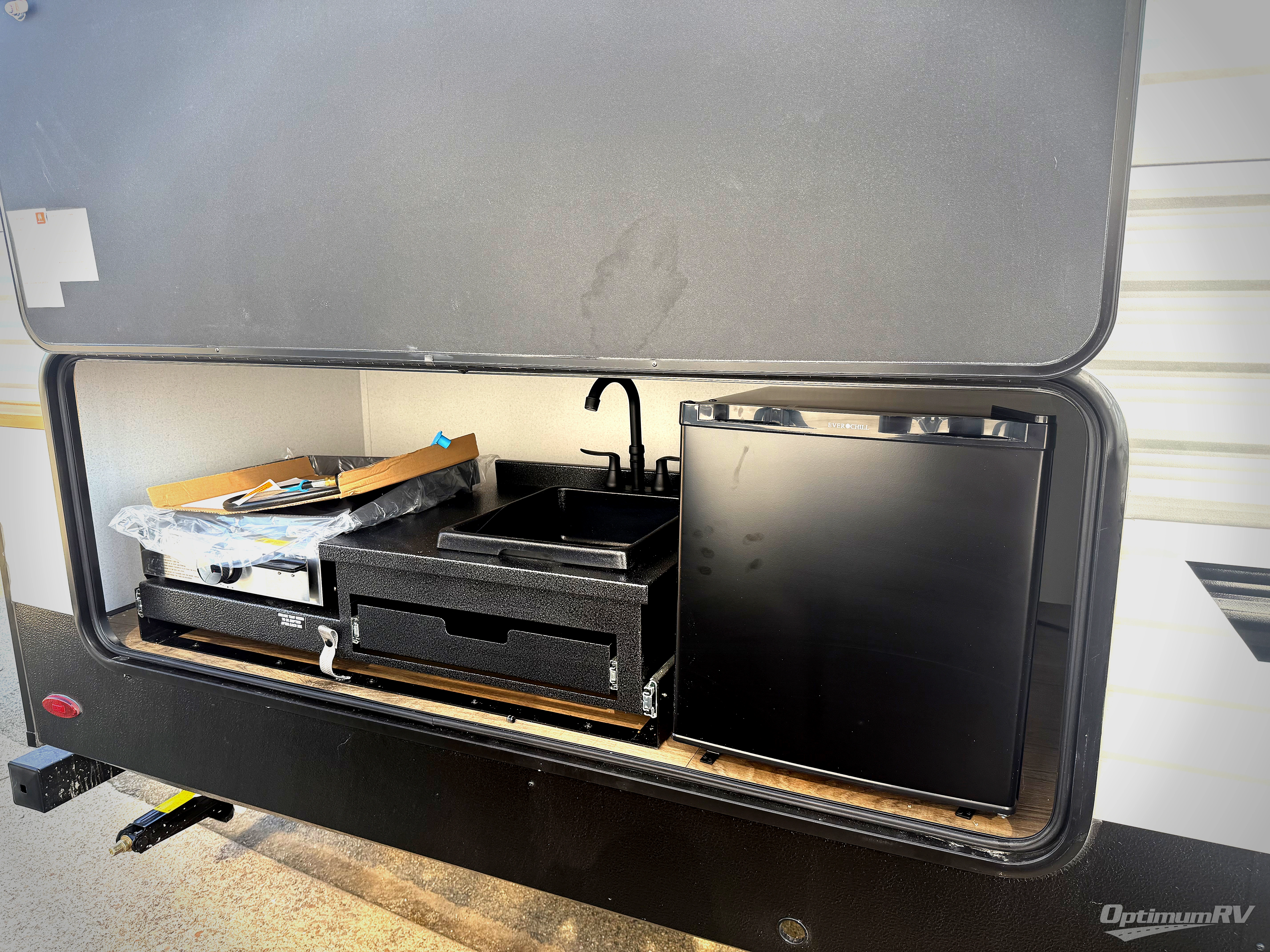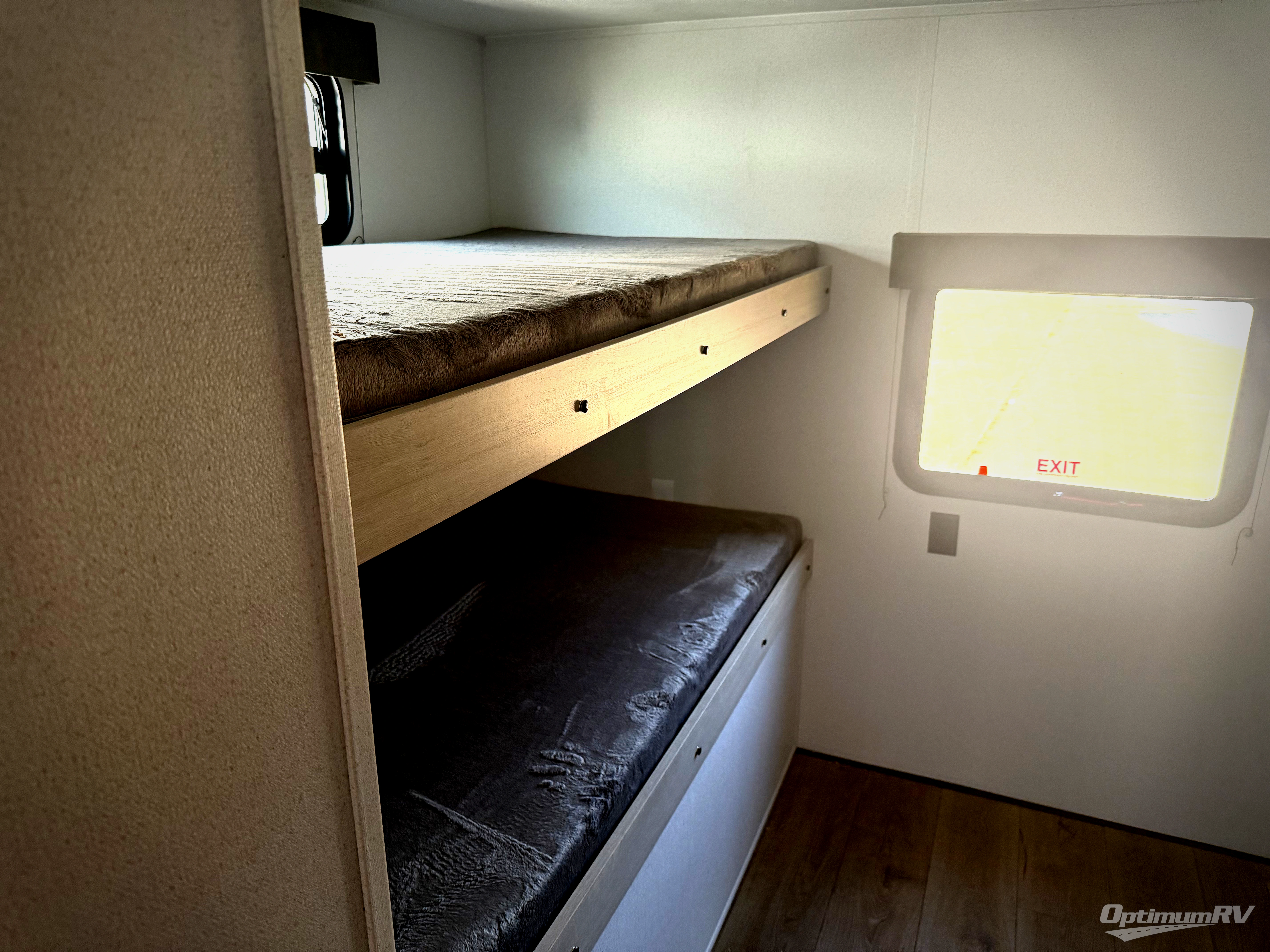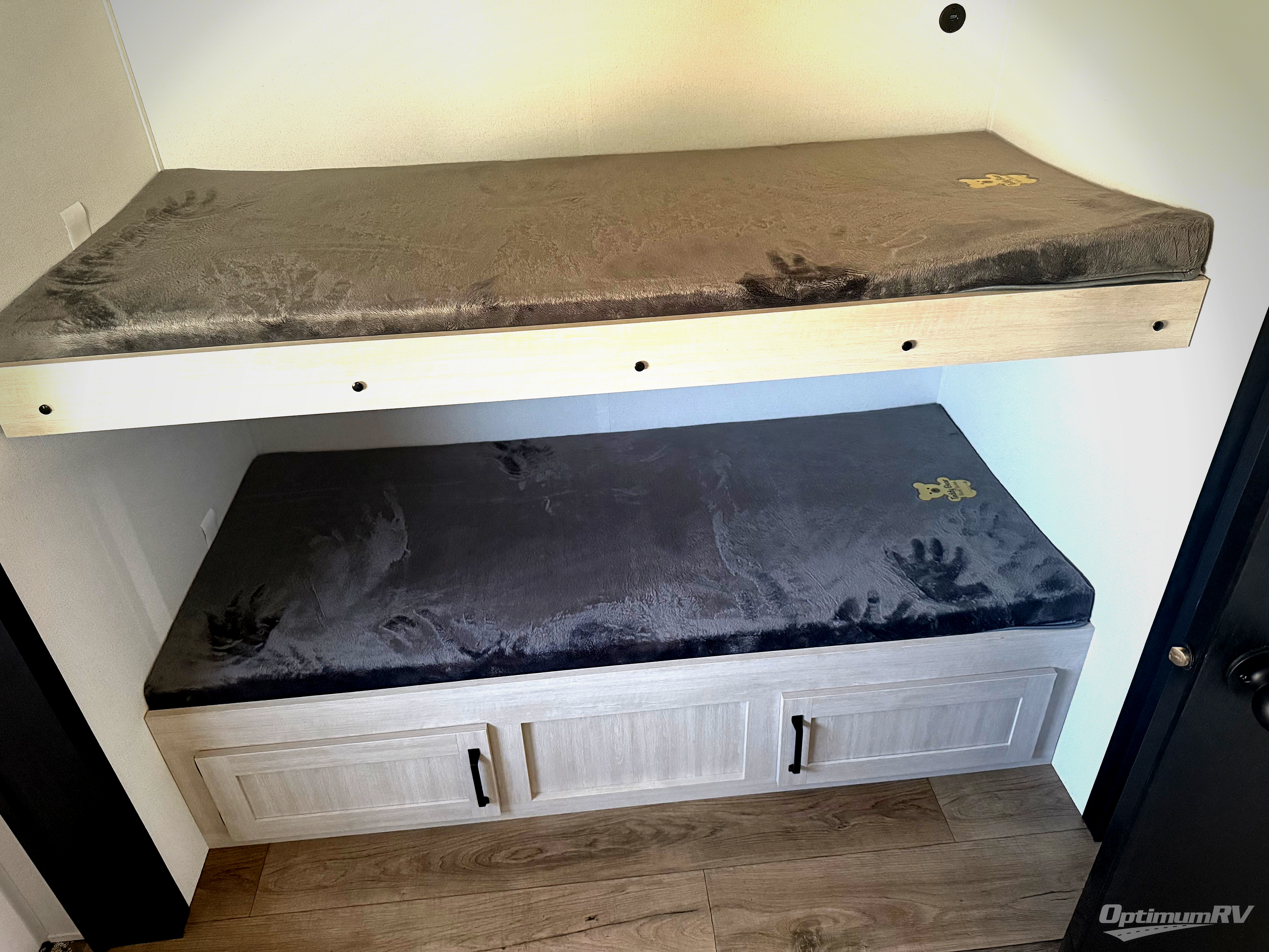 If you're looking for more space, this double axle, double slide out unit is perfect for your group of eight. Within the large slide in the living room, you'll find the booth dinette and sofa, which sit across from the optional TV if you want to enjoy movie nights. The full kitchen includes a stainless microwave and three burner cooktop to make meals, plus a pantry and 12V refrigerator for food storage. And an optional outside kitchen with a griddle can be added if you enjoy cooking outdoors! Your guests or littles are sure to enjoy the rear private bunkhouse that features a set of 38" x 76" bunks across from the third bunk and jiffy sofa within a slide out!