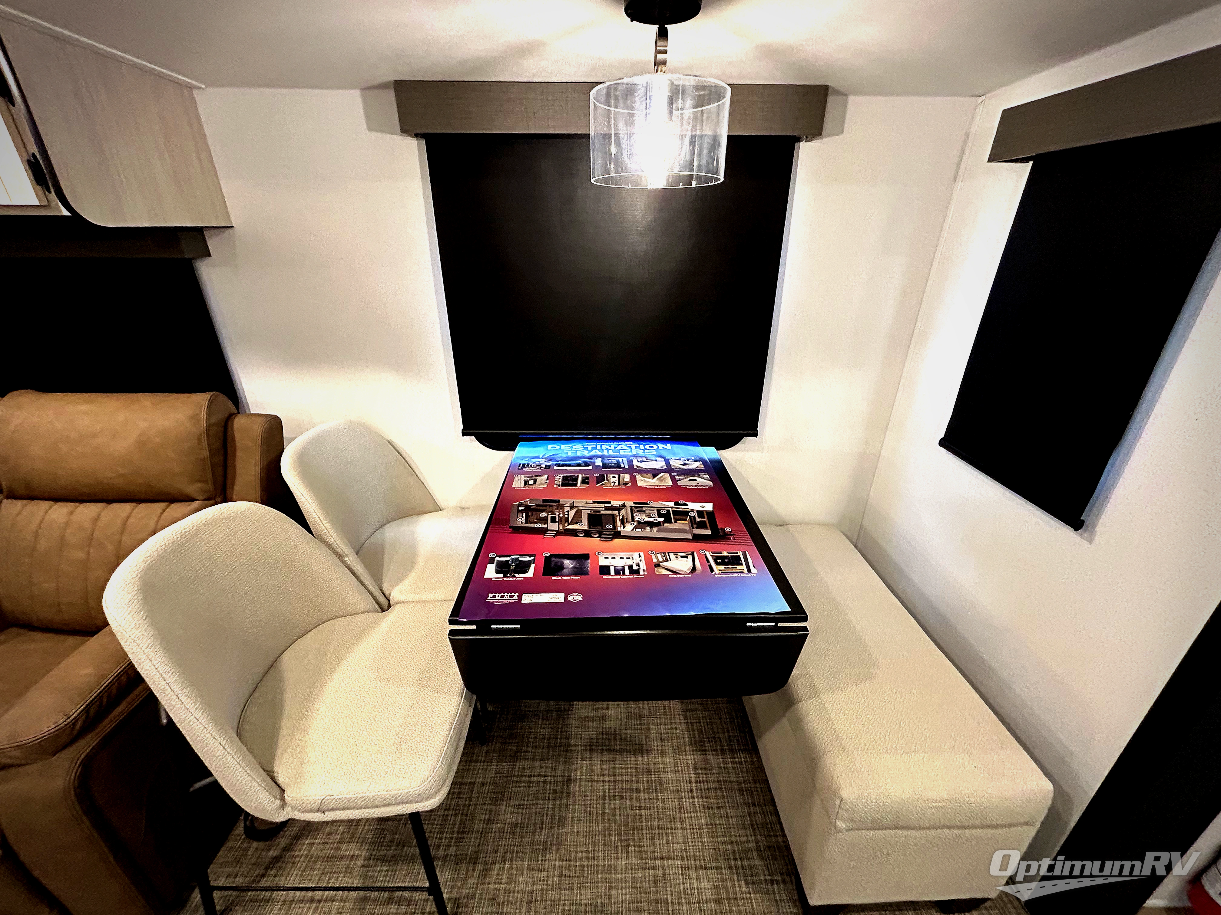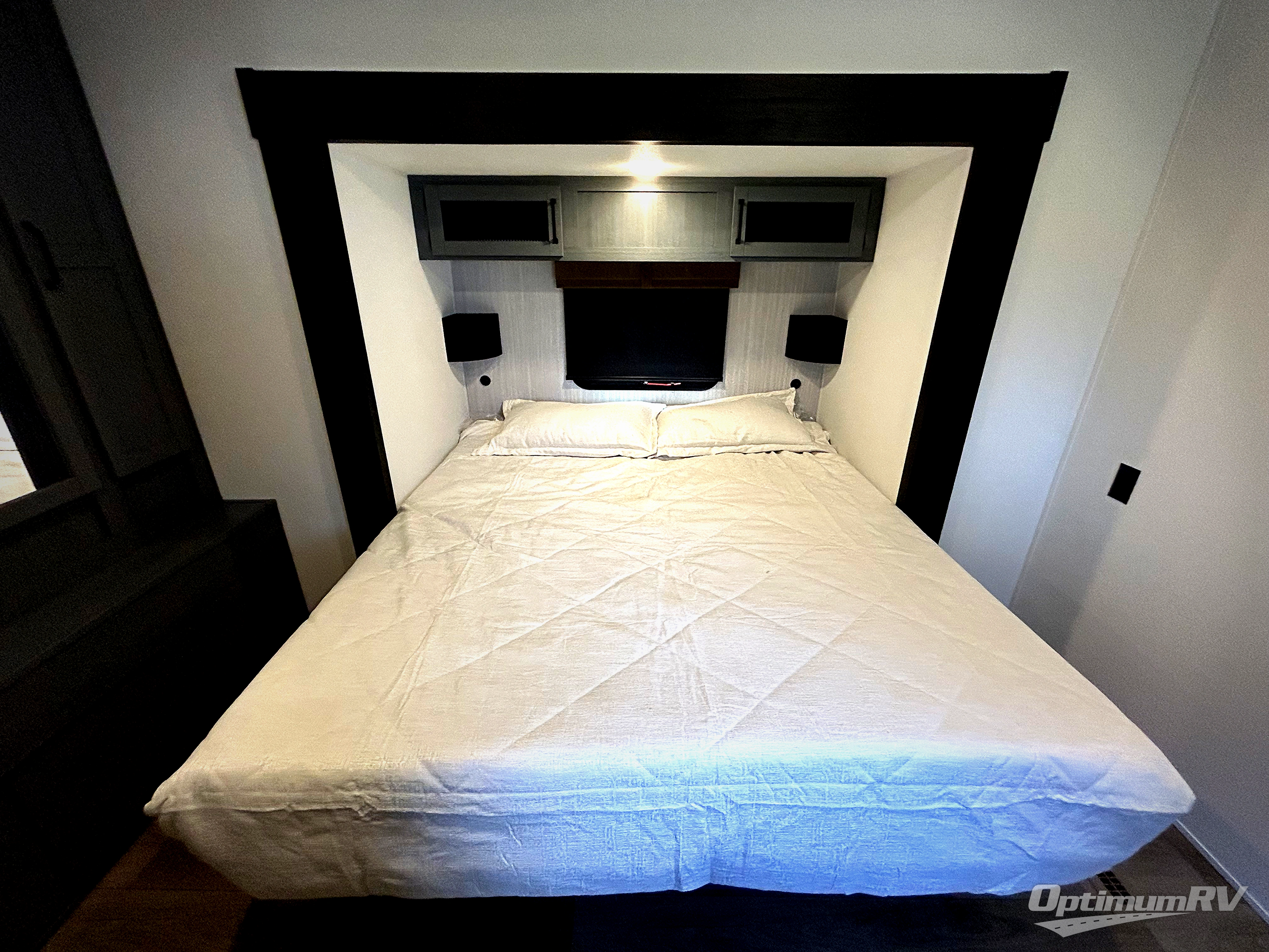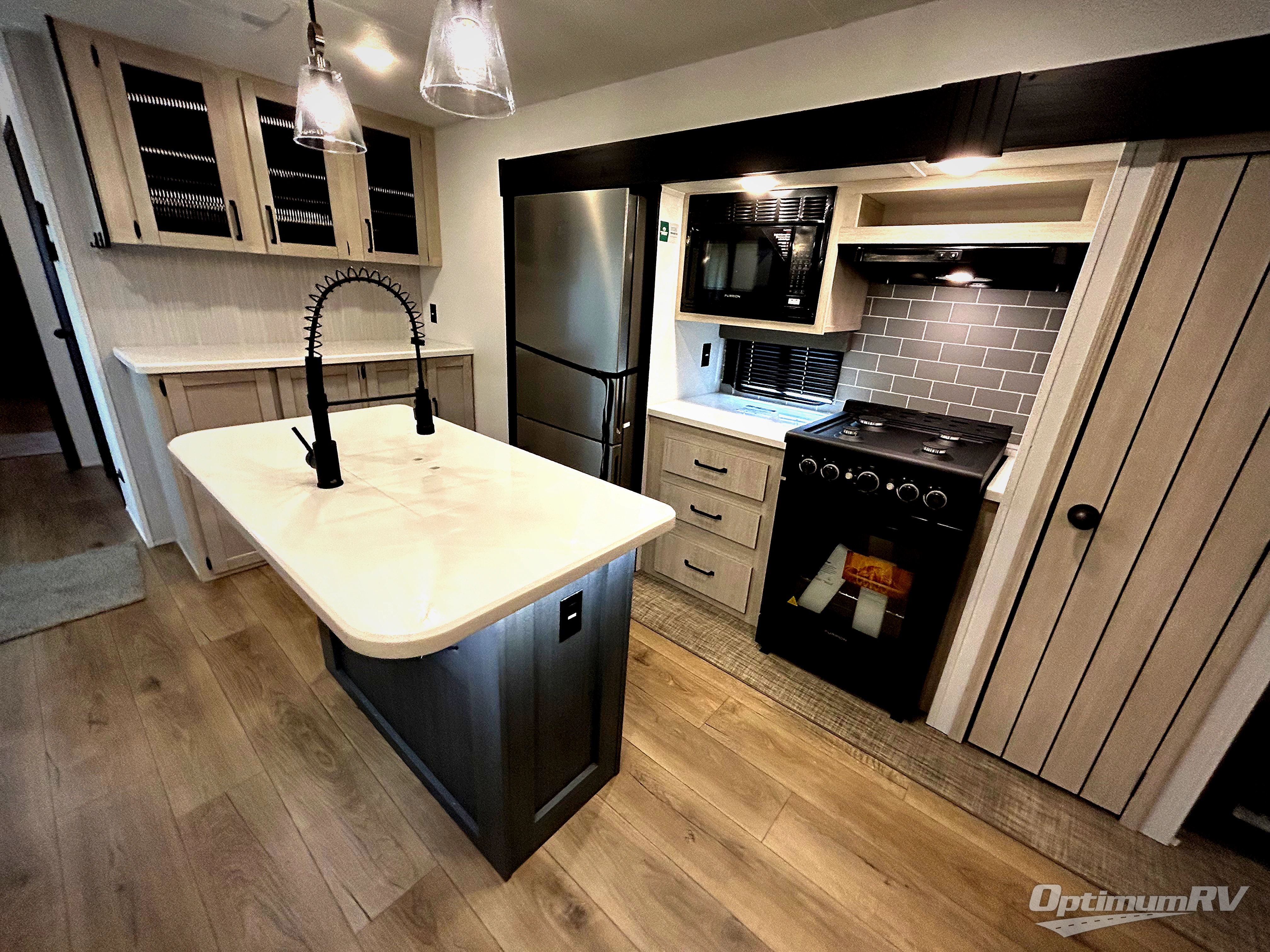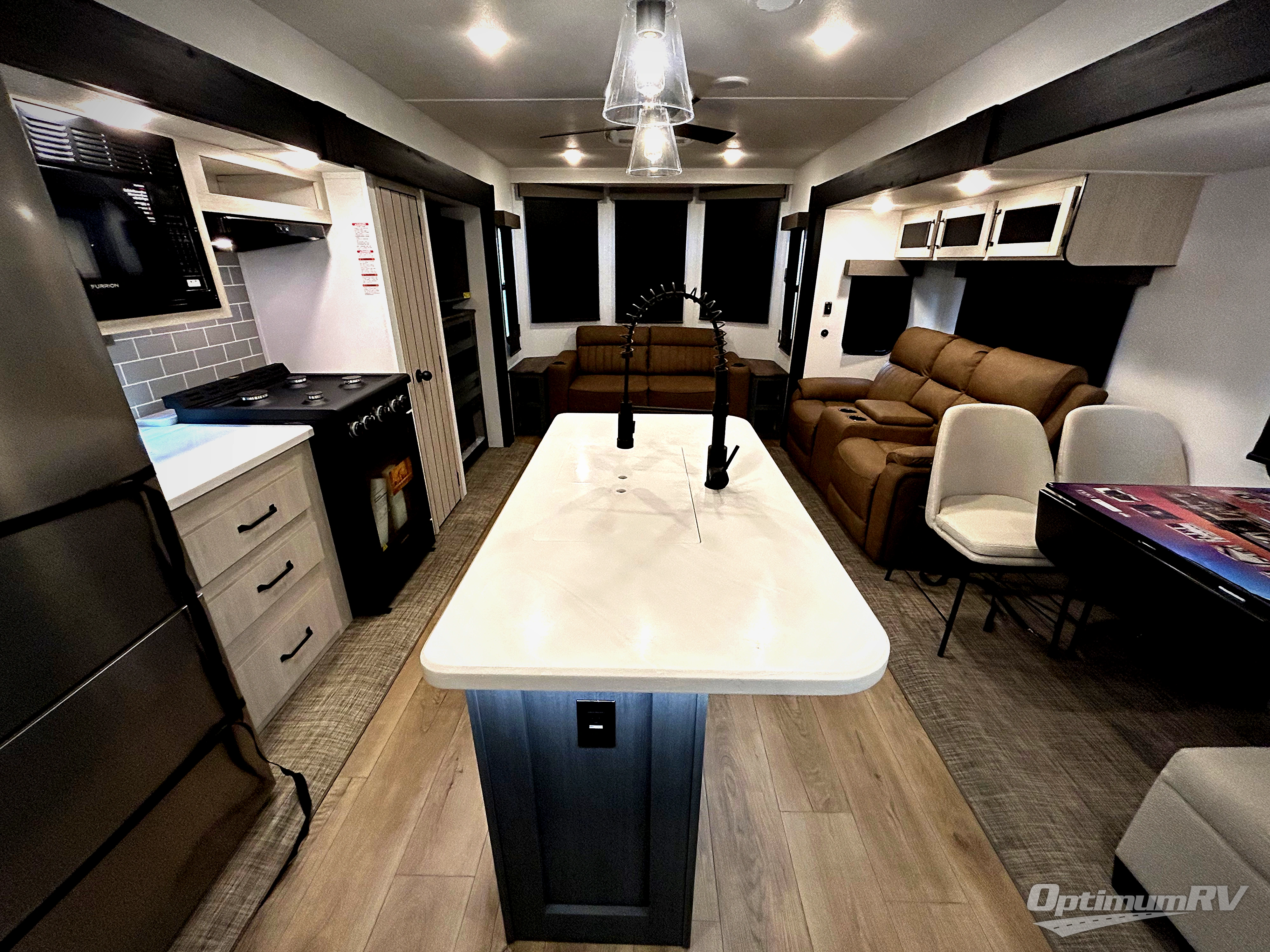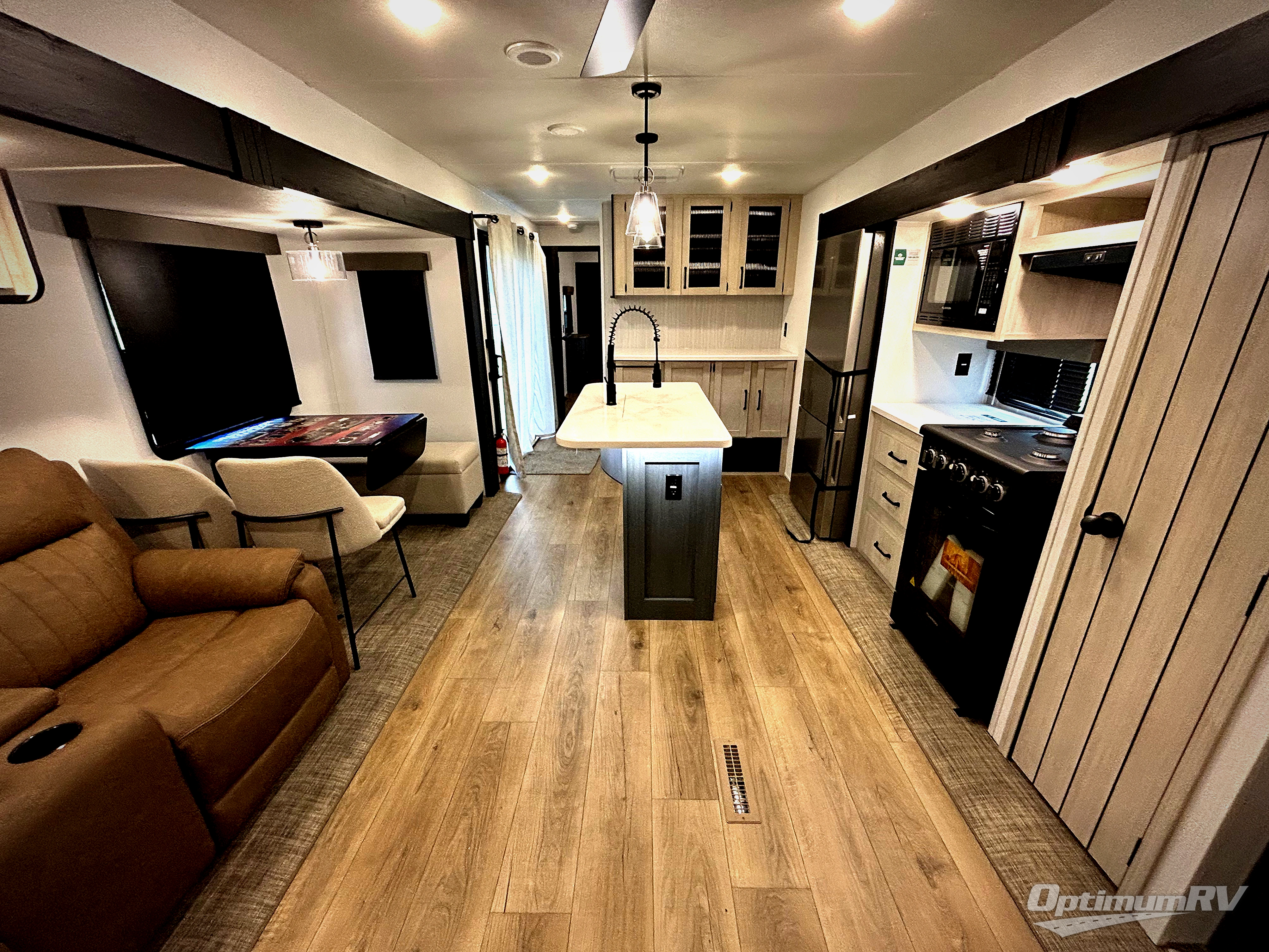 Get ready to enjoy your destination for a weekend or even longer in comfort with the front living and kitchen combined area. The sofa and booth dinette offer relaxing and dining space as well as sleeping space when needed. There are two recliners you are sure to love, as well as a fireplace to make it feel more like home. There is a kitchen island to prepare and serve meals from and wash the dishes. The kitchen offers full amenities including a stainless steel refrigerator and plenty of storage. You will surely enjoy the natural lighting from the patio door, and the second entry/exit is located in the rear private bedroom where you can sleep like a royalty on the king bed. There is also a closet with the option to add washer and dryer prep if you choose!