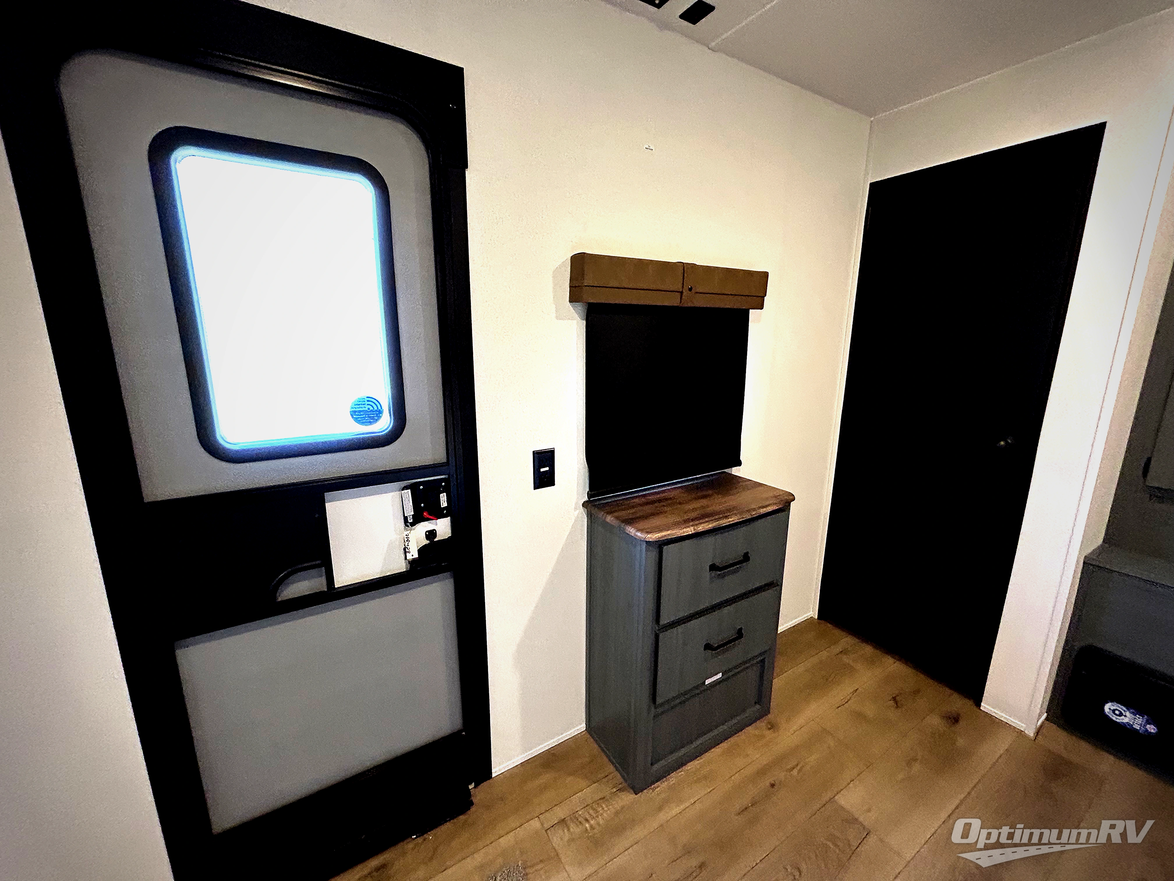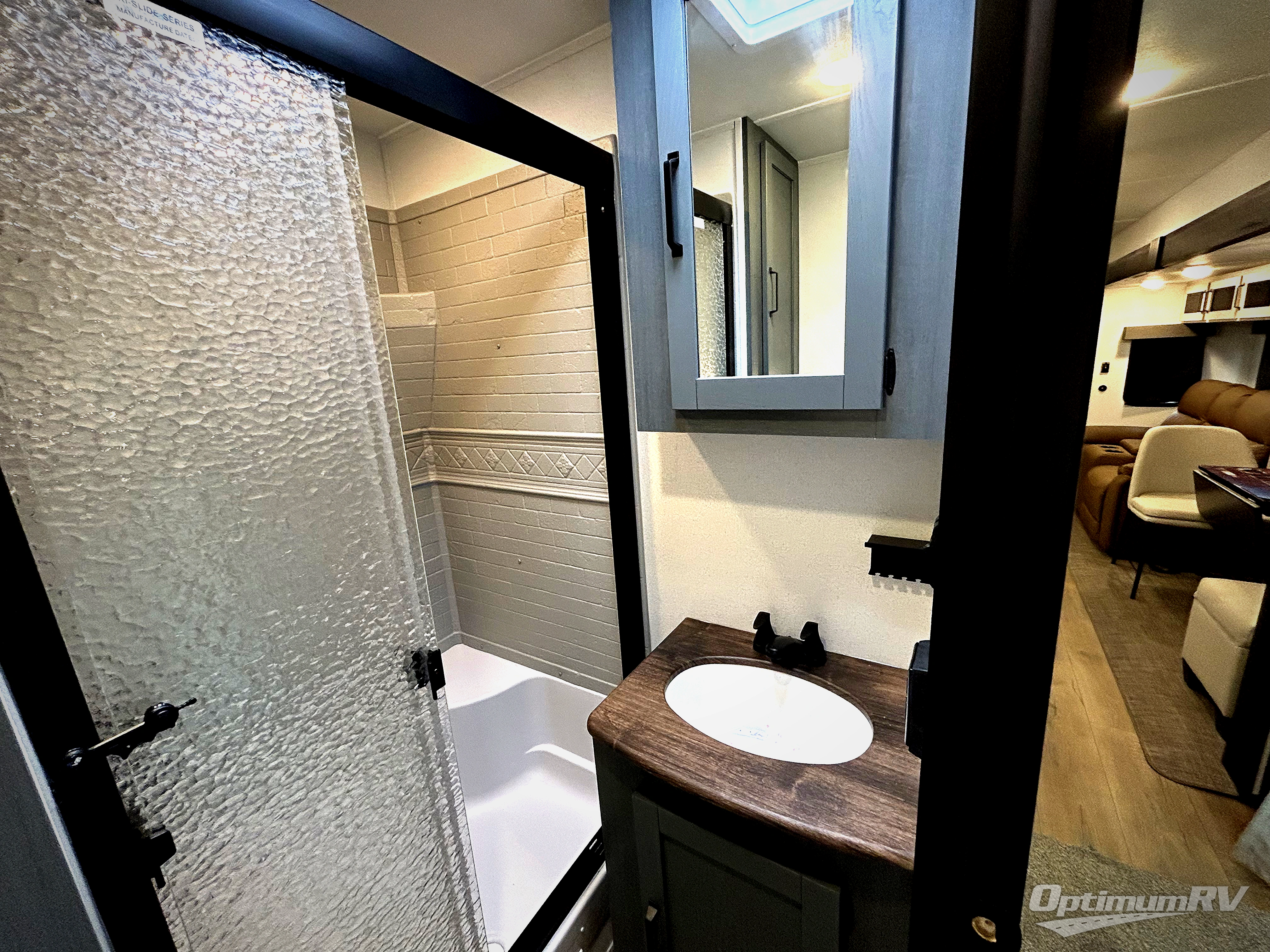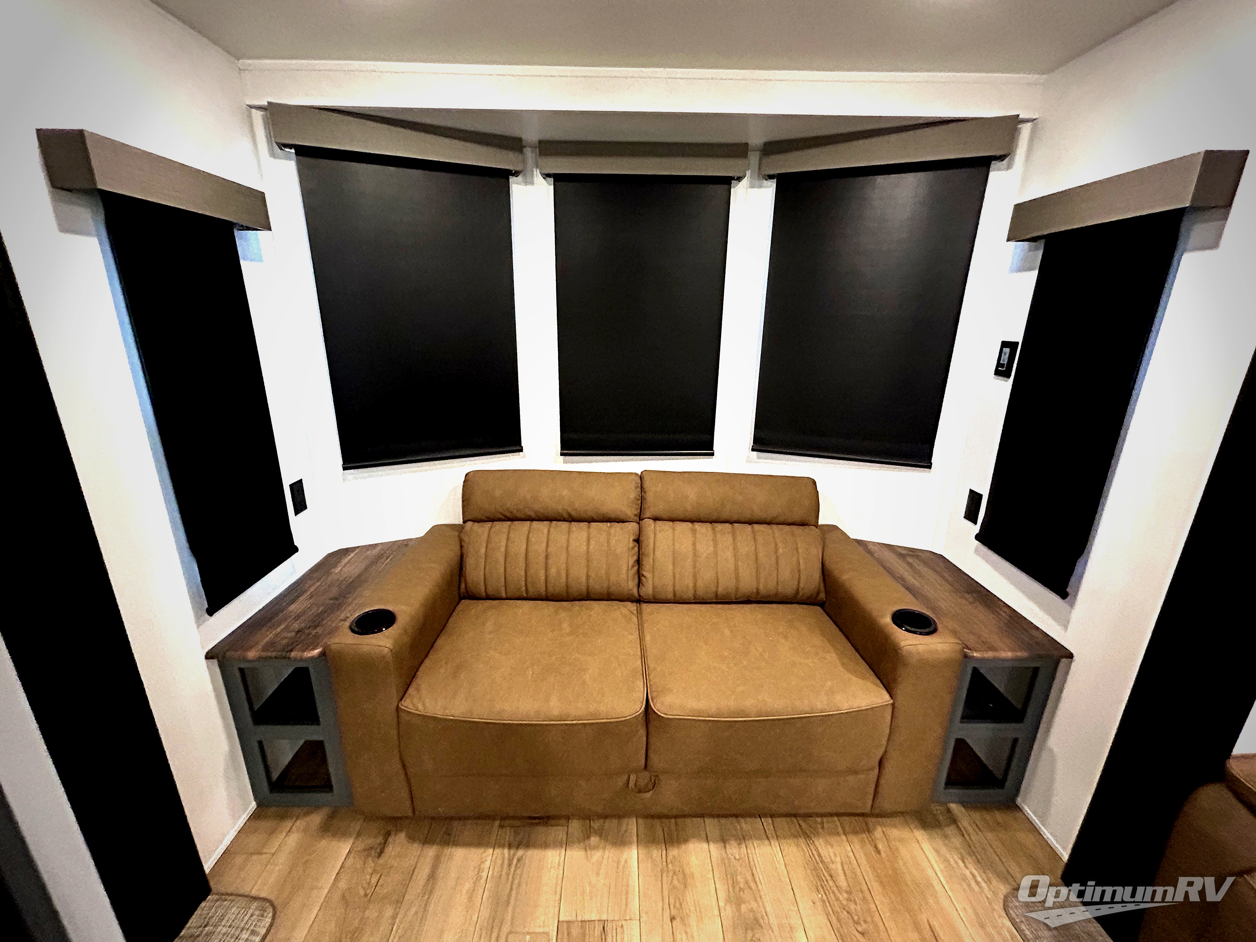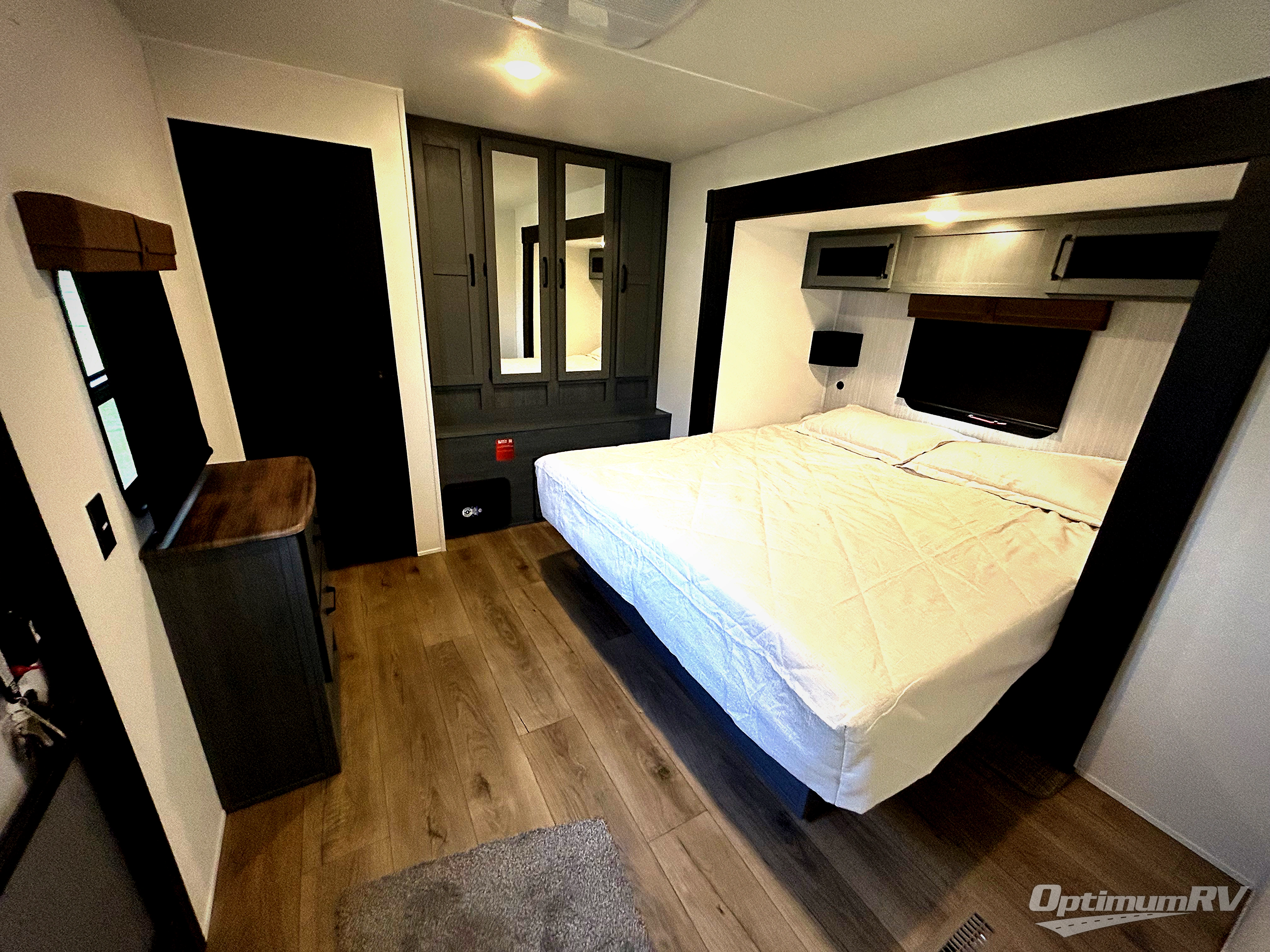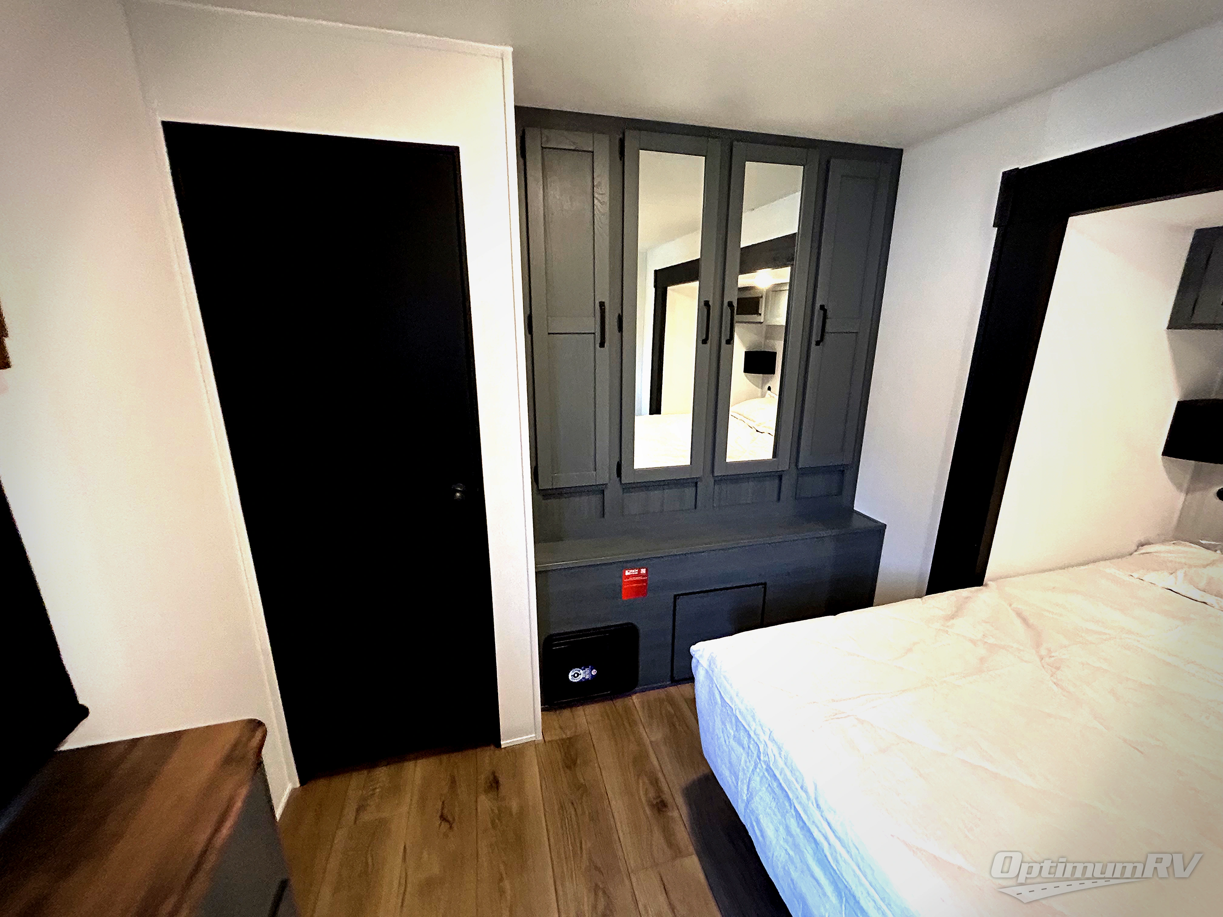 Get ready to enjoy your destination for a weekend or even longer in comfort with the front living and kitchen combined area. The sofa and booth dinette offer relaxing and dining space as well as sleeping space when needed. There are two recliners you are sure to love, as well as a fireplace to make it feel more like home. There is a kitchen island to prepare and serve meals from and wash the dishes. The kitchen offers full amenities including a stainless steel refrigerator and plenty of storage. You will surely enjoy the natural lighting from the patio door, and the second entry/exit is located in the rear private bedroom where you can sleep like a royalty on the king bed. There is also a closet with the option to add washer and dryer prep if you choose!