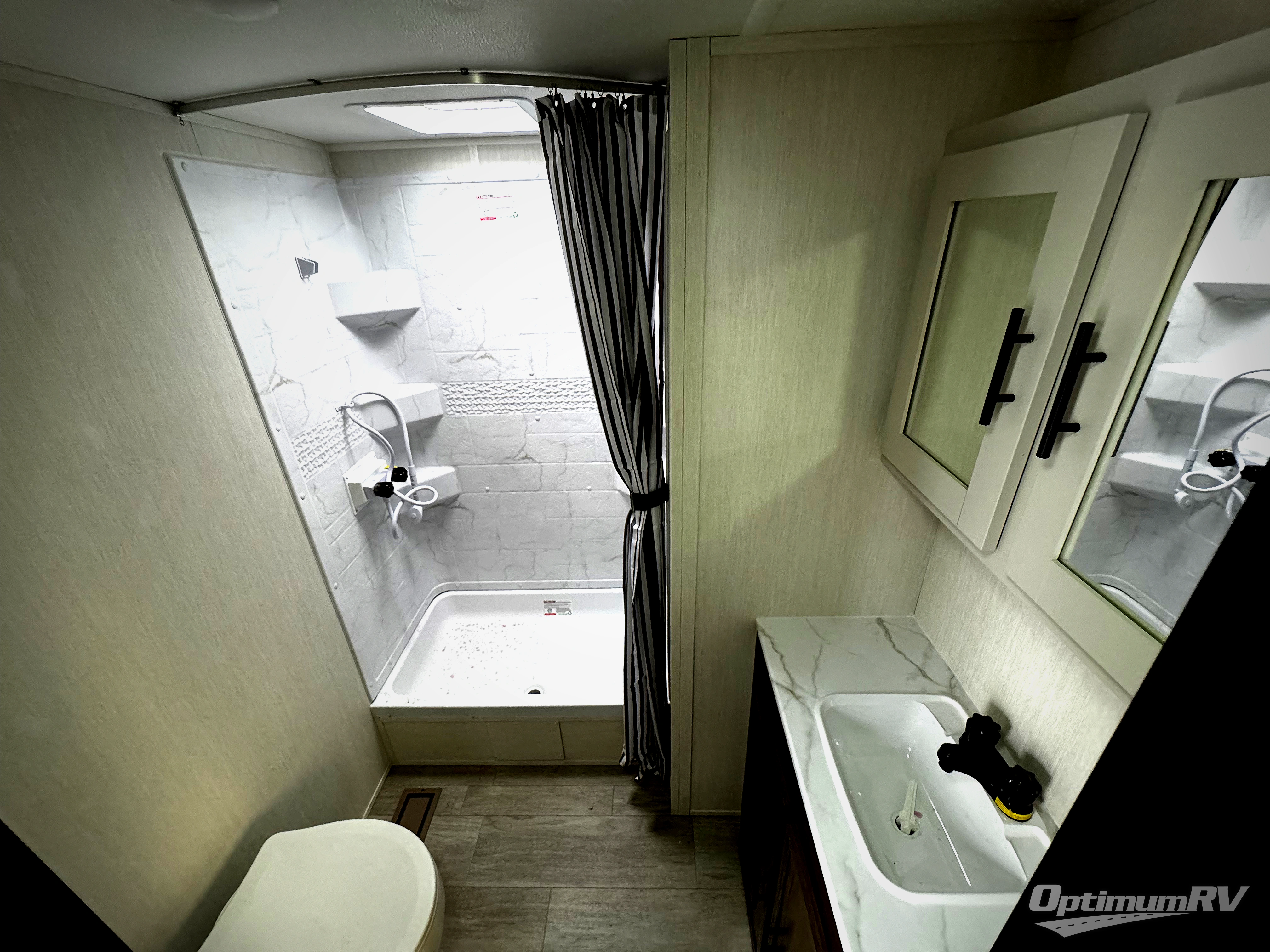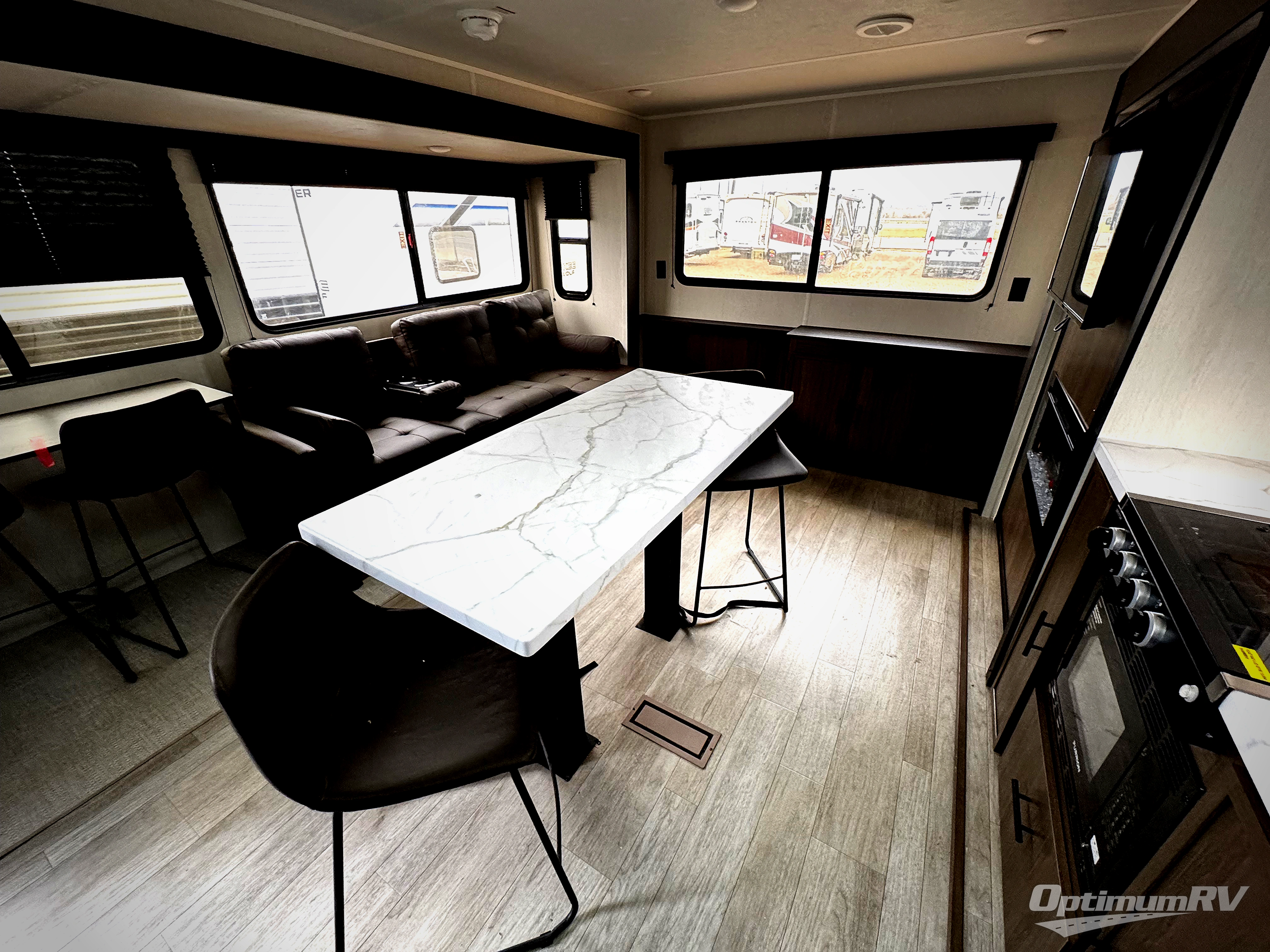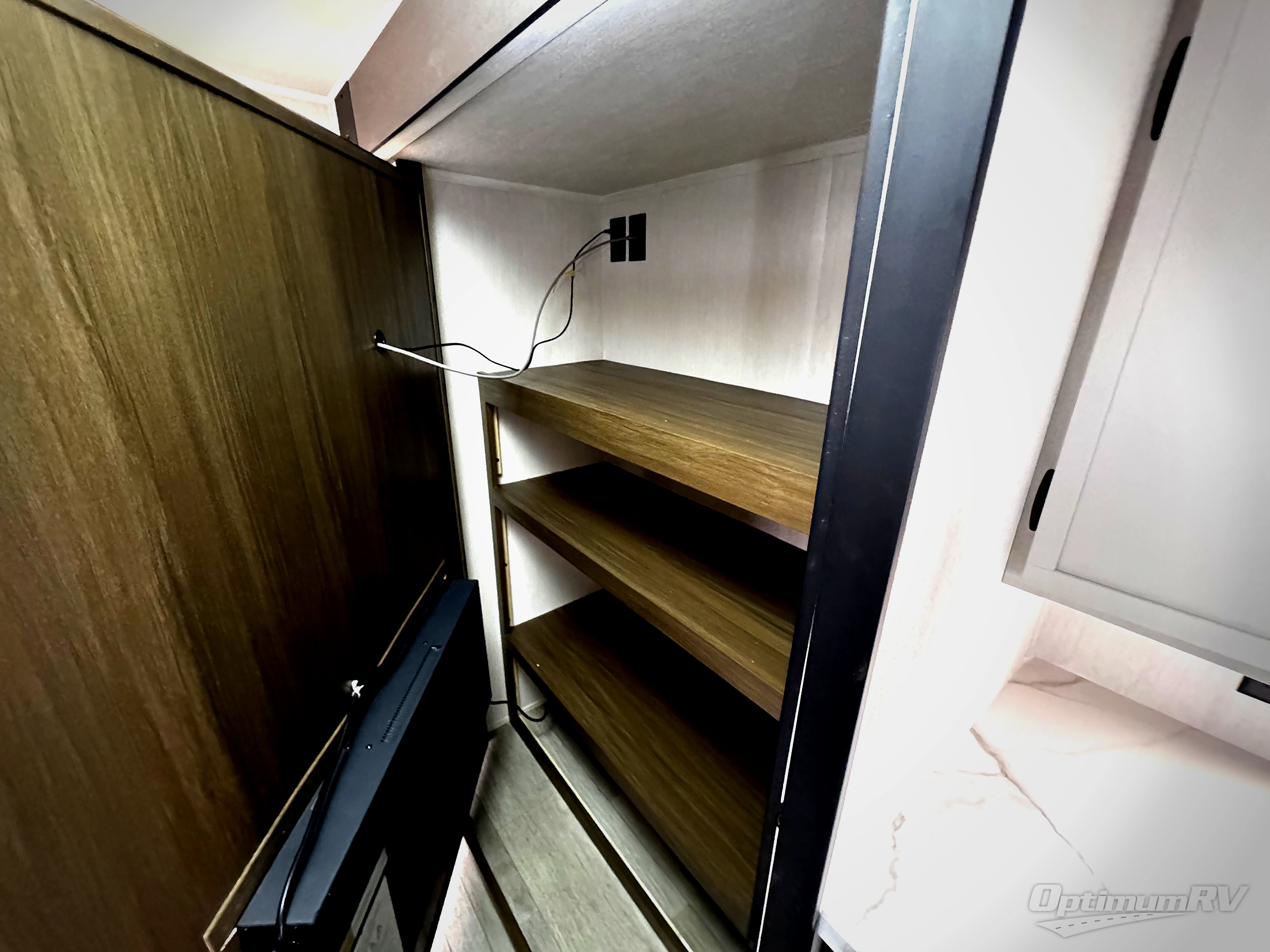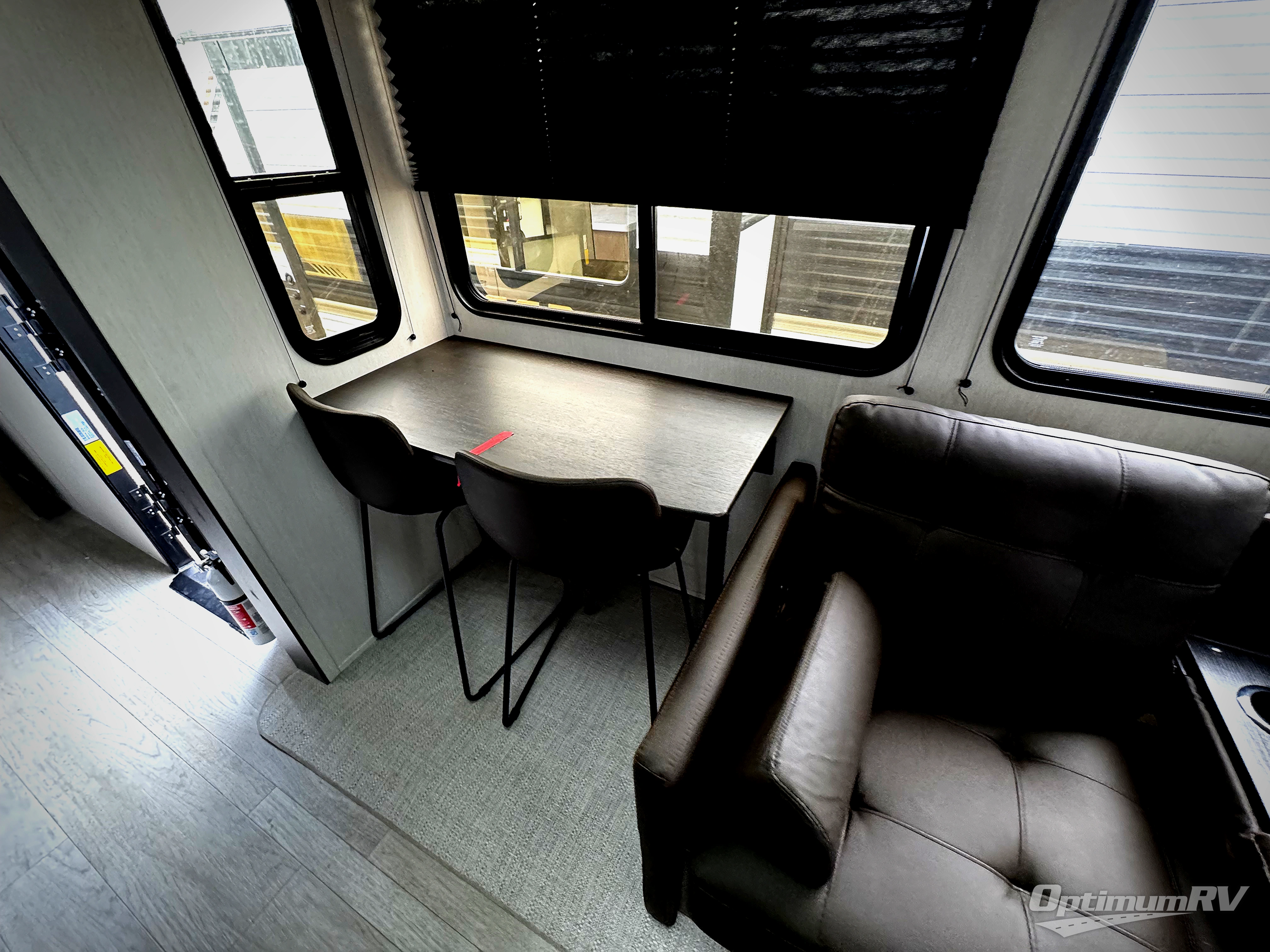 There is ample space to move about in this travel trailer thanks to the dual opposing slides! Here, you'll find an L-shaped sofa with a chaise lounge in direct view of TV and fireplace. There is also a hidden pantry behind the TV for snacks and movies! The center farm table includes four stools so you can gather around for meal times, and the desk with a chair will provide a place for you to get some work done if needed. This unit features a full bath towards the front private bedroom for easy access at night, and you're sure to get a great night's rest on the camp king bed!