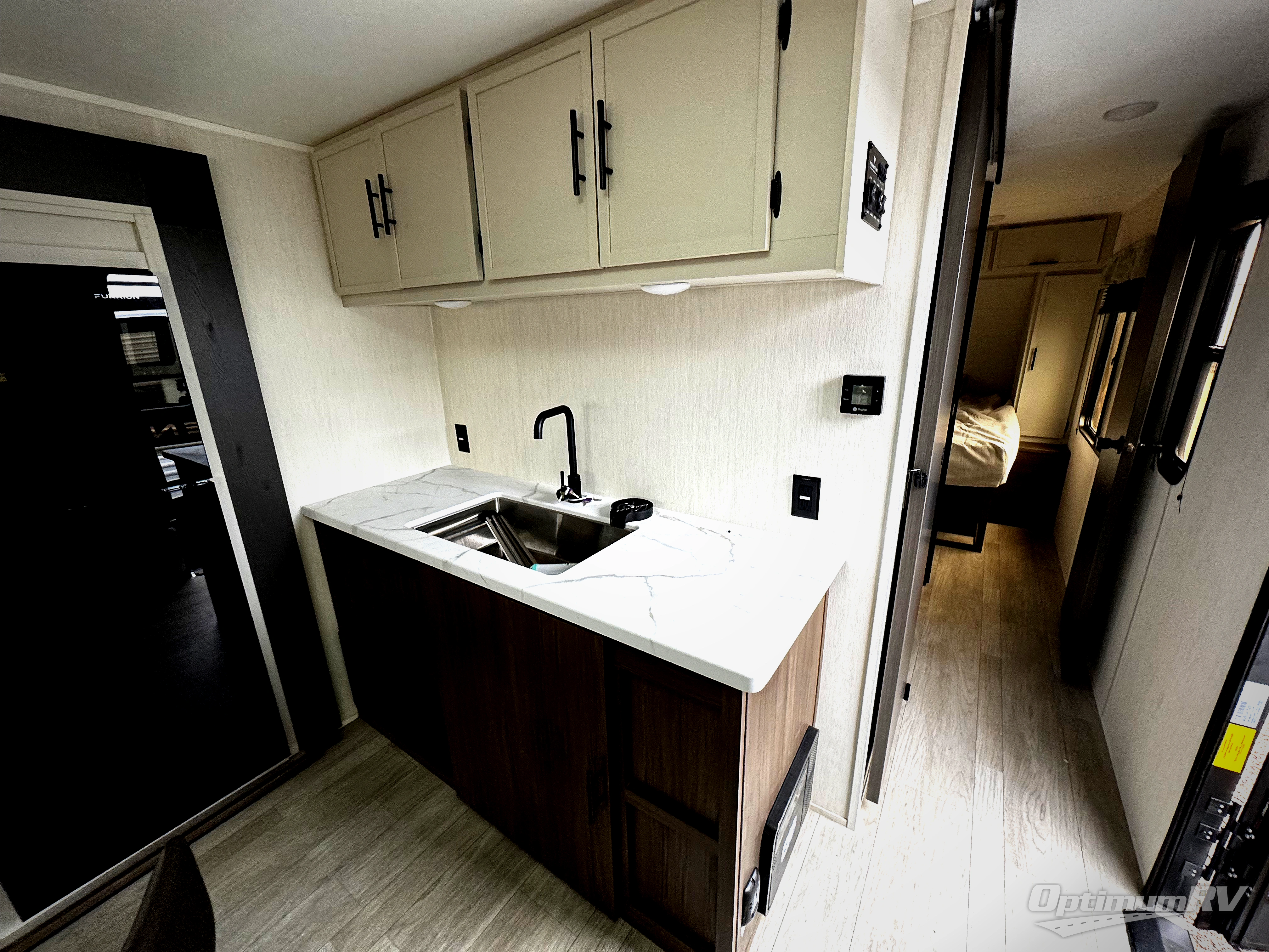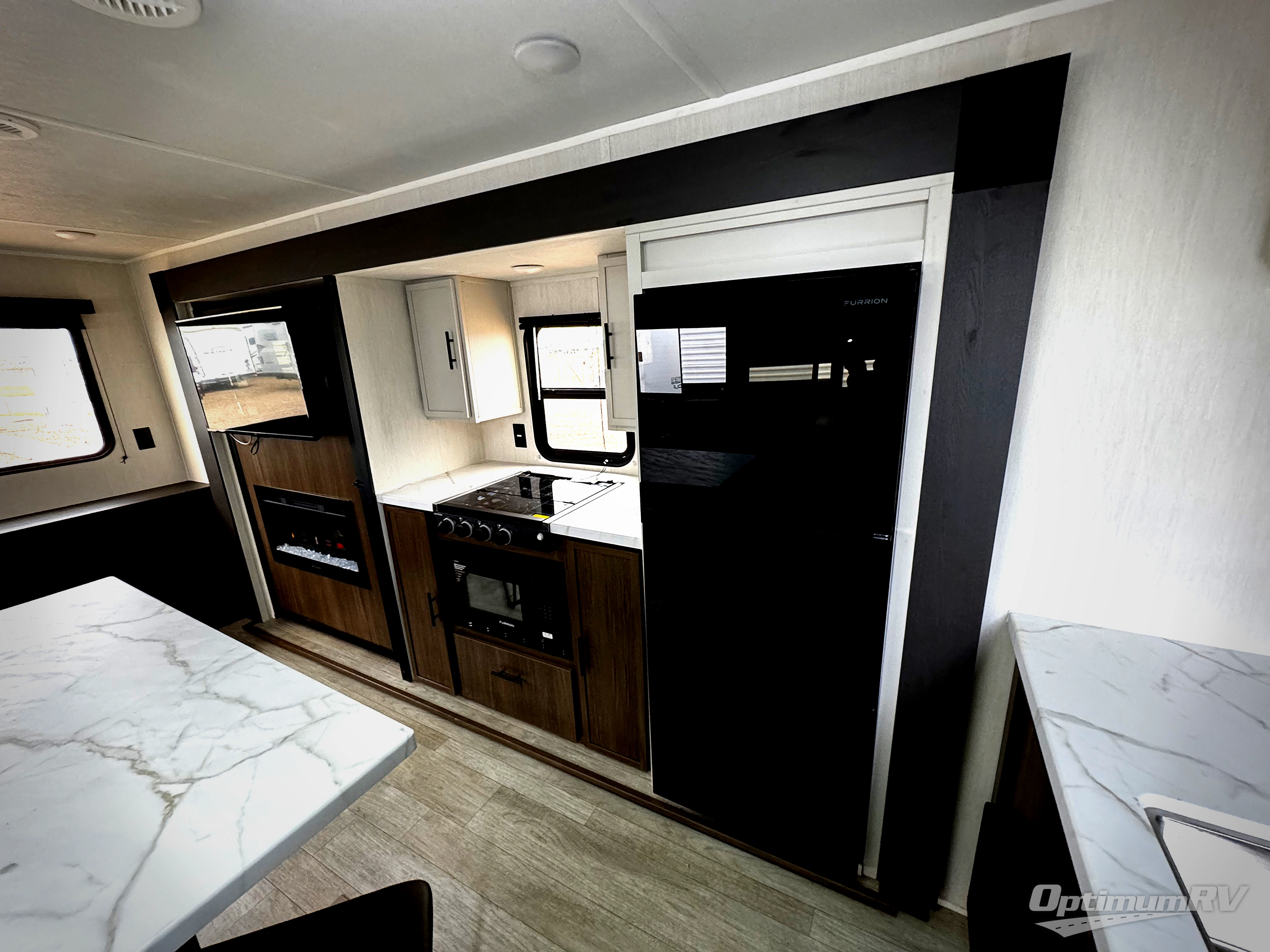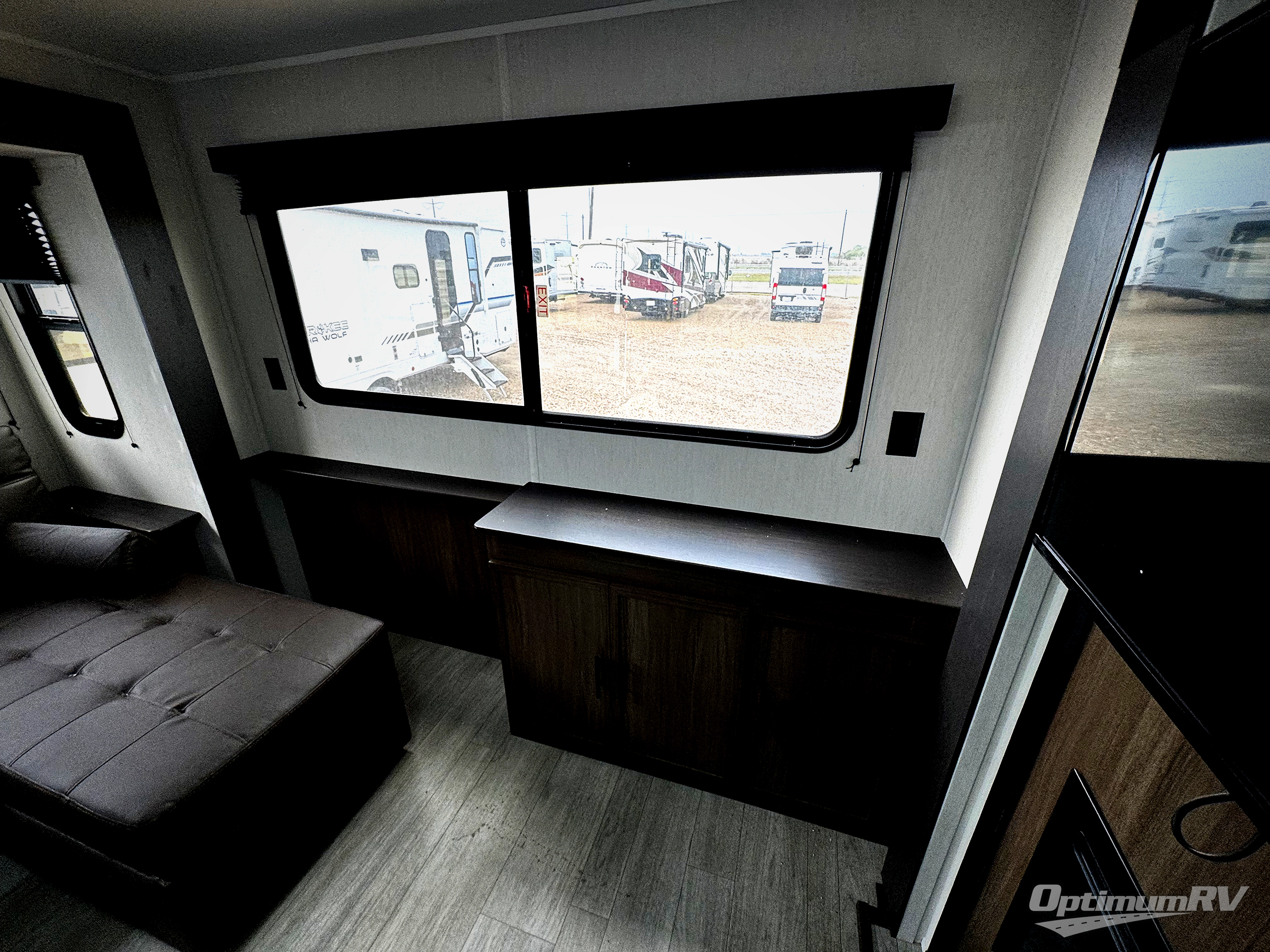 There is ample space to move about in this travel trailer thanks to the dual opposing slides! Here, you'll find an L-shaped sofa with a chaise lounge in direct view of TV and fireplace. There is also a hidden pantry behind the TV for snacks and movies! The center farm table includes four stools so you can gather around for meal times, and the desk with a chair will provide a place for you to get some work done if needed. This unit features a full bath towards the front private bedroom for easy access at night, and you're sure to get a great night's rest on the camp king bed!