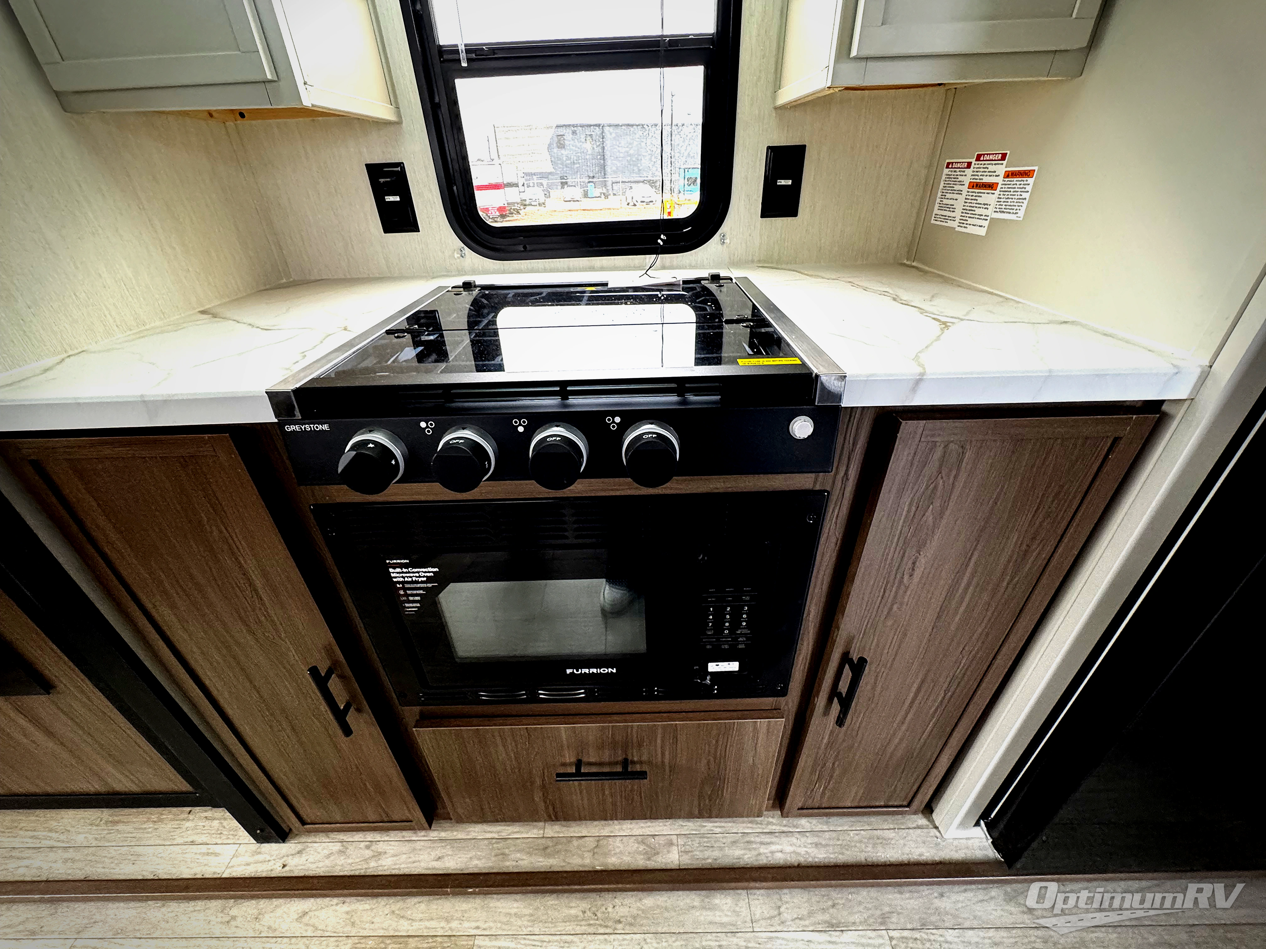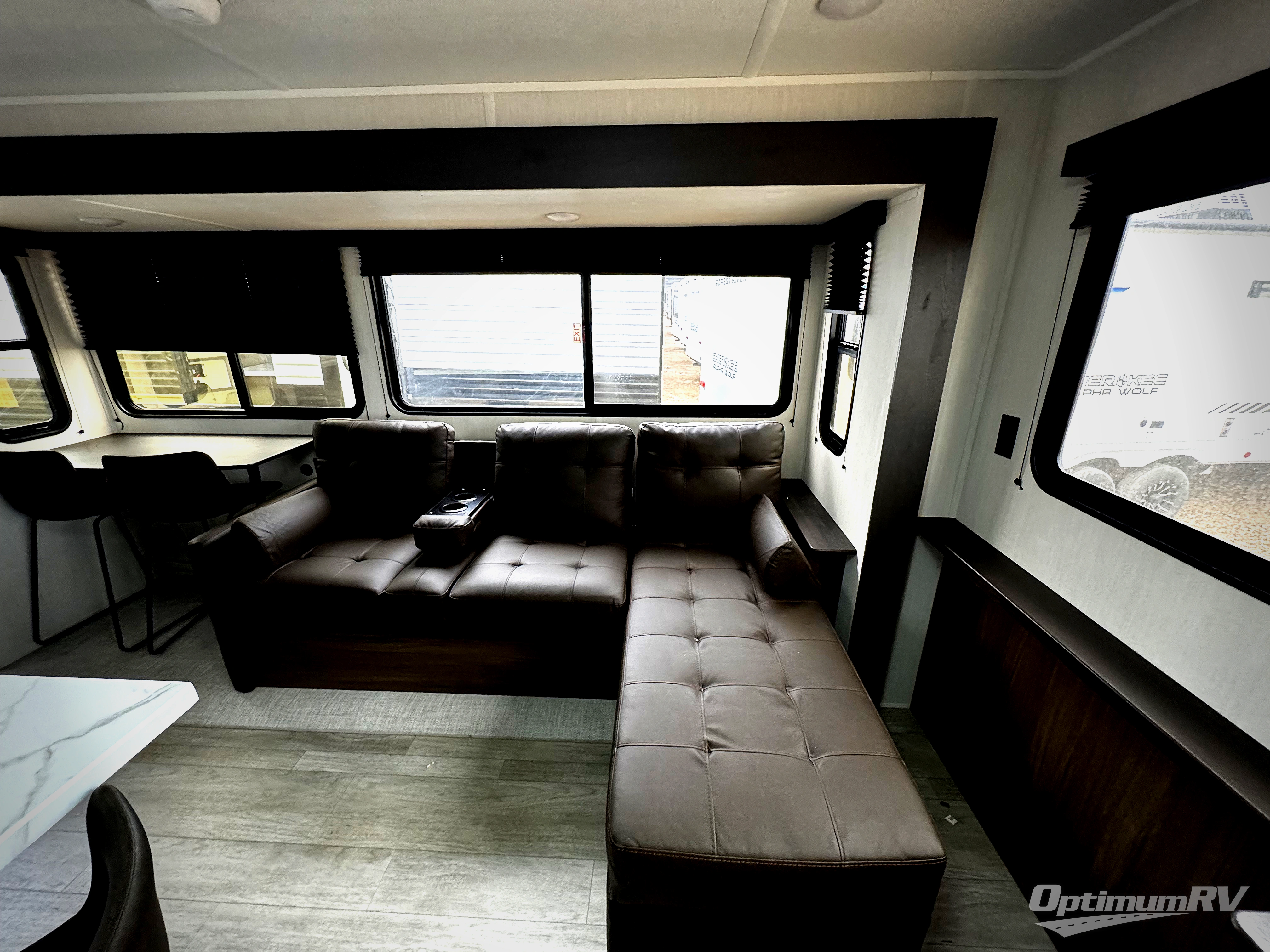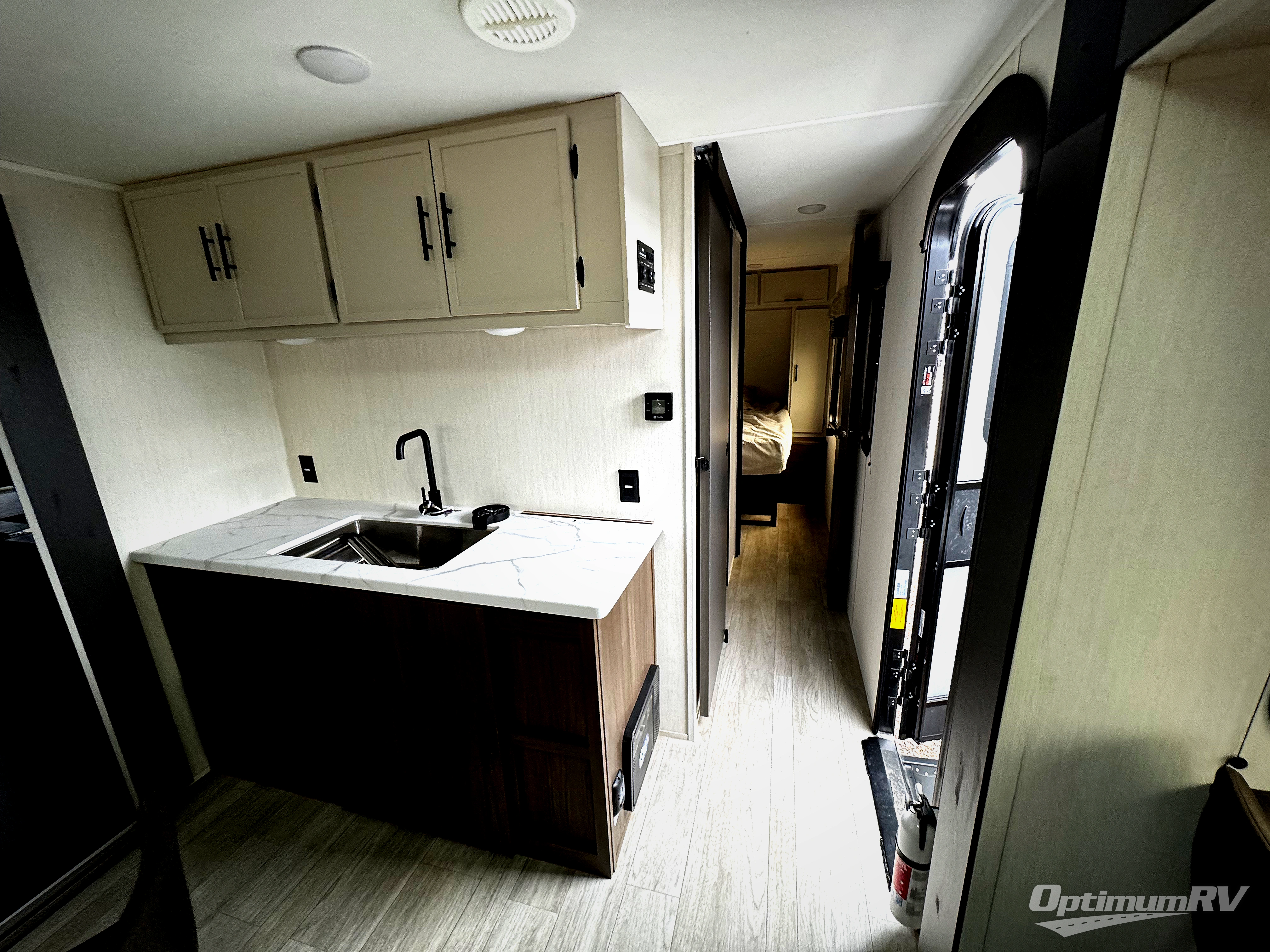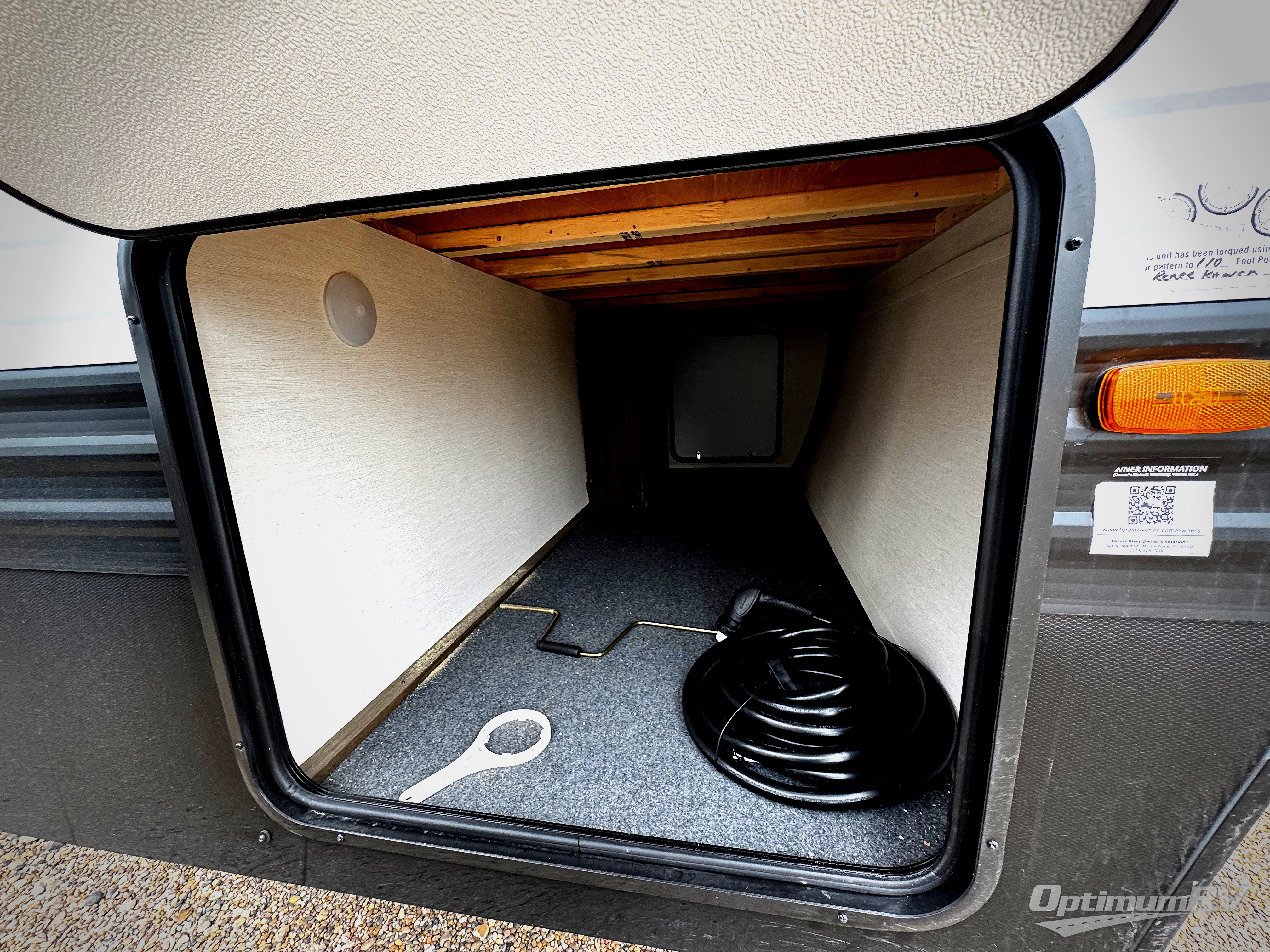 There is ample space to move about in this travel trailer thanks to the dual opposing slides! Here, you'll find an L-shaped sofa with a chaise lounge in direct view of TV and fireplace. There is also a hidden pantry behind the TV for snacks and movies! The center farm table includes four stools so you can gather around for meal times, and the desk with a chair will provide a place for you to get some work done if needed. This unit features a full bath towards the front private bedroom for easy access at night, and you're sure to get a great night's rest on the camp king bed!