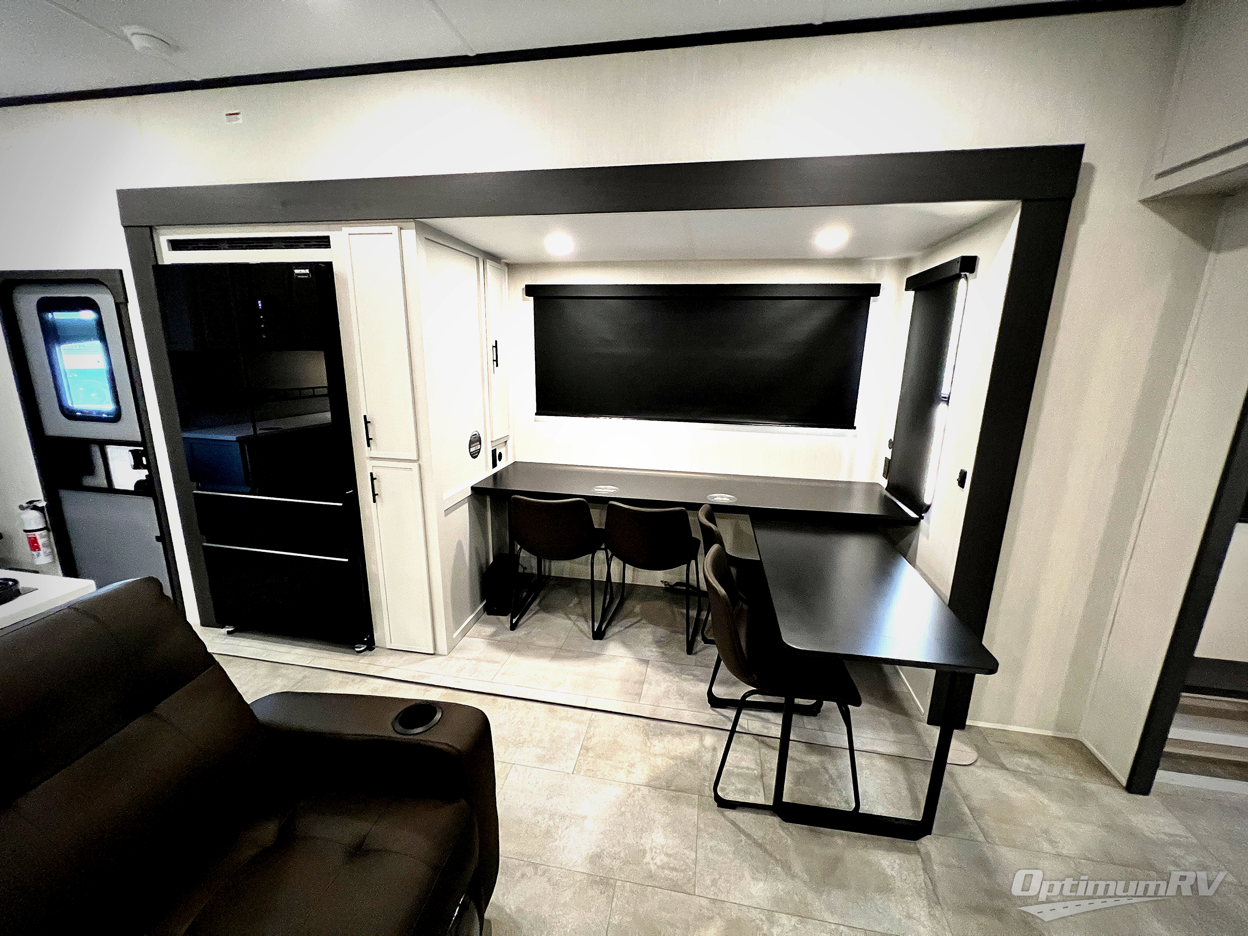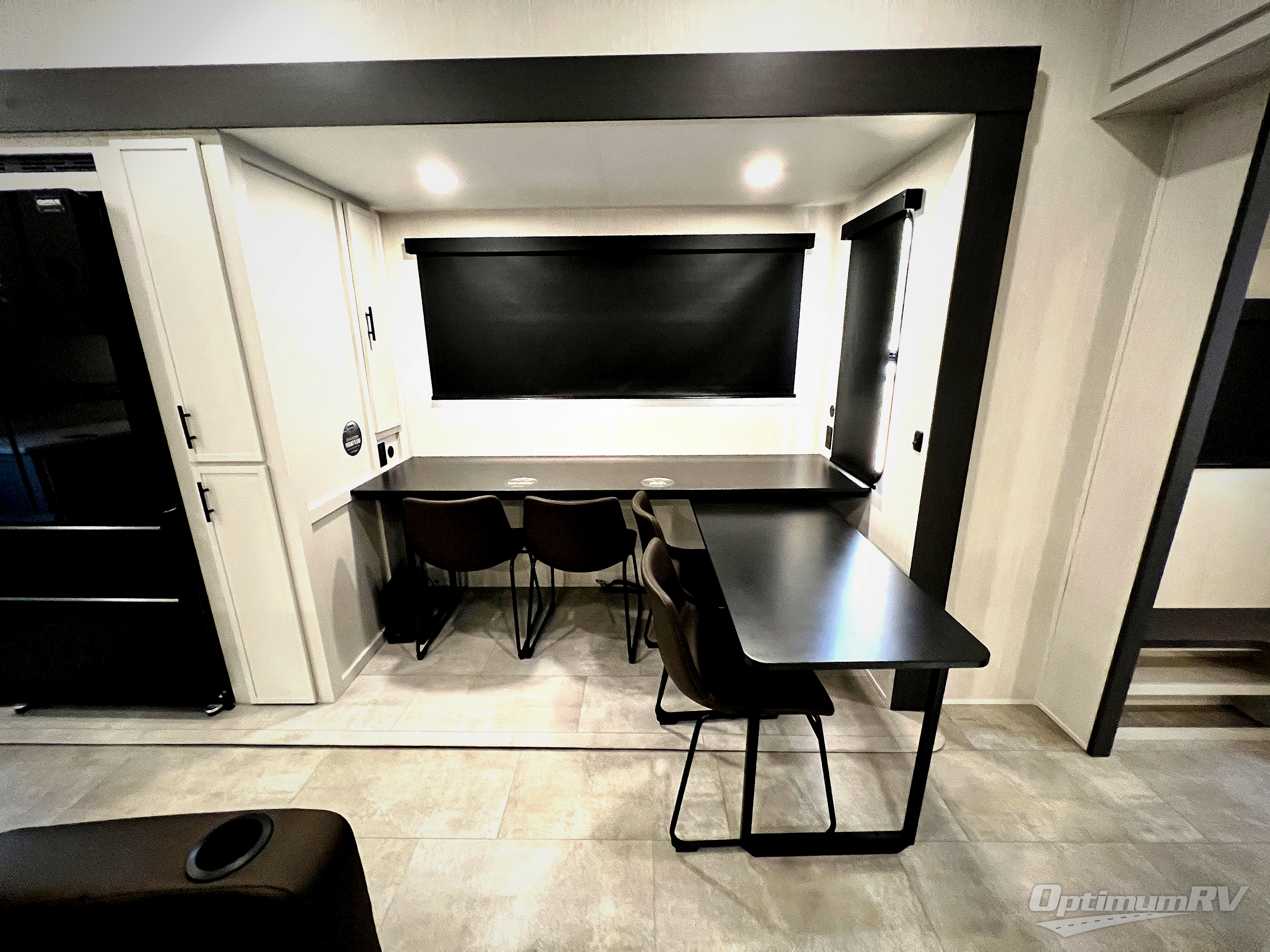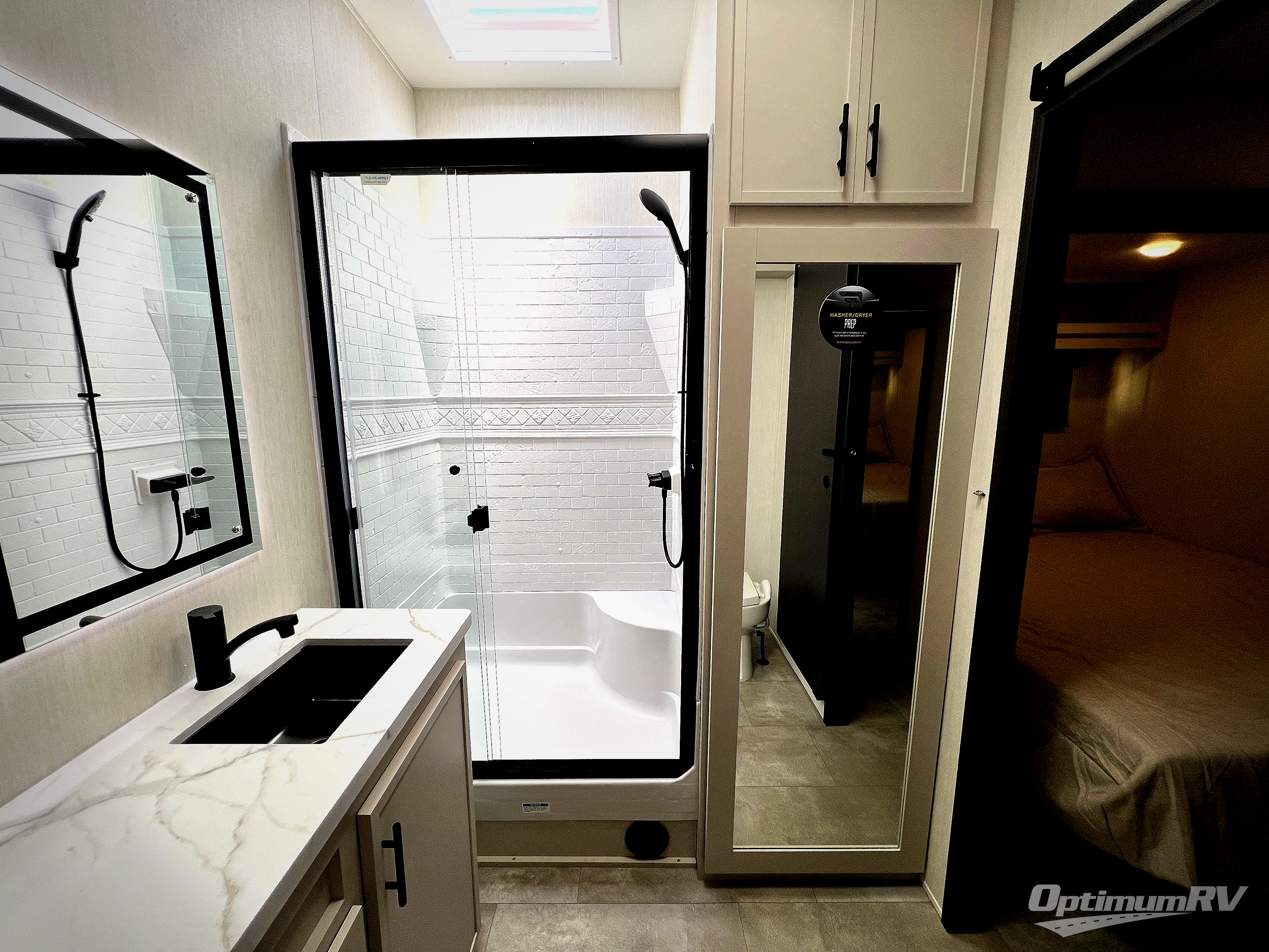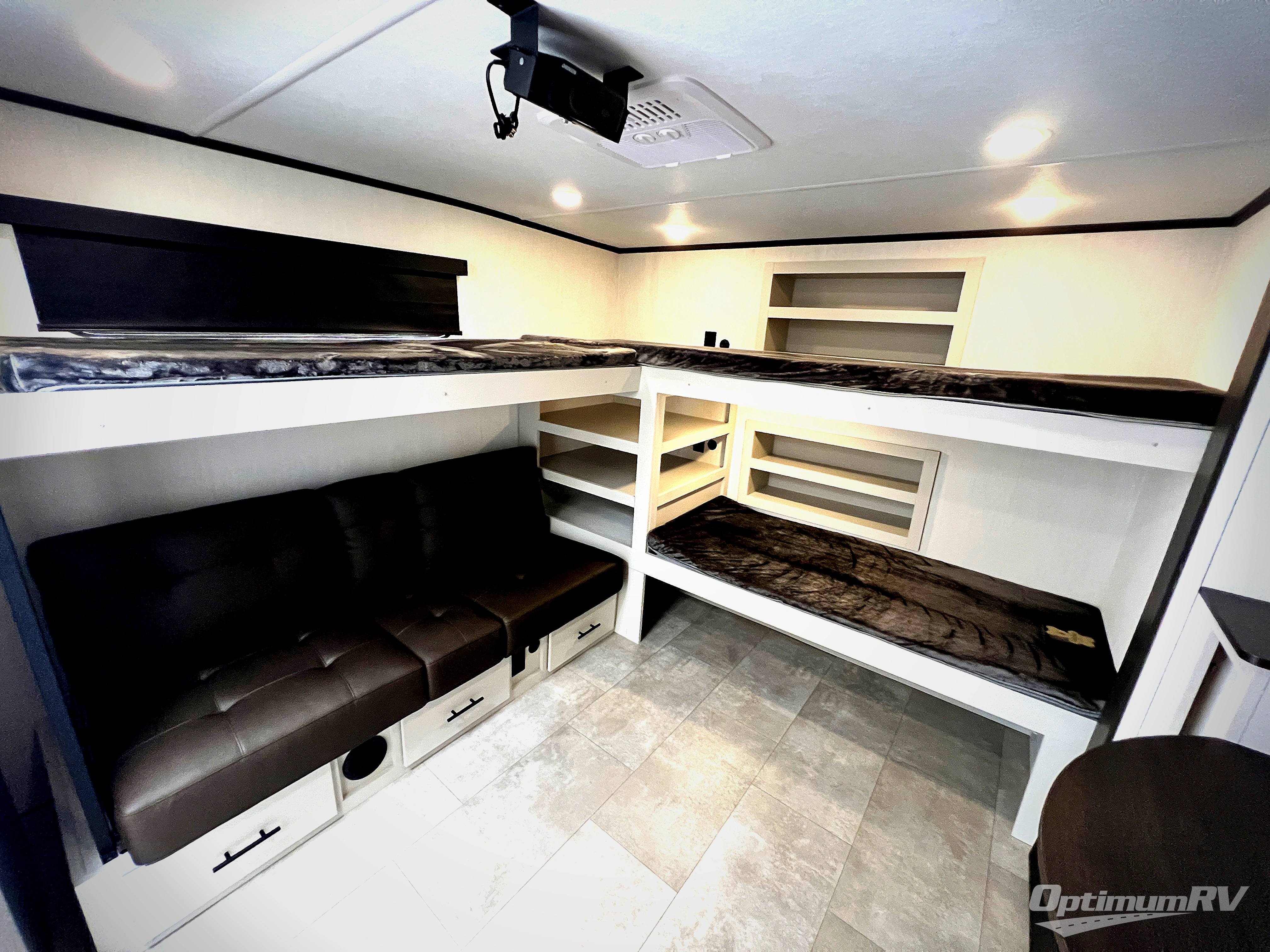 If you enjoy long trips with family and friends, this fifth wheel is sure to meet all of your needs! There is a private bedroom with a king bed slide-out for more space and comfort, plus a front wardrobe. And you will be amazed by the lovely full bathroom behind the barn door next to the bedroom with a double vanity for you and your partner! The living room is made spacious thanks to the dual opposing slides, and you'll find a sectional sleeper sofa here, as well as desk/dinette for meals and even work. And don't overlook the kitchen area with ample counter space, a four burner range, an accessory sink and a French door 12V refrigerator! If you thought it can´t get better, wait until you see the front room that will be the best place to relax and hang out, featuring a sleeper sofa, bunks above, and an entertainment center with a projector for a movie marathon.