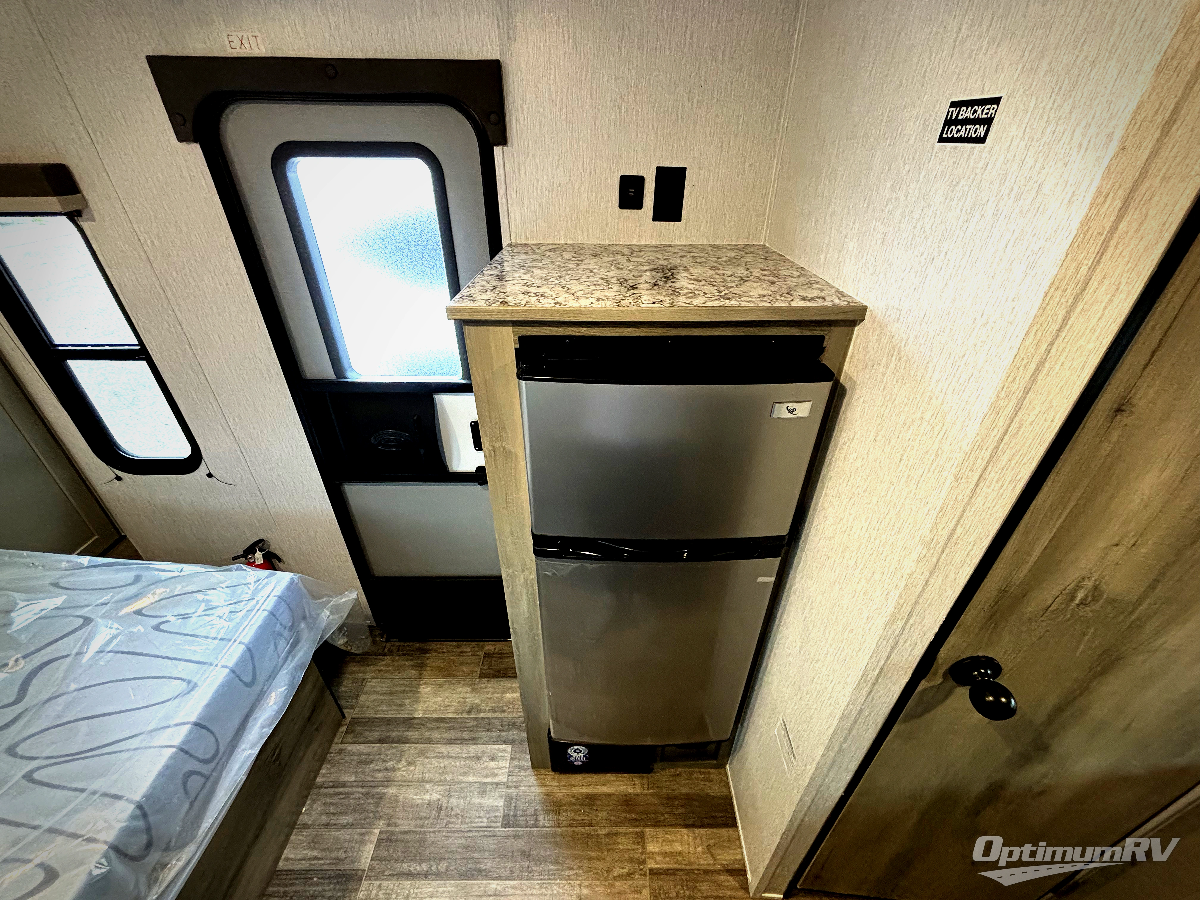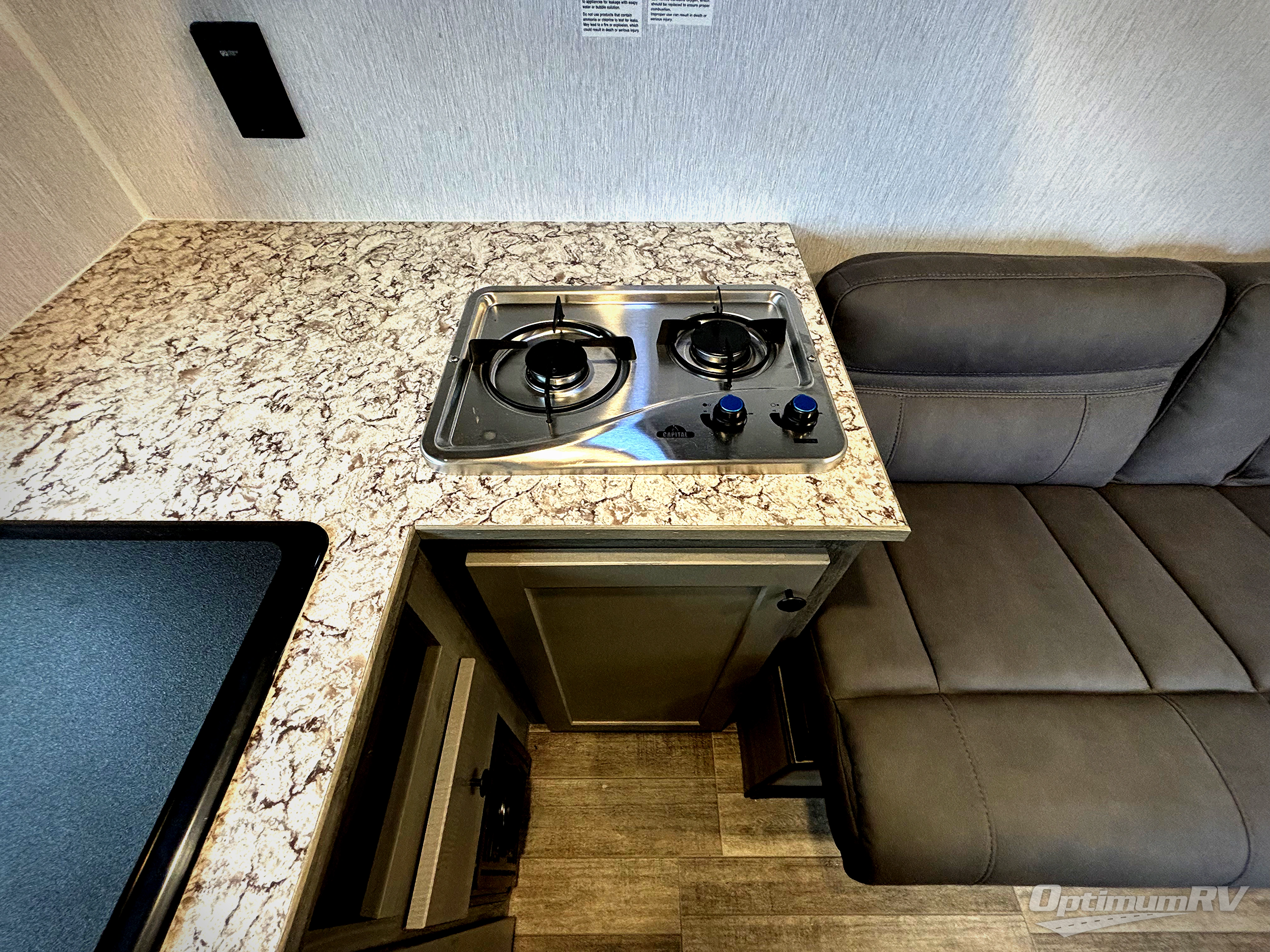 You'll love camping in this cozy trailer! Once you arrive at the campground, you can set up the 9' power awning and head inside to unpack your bags. After you've stretched your legs on a hike, the rear corner private bath with a 24" x 32" shower and a toilet will let you freshen up. You'll find the kitchen in the other rear corner, complete with a two burner cooktop, a double sink, plus counter space to prep meals. When you're ready for some shut-eye, the front 54" x 74" full-size bed will provide a great night's rest, while your guest takes the 56" jiffy sofa!