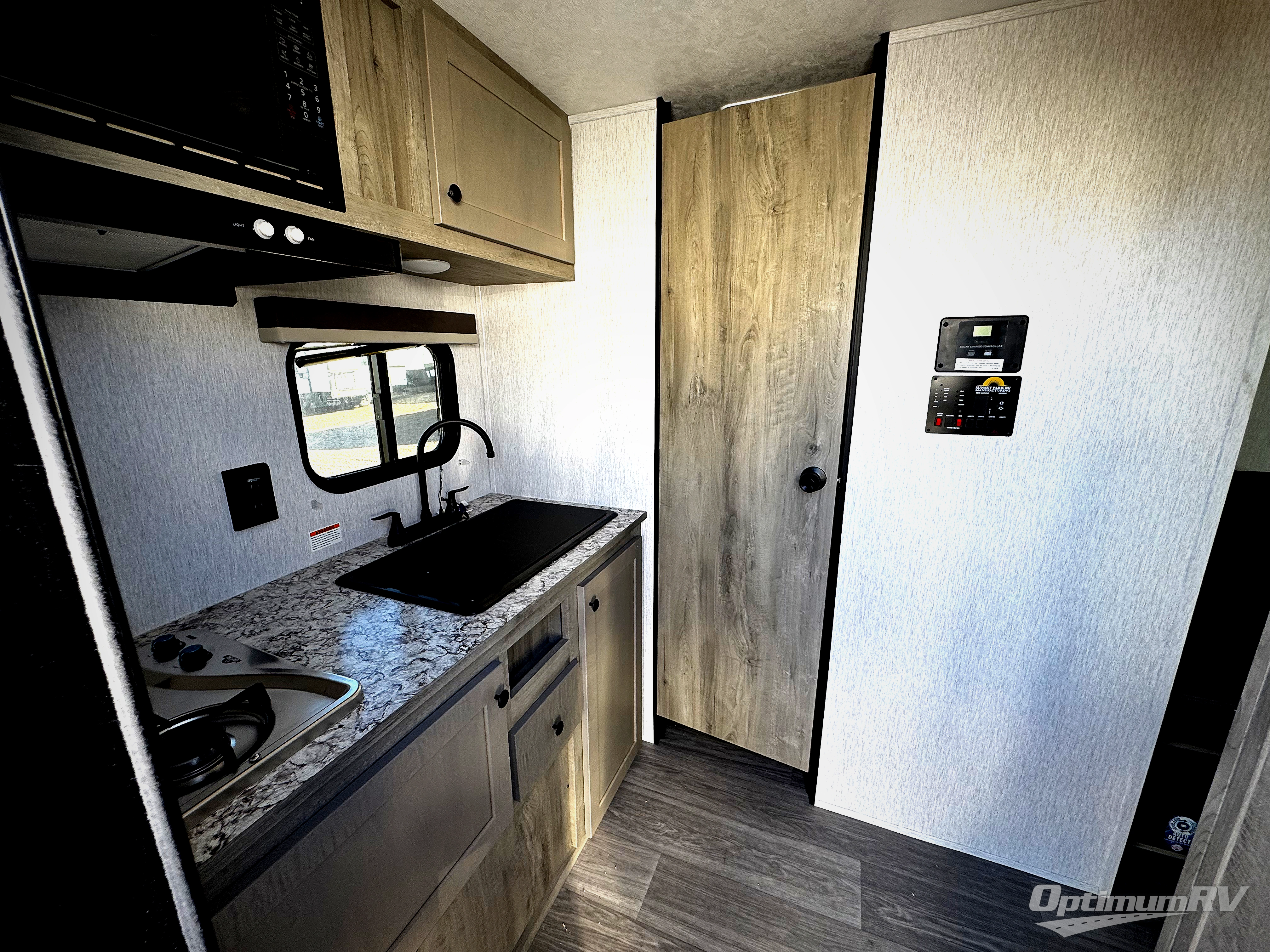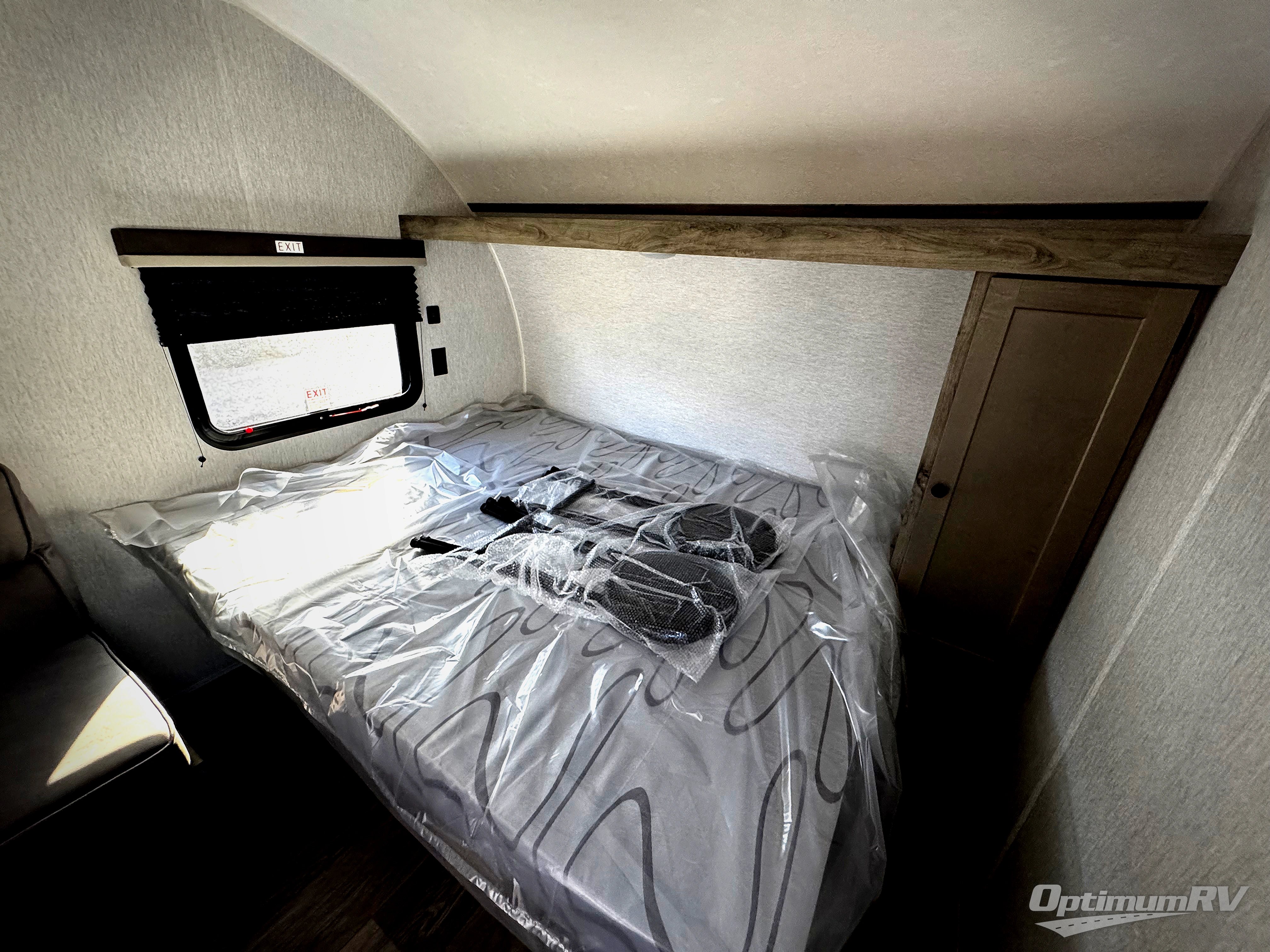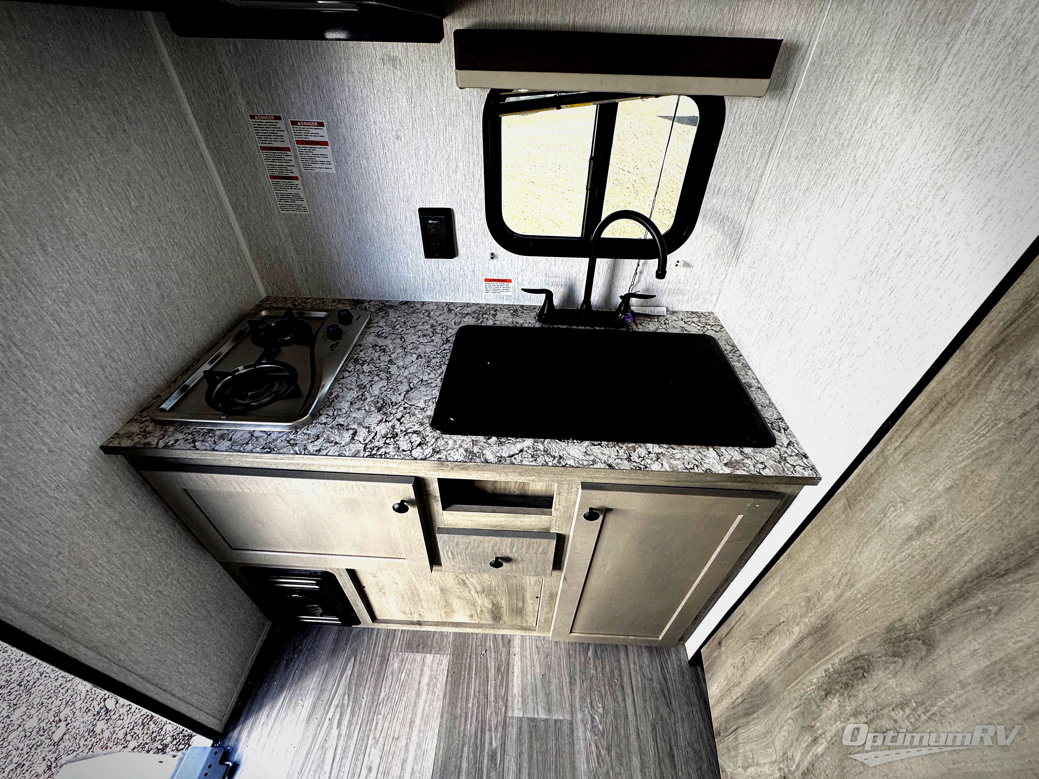 You're going to love every minute spent in this cozy travel trailer for three happy campers! The rear corner kitchen includes a two burner stove and double sink for easy clean up, and the full bath is in the other rear corner. This model also includes a 4.3 cu. ft. 12V refrigerator and a bar top where you can enjoy your meals together each day. The 68" jiffy sofa provides a place to relax in the evenings, and an overnight guests can make their bed here at night. You will find the RV queen bed to be accommodating, especially with its shelf for your personal belongings and a closet for clothes!