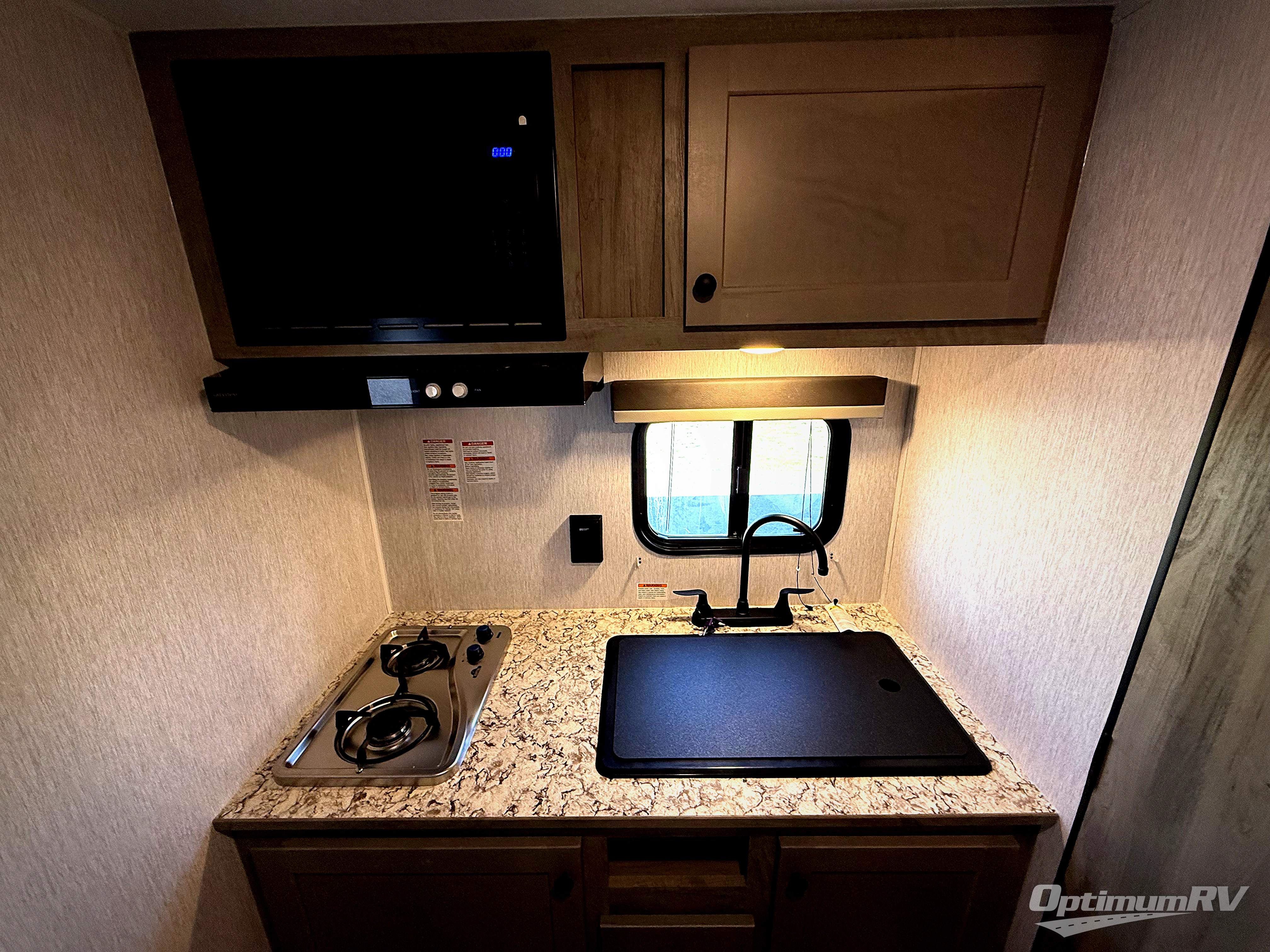 You're going to love every minute spent in this cozy travel trailer for three happy campers! The rear corner kitchen includes a two burner stove and double sink for easy clean up, and the full bath is in the other rear corner. This model also includes a 4.3 cu. ft. 12V refrigerator and a bar top where you can enjoy your meals together each day. The 68" jiffy sofa provides a place to relax in the evenings, and an overnight guests can make their bed here at night. You will find the RV queen bed to be accommodating, especially with its shelf for your personal belongings and a closet for clothes!