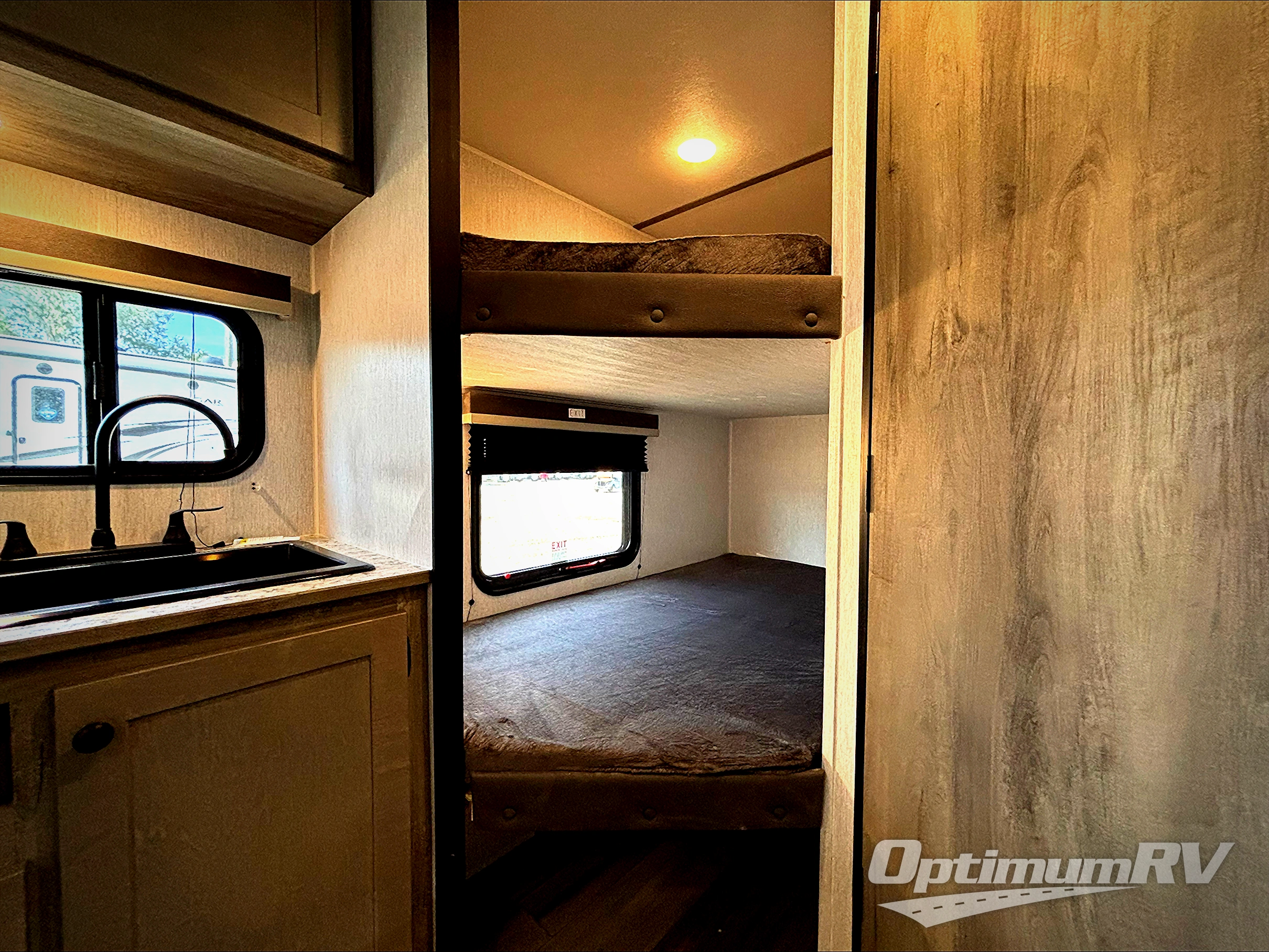 The perfect family-friendly travel trailer is found with this Sun Lite LTD model. You can take the front bed each night, while your guests or little ones take the double-size bunks towards the back. And if you're not needing the additional sleeping space, you can choose the desk option in place of the bunks. There is also a full bath right next to the bunks for easy nighttime use. The chef of your group can make meals using the three burner cooktop, and there is a double bowl sink for easy clean up. Once dinner has been cleaned up, you can play a game at the booth dinette, or head outdoors for an evening walk around the campground!