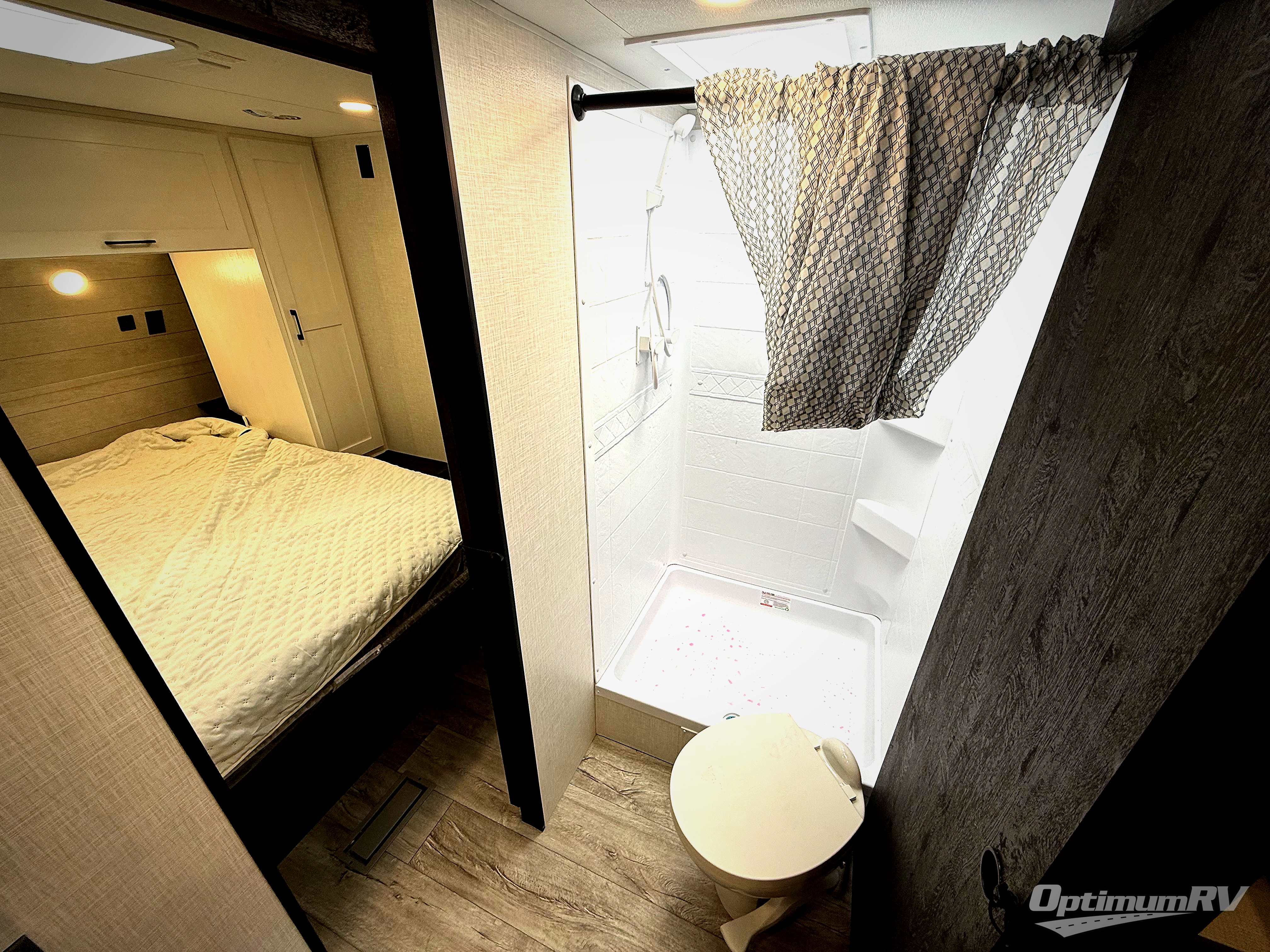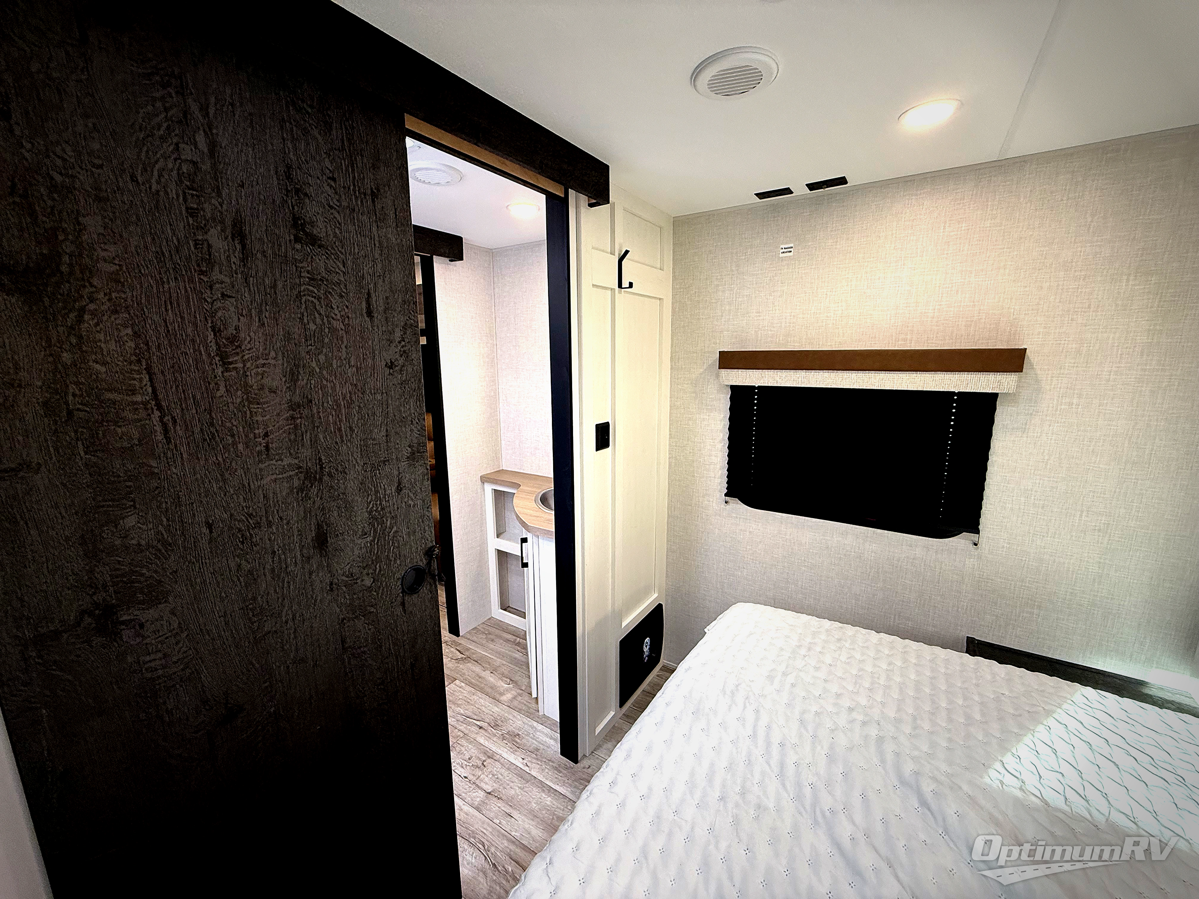 You'll love every minute spent in this dual entry travel trailer. The front master bedroom includes one of these doors, along with a Sleep Tight queen bed, dual wardrobes, and easy access into the walk-thru bath. Your crew can relax on the theater seating within the large slide out, play a game at the Sit N' Slide table with flipside reversible cushions, or dine at the bartop with stools. There is also a rear kitchen with ample counter space. Head outdoors to enjoy the 20' power awning in your camp chairs!