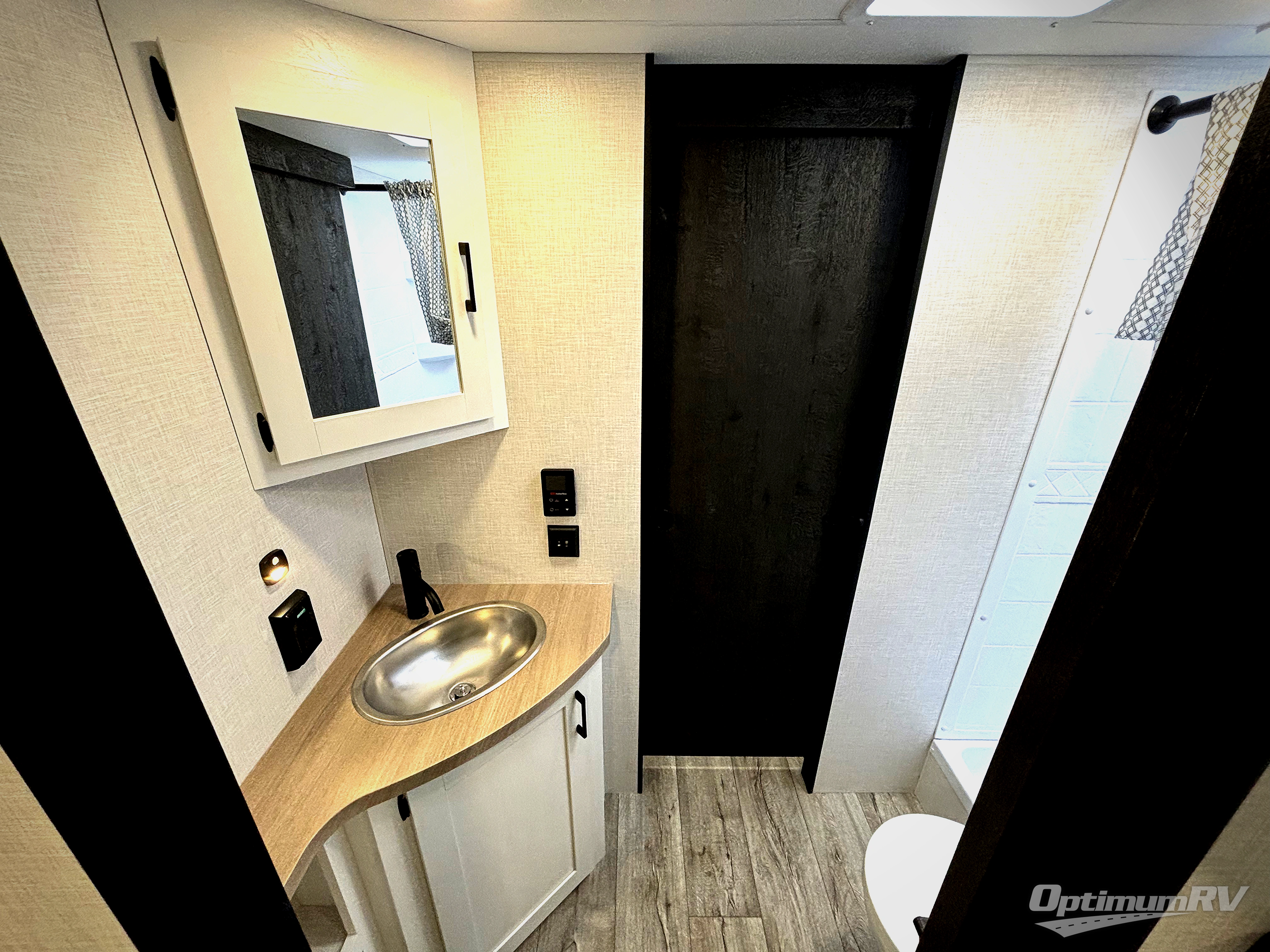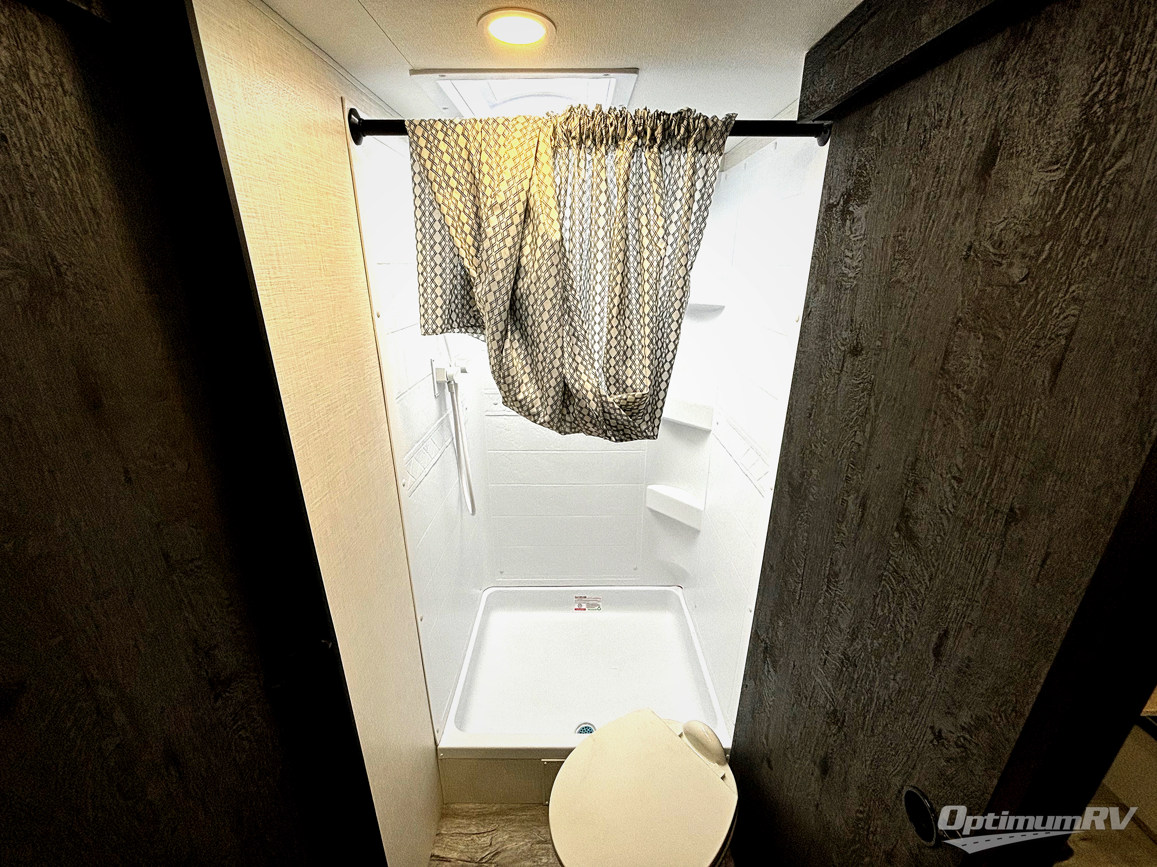 You'll love every minute spent in this dual entry travel trailer. The front master bedroom includes one of these doors, along with a Sleep Tight queen bed, dual wardrobes, and easy access into the walk-thru bath. Your crew can relax on the theater seating within the large slide out, play a game at the Sit N' Slide table with flipside reversible cushions, or dine at the bartop with stools. There is also a rear kitchen with ample counter space. Head outdoors to enjoy the 20' power awning in your camp chairs!