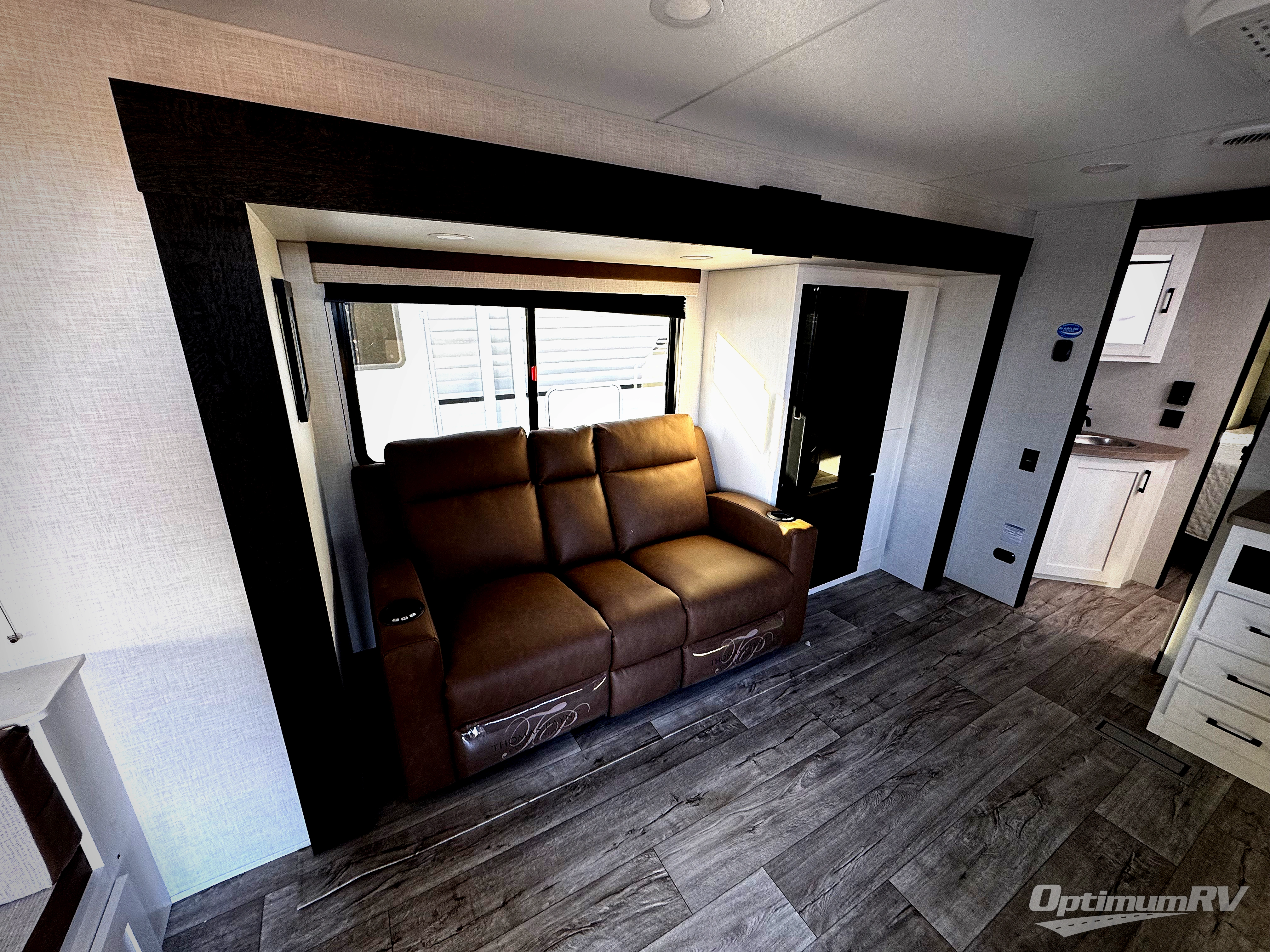 This fantastic trailer is packed with features that will make your travels comfortable, convenient, and unforgettable. In its luxurious interior you will find the U-shaped dinette perfect for meals or socializing, while the 70” sofa provides ample space for relaxation. The fireplace adds a cozy touch, creating a warm and inviting atmosphere. For the entertainment and leisure, the 40” TV is perfect for family movie nights or enjoying your favorite shows on the go. The entertainment system is designed to keep you entertained and relaxed. Moving to the kitchen area, the three-burner cooktop and pantry provide everything you need to prepare delicious meals on the go and the 12V refrigerator keeps your food and drinks fresh, ensuring you have everything you need for a comfortable trip. Convenience is found in the amazing walk-through bath offering easy access while the front bedroom is a serene retreat featuring a spacious queen bed, overhead cabinets, and wardrobes. Additional features like the two entry/exit doors provide added flexibility and ease of use, while the exterior awning furnish shade and protection from the elements.