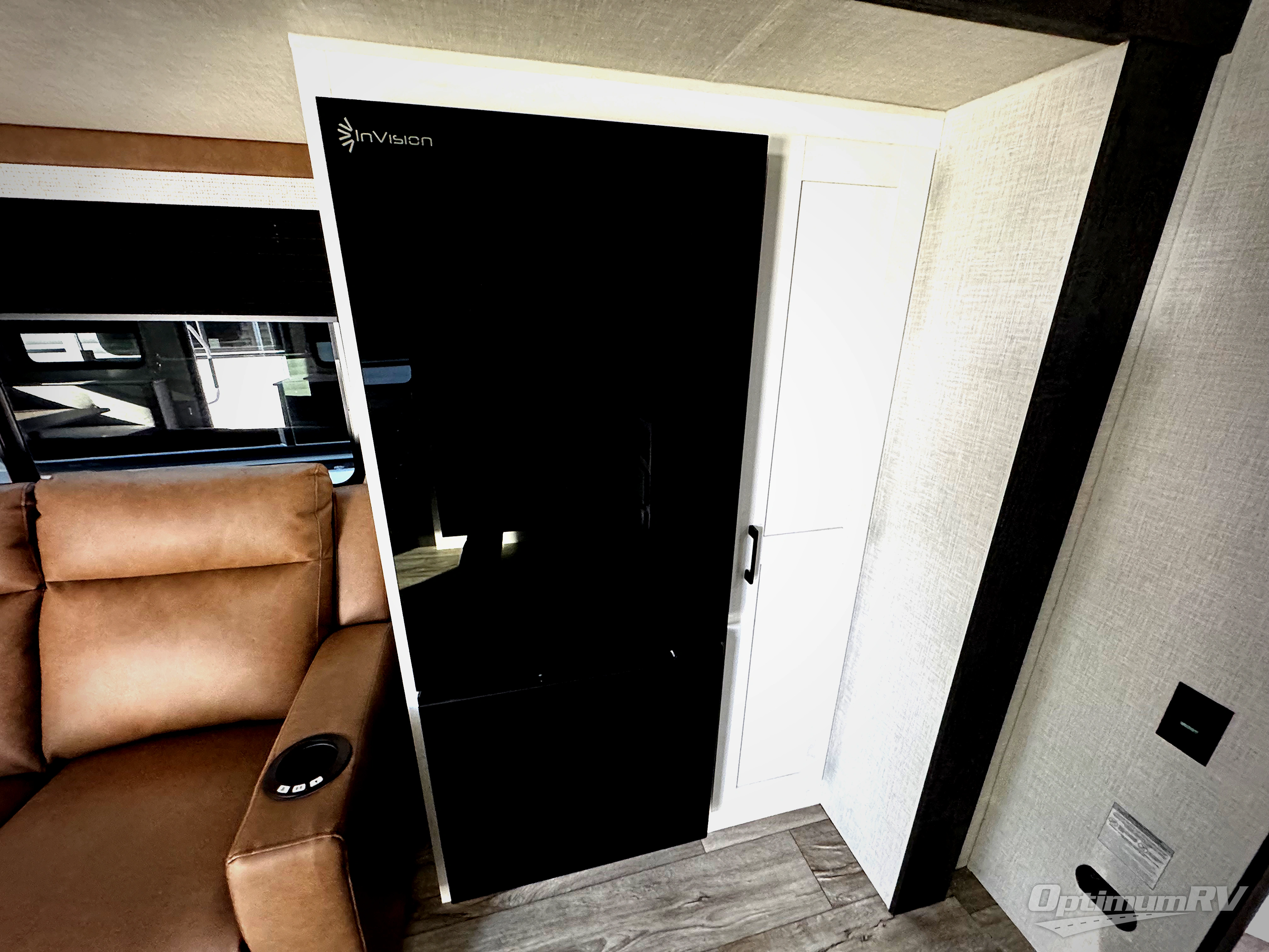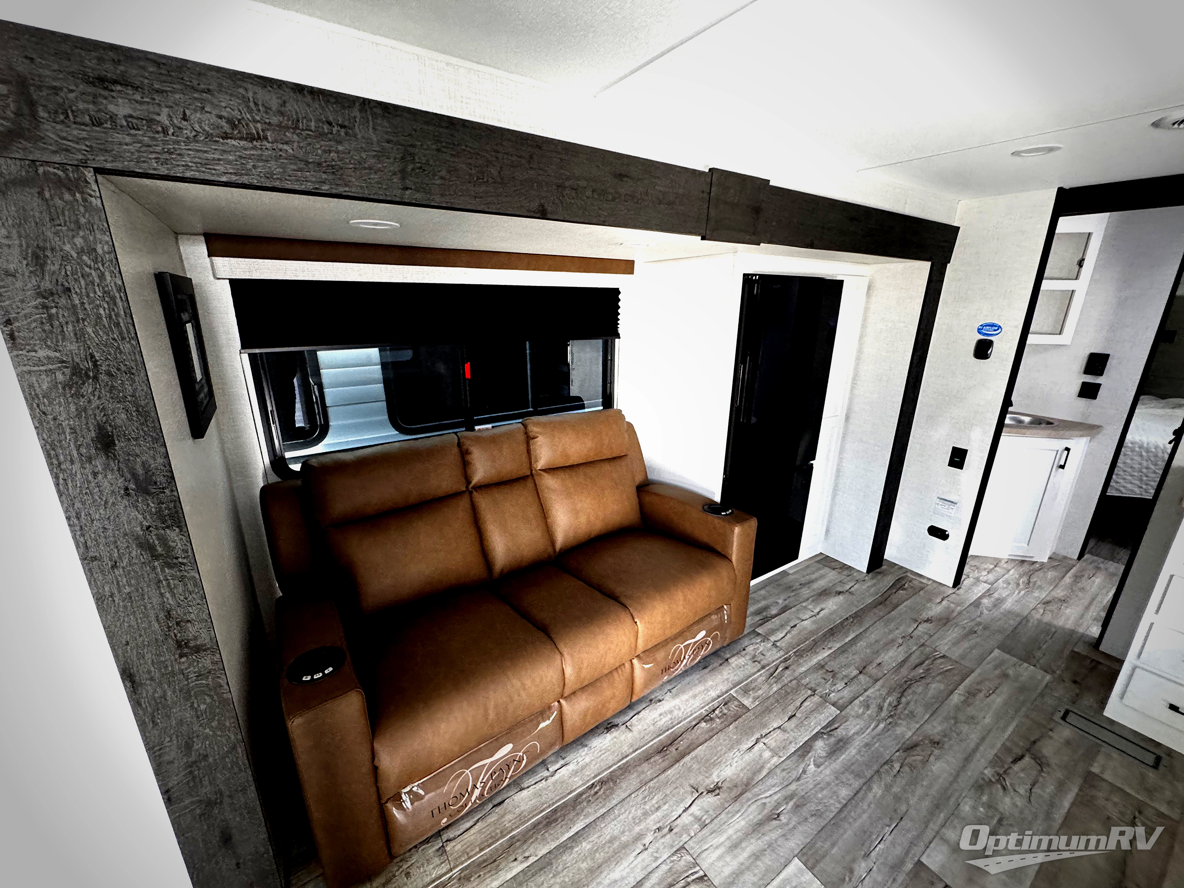 This fantastic trailer is packed with features that will make your travels comfortable, convenient, and unforgettable. In its luxurious interior you will find the U-shaped dinette perfect for meals or socializing, while the 70” sofa provides ample space for relaxation. The fireplace adds a cozy touch, creating a warm and inviting atmosphere. For the entertainment and leisure, the 40” TV is perfect for family movie nights or enjoying your favorite shows on the go. The entertainment system is designed to keep you entertained and relaxed. Moving to the kitchen area, the three-burner cooktop and pantry provide everything you need to prepare delicious meals on the go and the 12V refrigerator keeps your food and drinks fresh, ensuring you have everything you need for a comfortable trip. Convenience is found in the amazing walk-through bath offering easy access while the front bedroom is a serene retreat featuring a spacious queen bed, overhead cabinets, and wardrobes. Additional features like the two entry/exit doors provide added flexibility and ease of use, while the exterior awning furnish shade and protection from the elements.