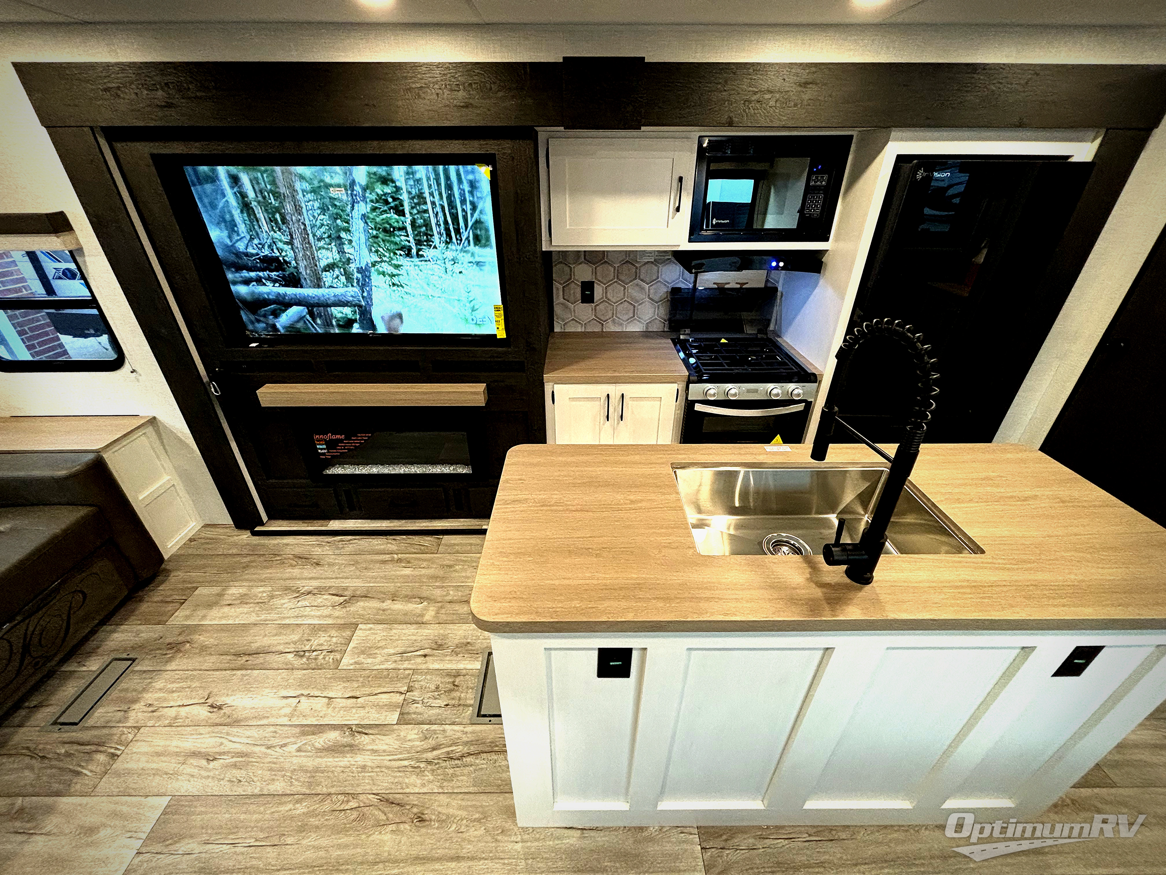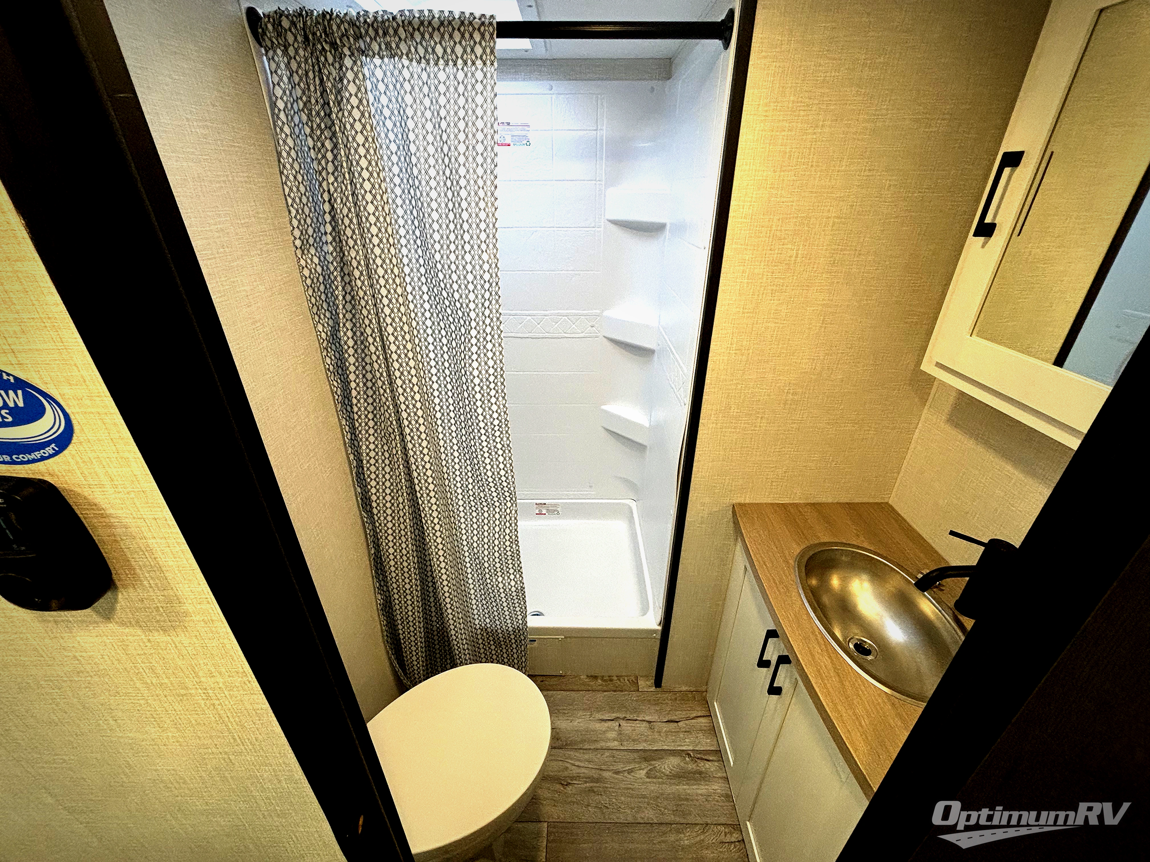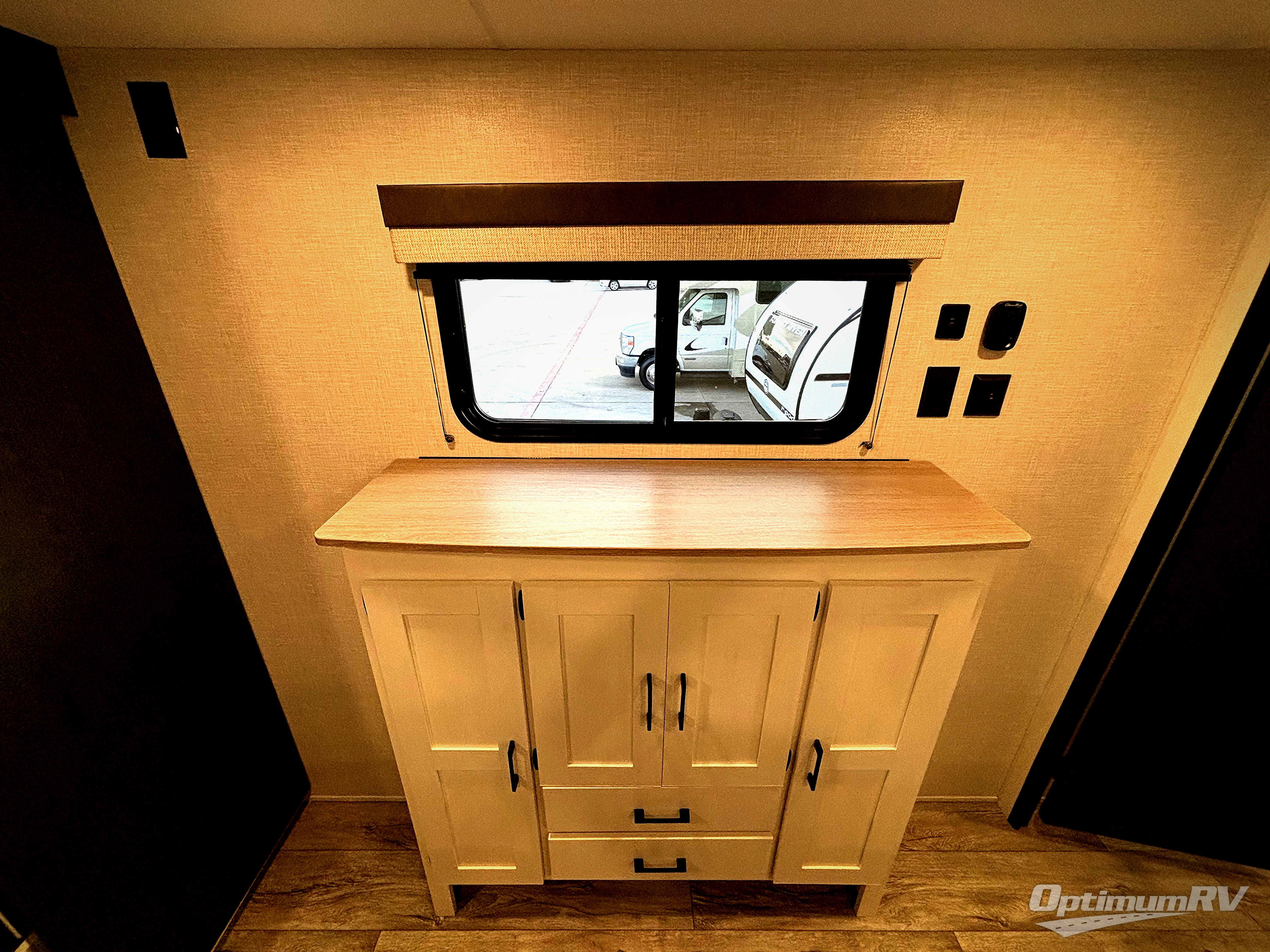 This travel trailer will feel just like home thanks to its spacious interior, large front private bedroom, and kitchen island. There are plenty of places to seating space, including a rear 70" sofa plus theater seating and a Sit N' Slide table within one of the slides. The opposing slide here includes the entertainment center and some of the kitchen appliances. You will also appreciate two pantries, one with washer and dryer prep if you want to add those appliances. A full bath lets you stay clean throughout your trip without having to use the campground's facilities, and the front bedroom is sure to make you feel at home. There is a Sleep Tight queen bed slide, a large front closet, plus a dresser and a second closet for ample storage space!
