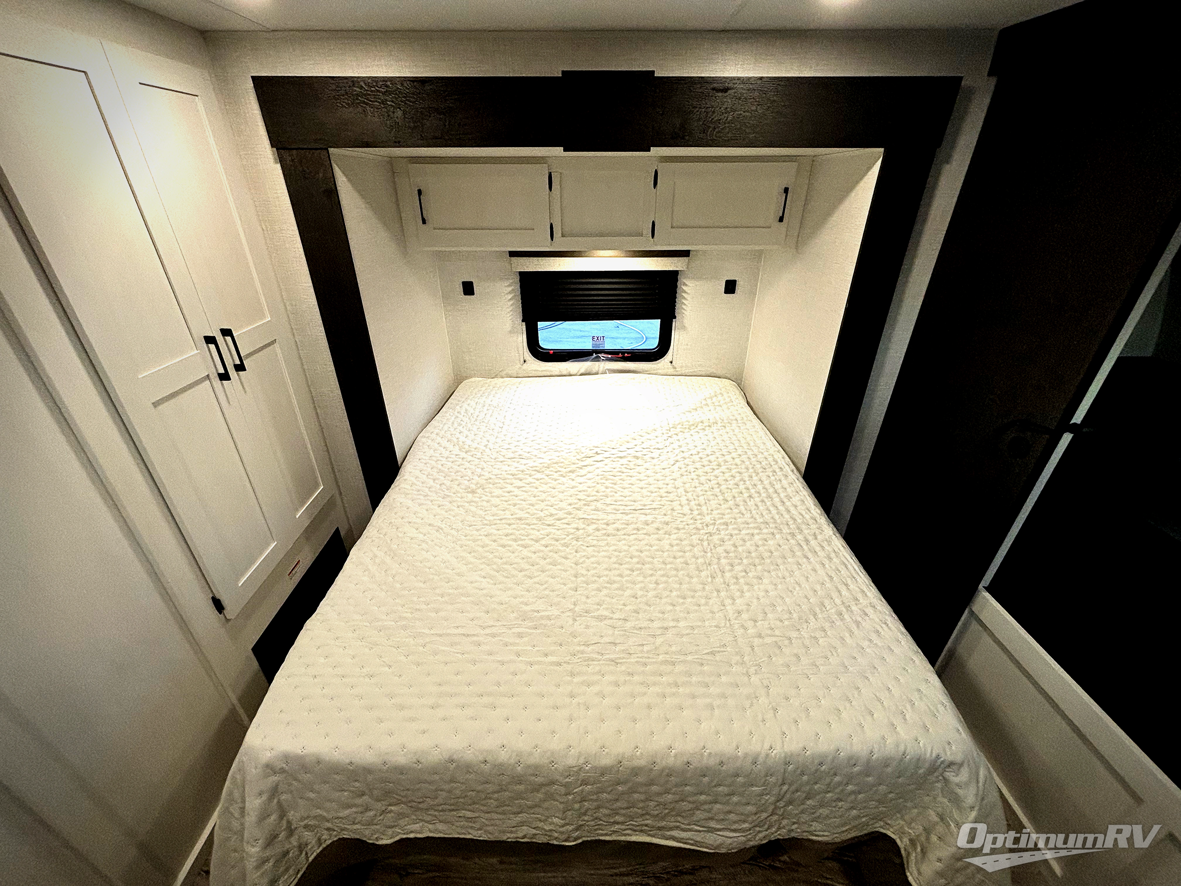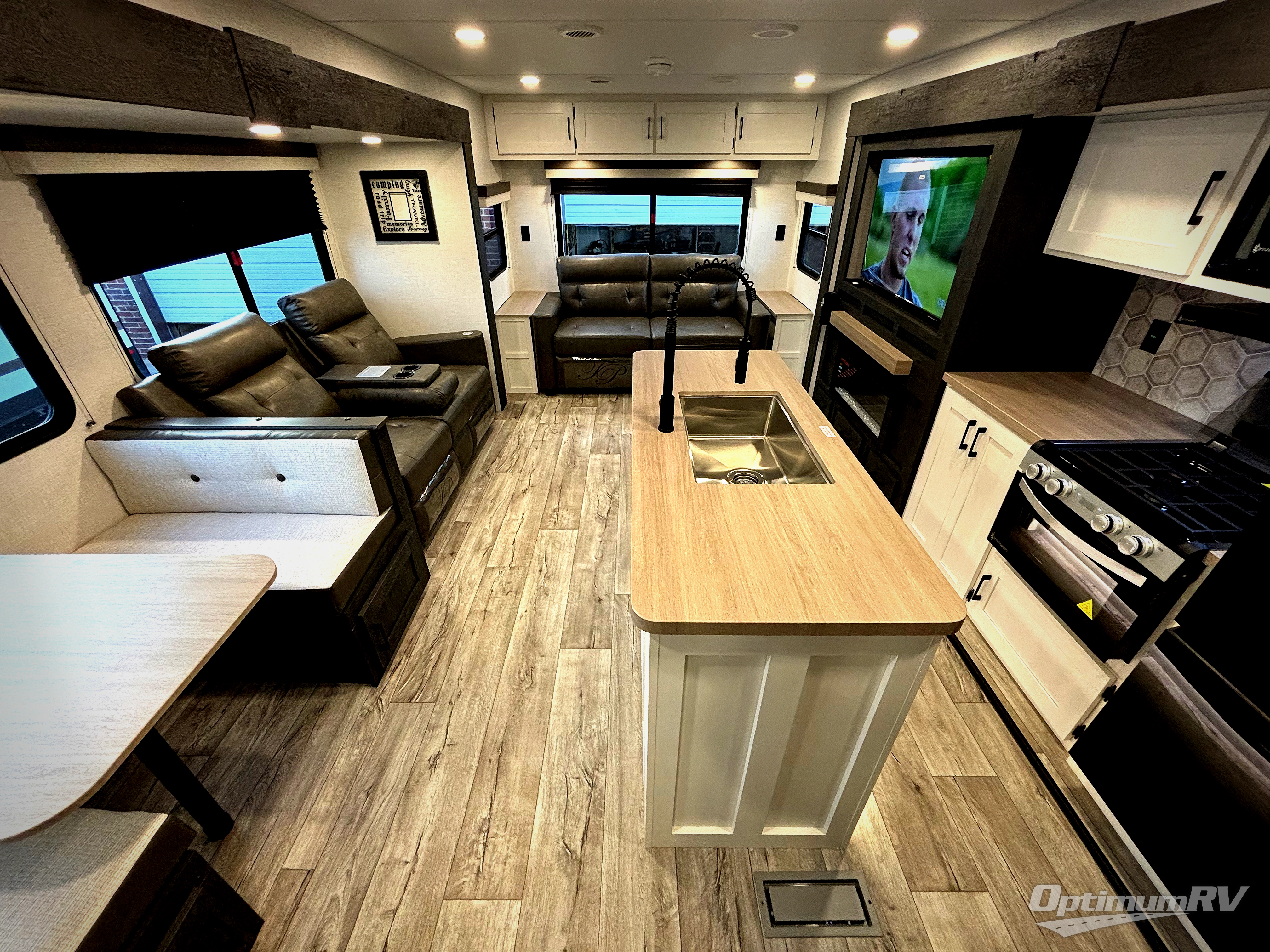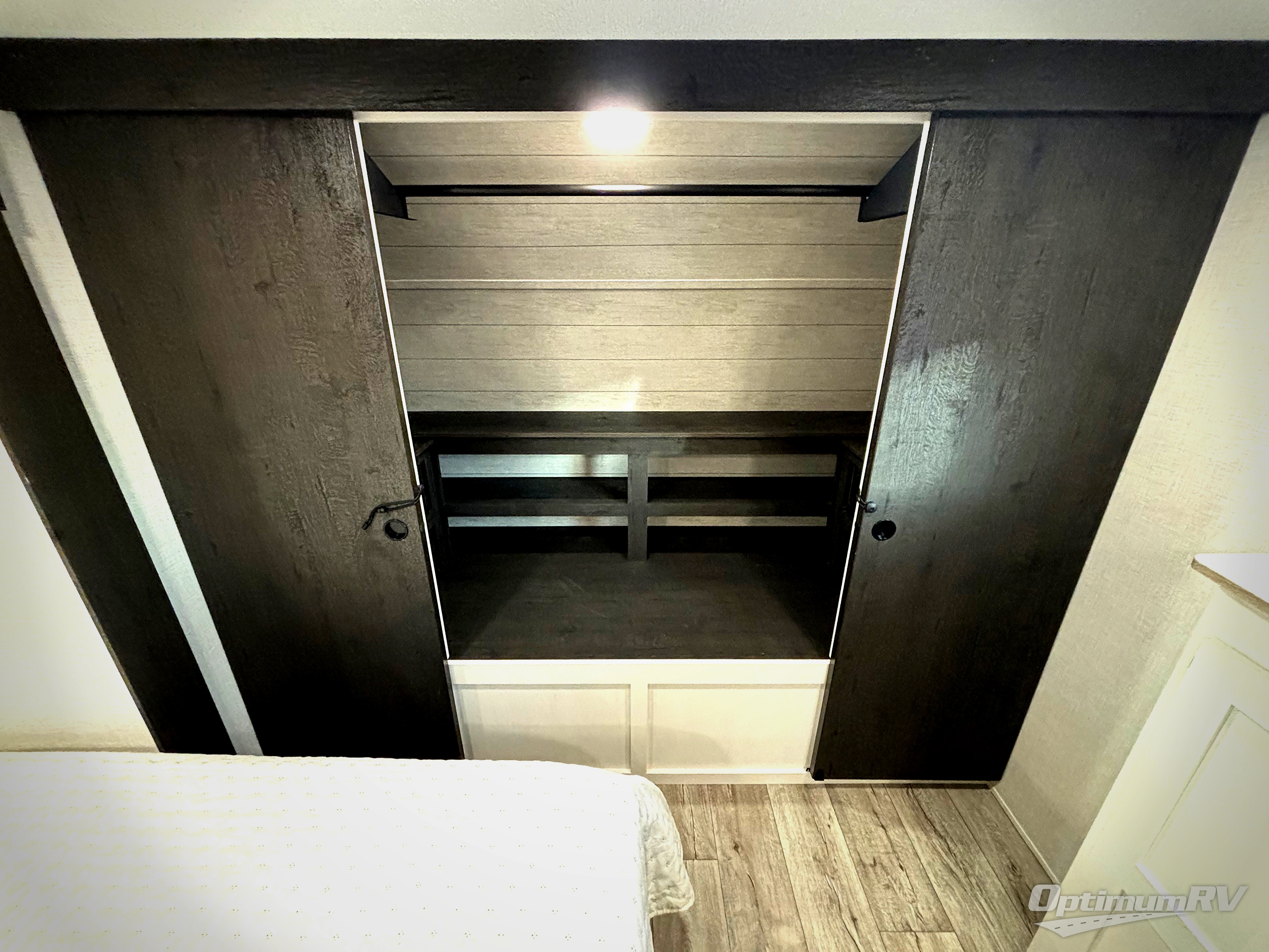 This travel trailer will feel just like home thanks to its spacious interior, large front private bedroom, and kitchen island. There are plenty of places to seating space, including a rear 70" sofa plus theater seating and a Sit N' Slide table within one of the slides. The opposing slide here includes the entertainment center and some of the kitchen appliances. You will also appreciate two pantries, one with washer and dryer prep if you want to add those appliances. A full bath lets you stay clean throughout your trip without having to use the campground's facilities, and the front bedroom is sure to make you feel at home. There is a Sleep Tight queen bed slide, a large front closet, plus a dresser and a second closet for ample storage space!