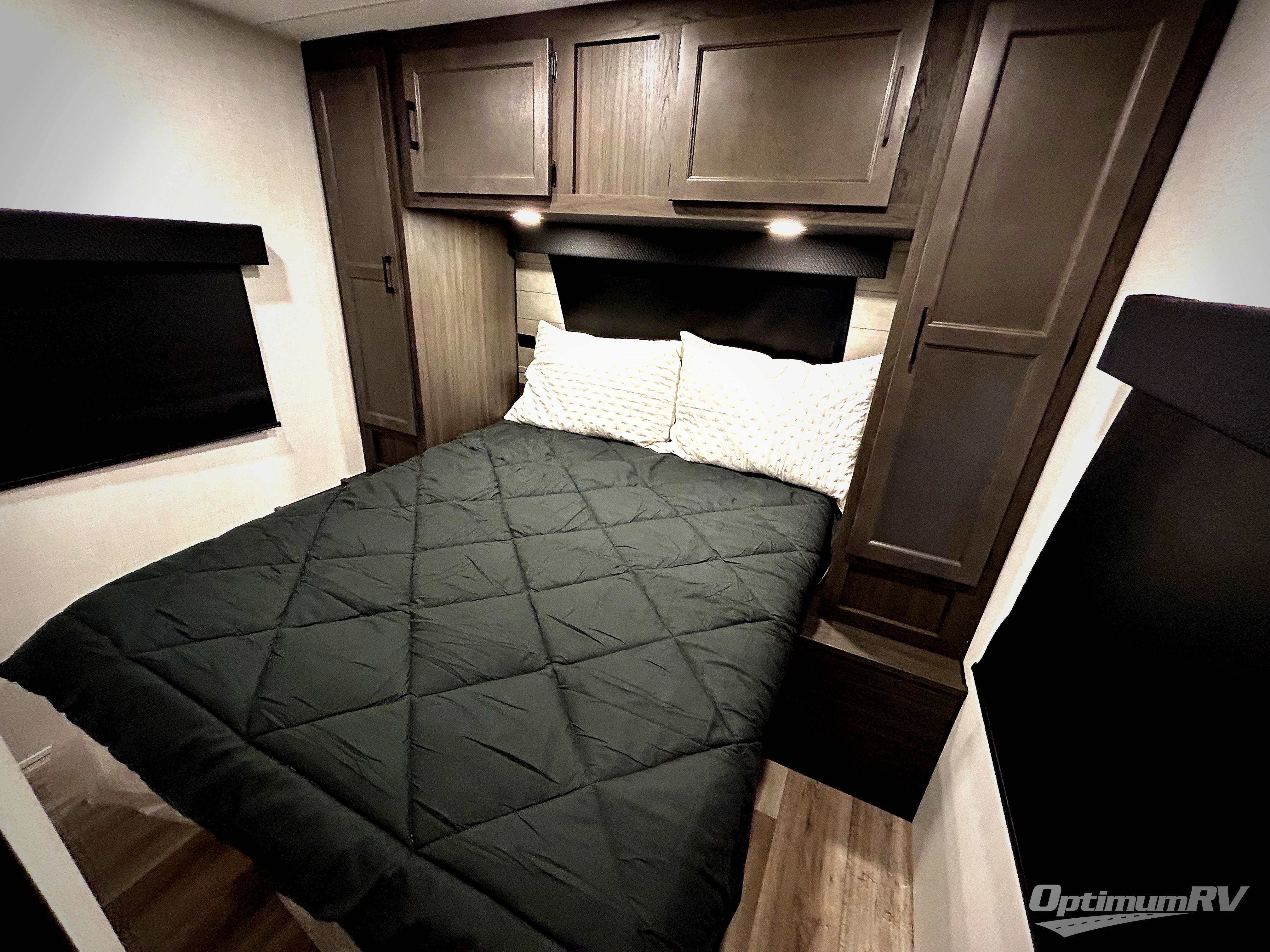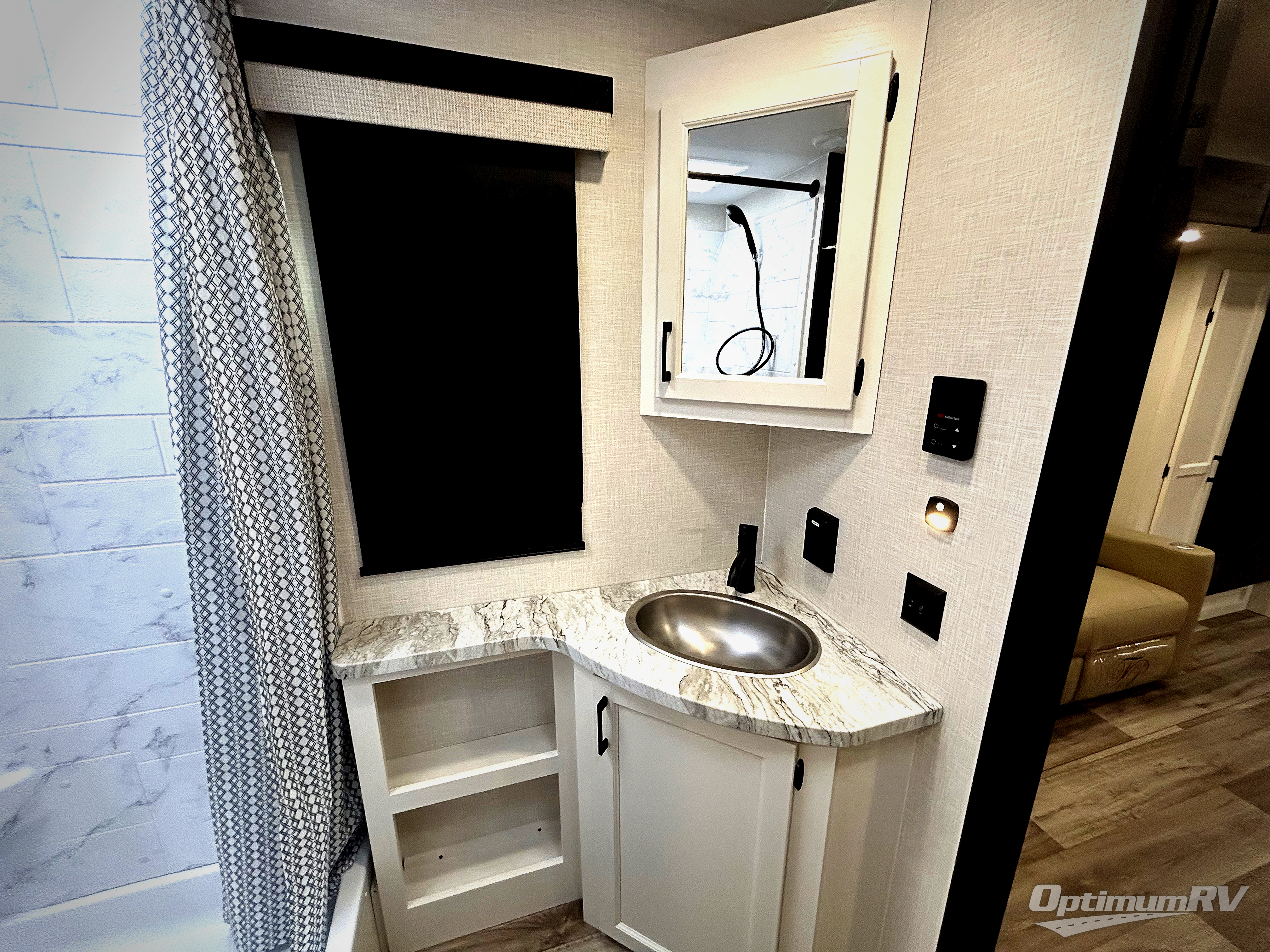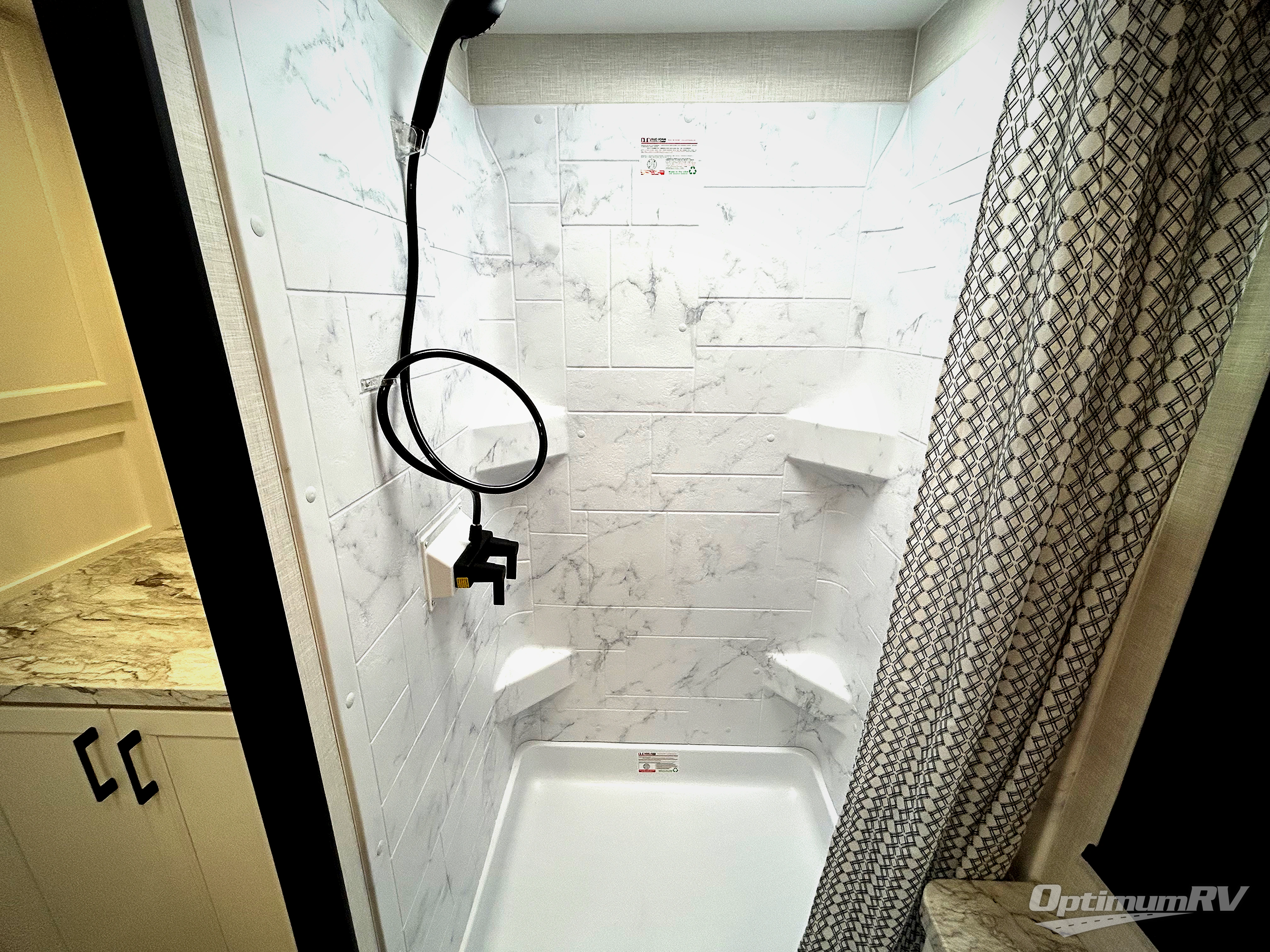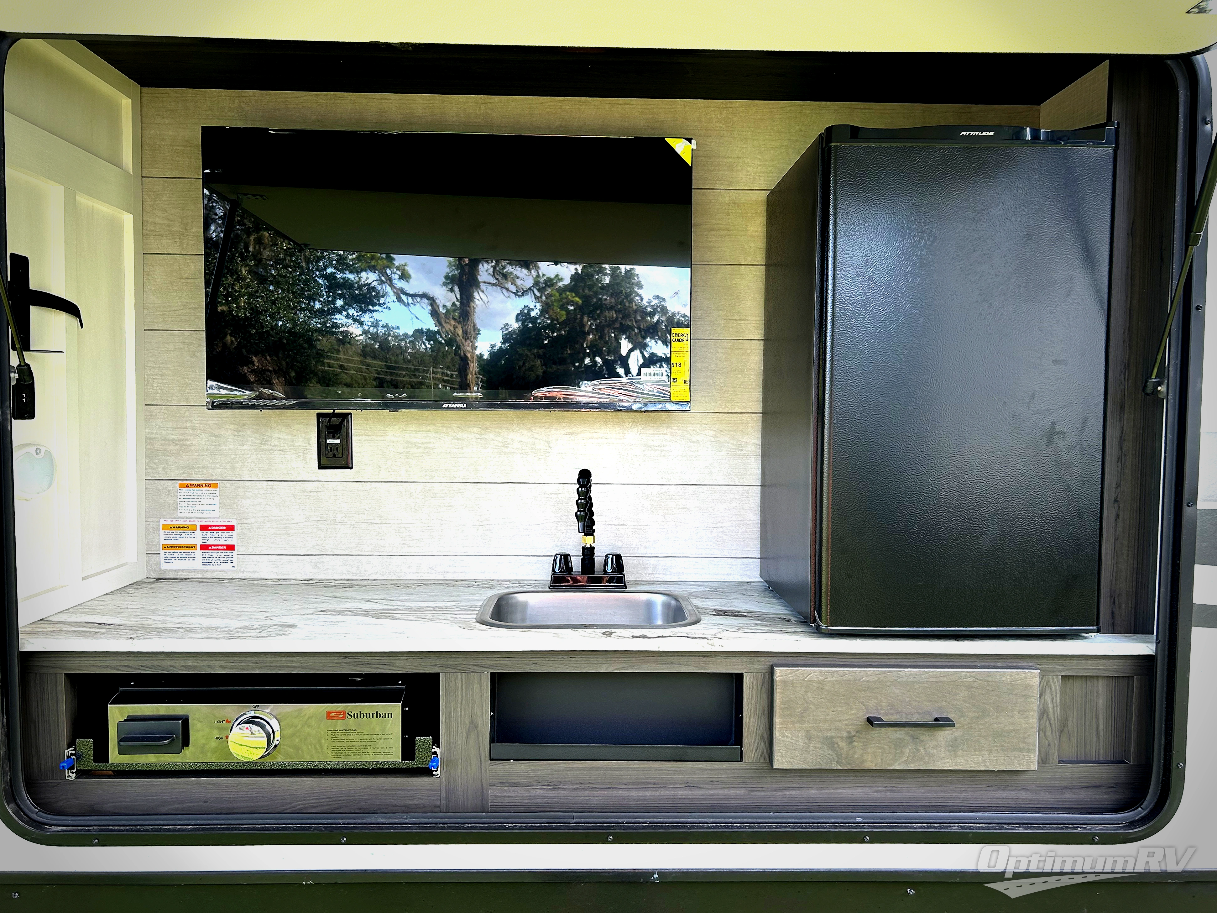 It won't be hard to find comfort in this travel trailer for three to four. Once you arrive at the campground, you can put out the 14' power awning, unload your camp chairs from the pass-thru storage, then start lunch on the exterior kitchen with a griddle. There is also an exterior 40" Smart TV to watch the big game outdoors! If the weather isn't cooperating, you can head inside to relax on the 70" sofa, or play a game at the Sit N' Slide table. You can also choose optional theater seats or a tri-fold sofa in place of the sofa if you prefer this seating arrangements. The kitchen includes appliances to make home-cooked meals, including a 27" oven with a air fryer. The Sleep Tight queen bed in the front private bedroom is sure to bring a great night's rest after you've played all day, and don't overlook the full rear bath, complete with an optional washer and dryer!
