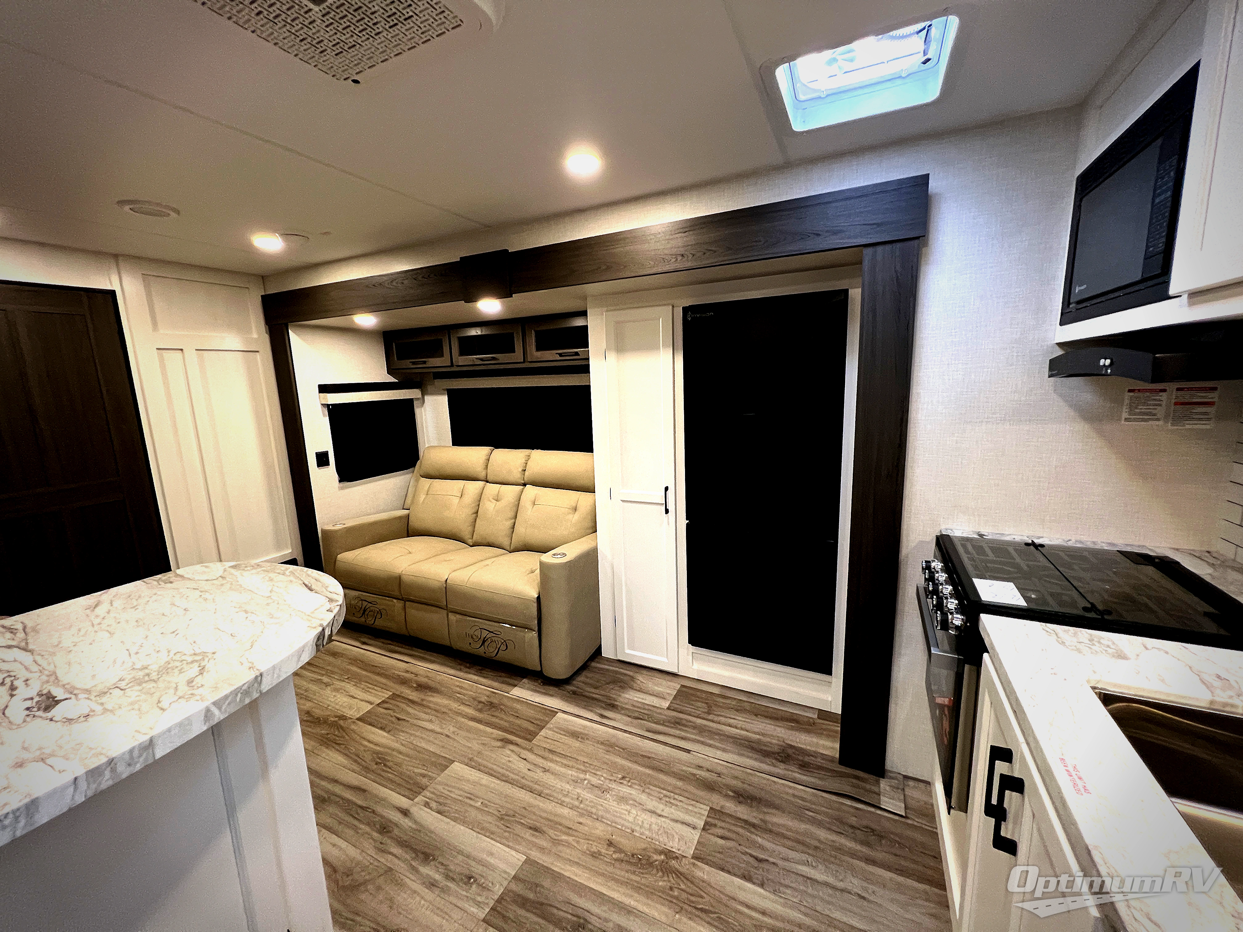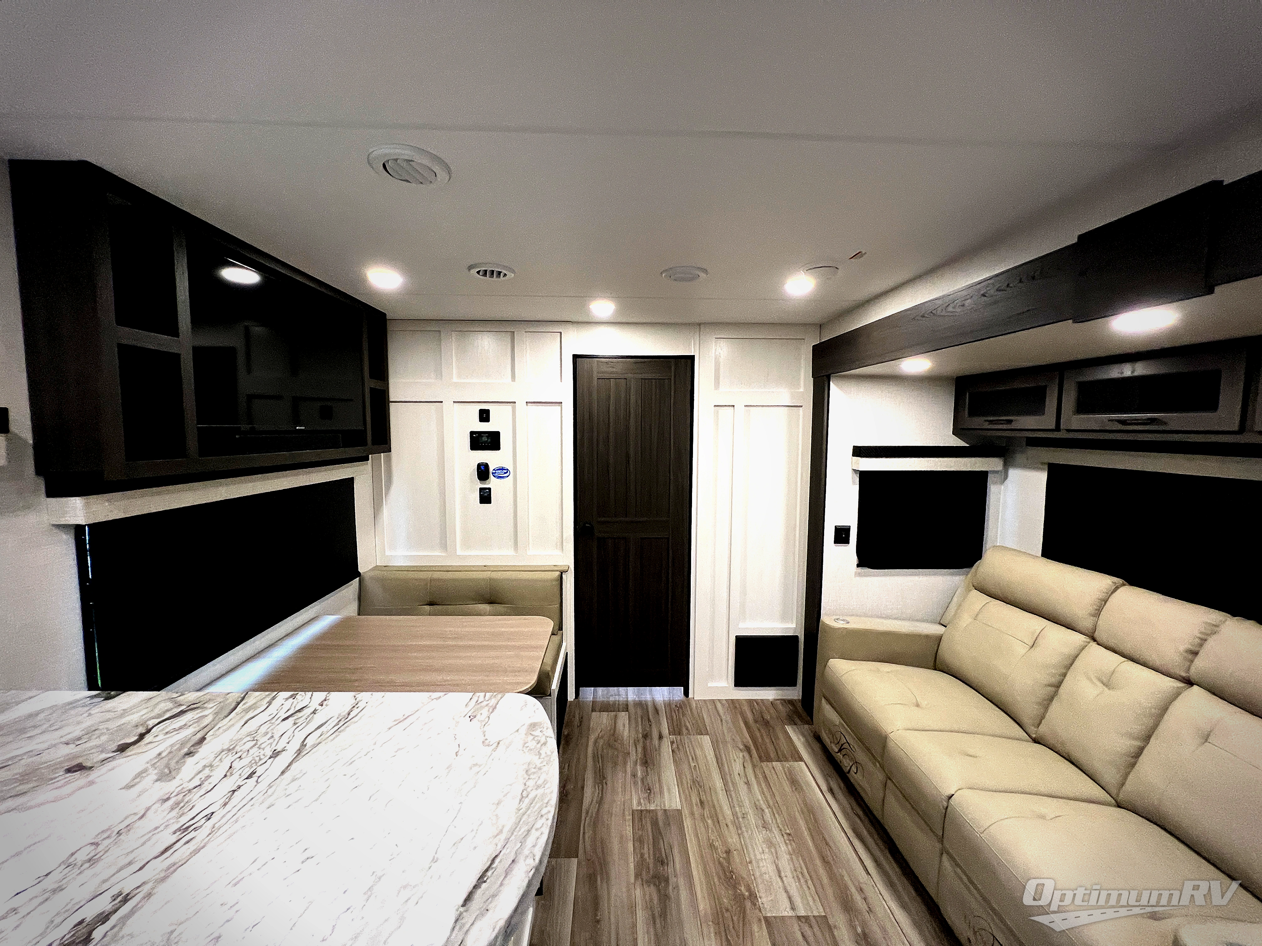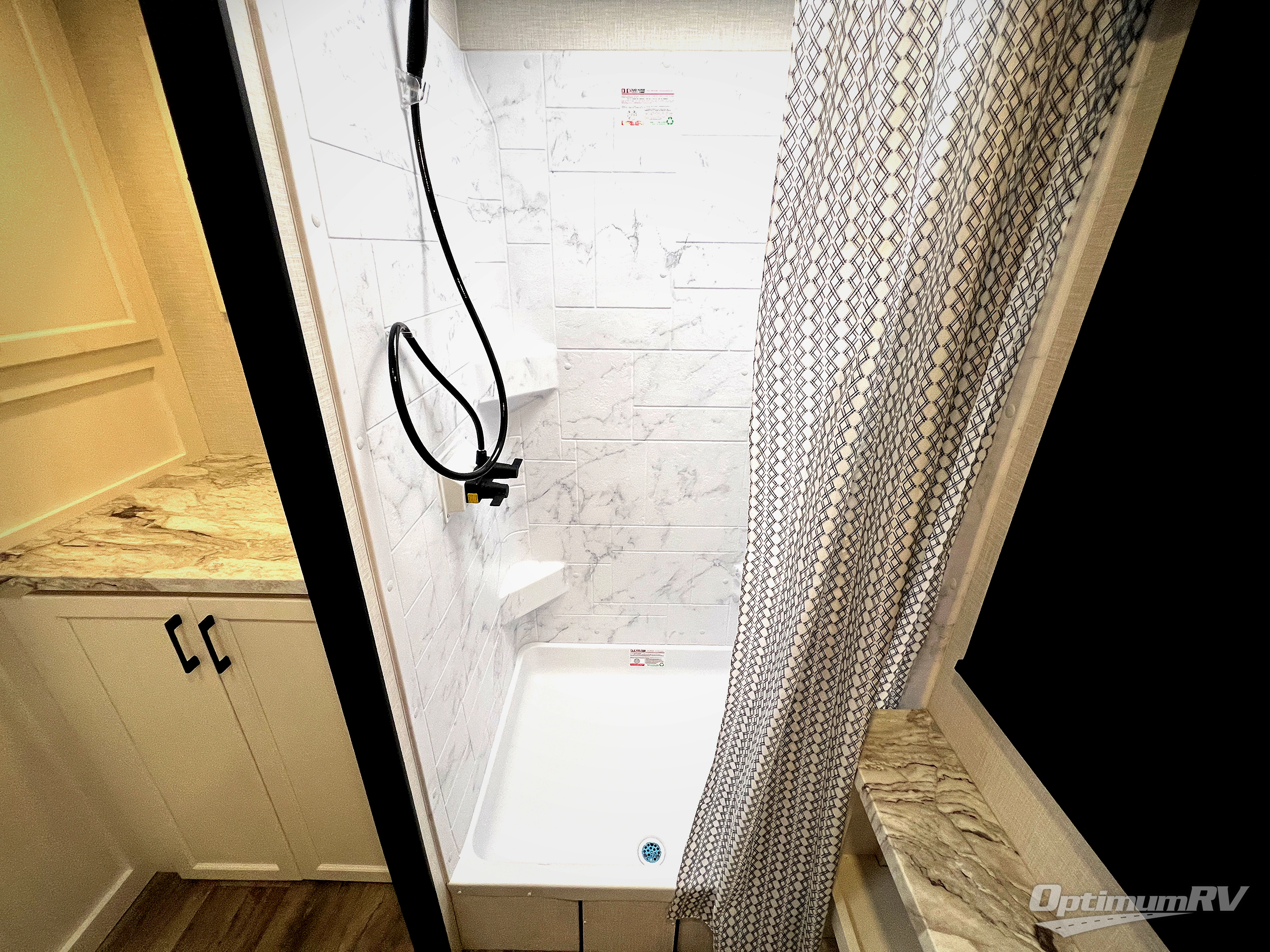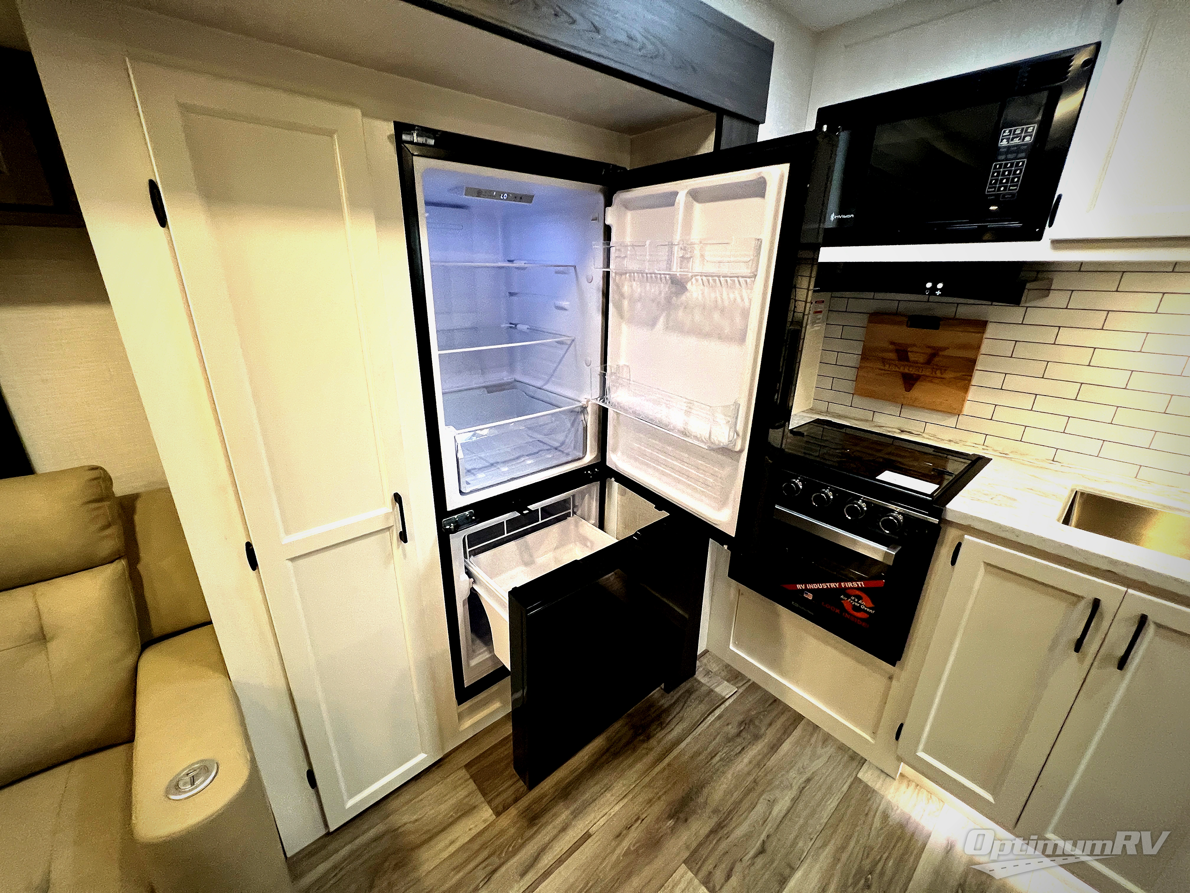 It won't be hard to find comfort in this travel trailer for three to four. Once you arrive at the campground, you can put out the 14' power awning, unload your camp chairs from the pass-thru storage, then start lunch on the exterior kitchen with a griddle. There is also an exterior 40" Smart TV to watch the big game outdoors! If the weather isn't cooperating, you can head inside to relax on the 70" sofa, or play a game at the Sit N' Slide table. You can also choose optional theater seats or a tri-fold sofa in place of the sofa if you prefer this seating arrangements. The kitchen includes appliances to make home-cooked meals, including a 27" oven with a air fryer. The Sleep Tight queen bed in the front private bedroom is sure to bring a great night's rest after you've played all day, and don't overlook the full rear bath, complete with an optional washer and dryer!