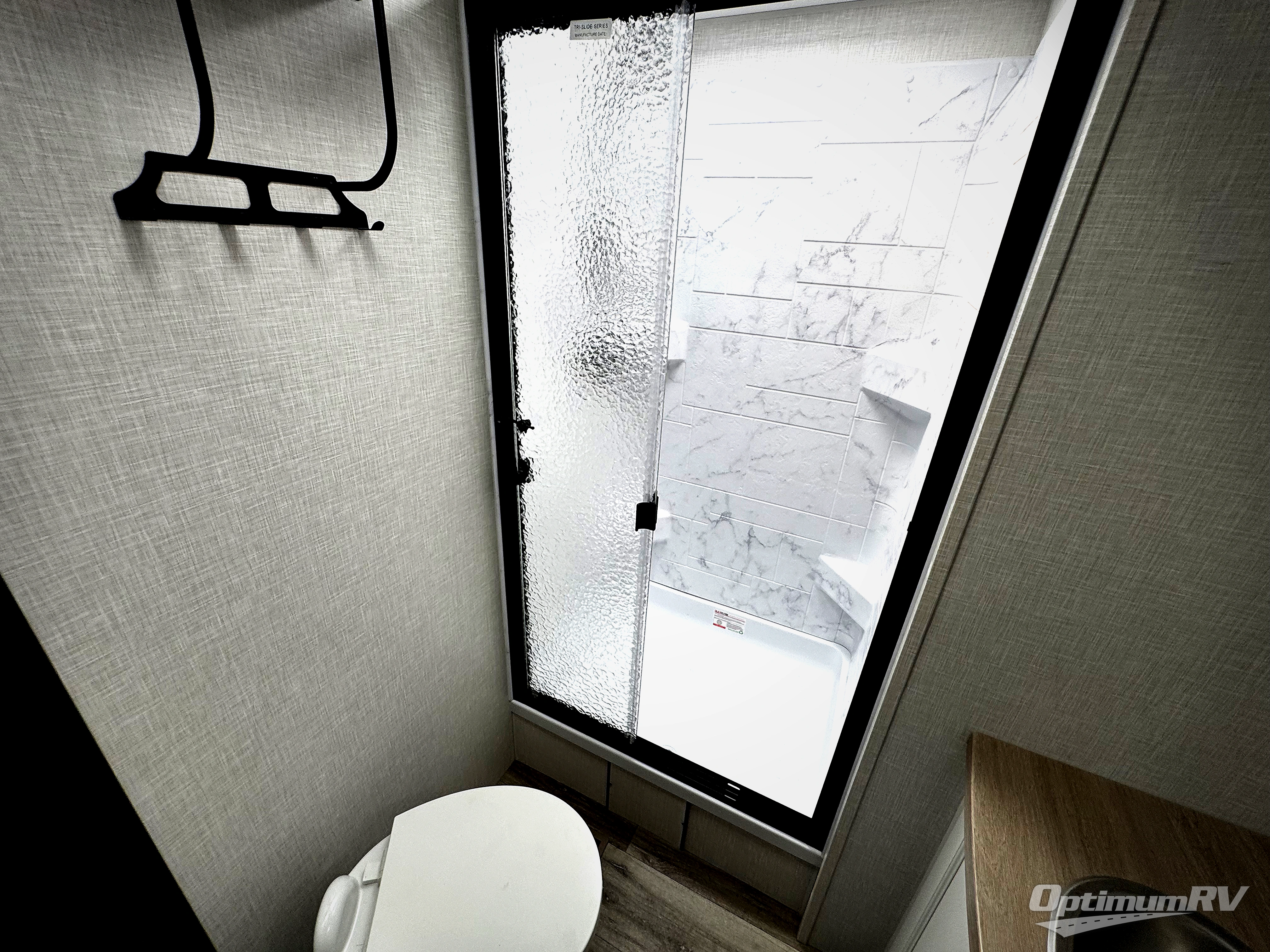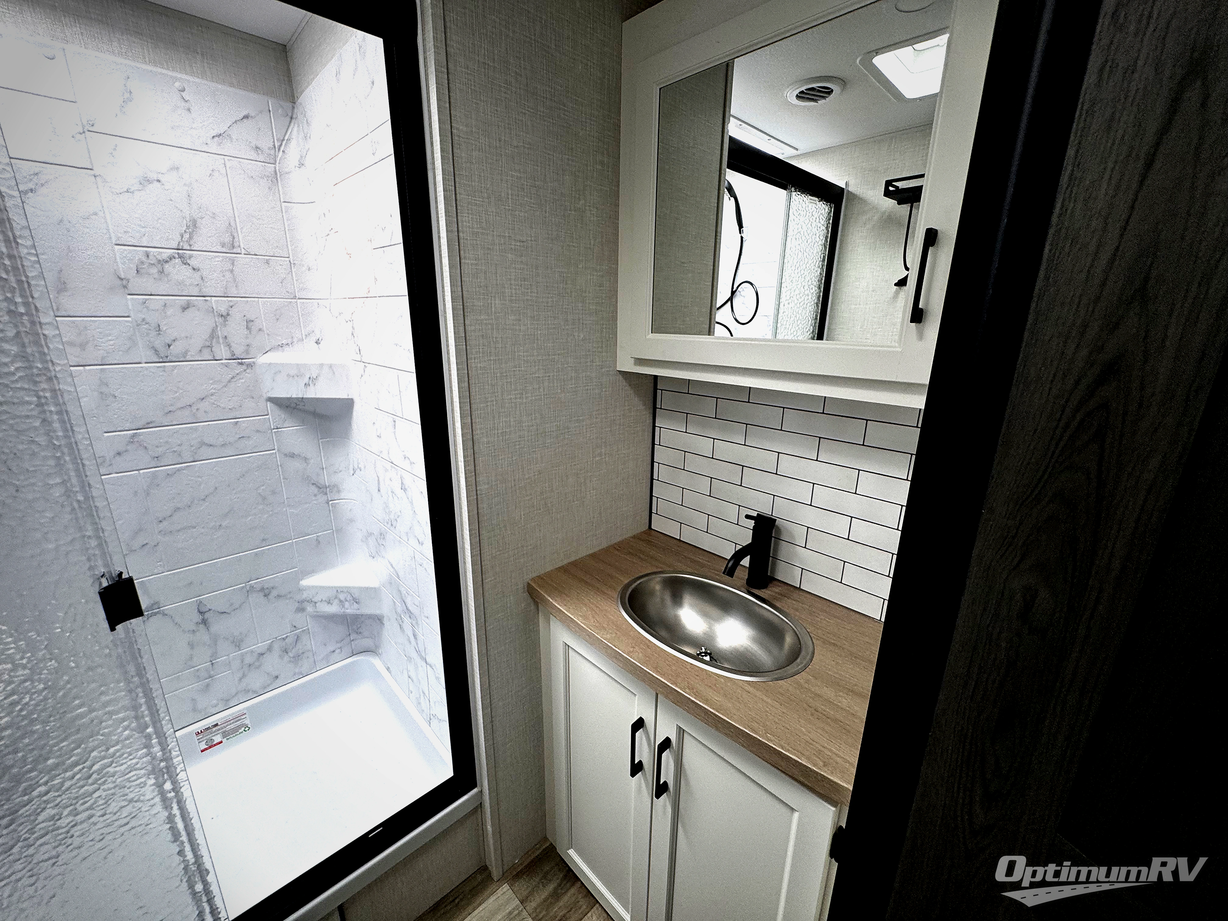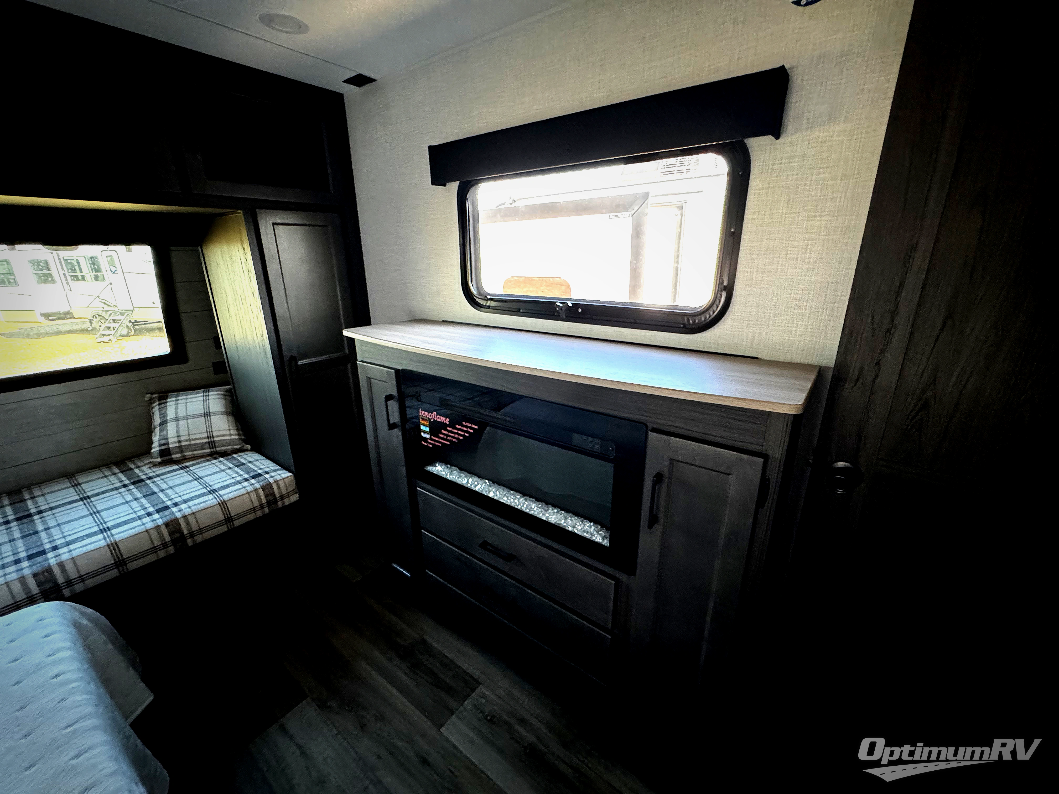 The chef will feel right at home cooking in the rear kitchen with all of the countertop space in this travel trailer! They can even head outside to breathe in some fresh air while cooking at the exterior campfire café with a refrigerator, a sink with countertop space, and a griddle. Relax each night in the middle living area with the 64" sofa and the slide that has theater seating with USB charging across from the entertainment center with a TV and 30" frameless fireplace. When you're ready to wind down your nights, take a hot shower in the full bathroom with the 30" x 36" shower then head to the front private bedroom and either read a book at the window seat or lay in the 70" x 80" sleep tight king bed slide while watching a movie with the TV or watch the 30" frameless fireplace!