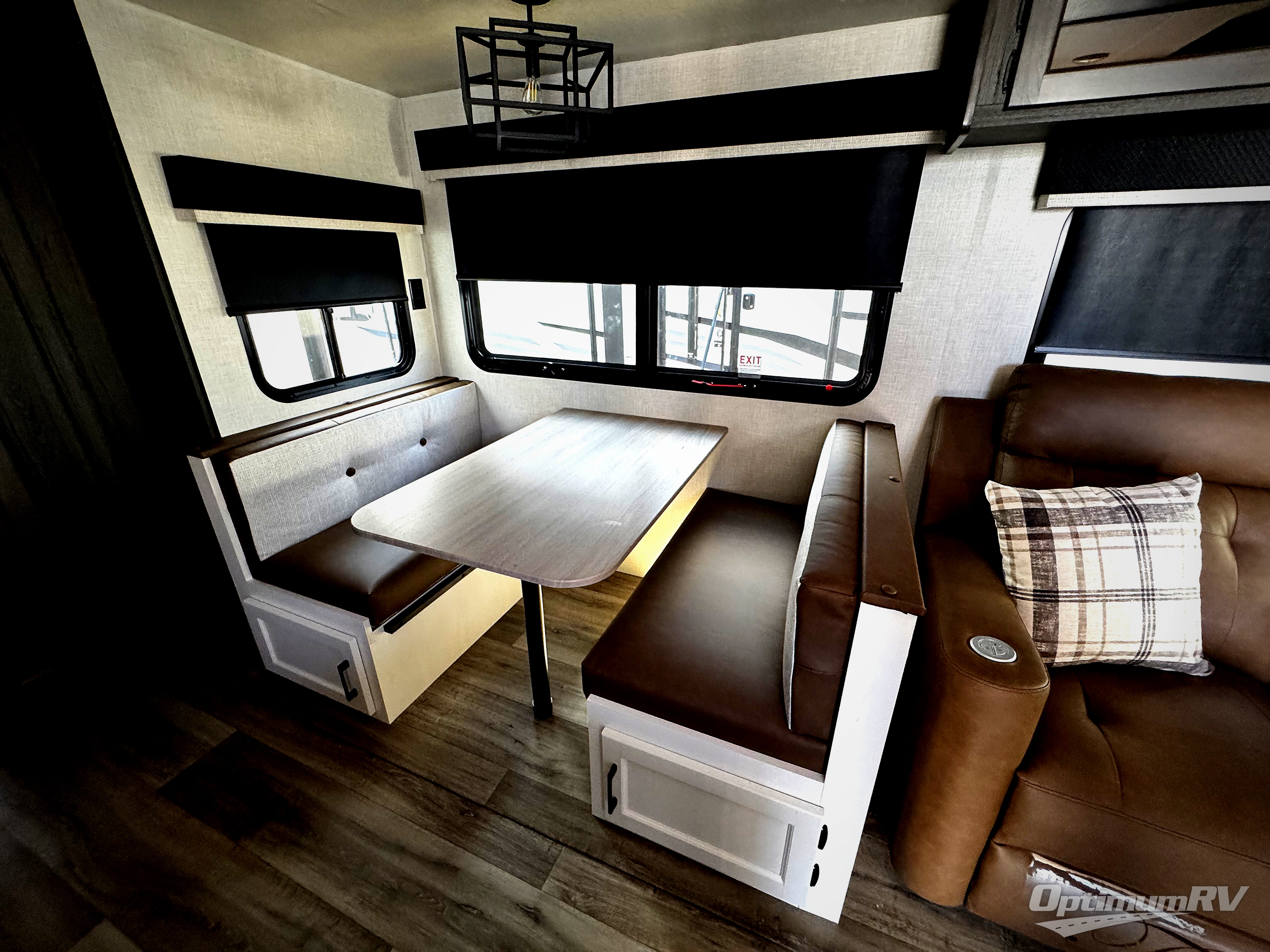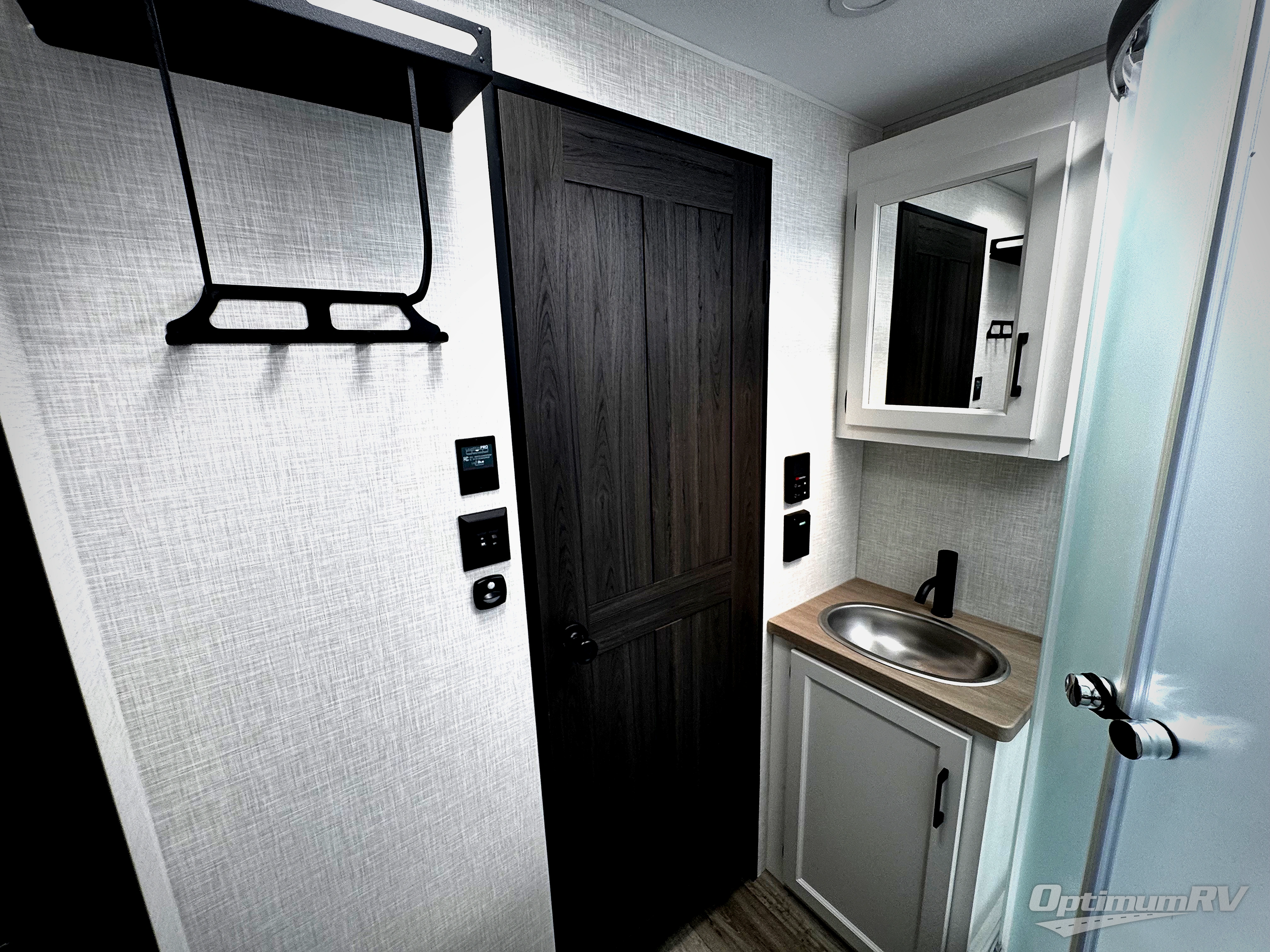The whole family can camp together in this travel trailer! It features a rear private bunkhouse with a 28" x 70" top bunk above a 40" x 70" bottom bunk, a closet, and a 28" x 73" flip up top bunk above a 70" sofa with table slide. One of the dual entry doors leads directly into the half bathroom with fold-out aluminum steps so you can get back to having fun faster. The chef can prepare their best meals for the crew either indoors with the three burner cooktop or at the exterior campfire café with a 40" TV/DVD/speakers to entertain them while they cook. Everyone can gather together at the Sit N' Slide table and 70" tri-fold sofa across from the entertainment center with a fireplace for a cozy evening. The dual entry bathroom is easy to access, especially for those staying in the front private bedroom. You even have a coat closet next to the main entrance to limit the clutter!