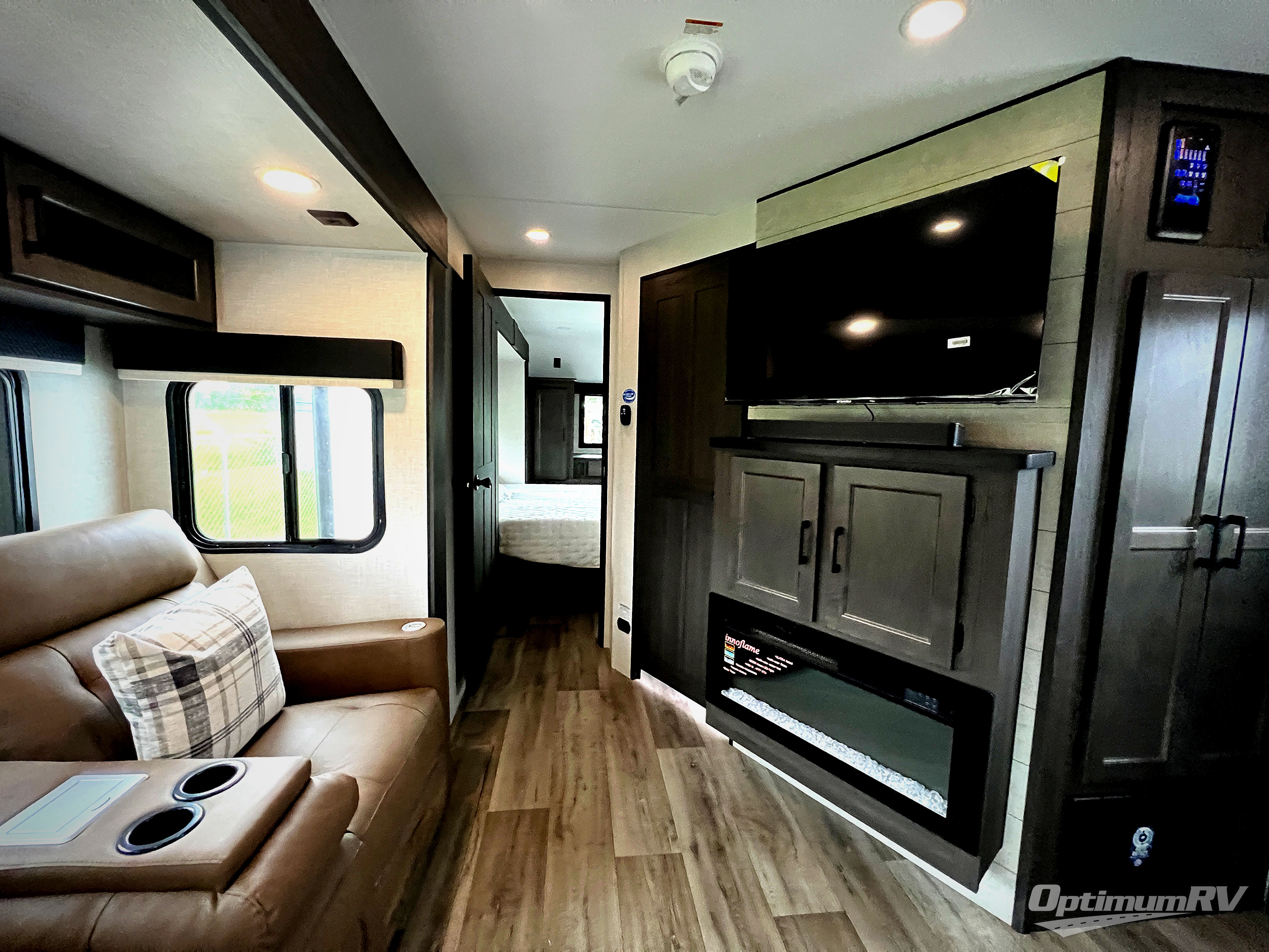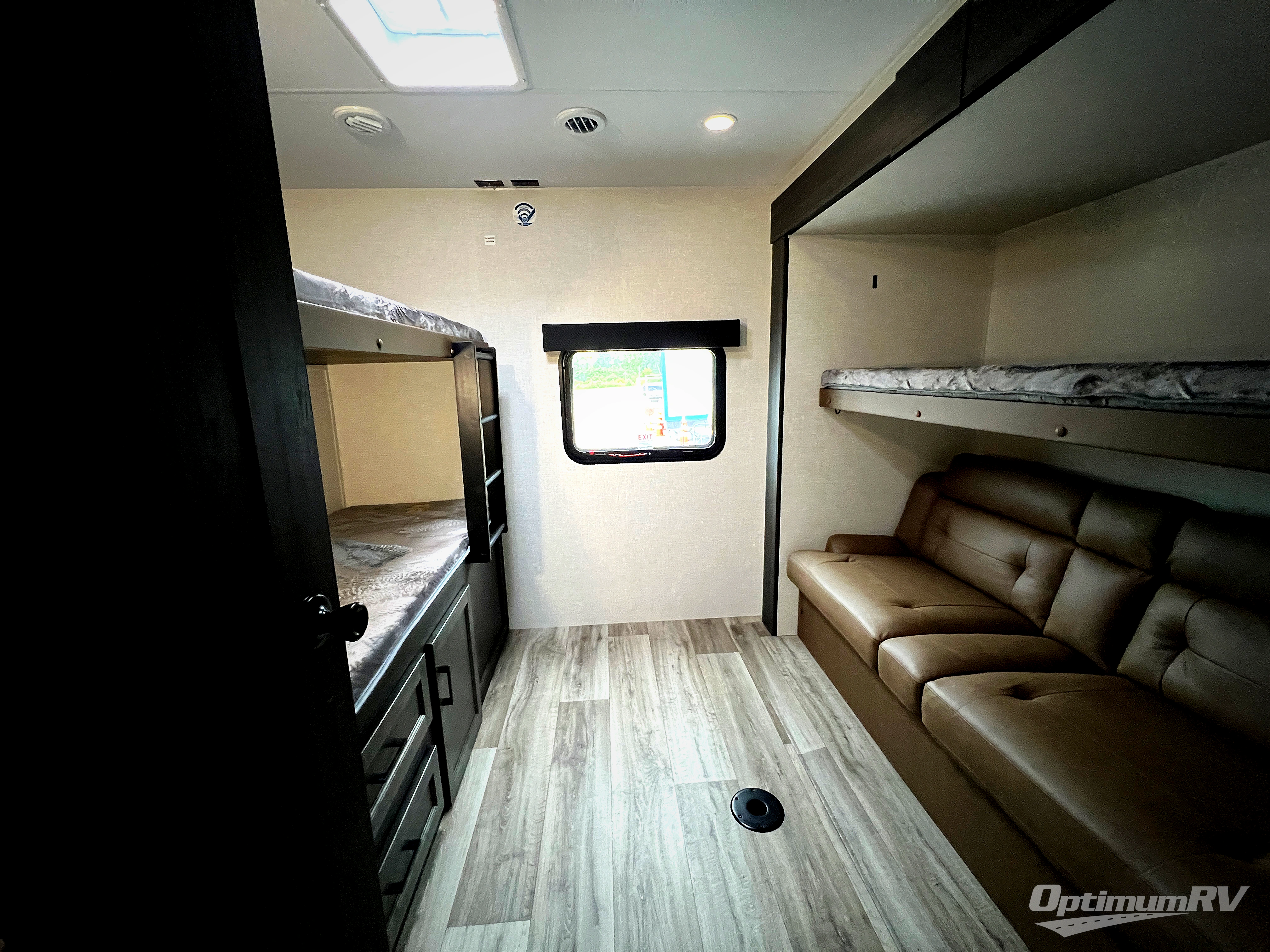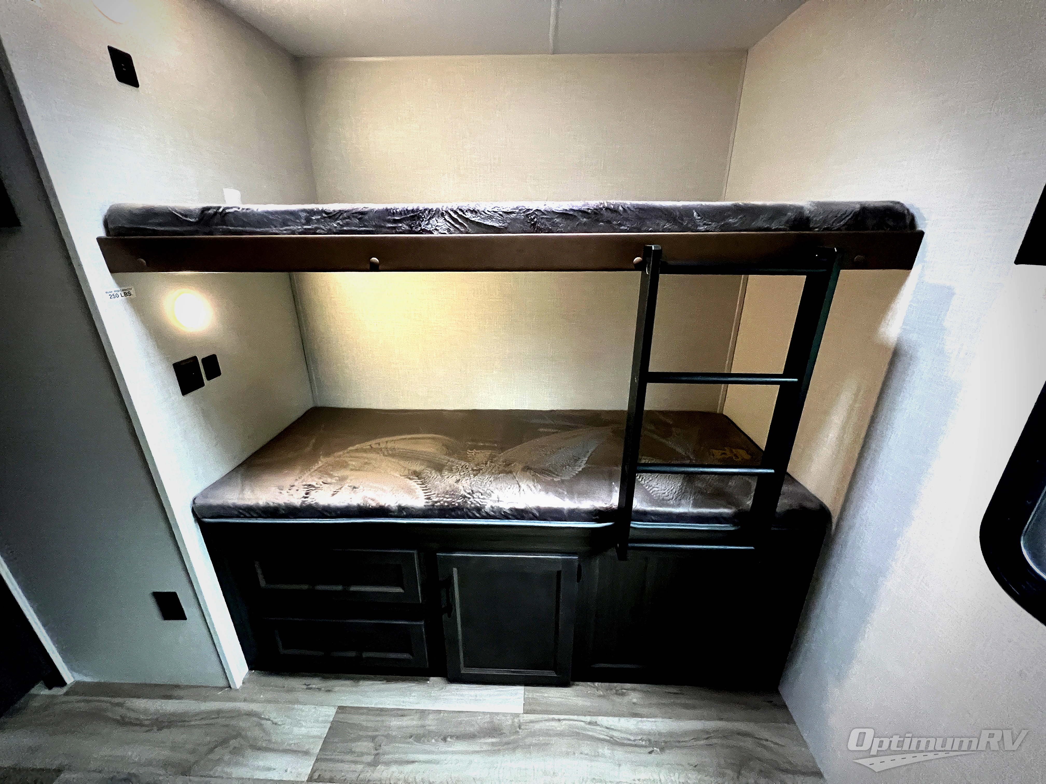 The whole family can camp together in this travel trailer! It features a rear private bunkhouse with a 28" x 70" top bunk above a 40" x 70" bottom bunk, a closet, and a 28" x 73" flip up top bunk above a 70" sofa with table slide. One of the dual entry doors leads directly into the half bathroom with fold-out aluminum steps so you can get back to having fun faster. The chef can prepare their best meals for the crew either indoors with the three burner cooktop or at the exterior campfire café with a 40" TV/DVD/speakers to entertain them while they cook. Everyone can gather together at the Sit N' Slide table and 70" tri-fold sofa across from the entertainment center with a fireplace for a cozy evening. The dual entry bathroom is easy to access, especially for those staying in the front private bedroom. You even have a coat closet next to the main entrance to limit the clutter!