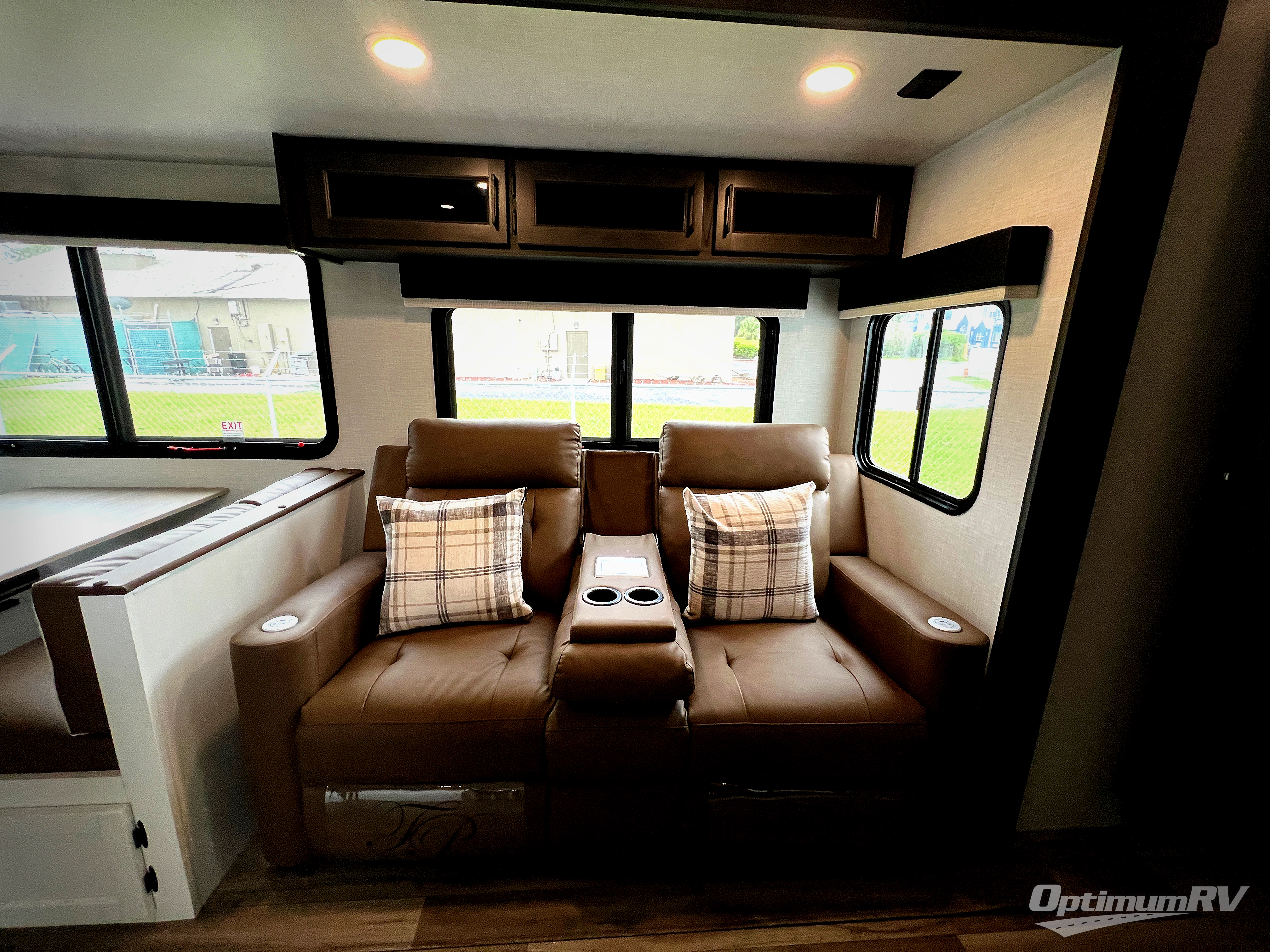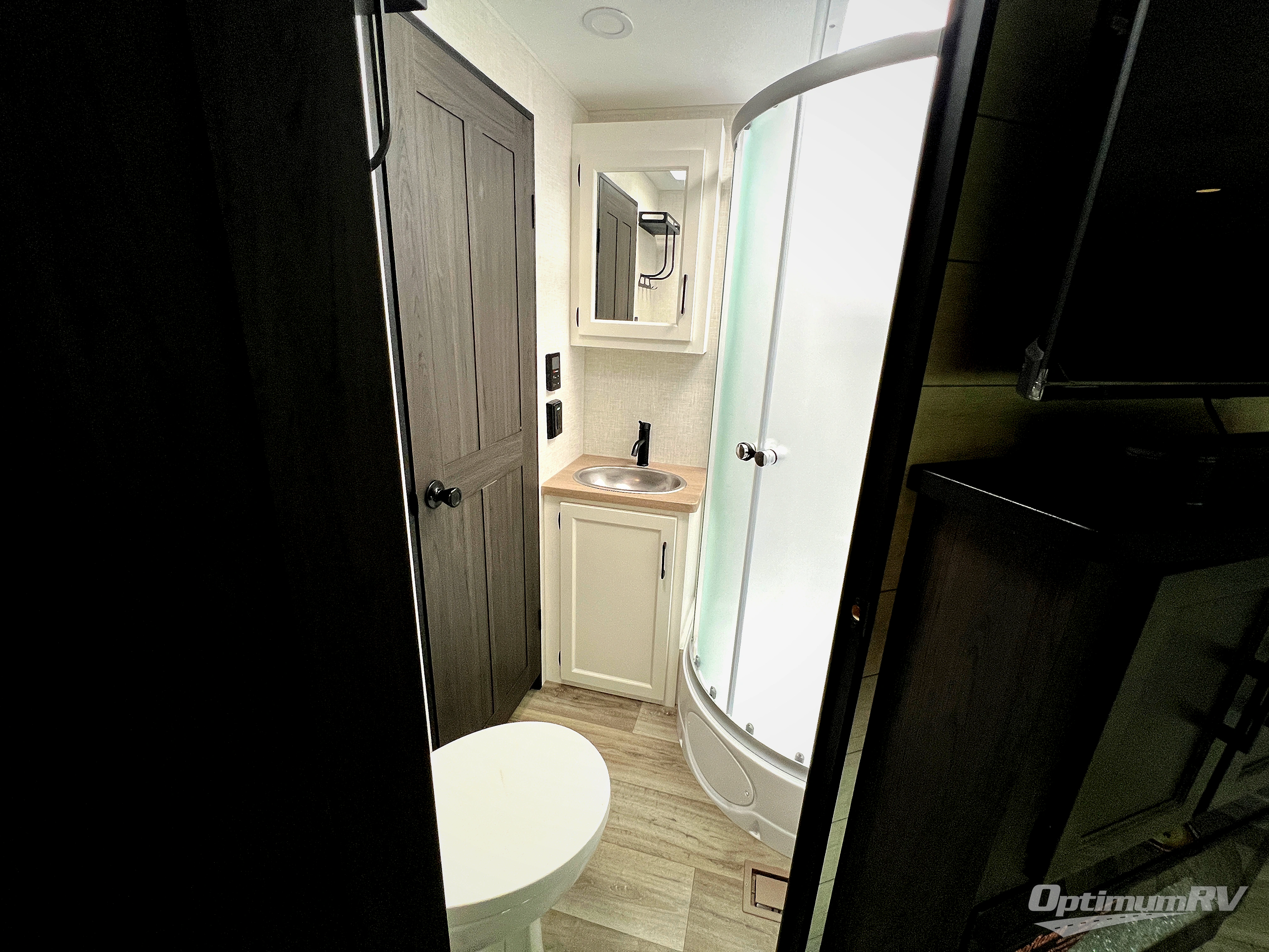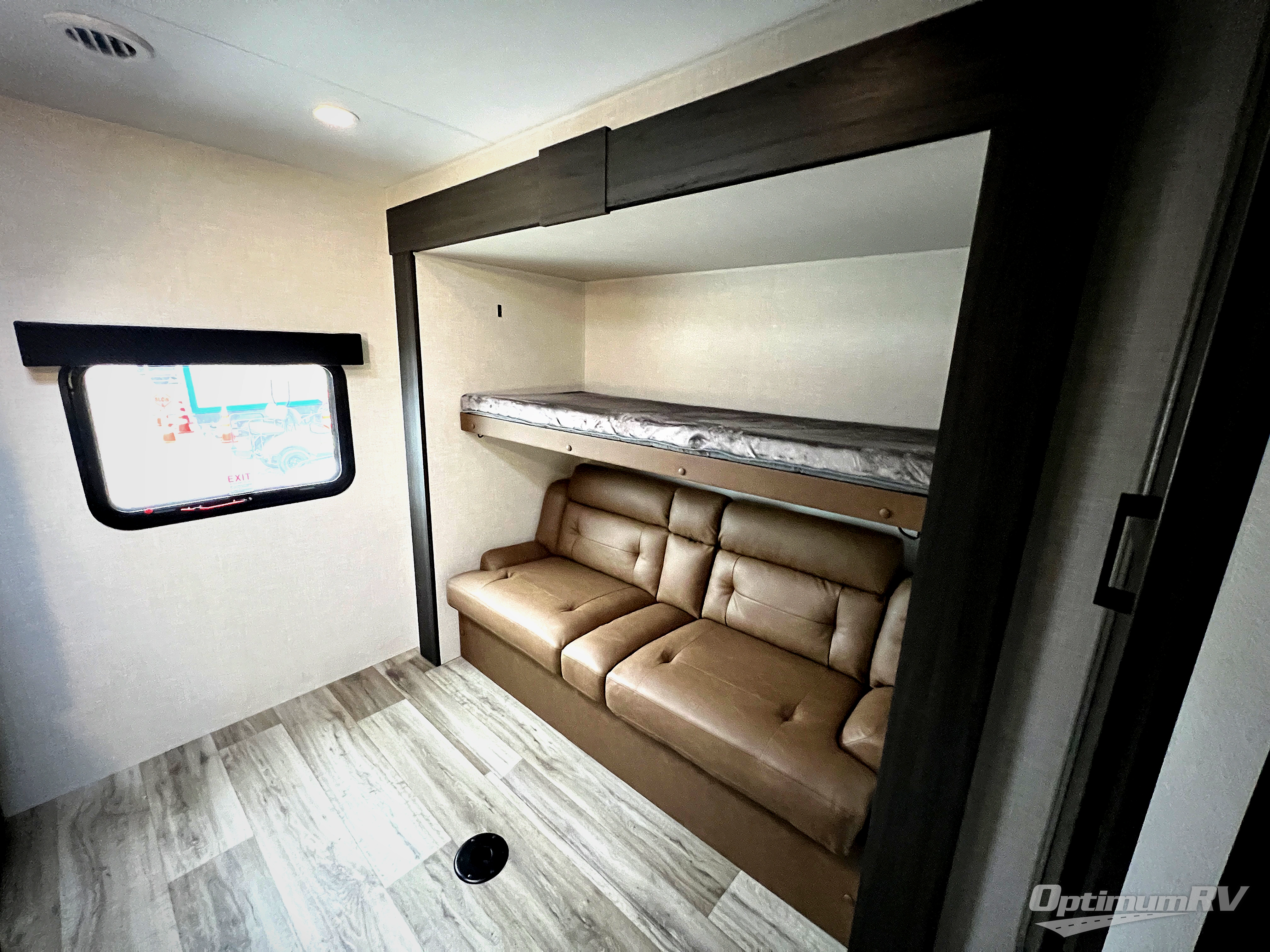 The whole family can camp together in this travel trailer! It features a rear private bunkhouse with a 28" x 70" top bunk above a 40" x 70" bottom bunk, a closet, and a 28" x 73" flip up top bunk above a 70" sofa with table slide. One of the dual entry doors leads directly into the half bathroom with fold-out aluminum steps so you can get back to having fun faster. The chef can prepare their best meals for the crew either indoors with the three burner cooktop or at the exterior campfire café with a 40" TV/DVD/speakers to entertain them while they cook. Everyone can gather together at the Sit N' Slide table and 70" tri-fold sofa across from the entertainment center with a fireplace for a cozy evening. The dual entry bathroom is easy to access, especially for those staying in the front private bedroom. You even have a coat closet next to the main entrance to limit the clutter!
