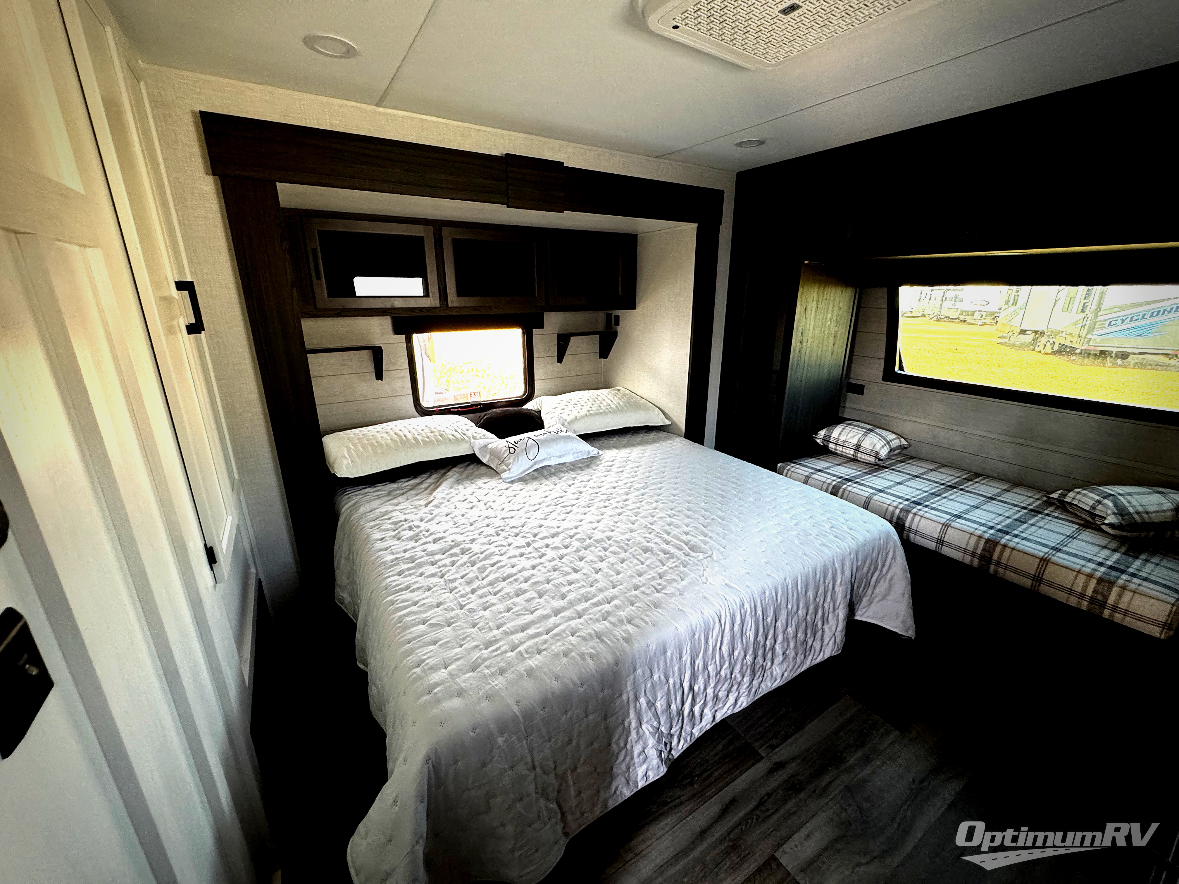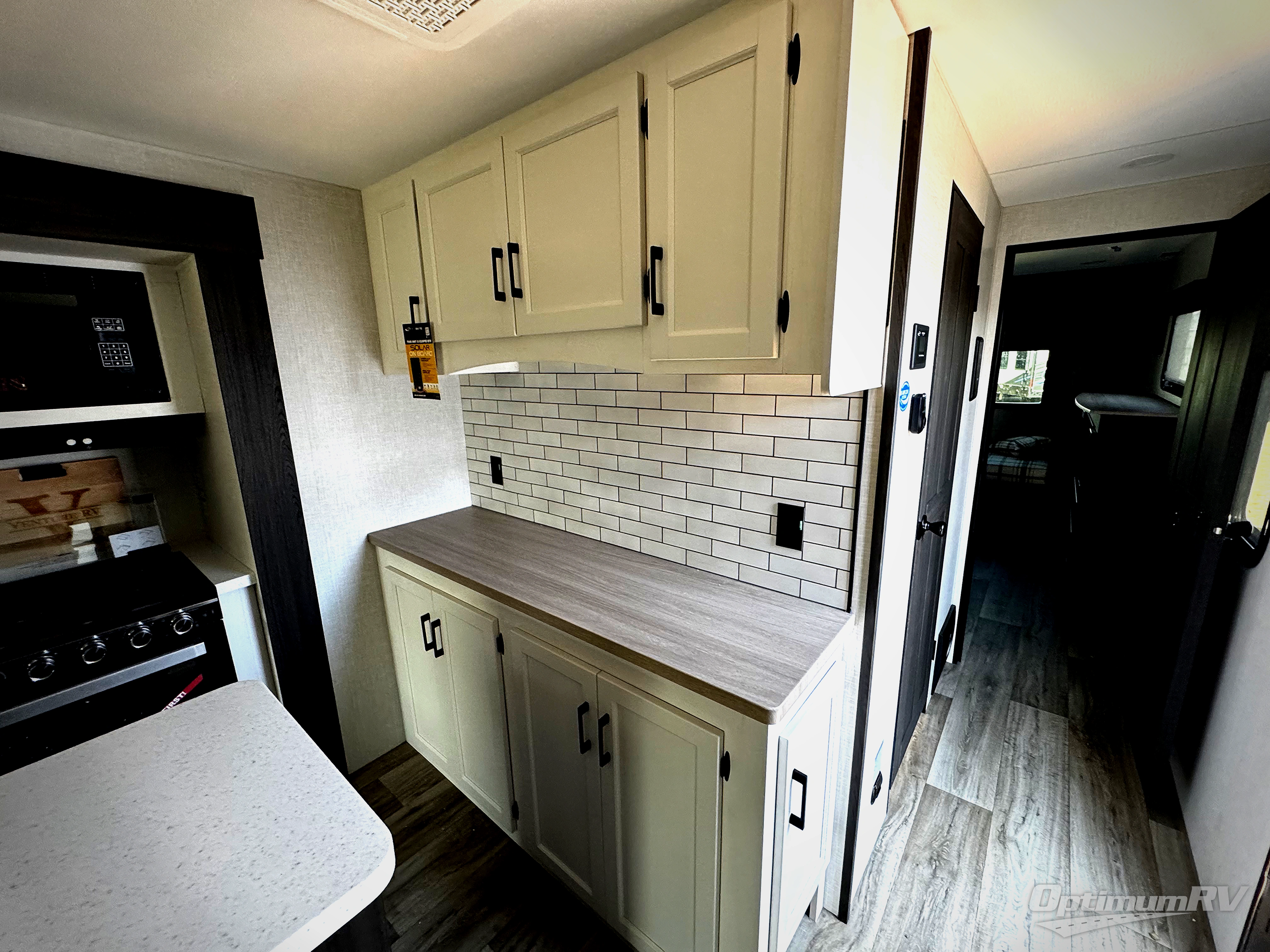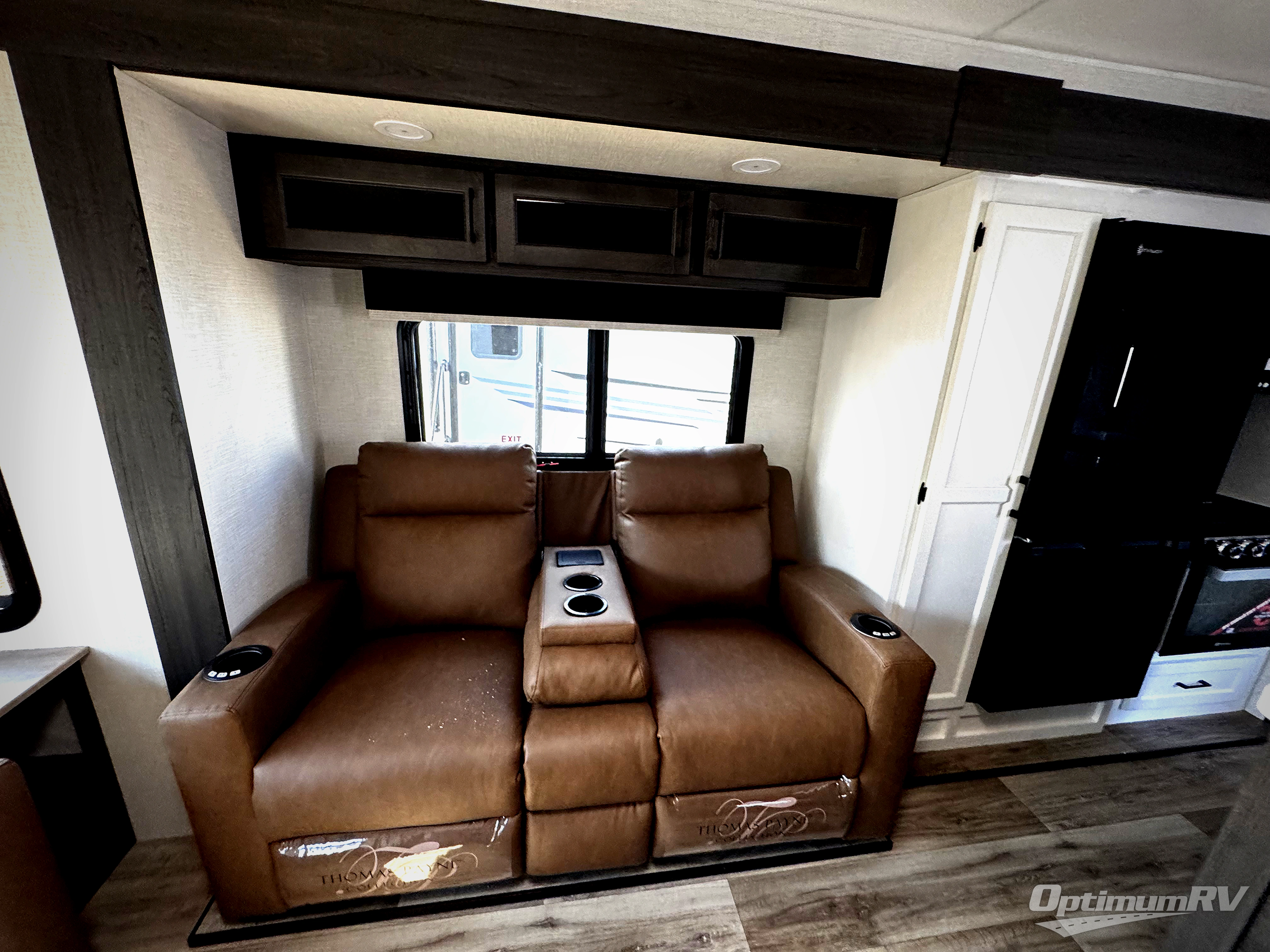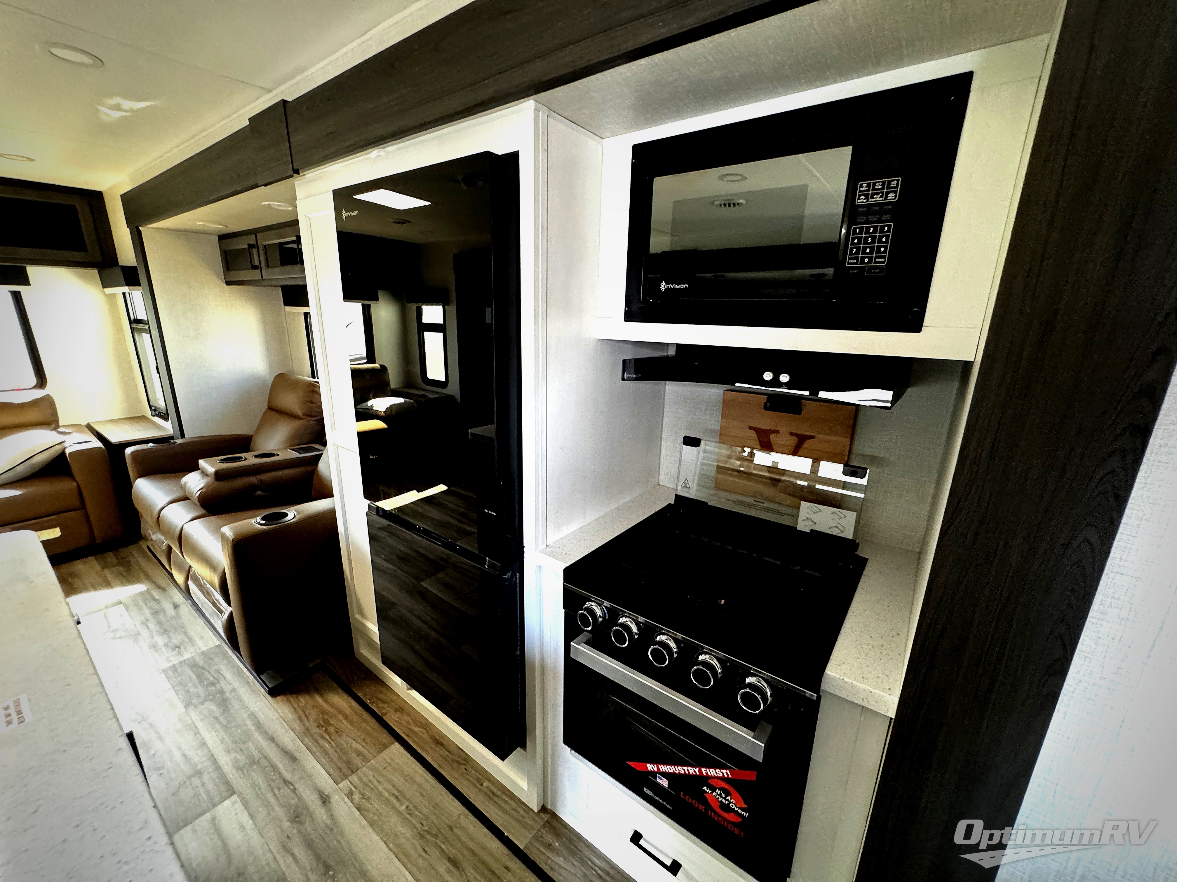 Pack your bags and hitch up this travel trailer for a great weekend camping trip! The front private bedroom has a 70" x 80" Sleep Tight king bed slide to lay your head at night, a dresser with a 30" frameless fireplace, a window seat with shelves on either side for your books, and a wardrobe with washer and dryer prep. Freshen up each morning in the full bathroom with the 30" x 36" shower then head to the kitchen to fry up some eggs on the three burner cooktop and pour a cold glass of orange juice stored in the 10 cu. ft. refrigerator. The kitchen island will make your meal prepping easier and the table and chairs offer a comfortable place to enjoy your meals or play card games. You could even cook your meals at the exterior campfire café and set up a table underneath one of the two power awnings!