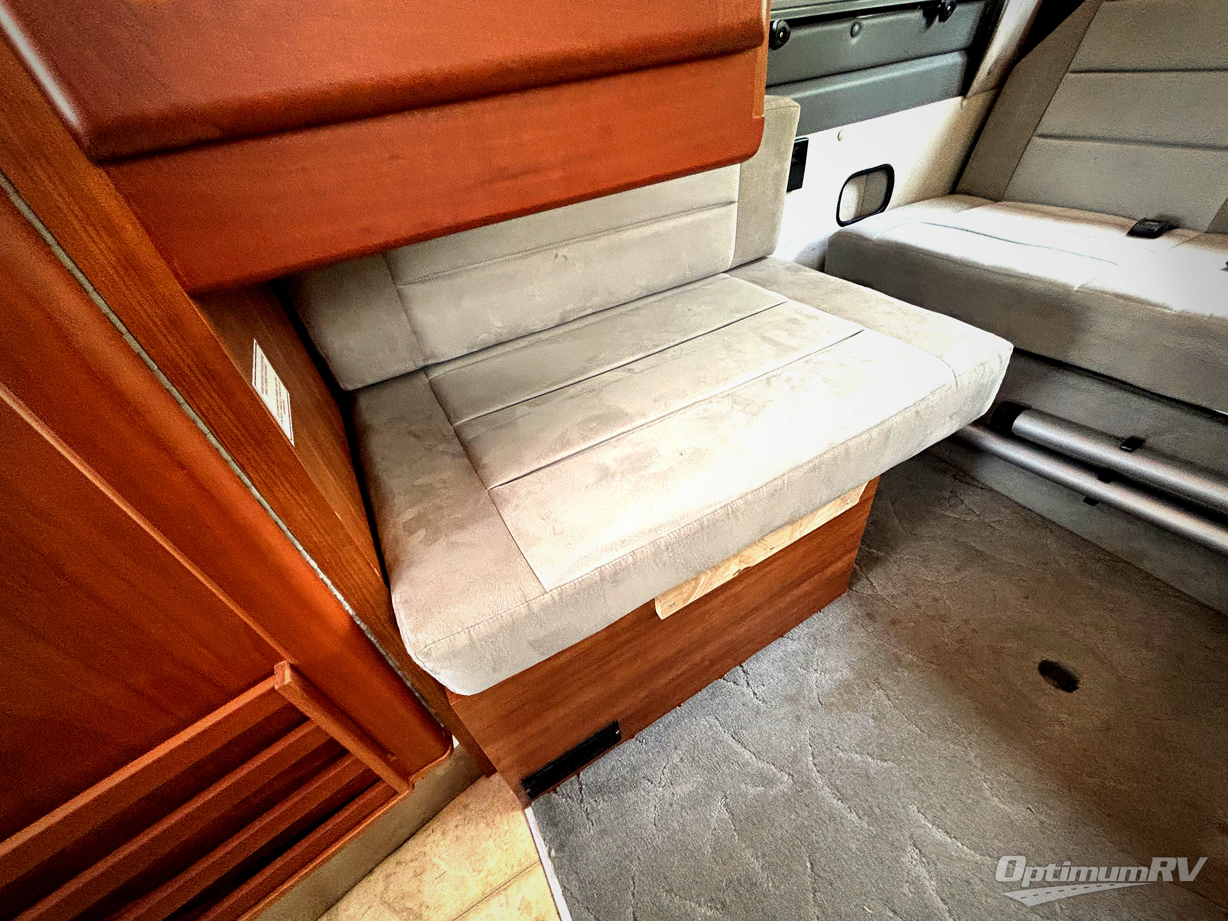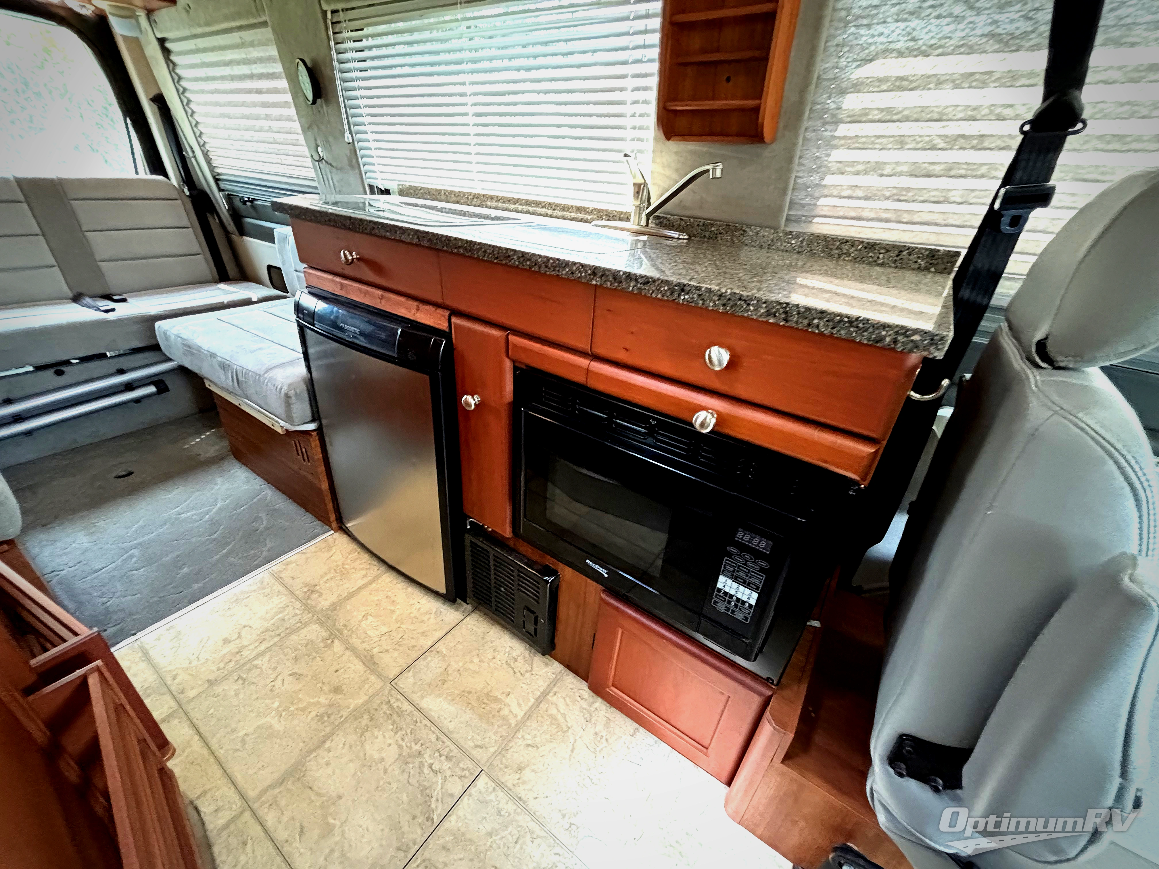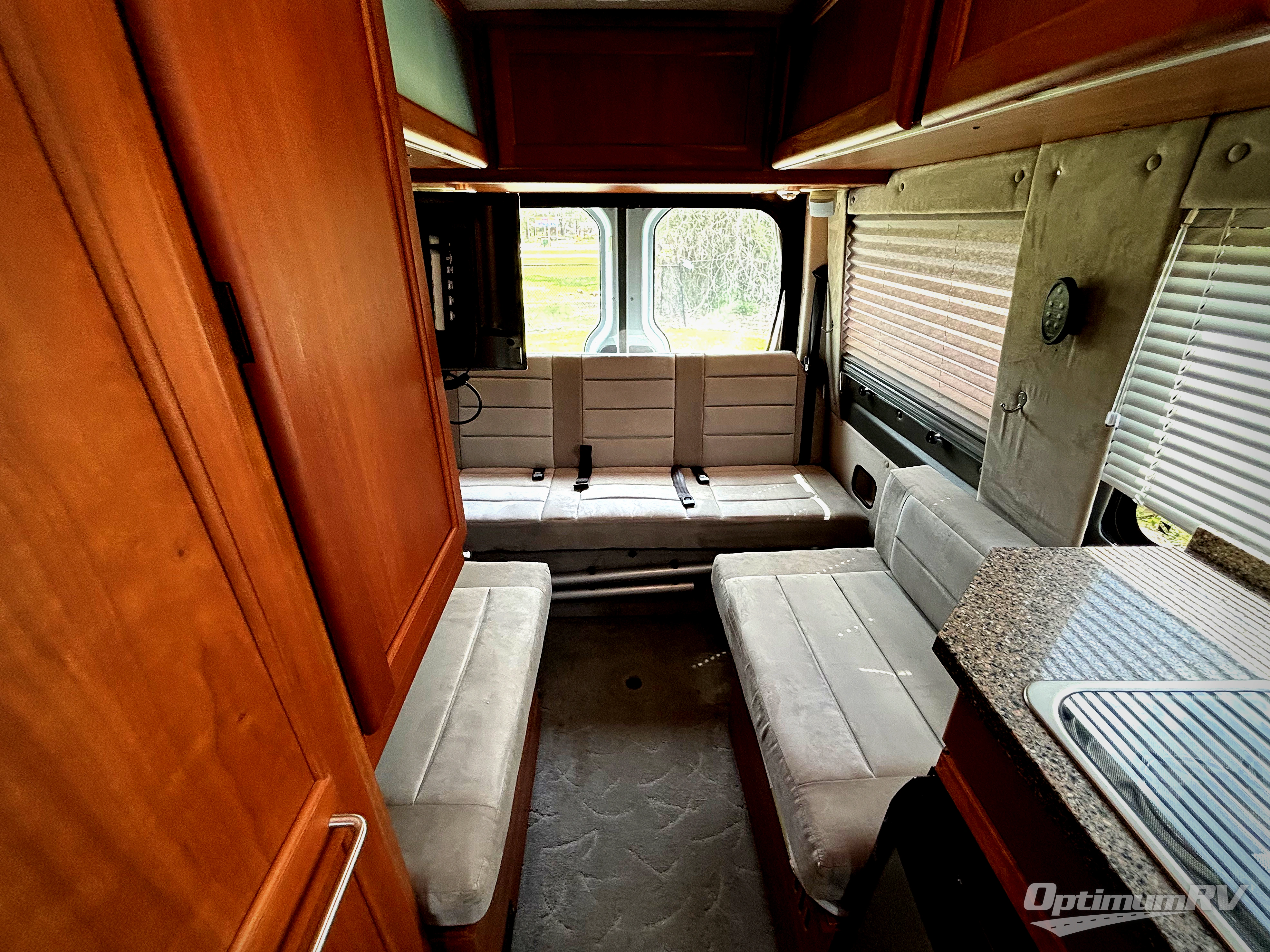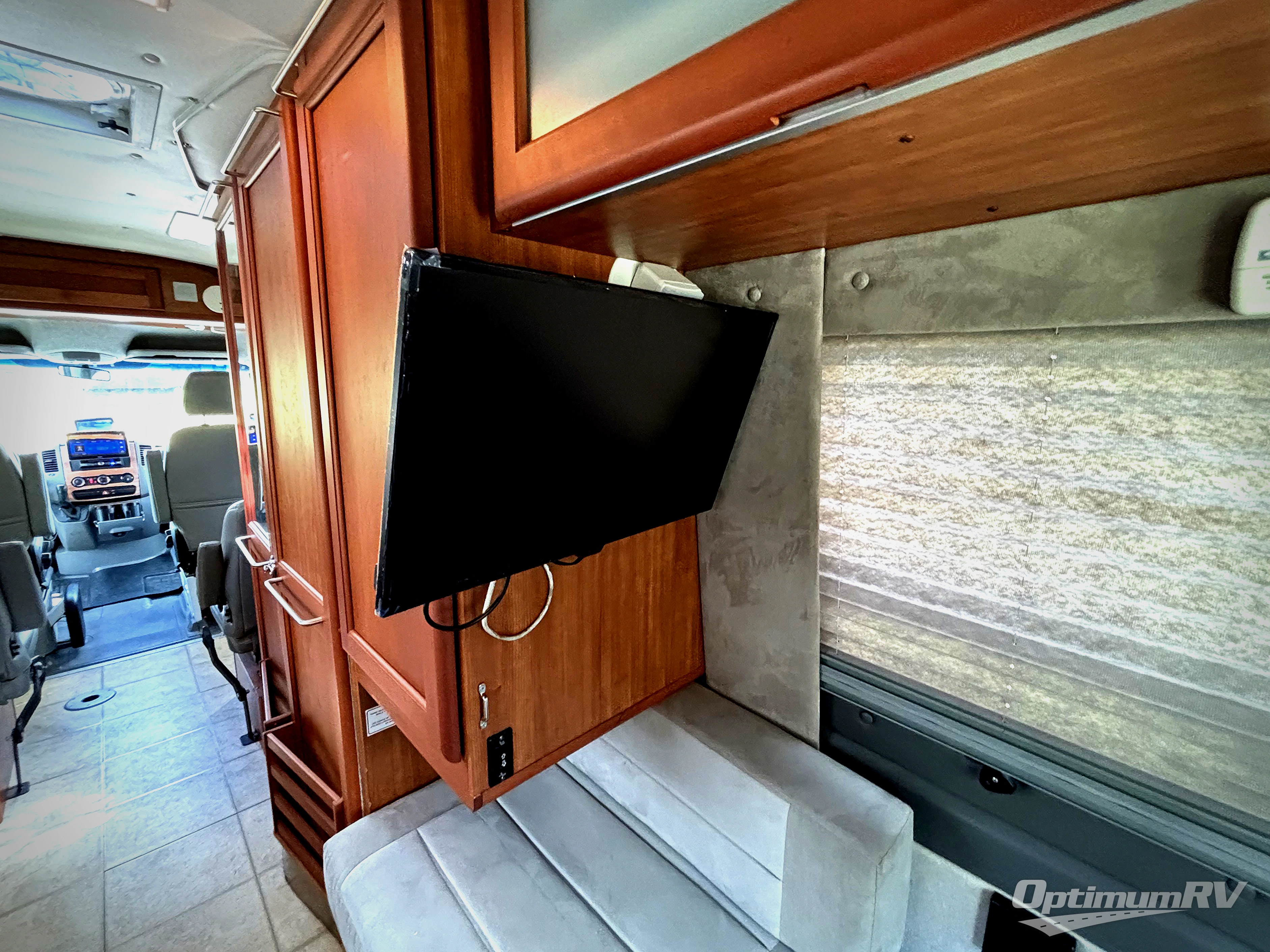 The front offers three comfortable swivel captain's chairs with a table. The passengers' side chairs can be converted to additional sleeping with the optional folding mattress. A toilet, sink and shower are enclosed along the passenger's side. Continuing to the back there is a wardrobe and TV mount.