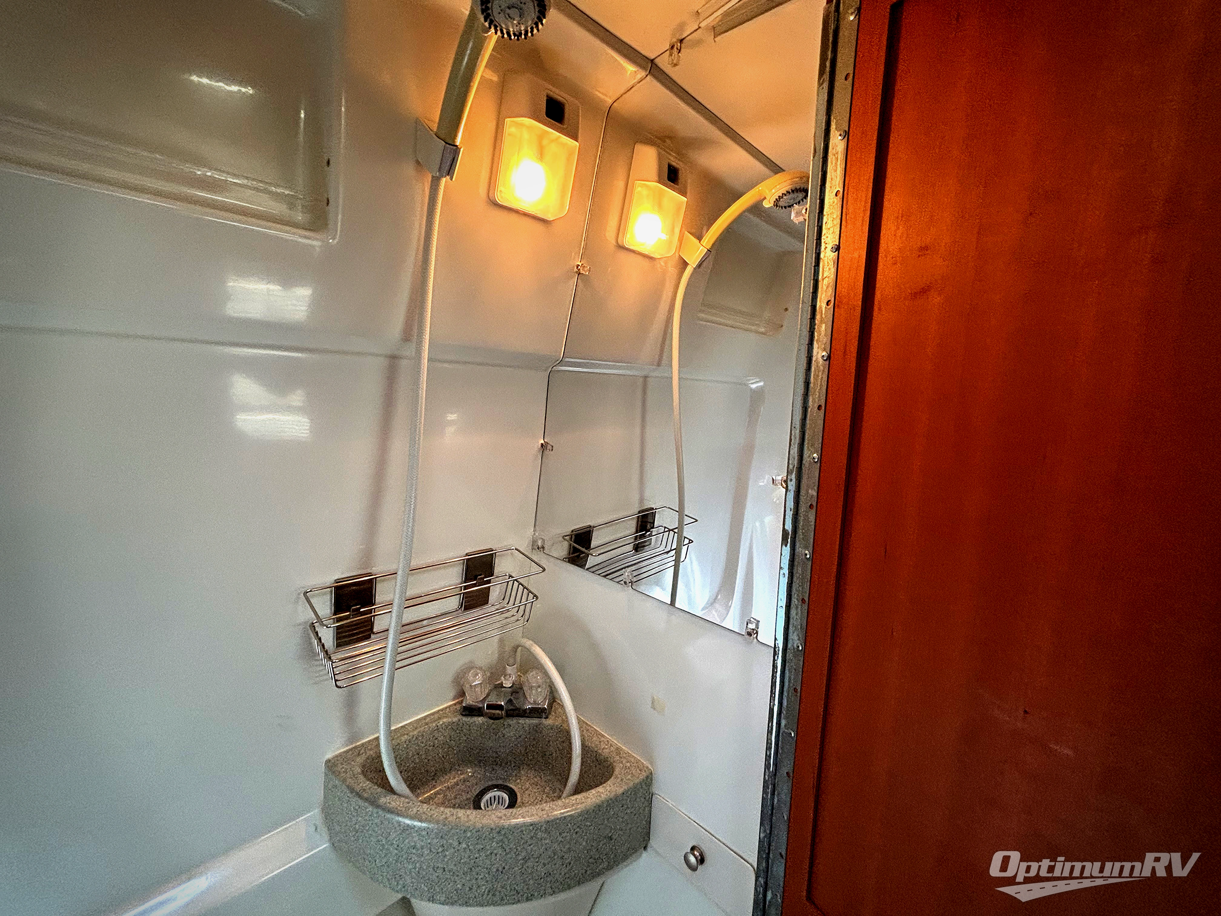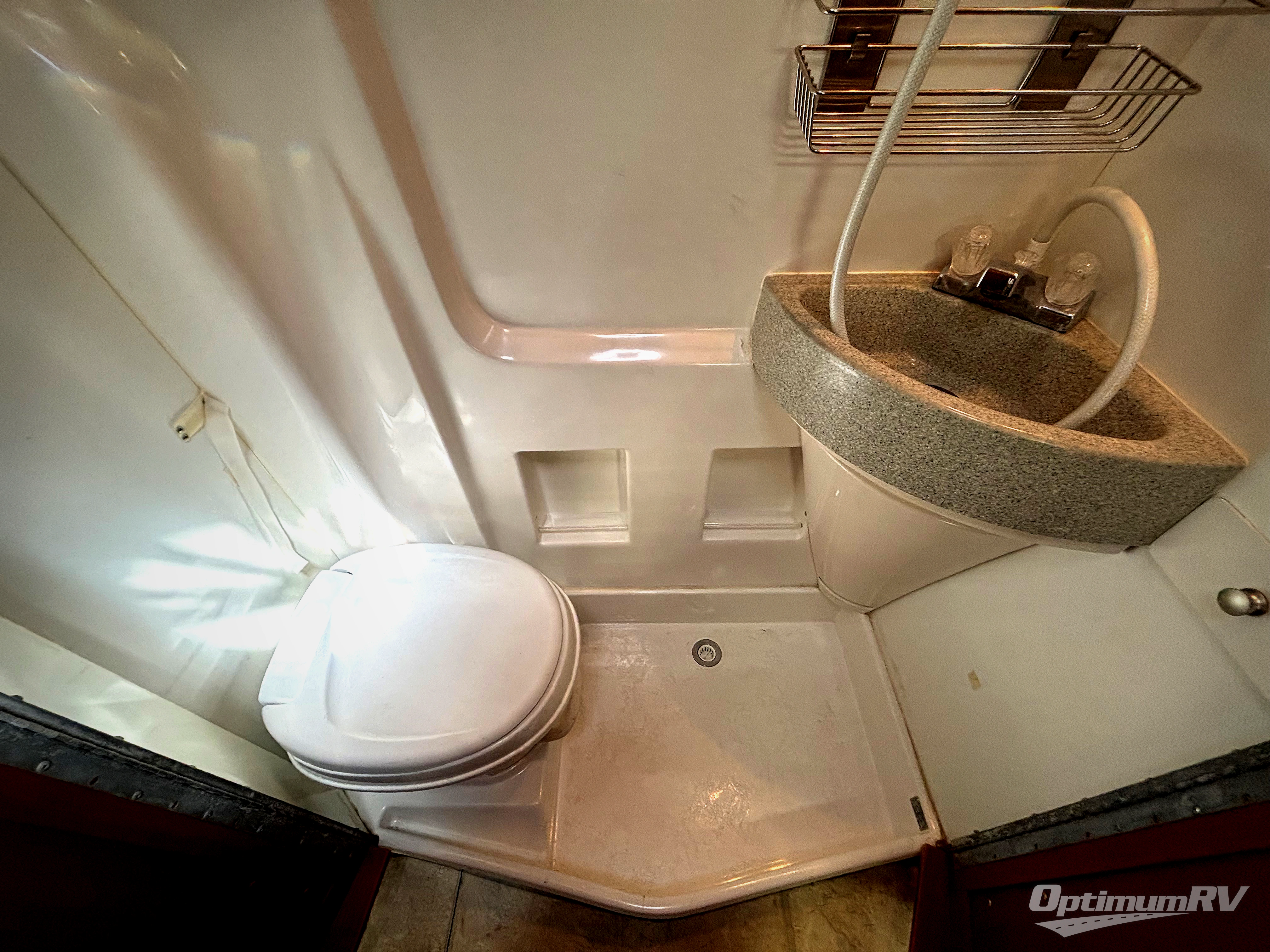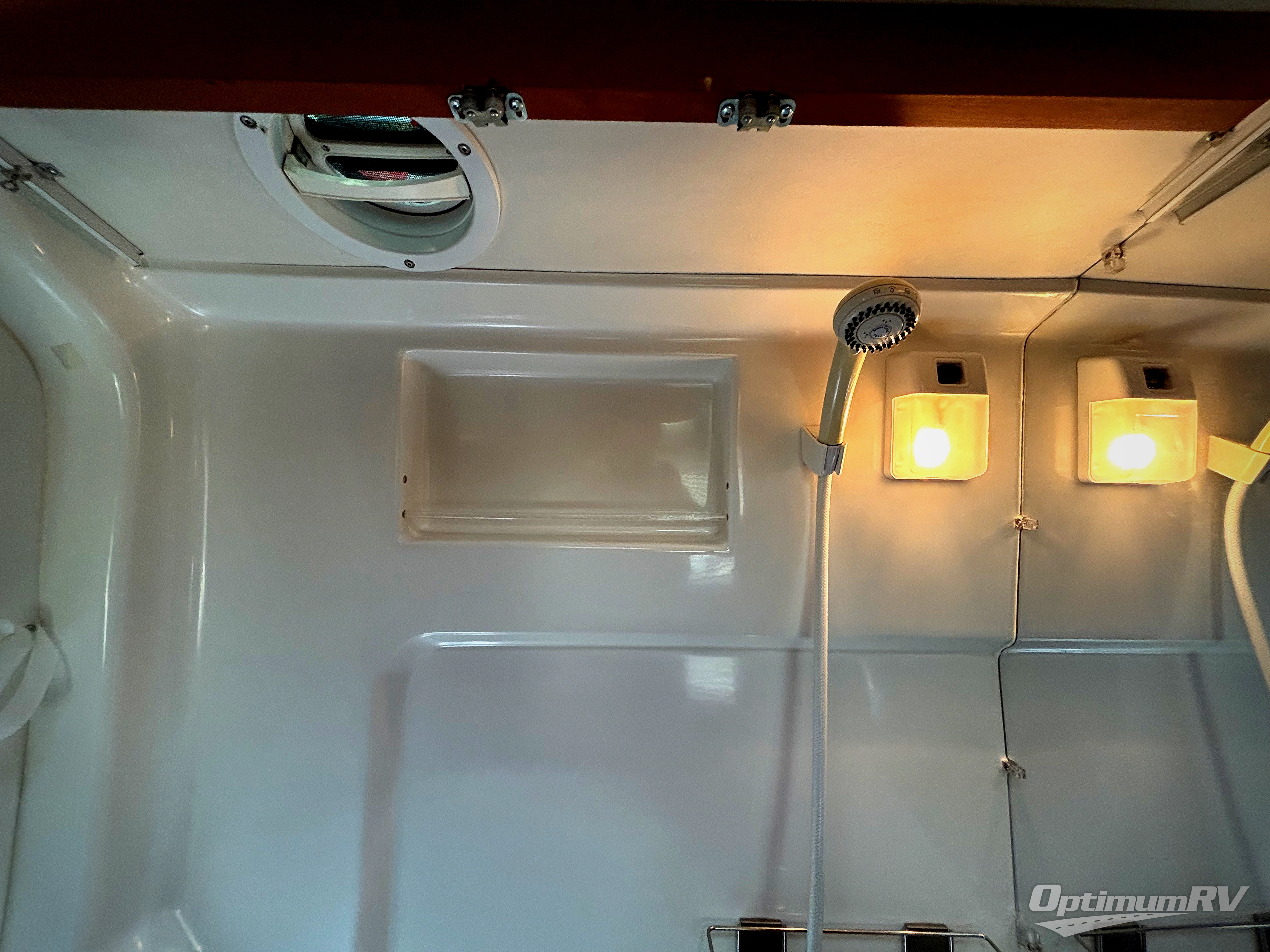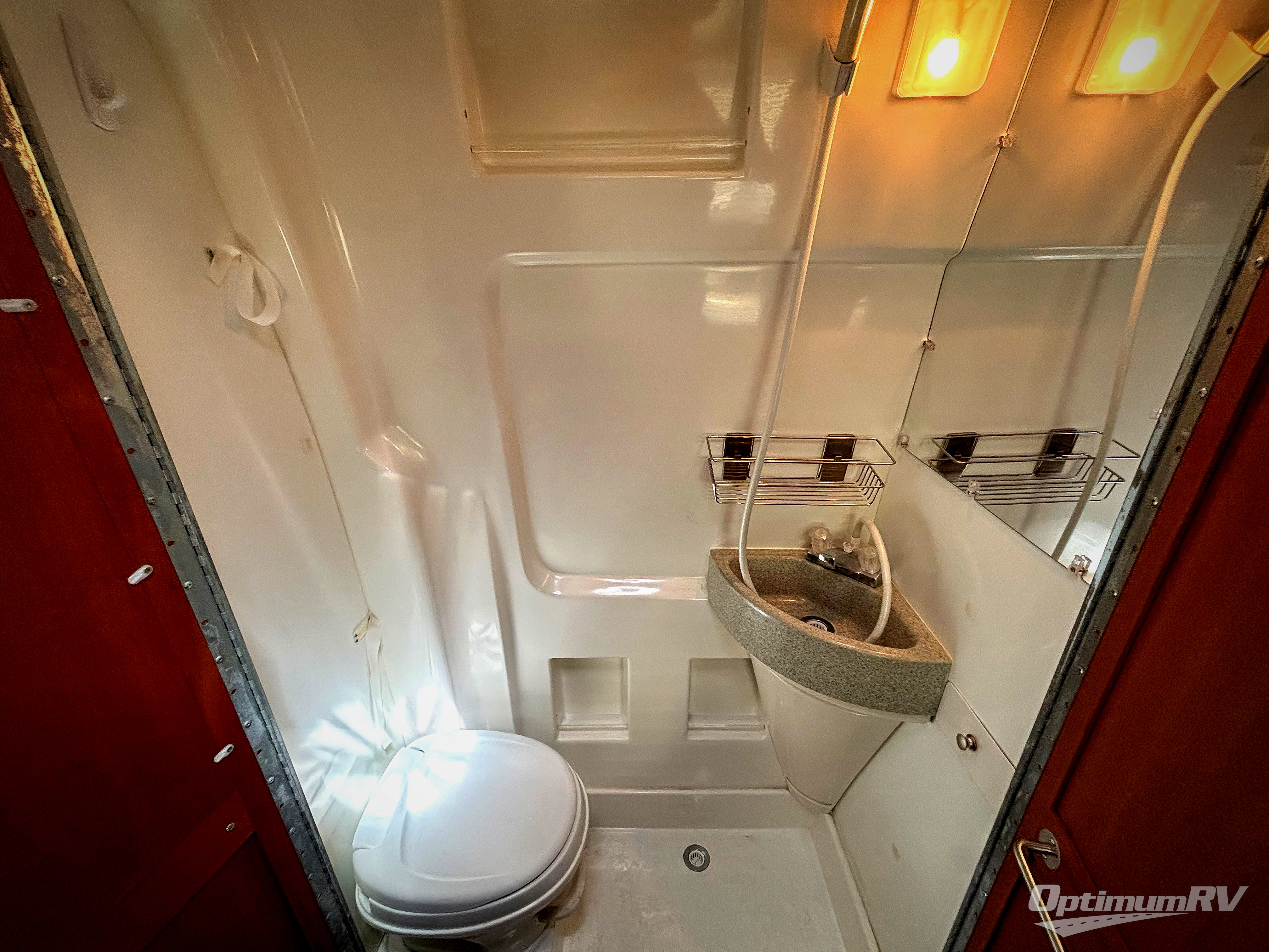 The front offers three comfortable swivel captain's chairs with a table. The passengers' side chairs can be converted to additional sleeping with the optional folding mattress. A toilet, sink and shower are enclosed along the passenger's side. Continuing to the back there is a wardrobe and TV mount.