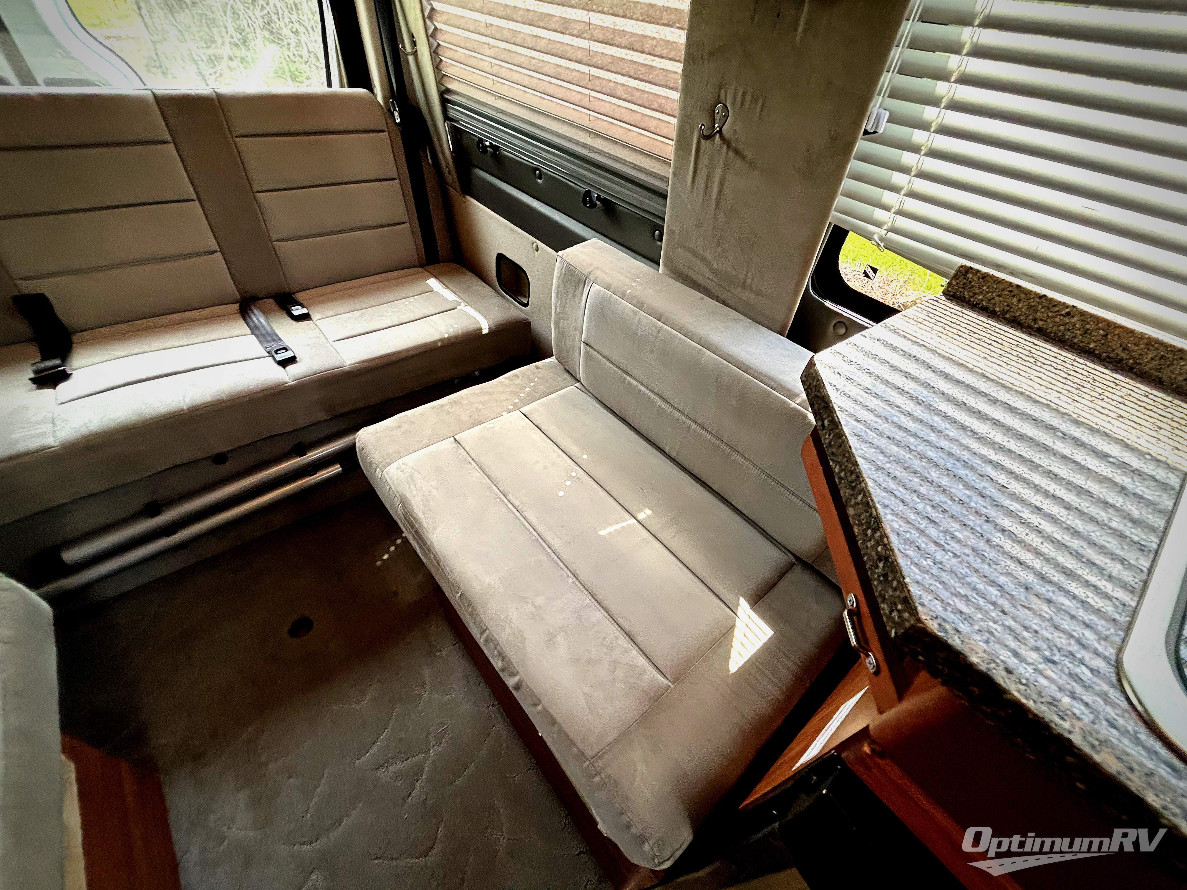 The CS-Adventurous Class B diesel coach offers a standard electric power sofa that reclines to provide a king size bed or two twin beds. There is an additional bench seat in the driver's side rear for plenty of seating around the back table.