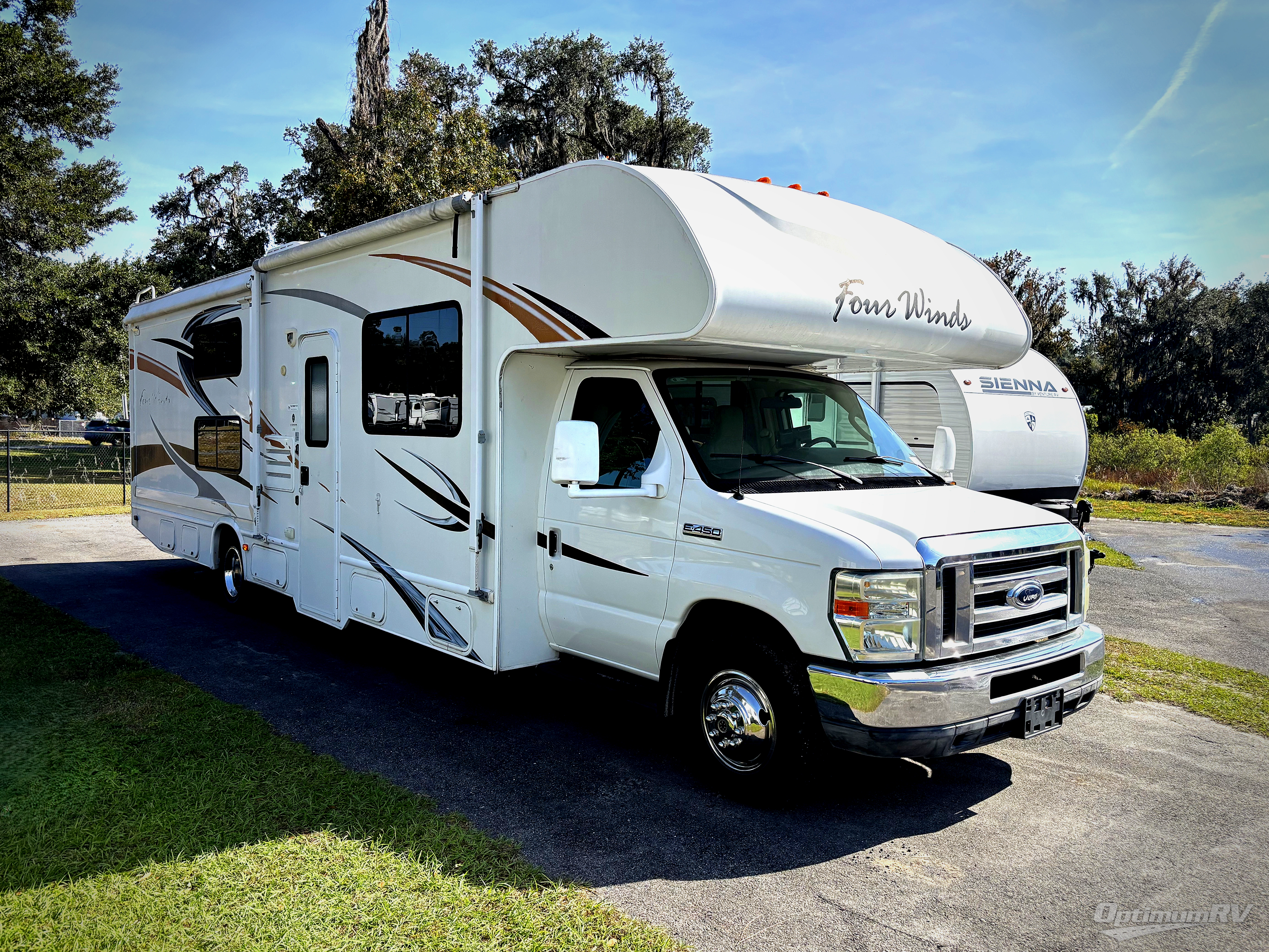 Four Winds Class C by Thor Motor Coach w/Rear Queen Bed w/Nightstands Both Sides of Bed, Wardrobe/Bunk Bed Slideout, Bath w/Shower, Toilet & Sink w/Overhead Cabinet, Kitchen Sink, 3 Burner Range w/Microwave Above & Sofa Slide, Cab Over Bunk, Booth Dinette w/Overhead Storage, Refrigerator and More! Available Options May Include: 19" LCD TV in Bedroom.