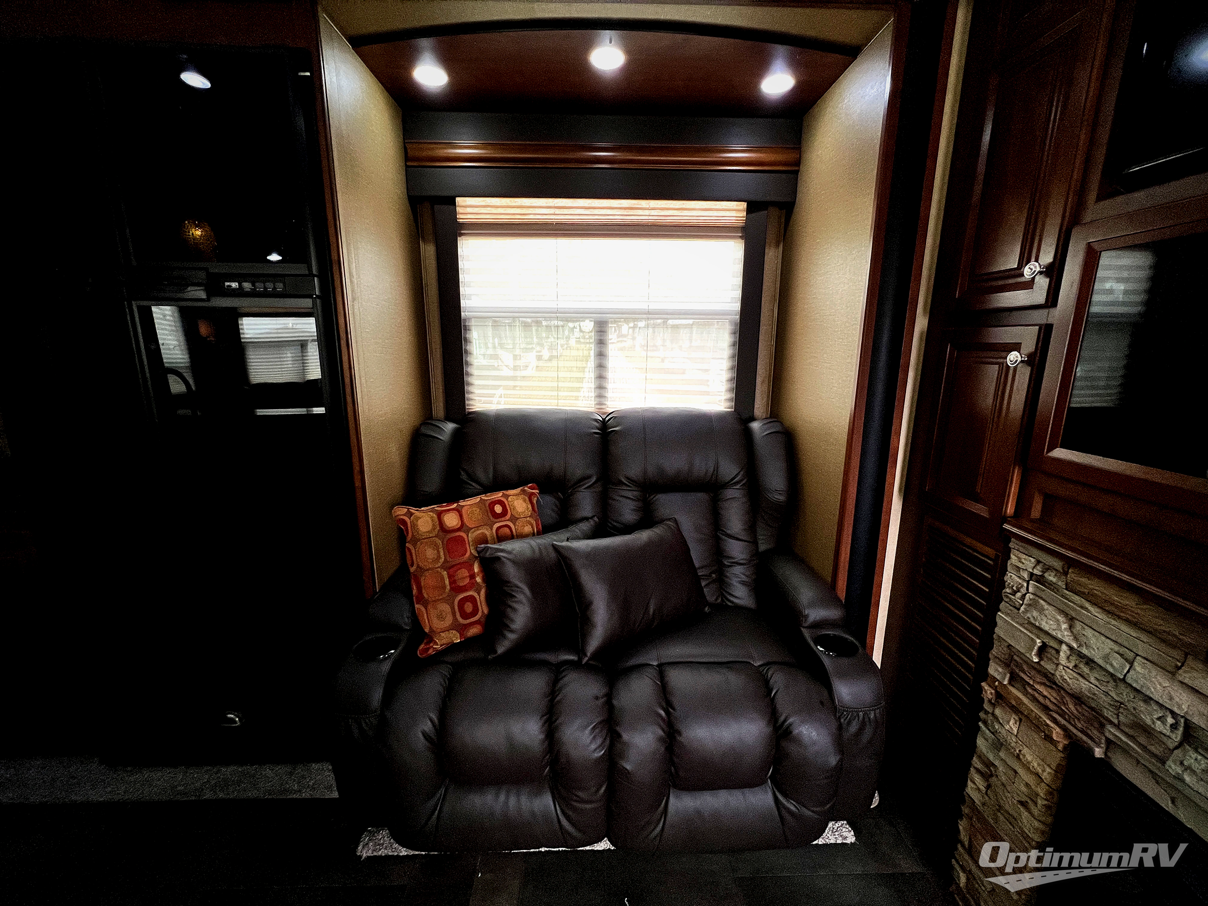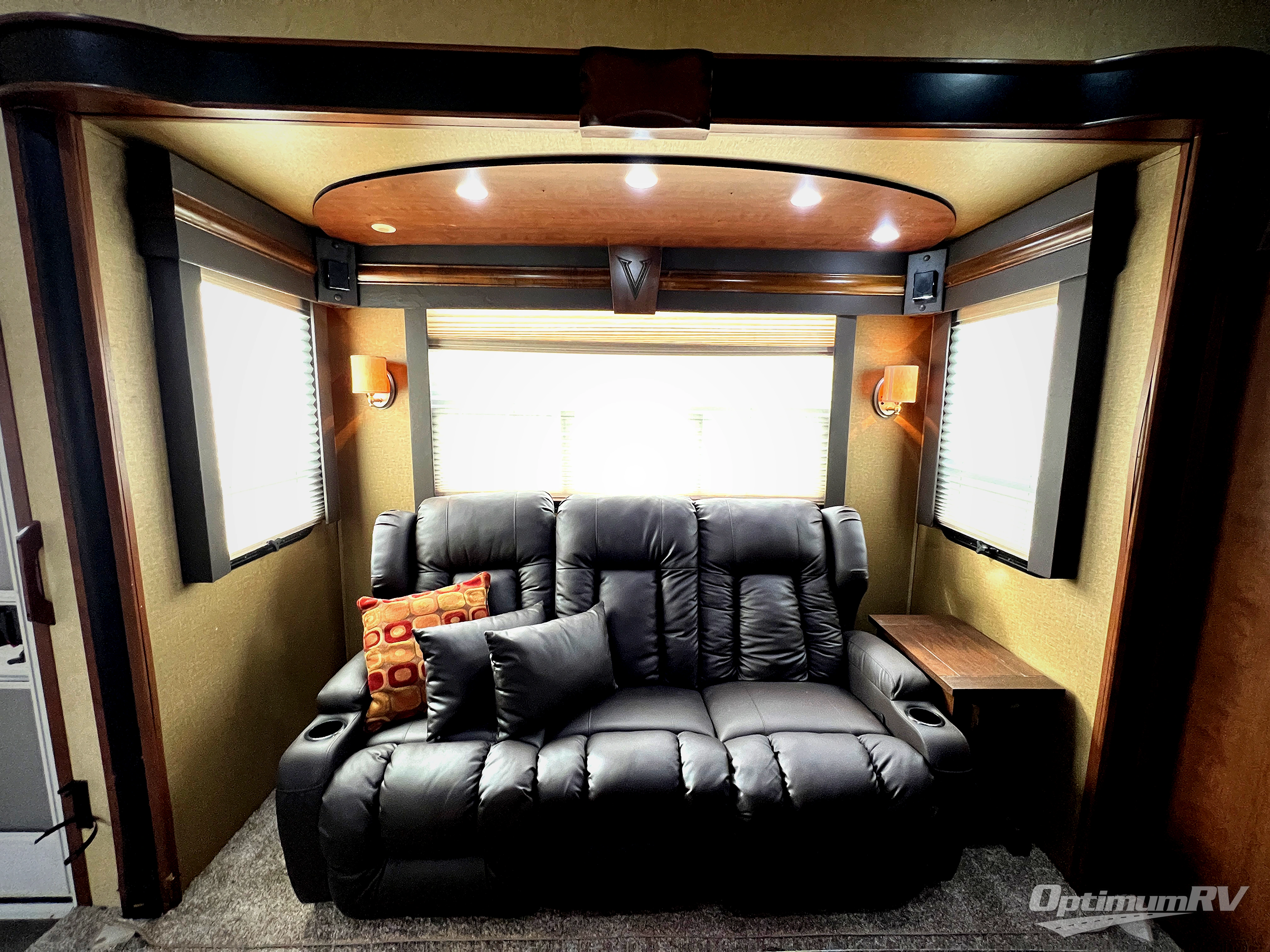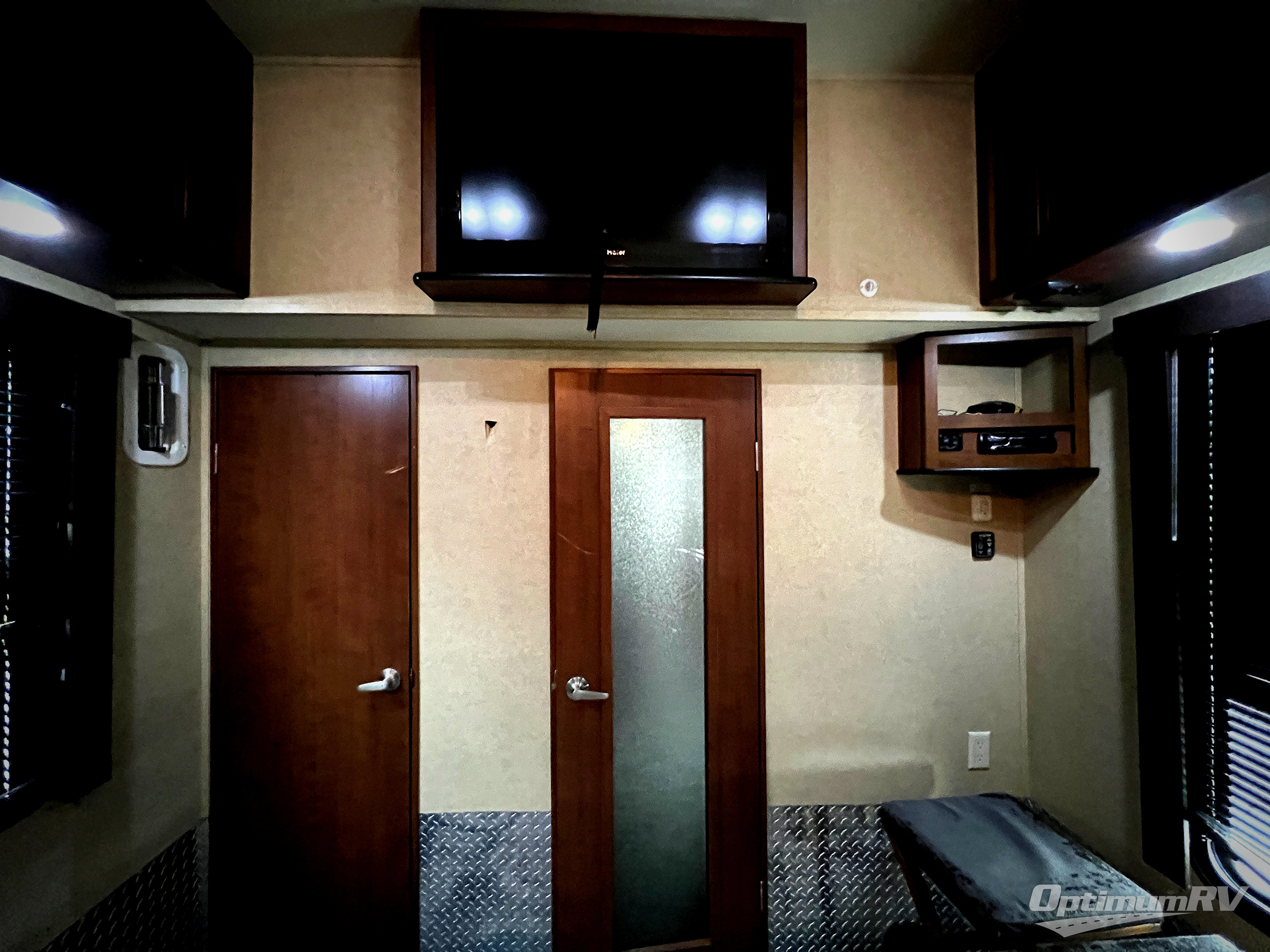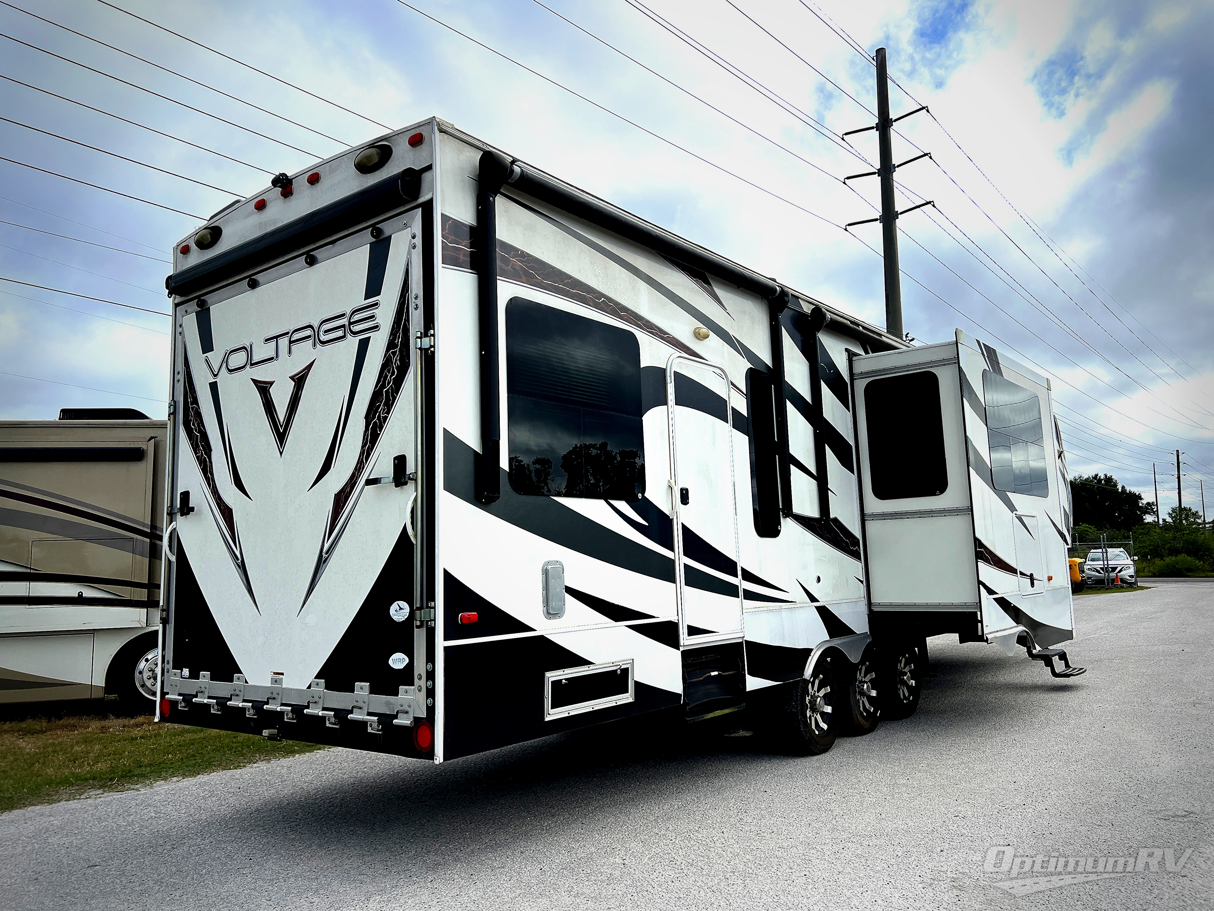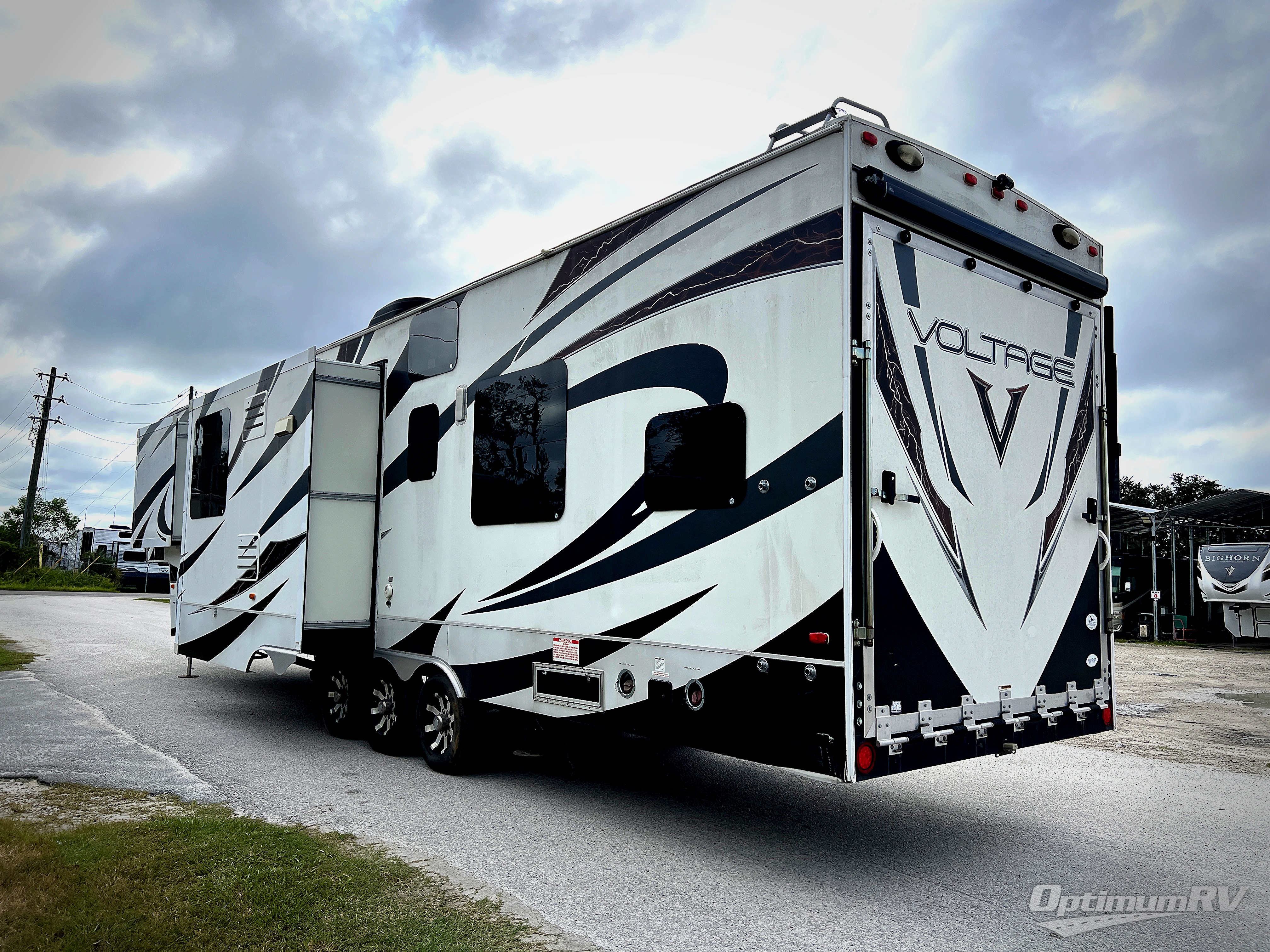Voltage FW Toy Hauler w/Rear Ramp Door to 12' Cargo Area w/Side Man Door, Lounge Chair, Overhead Storage Cabinets, Stackable Washer/Dryer Prep/Closet, 1/2 Bath in Cargo, Door to Living Area w/Slideout Dinette/Sofa w/Stowable Table, Counter w/Bar Stools, Dbl. Kitchen Sink, 3 Burner Range/Refrig./Pantry & Theater Seat Slideout, 40" LCD TV, Step Up to Side Aisle Bath w/Shower, Toilet & Vessel Sink, Pass-Thru Storage, Front Queen Hinged Top Bed w/Nightstands, Slideout His & Her Wards. & More!