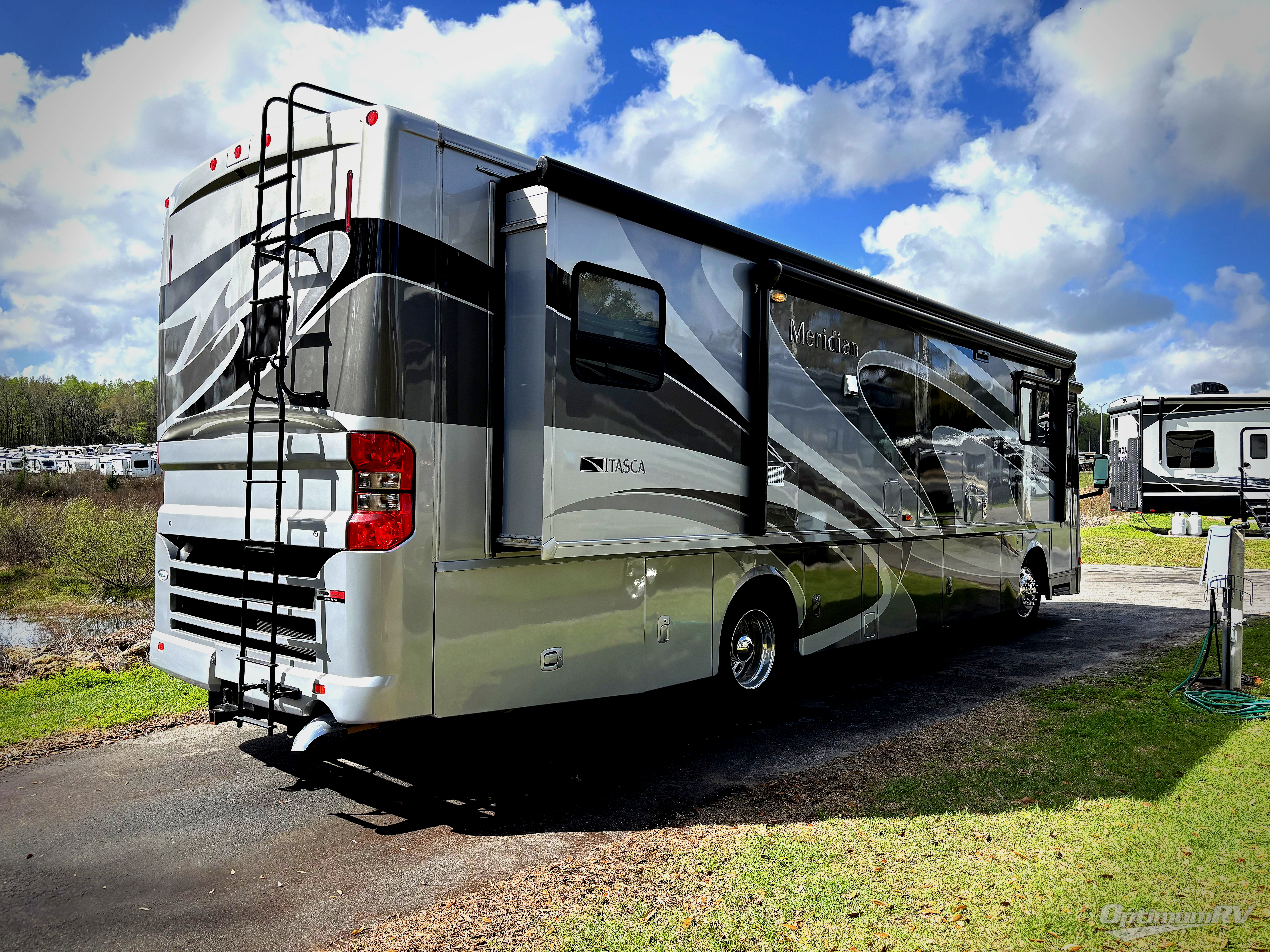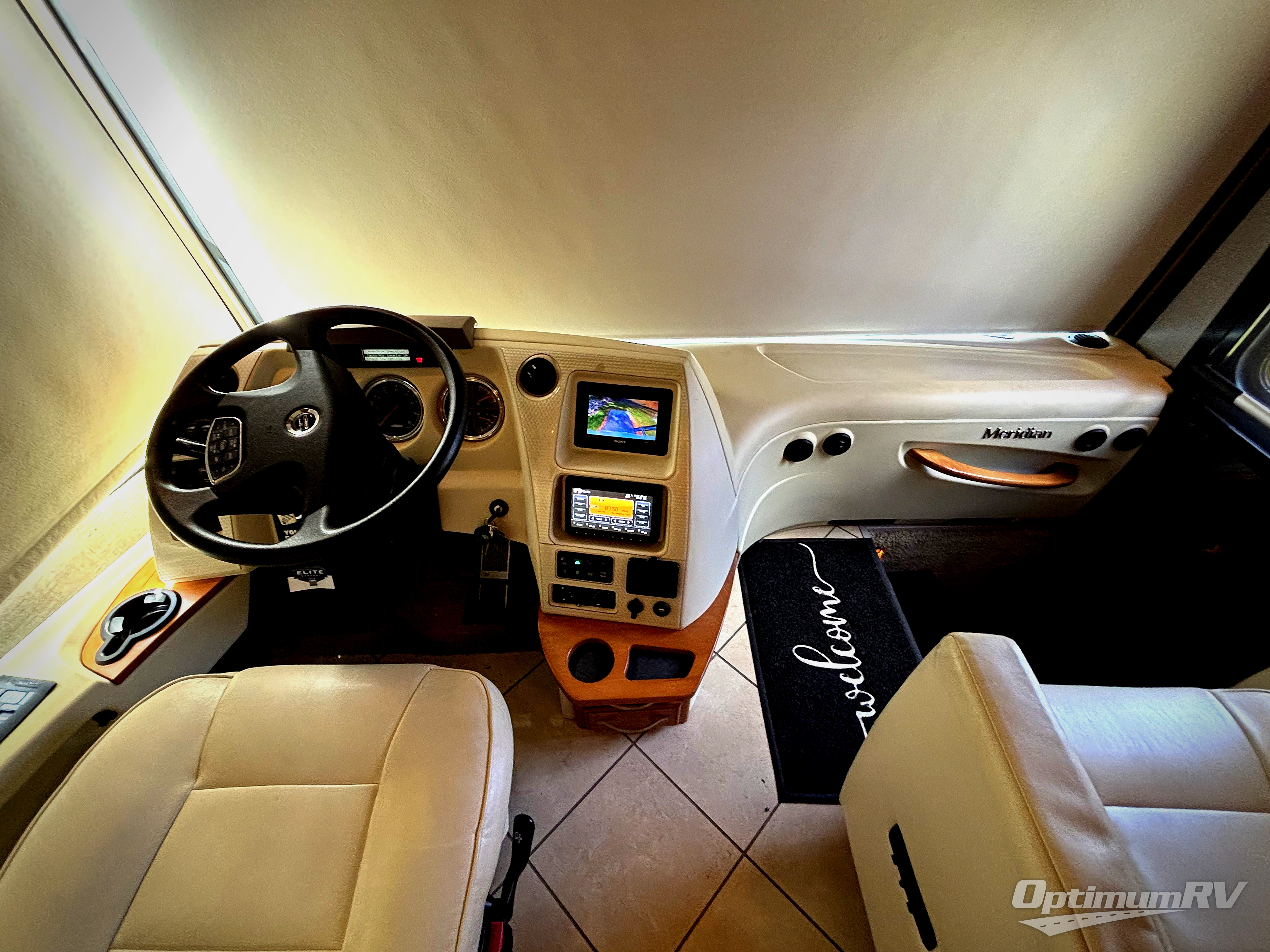 Itasca Meridian Class A Diesel w/Rear Queen Bed w/Nightstands Both Sides, Ward. Slideout, Chest of Drawers/26" LED TV/Bath Sink/Storage Closet/4 Door Refrig./Dbl. Kitchen Sink/3 Burner Range & Pull Out Island Counter & Sofa Full Wall Slide, 40" LCD TV, Rest Easy Sofa & Buffet w/Extendable Dining Table & Chairs Slideout, Bath w/Shower, Toilet & Sink and Much More! Avail. Options May Include: Extendable Sectional Dinette, Res. Refrig., Wash/Dryer, 32" LCD TV Above Cab.