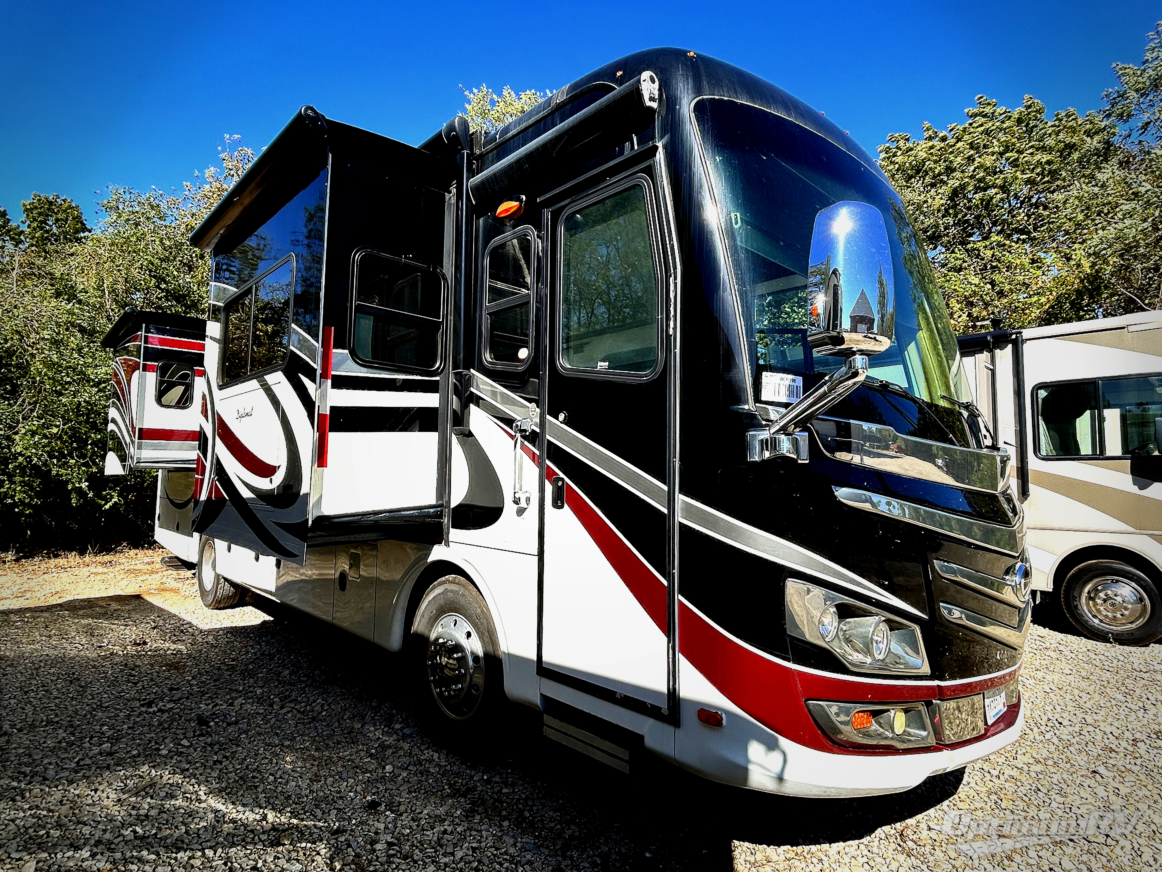 Triple Slide Knight Motor Home, Rear Wardrobe, King Bed Slide, 32" LCD TV/Dresser/Linen/Washer/Dryer Prep/Refrigerator/3-Burner Range/Microwave/Dbl. Kitchen Sink/Sofa Slide, Booth Dinette, Hutch w/42" LCD TV, Pantry, Toilet, Lav., Vanity, Shower, Linen, Overhead Cabinets Throughout & Much More. Available Options May Include: Free-Standing Dinette, U-Shaped Booth Dinette, Queen Bed, Sectional Booth Dinette.