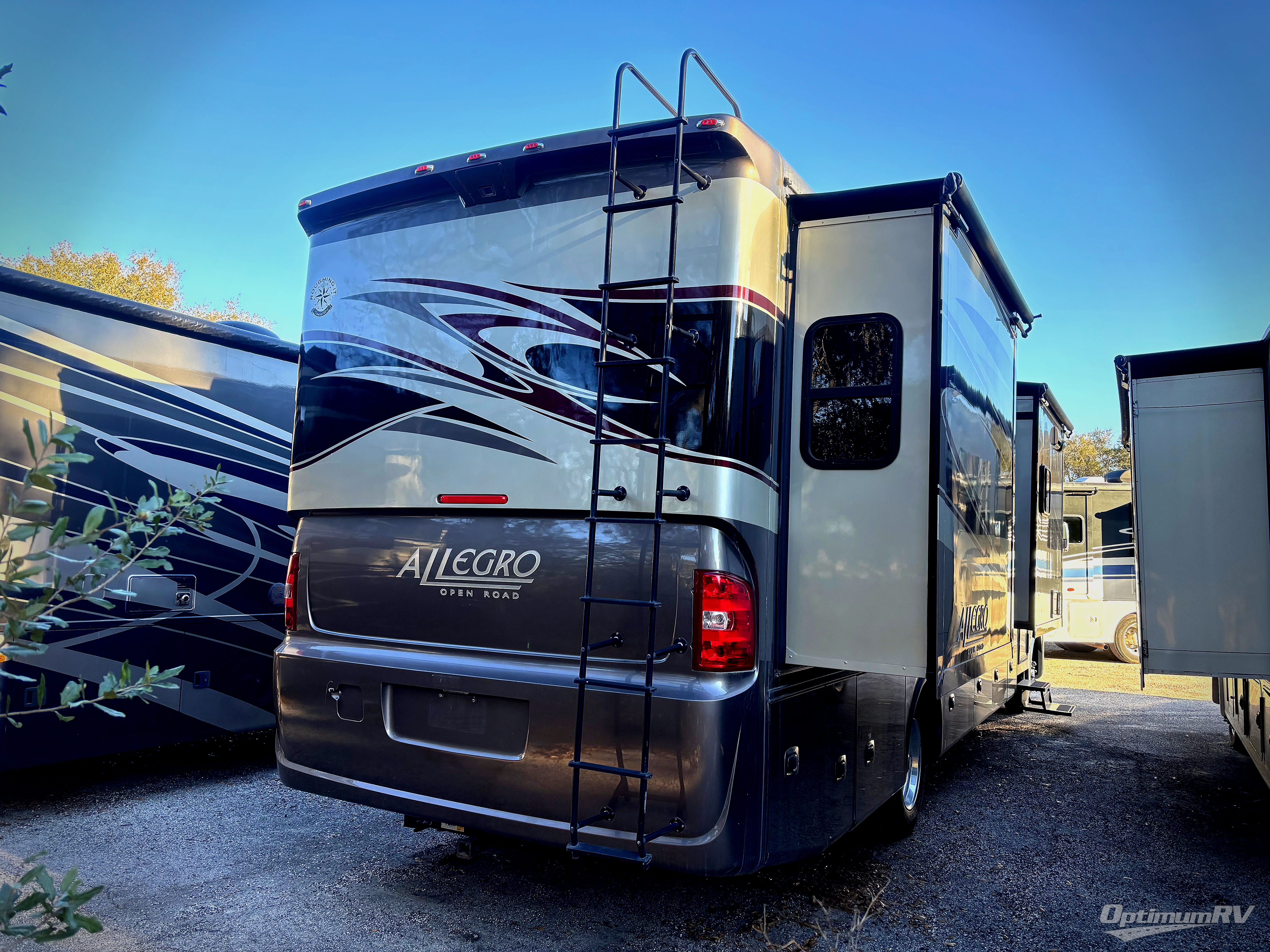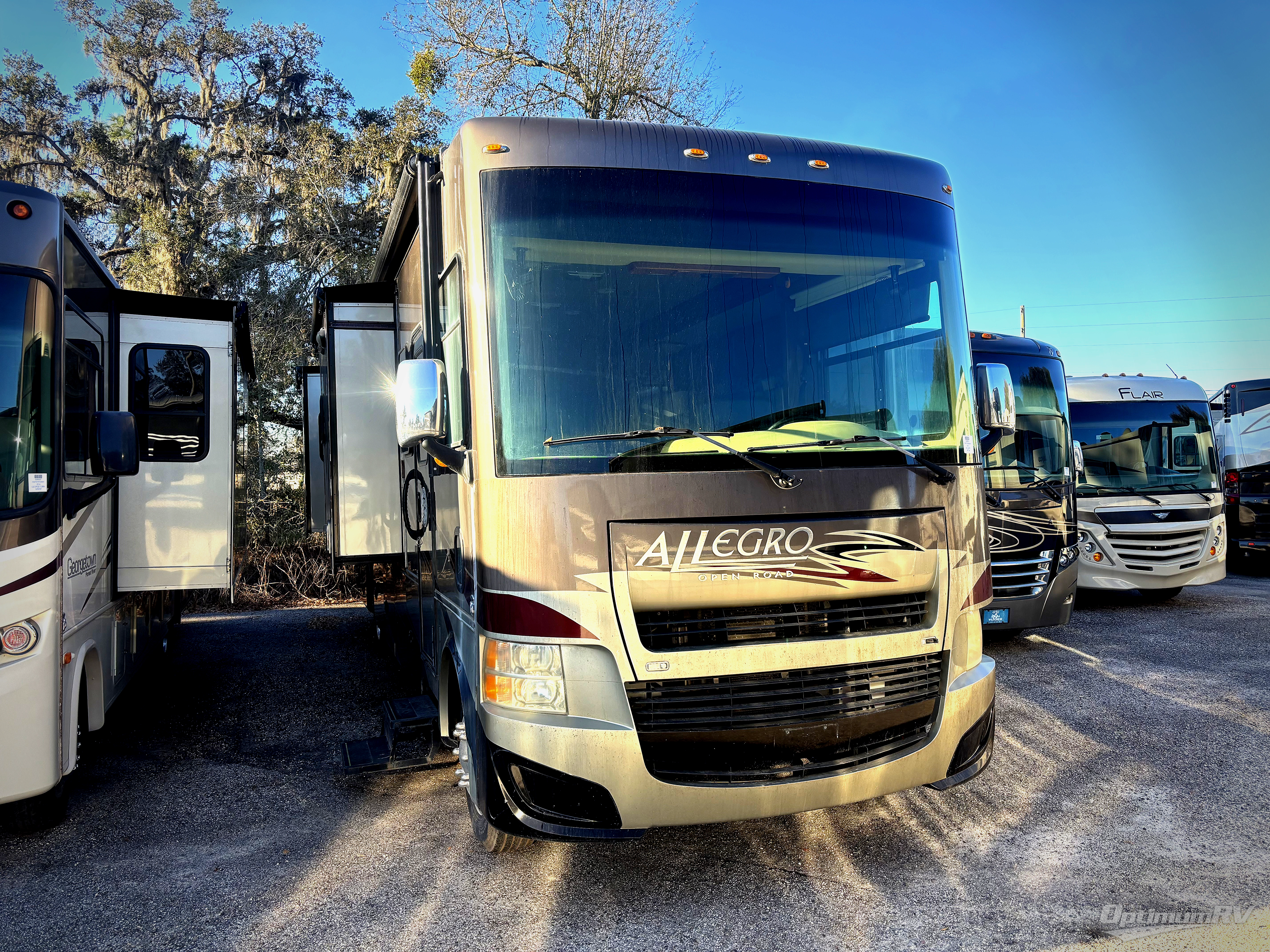 Triple Slide Allegro Class A by Tiffin w/Rear Queen Bed Slide w/Nightstands, Wardrobe w/Drawers Below, Private Toilet Area w/Lav., Corner Shower w/Lav., Refrigerator, Booth Dinette & Sofa Bed Slideout, Double Kitchen Sink & 3 Burner Range Slide w/Overhead Cabinets, Lounge Chair, 37" TV and Much More! Available Options May Include: 32" TV Above Cab Area, Driver's Door, 32" TV in Bedroom, Tile Floor in Bedroom, Free Standing Cabinet/Dinette.