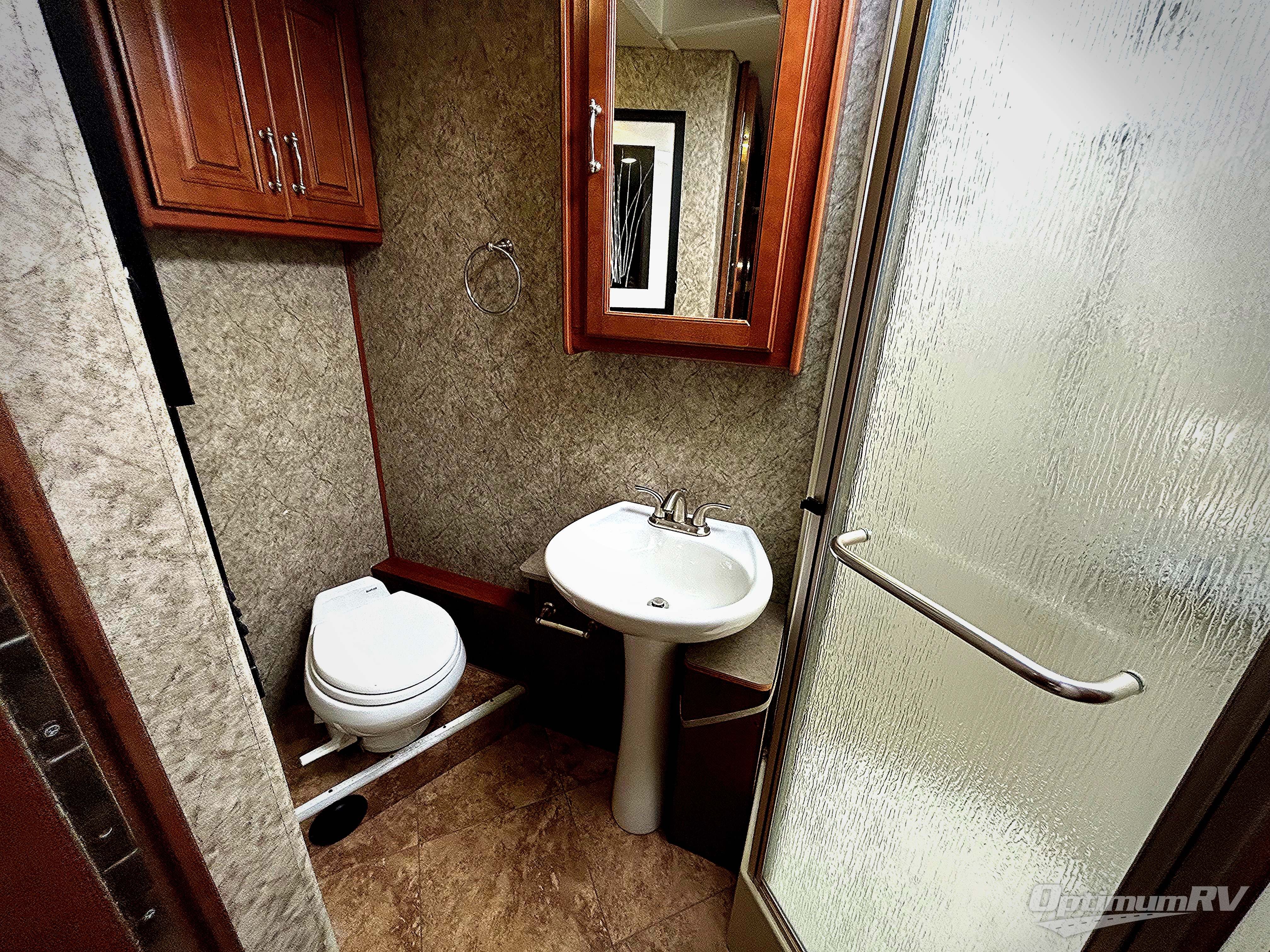 The side aisle bathroom is on the left as you proceed to the rear of the motor home. In the bathroom you will find a linen cabinet, corner angle shower, sink, and toilet.