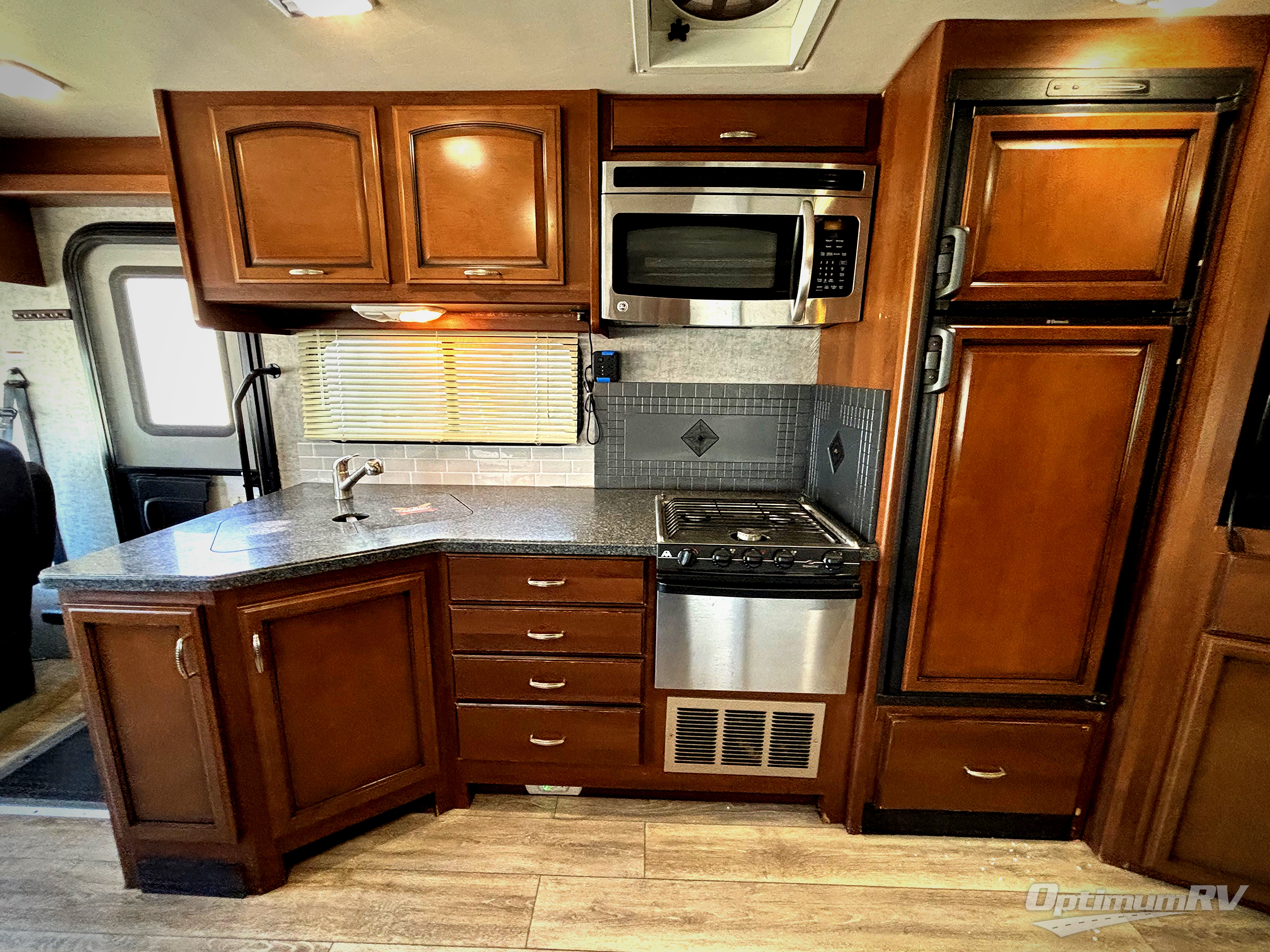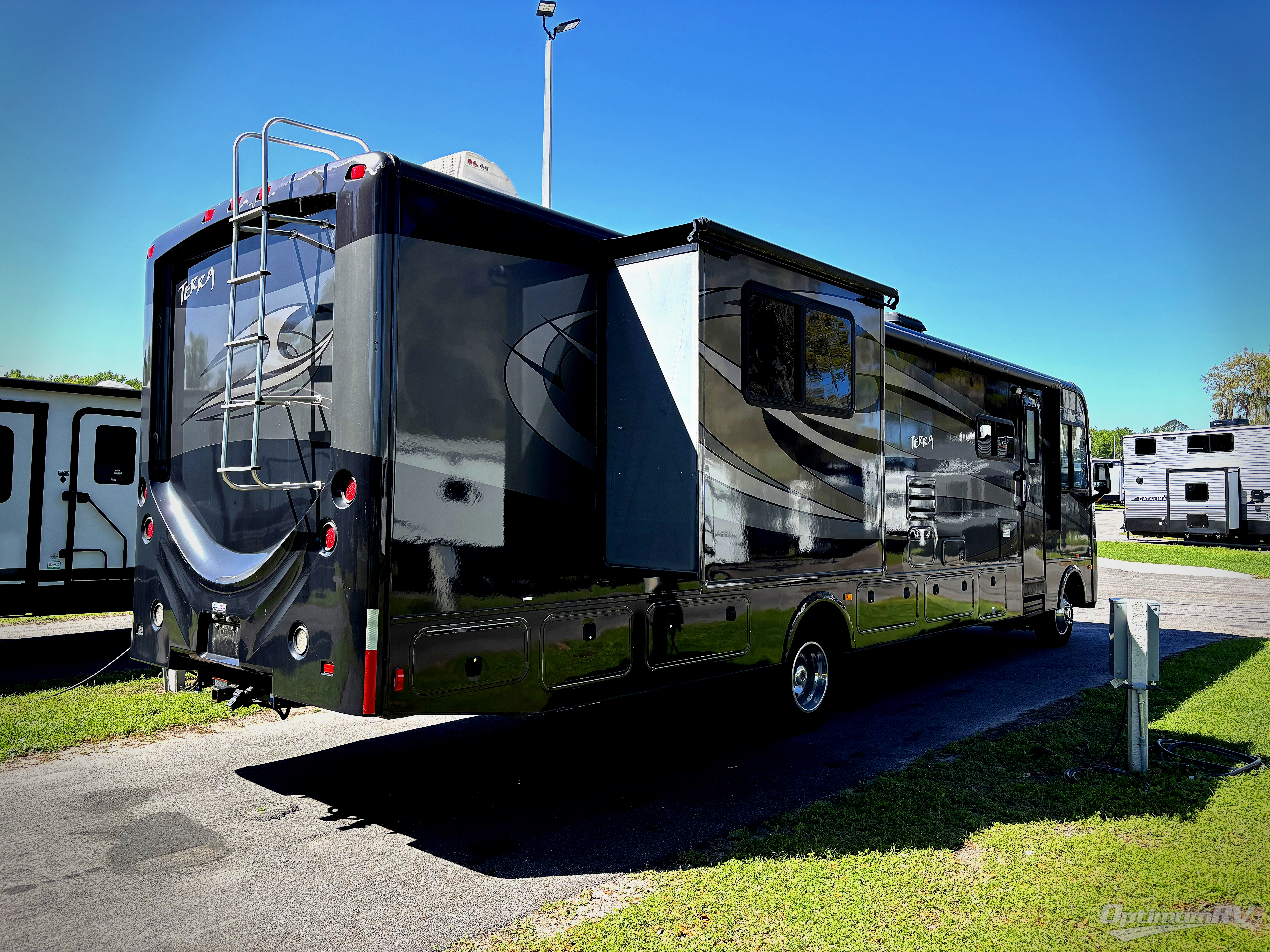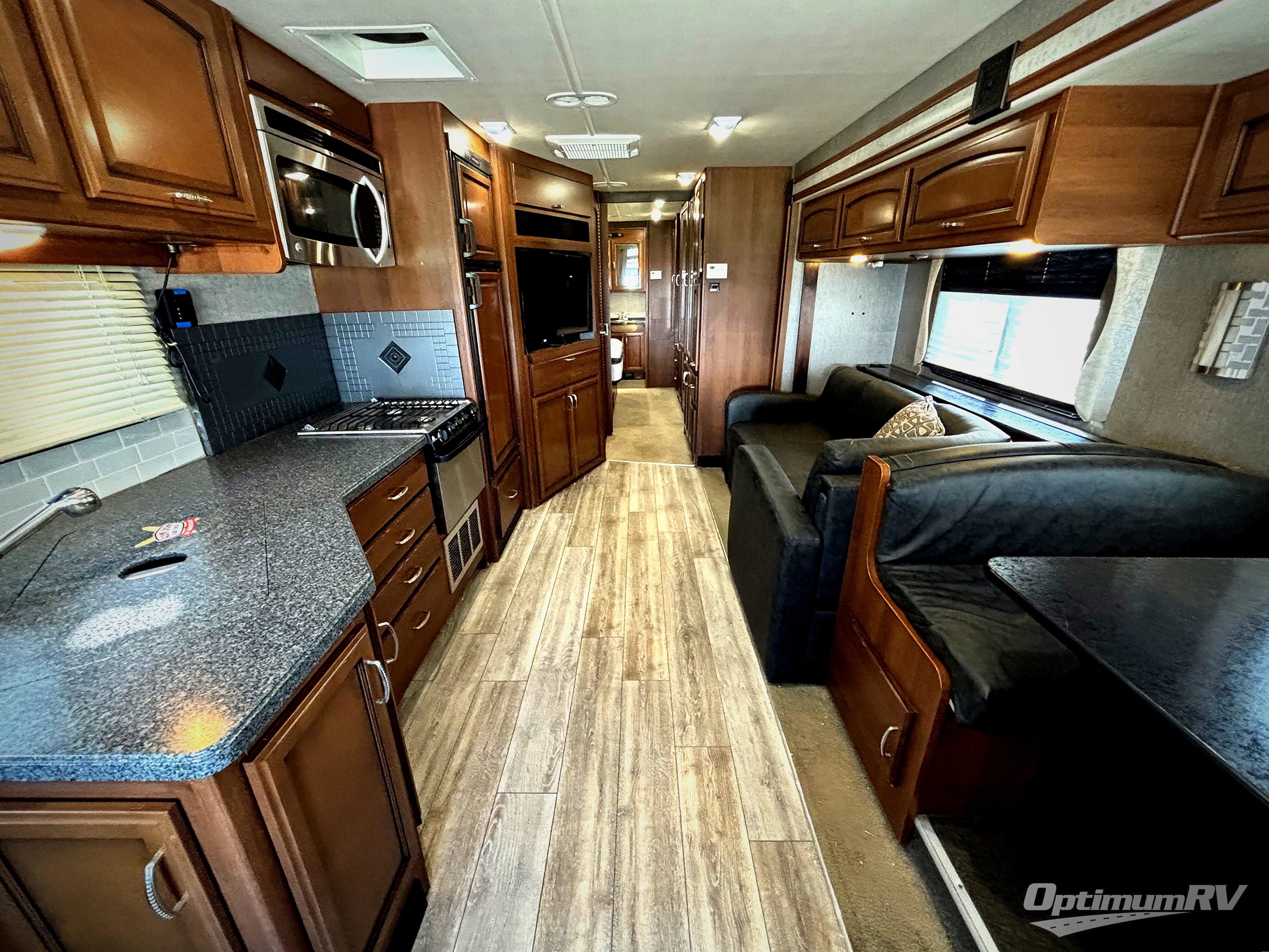 This Terra 34E Fleetwood motor home features a sofa and dinette slide as you walk in. To the left of the entrance, is a double kitchen sink, three burner range, microwave, refrigerator, utility cabinet. While relaxing on the sofa, you can watch tv on the 32" LED tv.